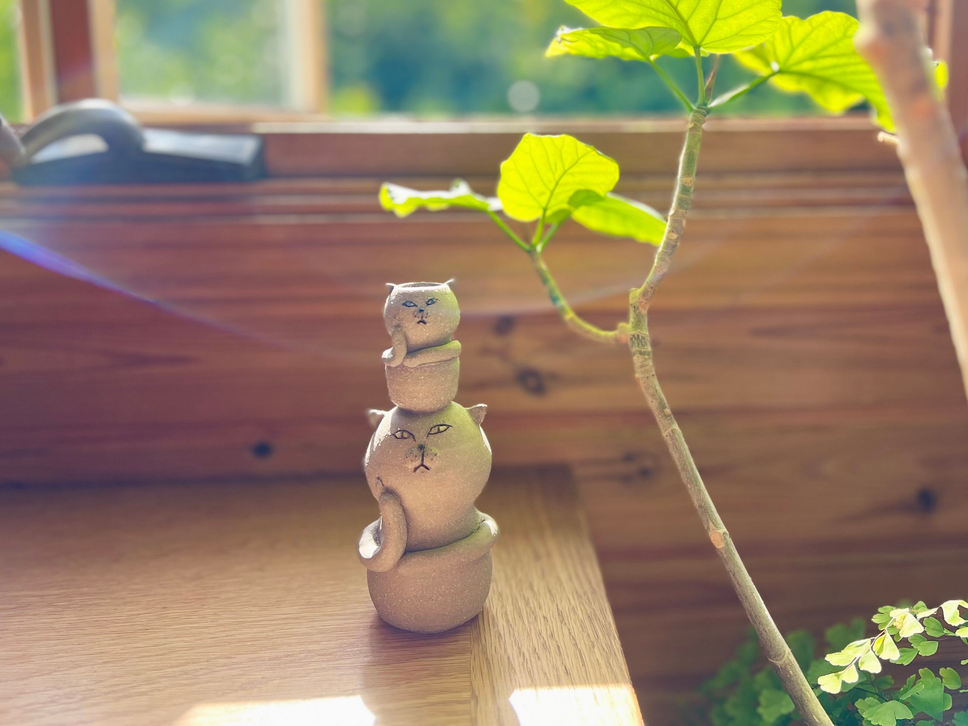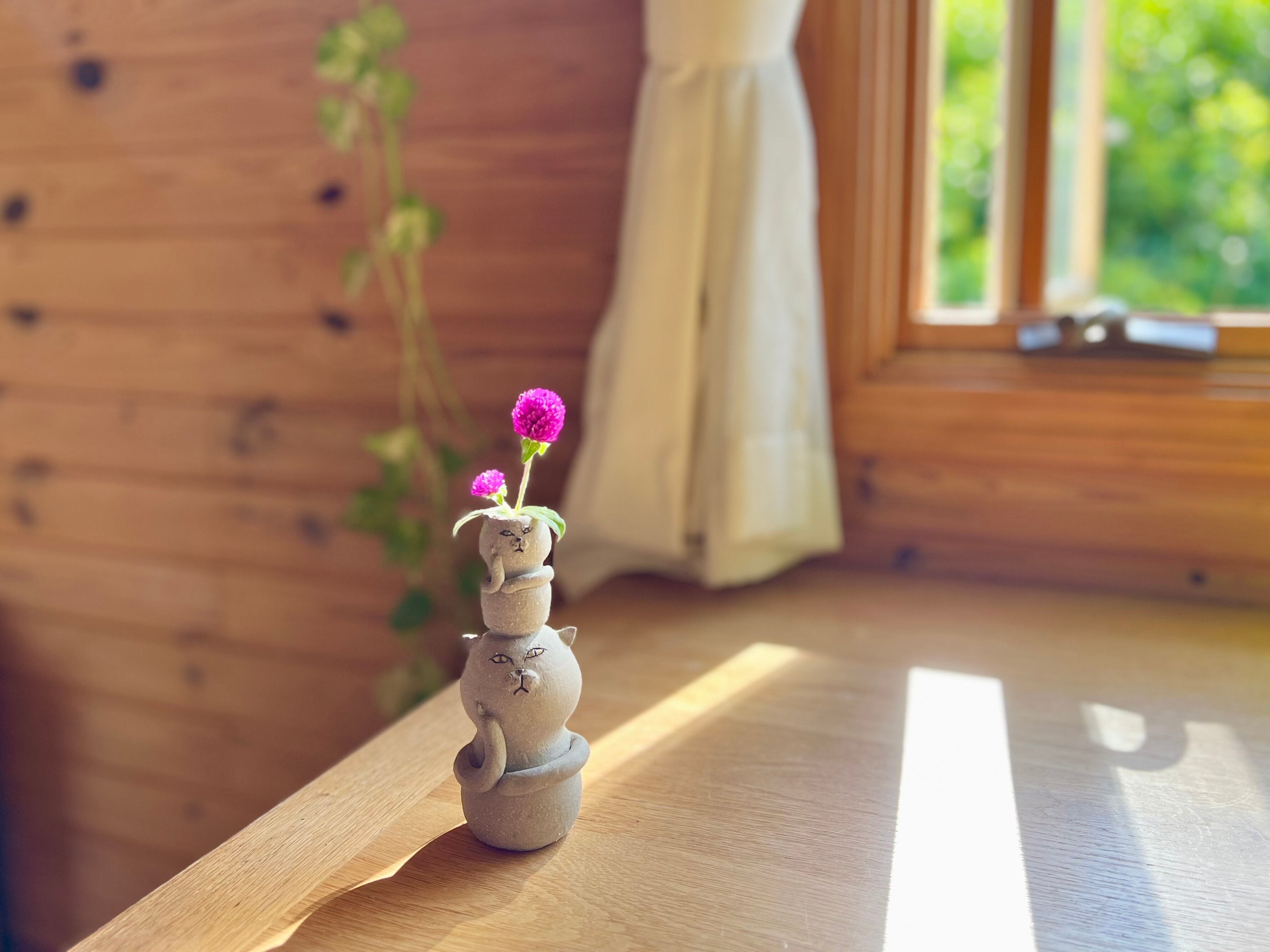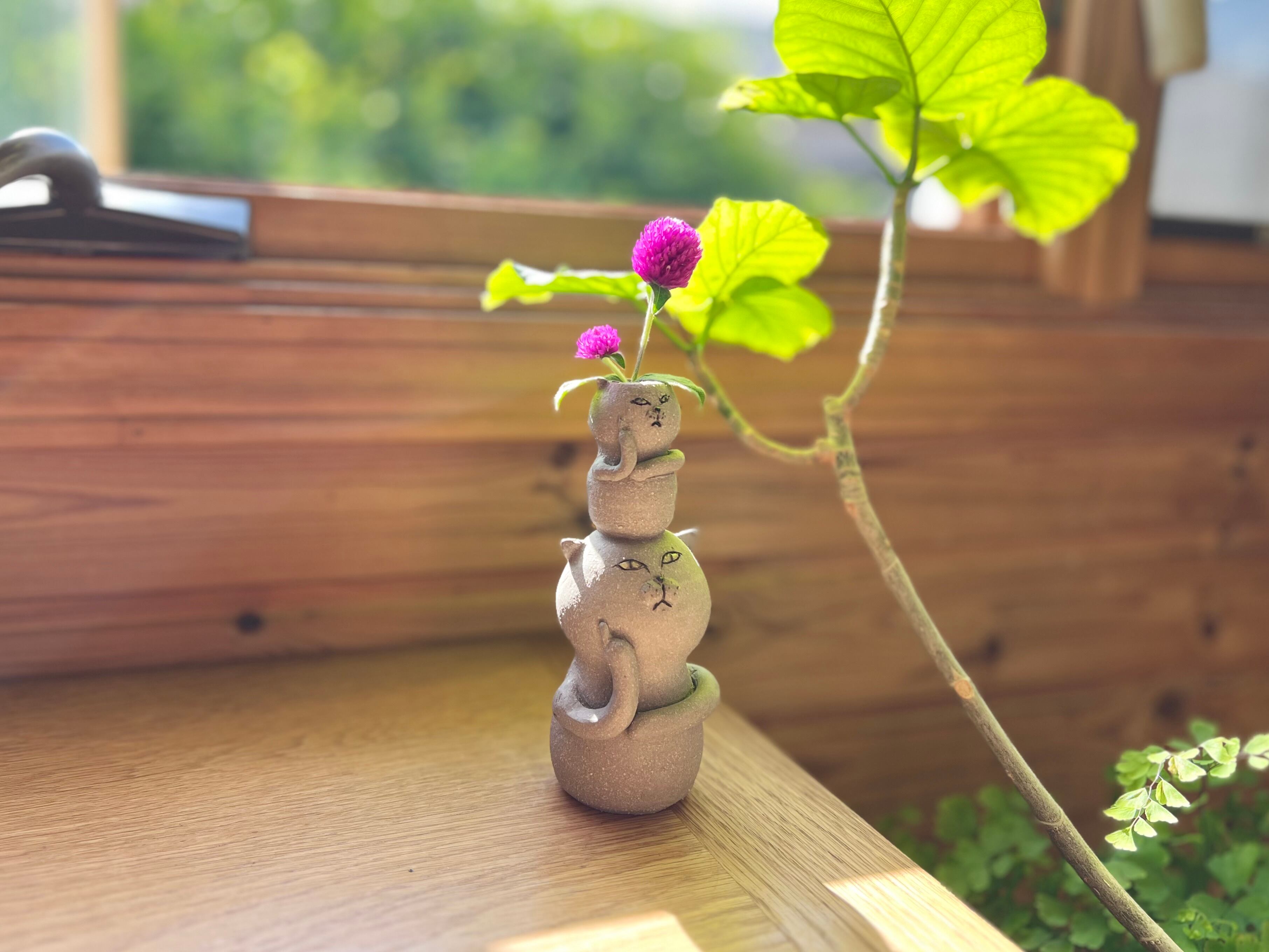 グレー猫さんが小さい猫さんを頭に乗せた一輪挿しです。猫好きの方や花を飾るのが好きな方にぴったりのアイテムです。