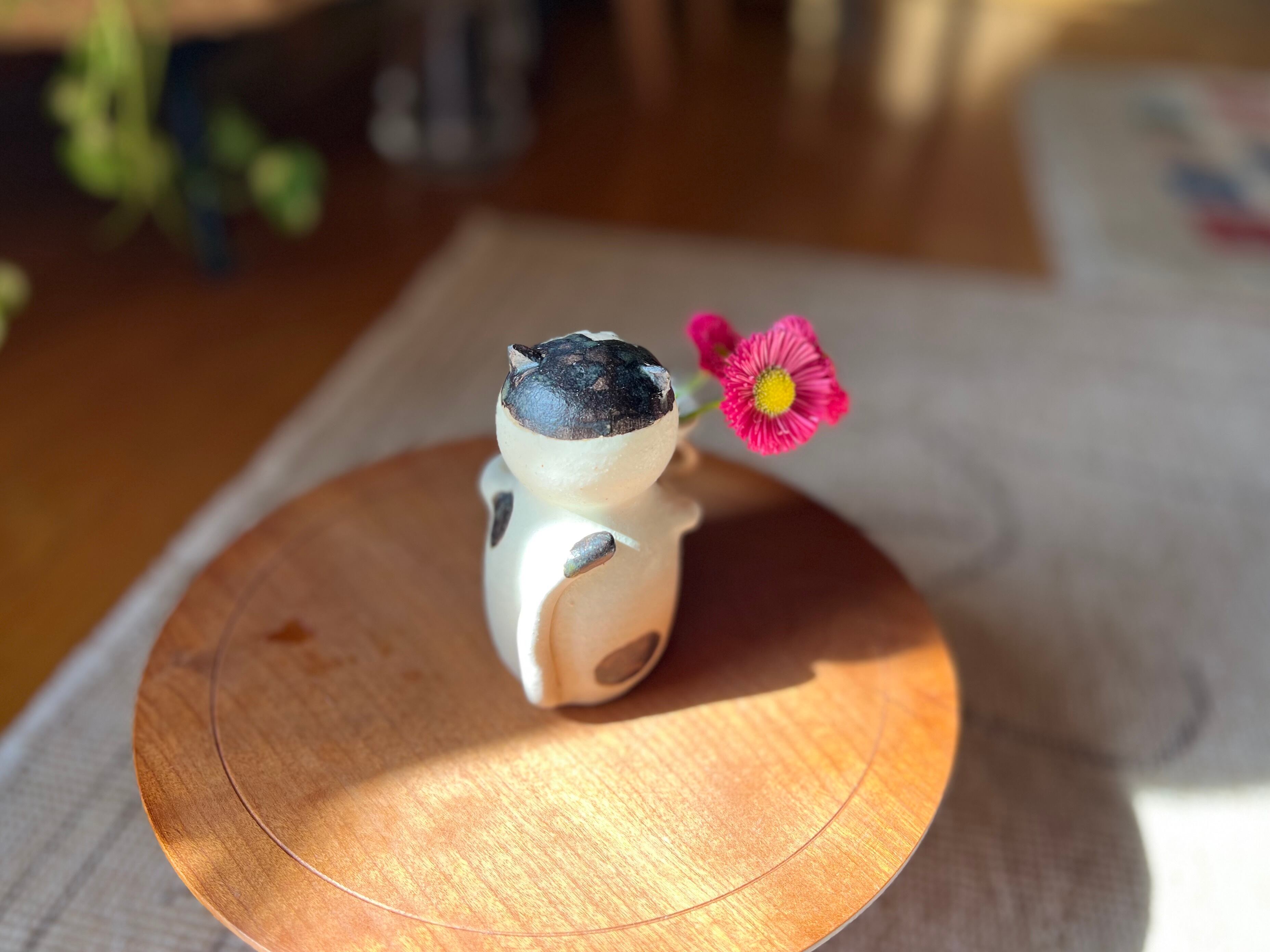 ハチワレ猫さんが花瓶を持った一輪挿しです。猫好きの方や花を飾るのが好きな方にぴったりのアイテムです。