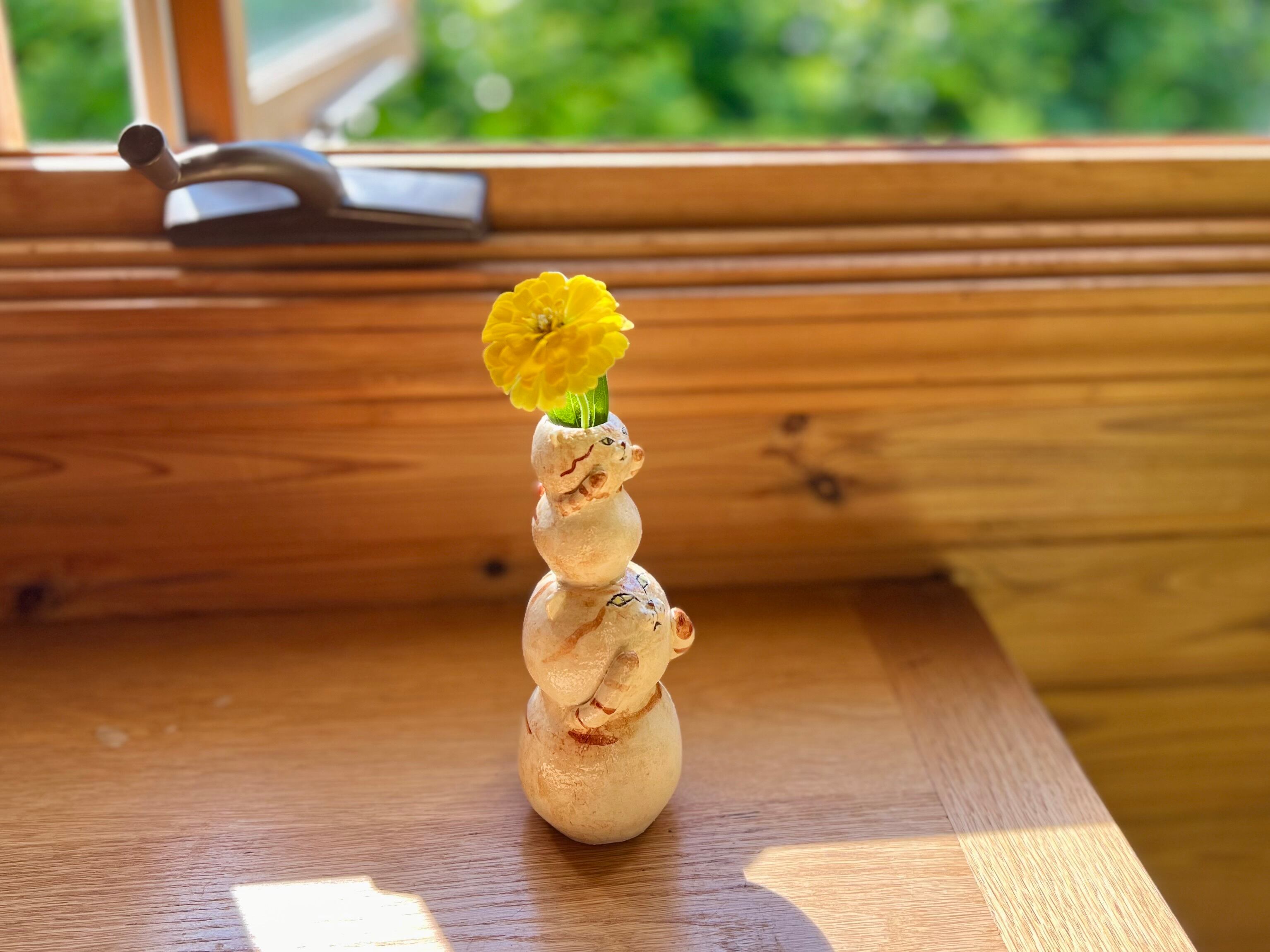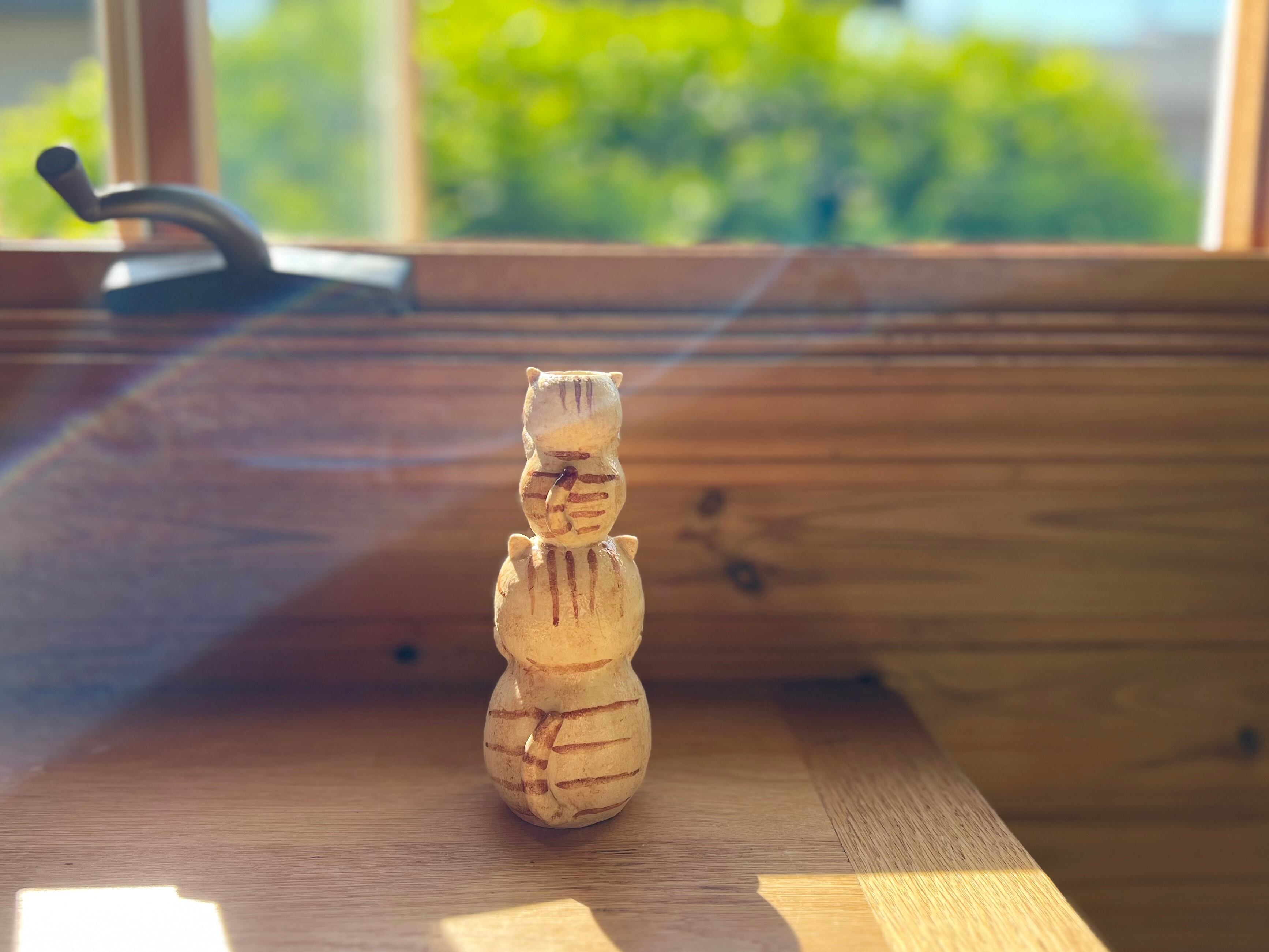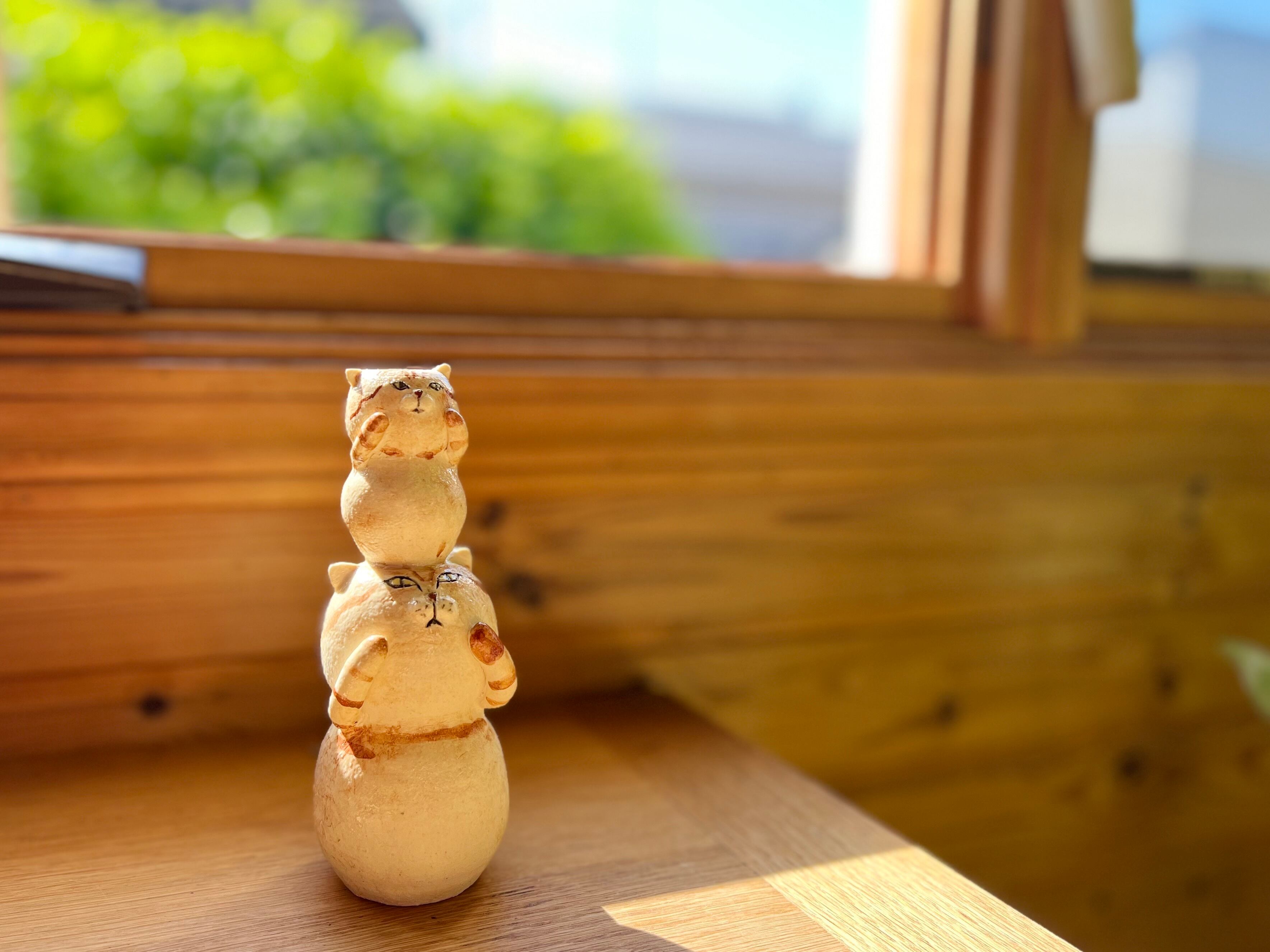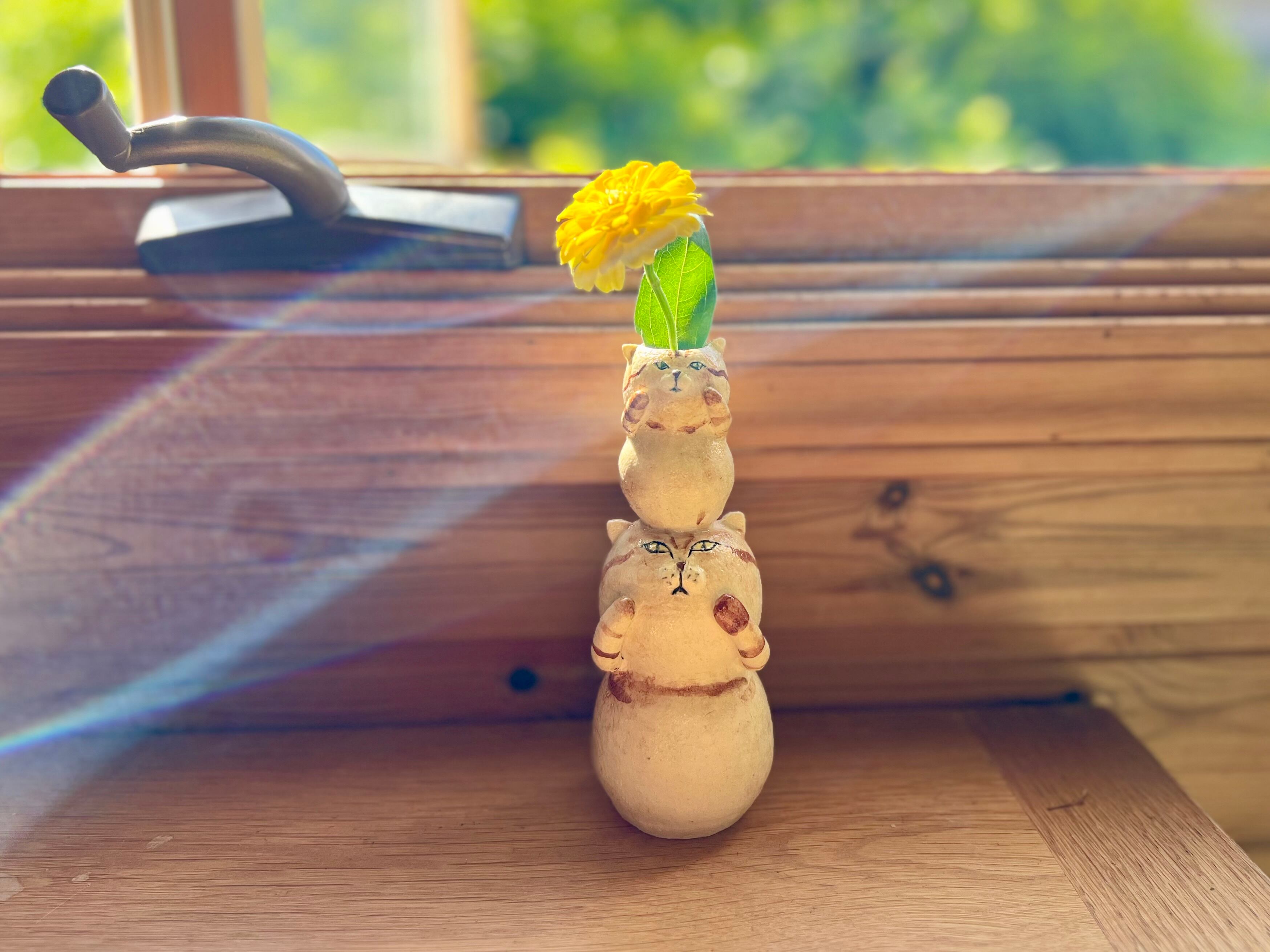 茶トラ猫さんが小さい猫さんを頭に乗せた一輪挿しです。猫好きの方や花を飾るのが好きな方にぴったりのアイテムです。