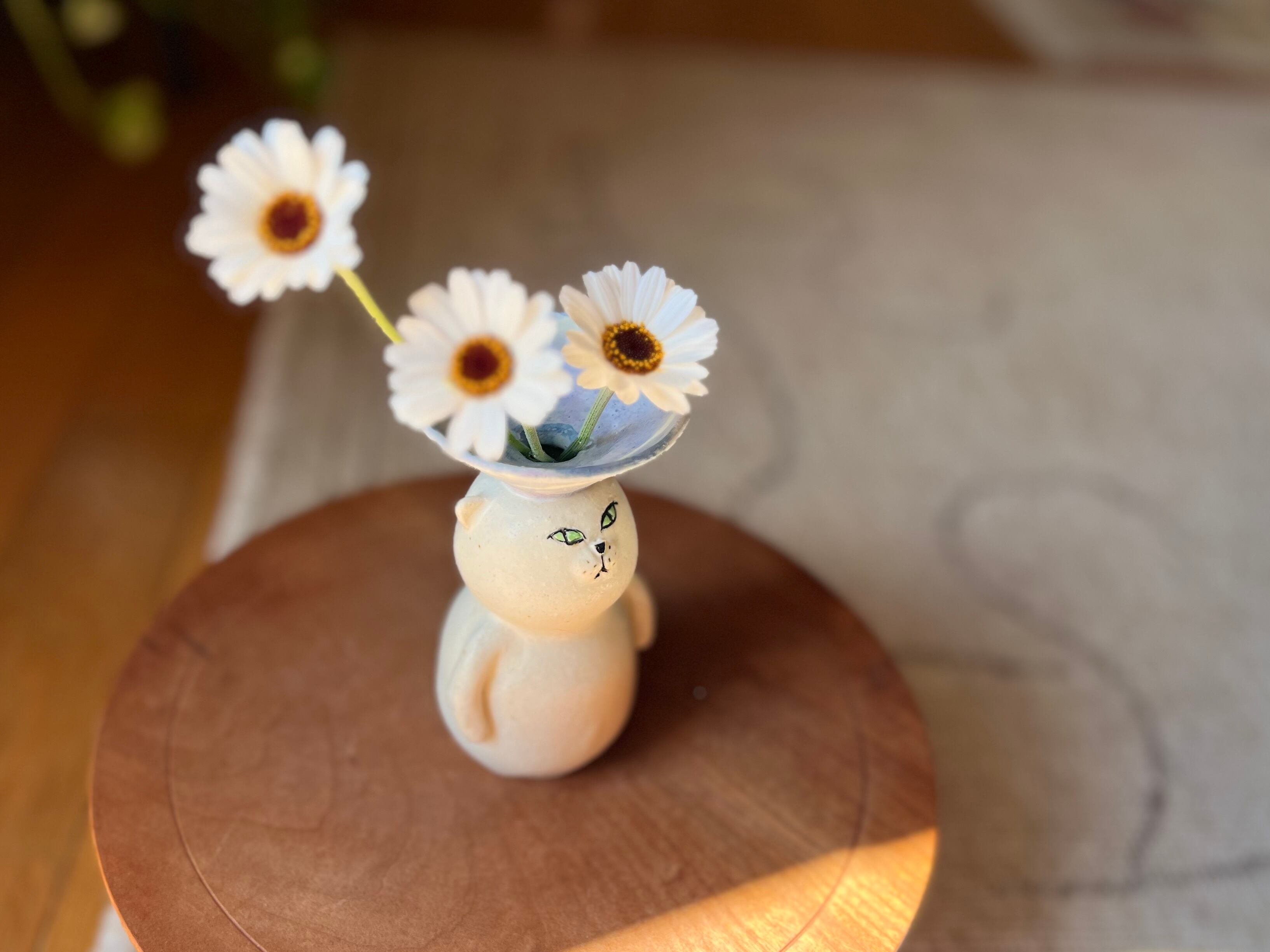 白猫さんが頭に鉢を乗せた一輪挿しです。猫好きの方や花を飾るのが好きな方にぴったりのアイテムです。