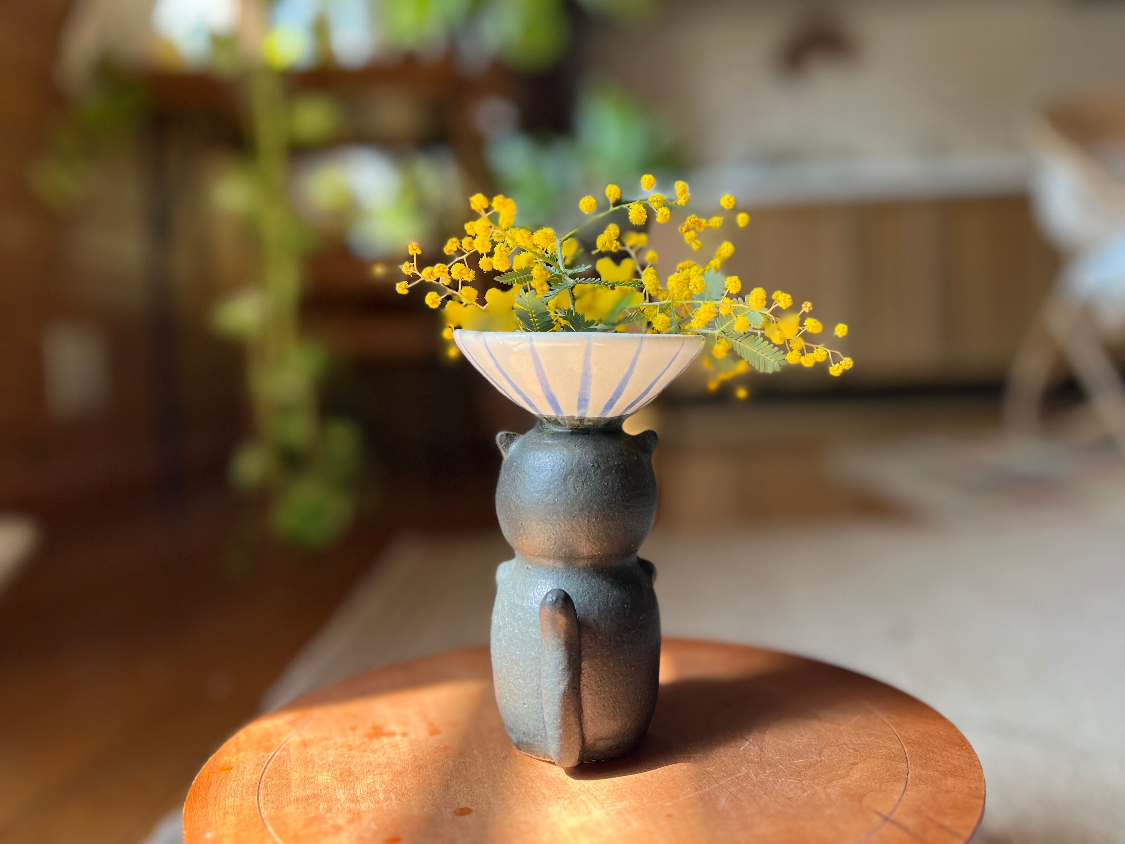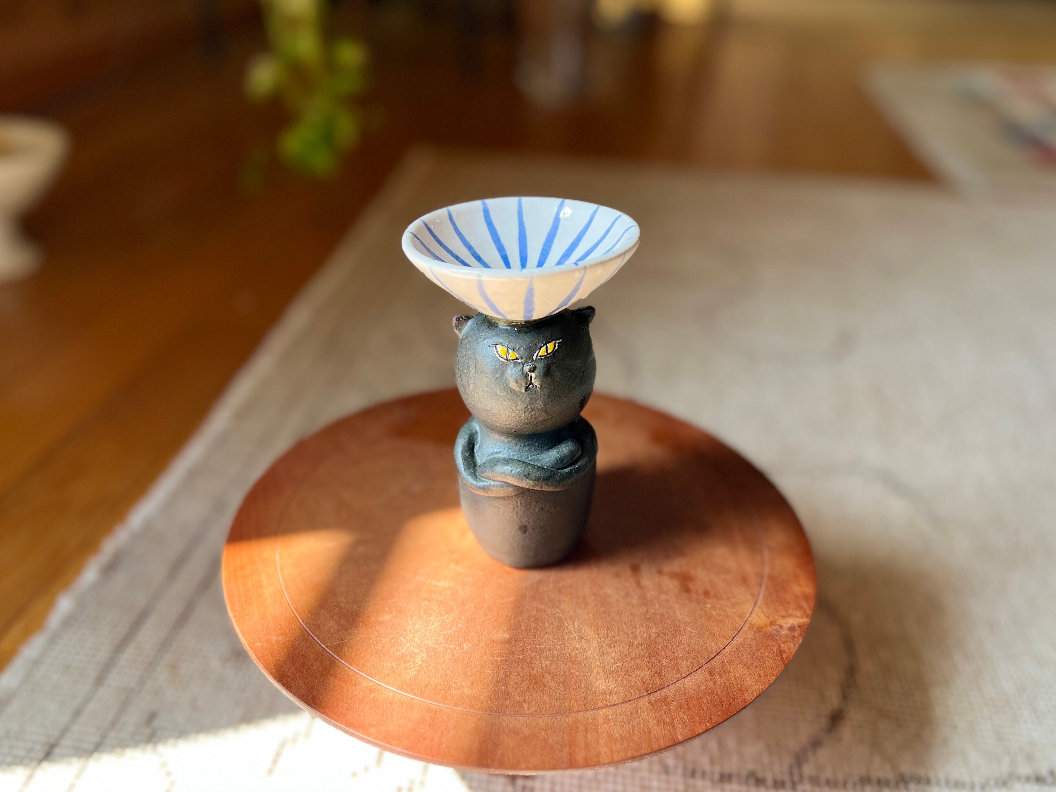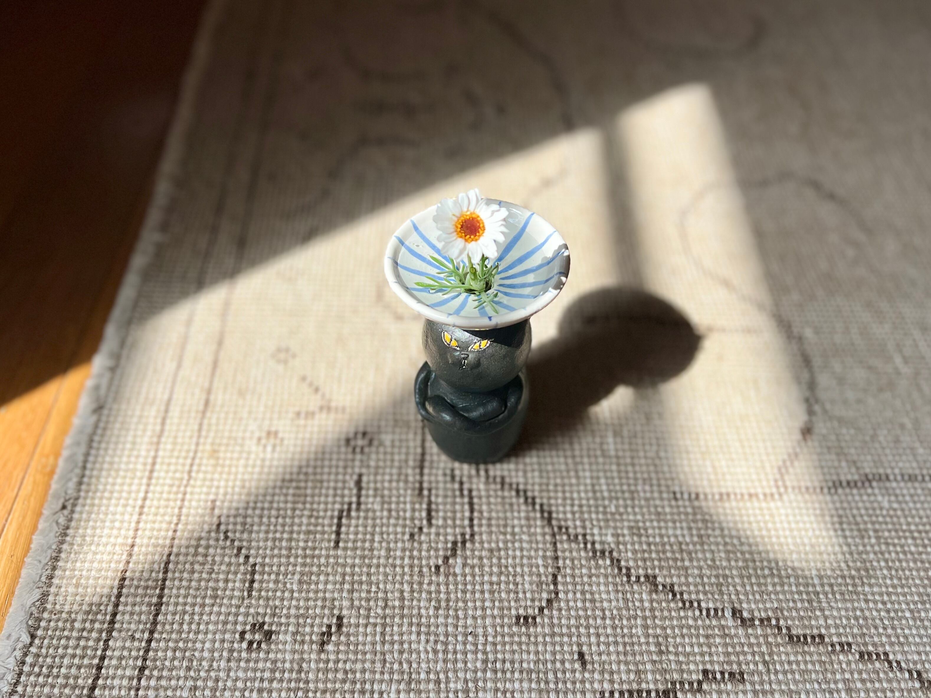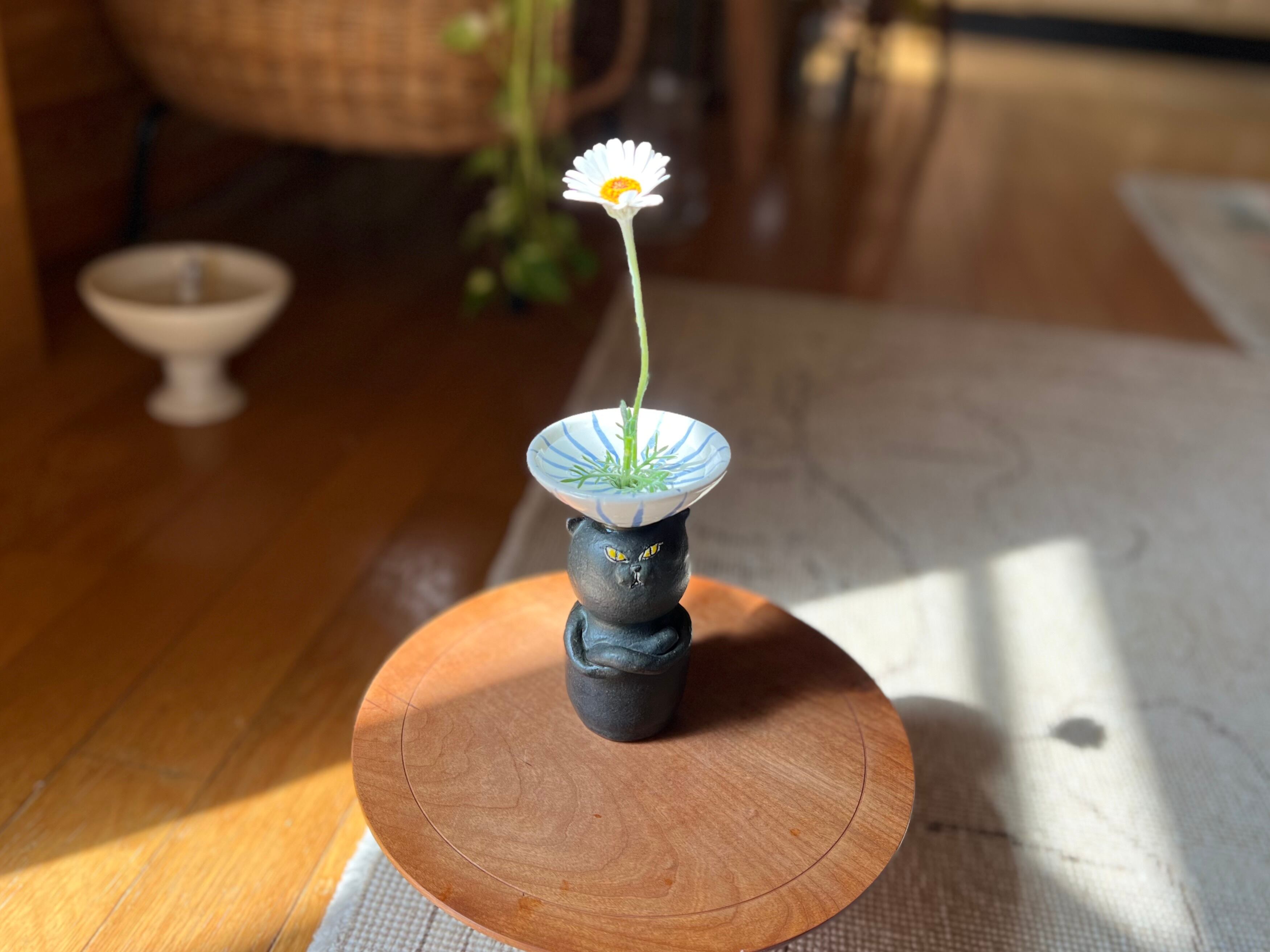 黒猫さんが頭に鉢を乗せた一輪挿しです。猫好きの方や花を飾るのが好きな方にぴったりのアイテムです。
