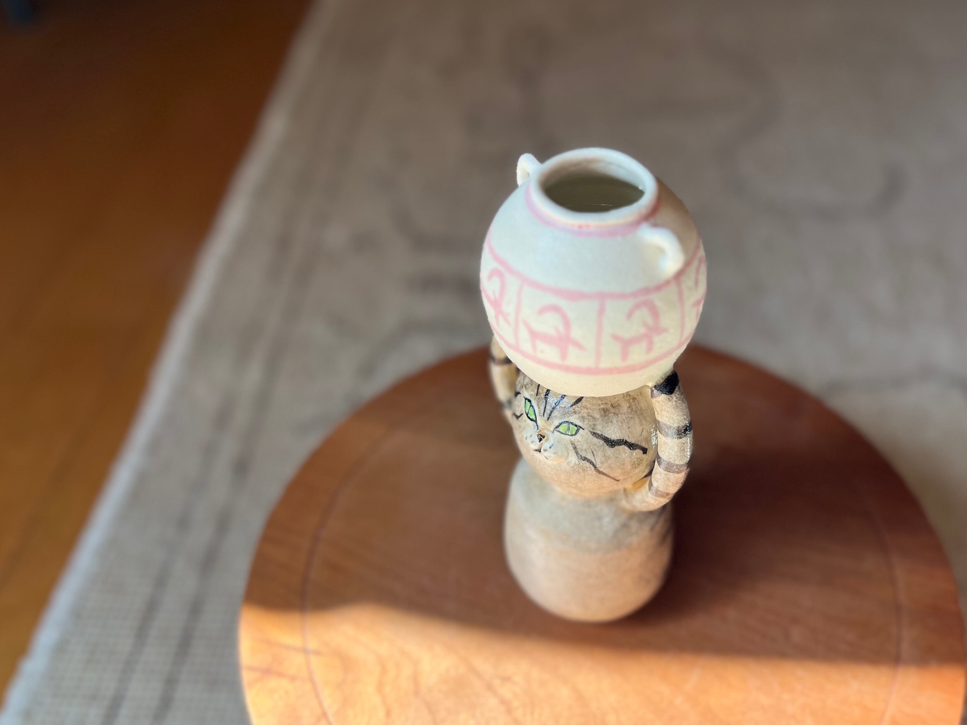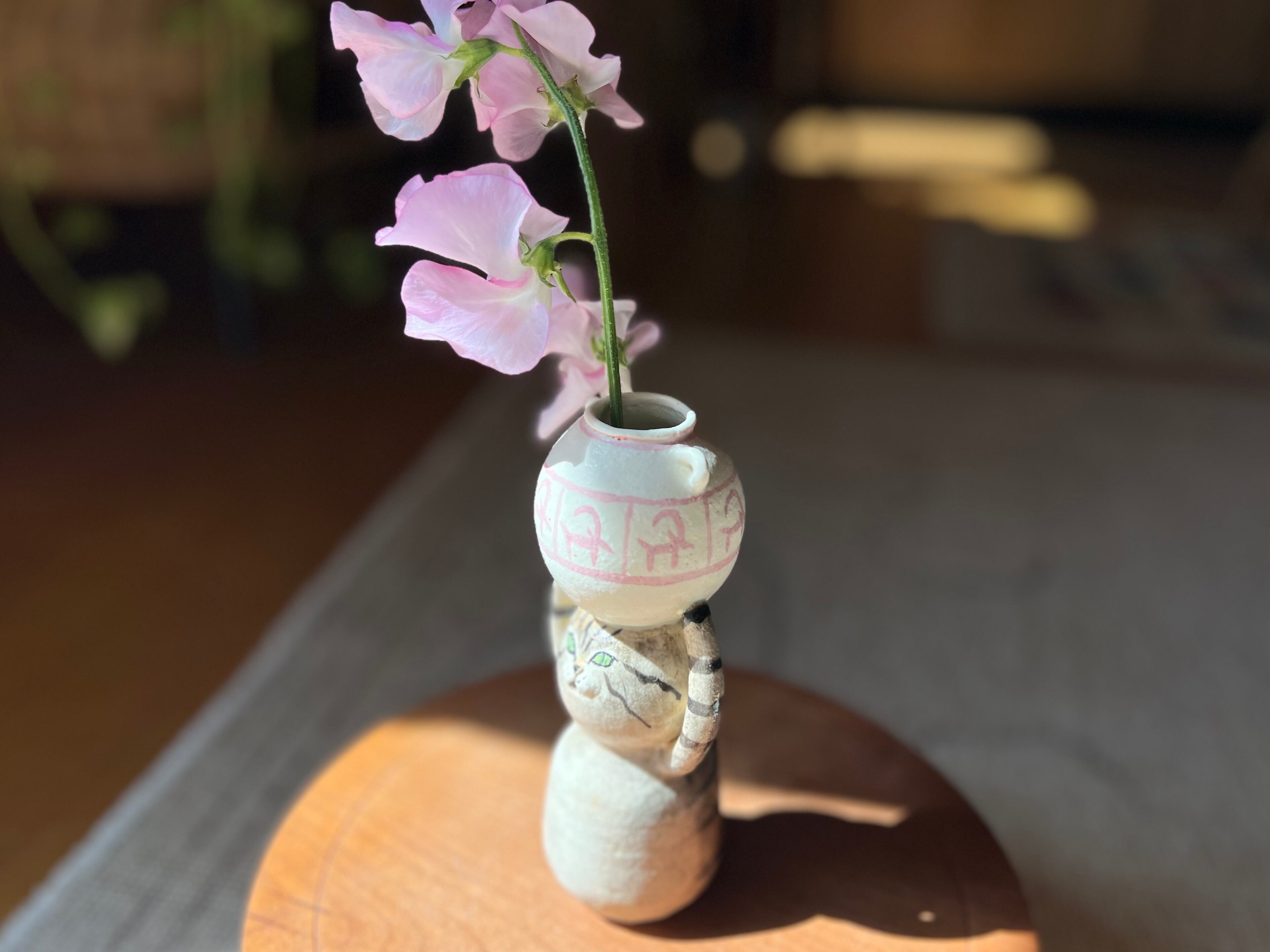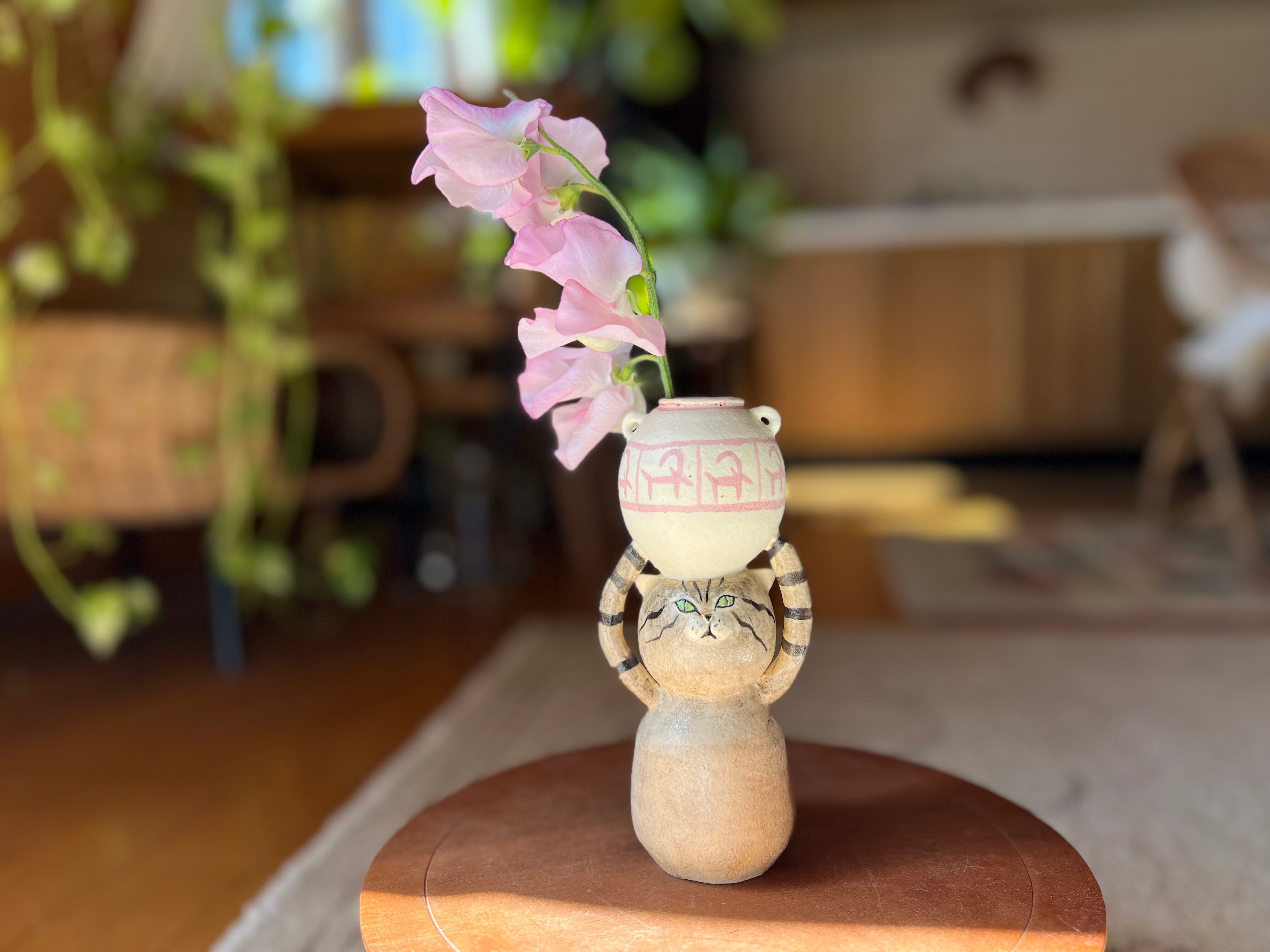 とら猫さんが頭に壺を乗せた一輪挿しです。猫好きの方や花を飾るのが好きな方にぴったりのアイテムです。