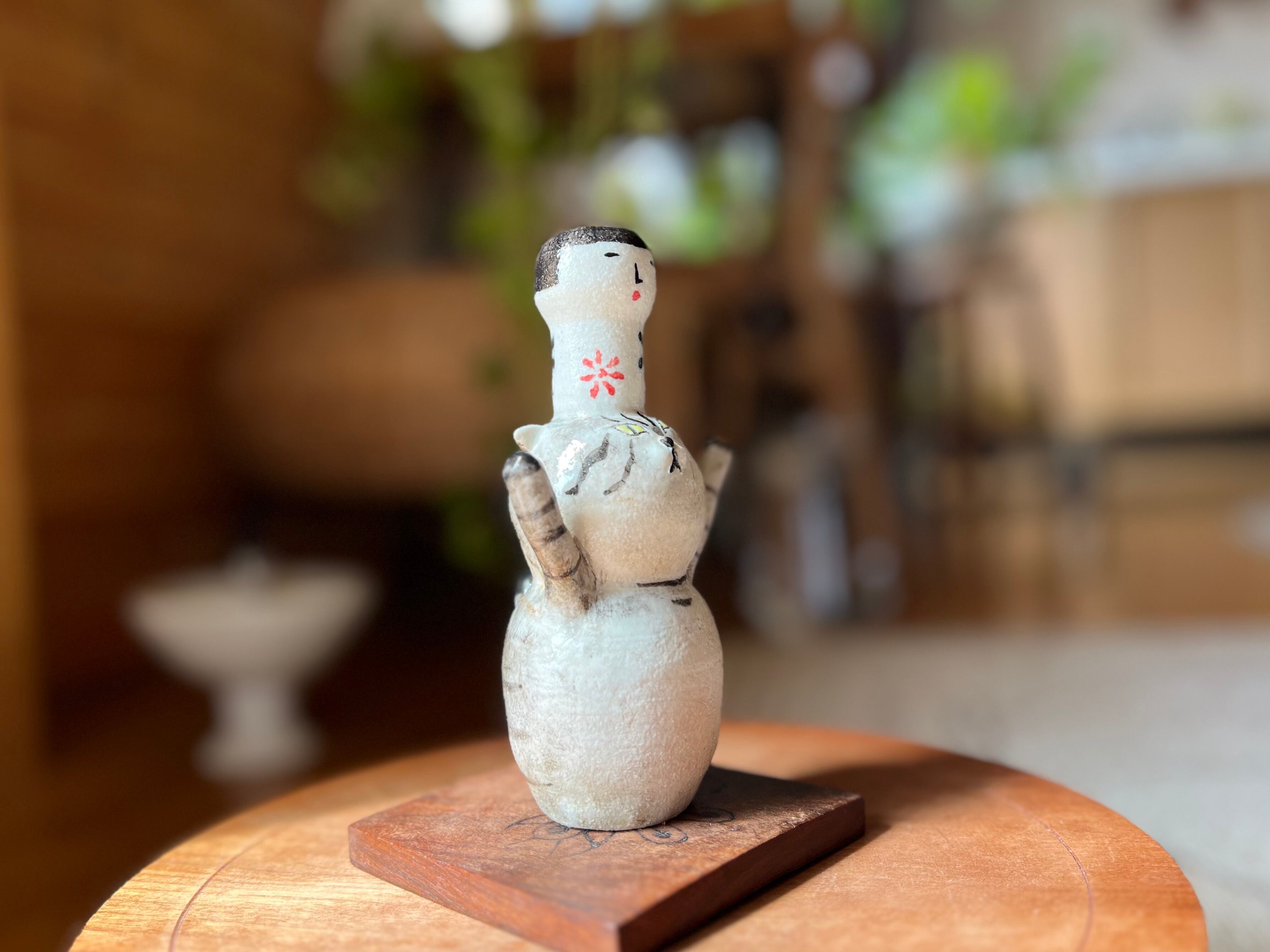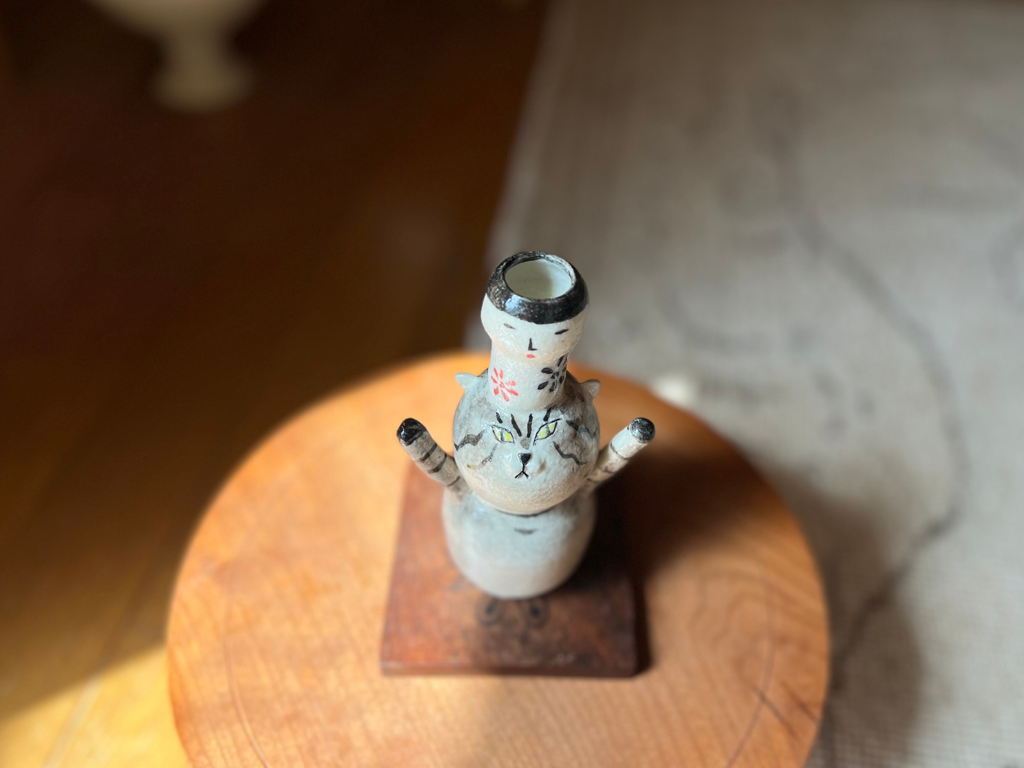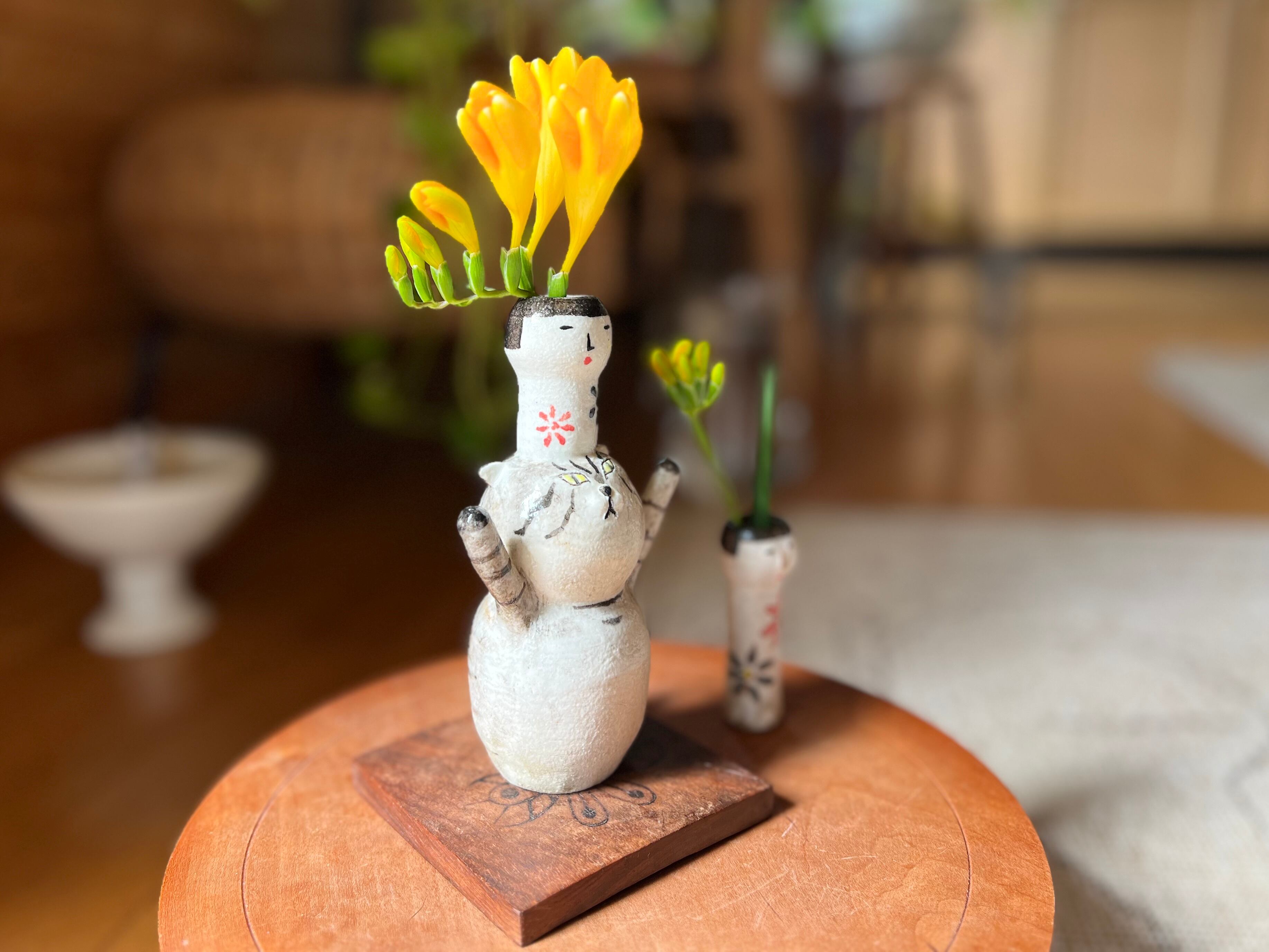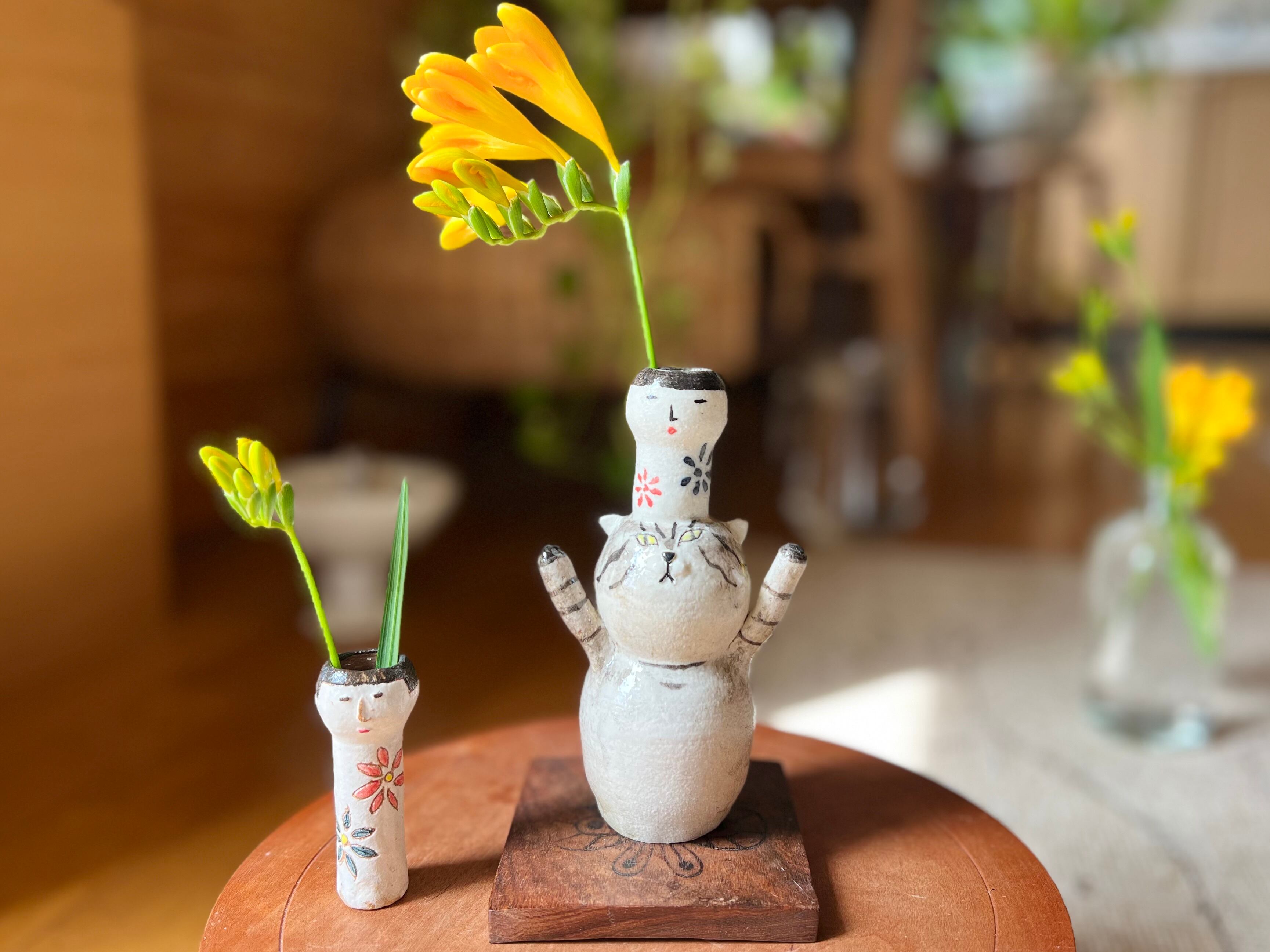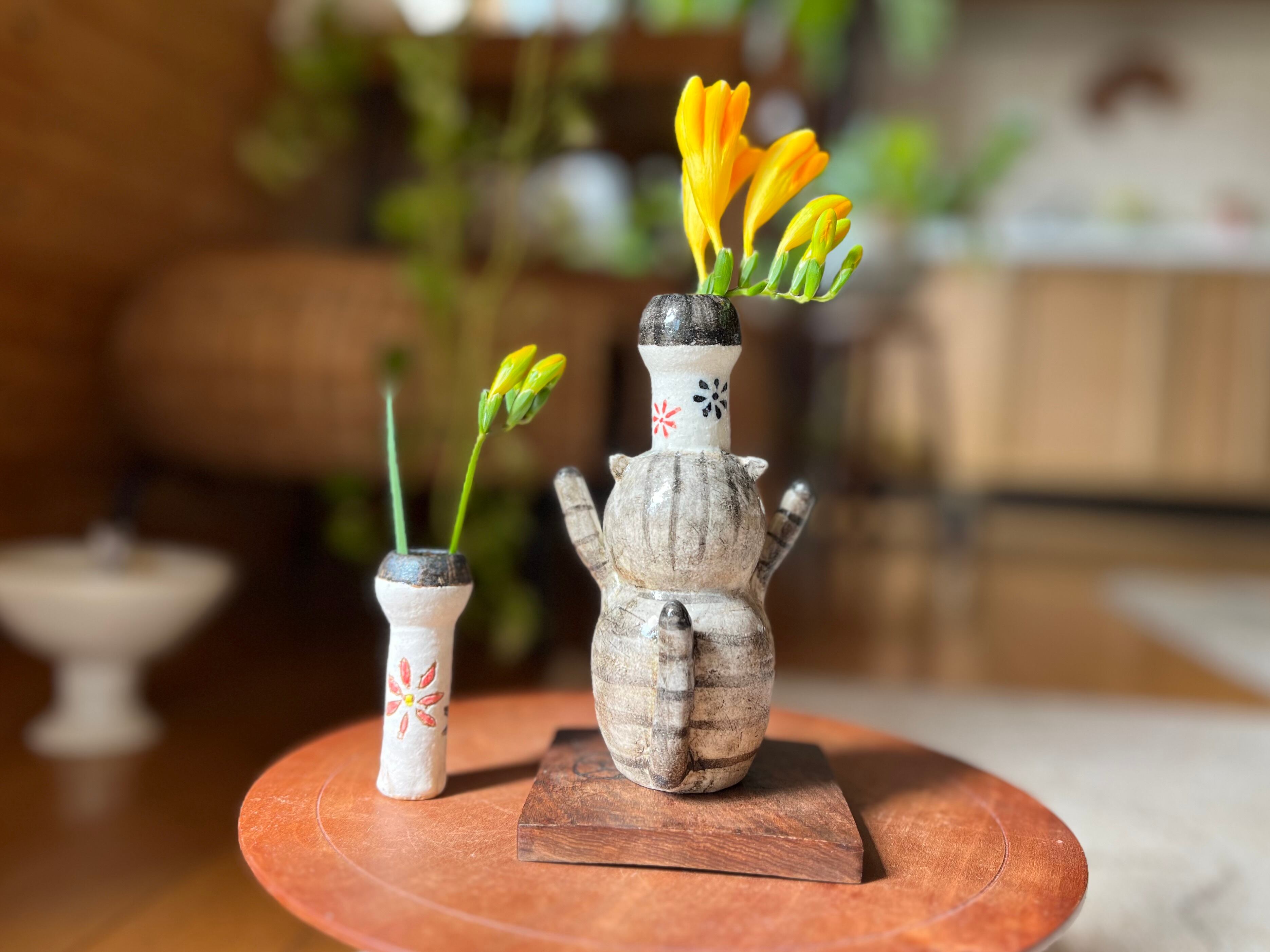 トラ猫さんがこけしを頭に乗せた一輪挿しです。猫好きの方や花を飾るのが好きな方にぴったりのアイテムです。