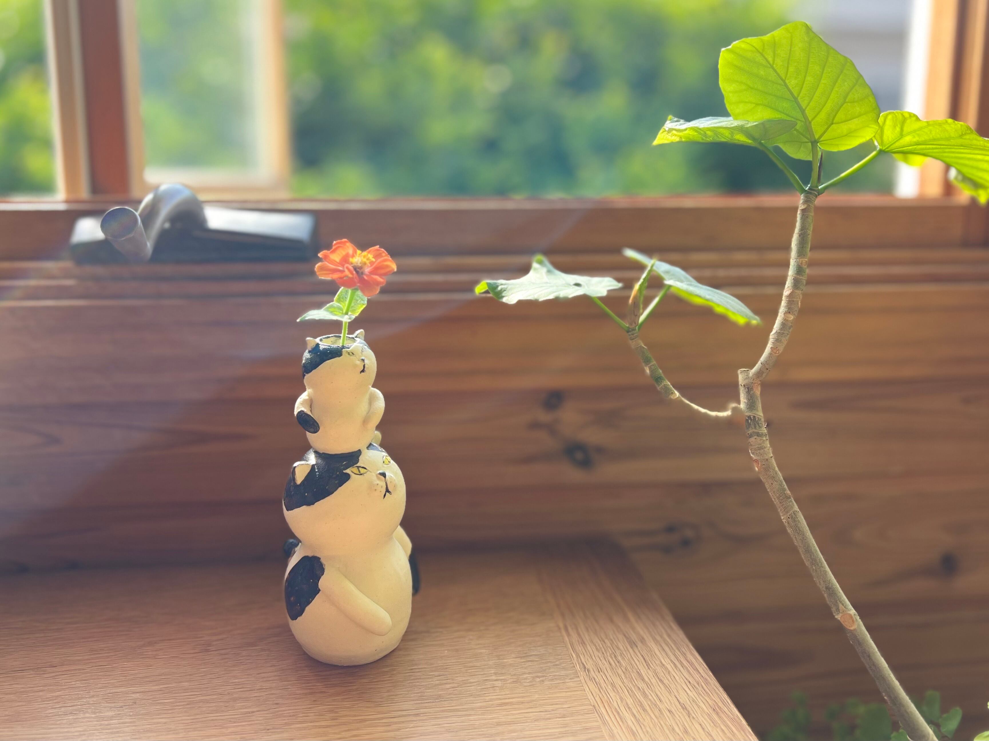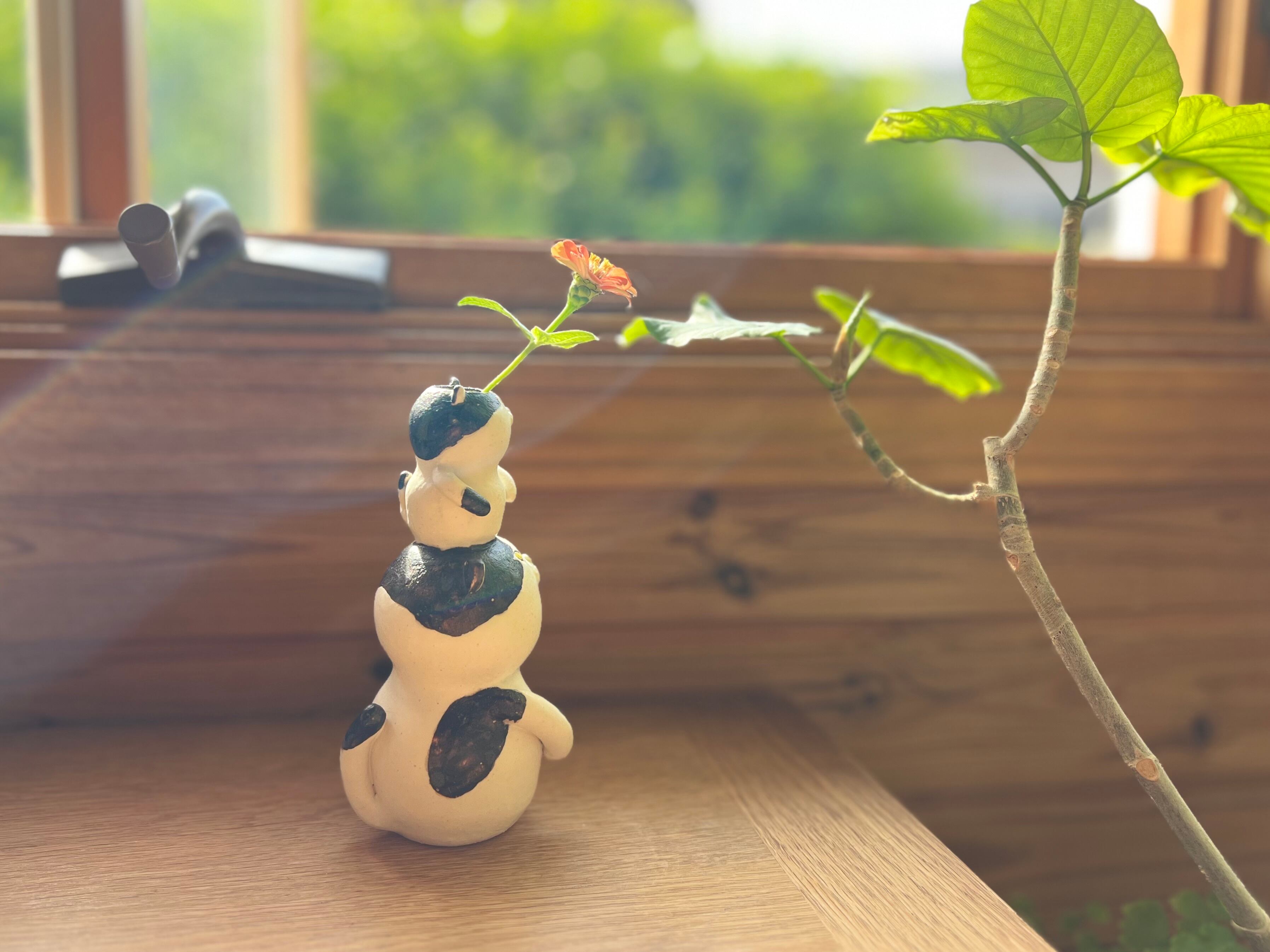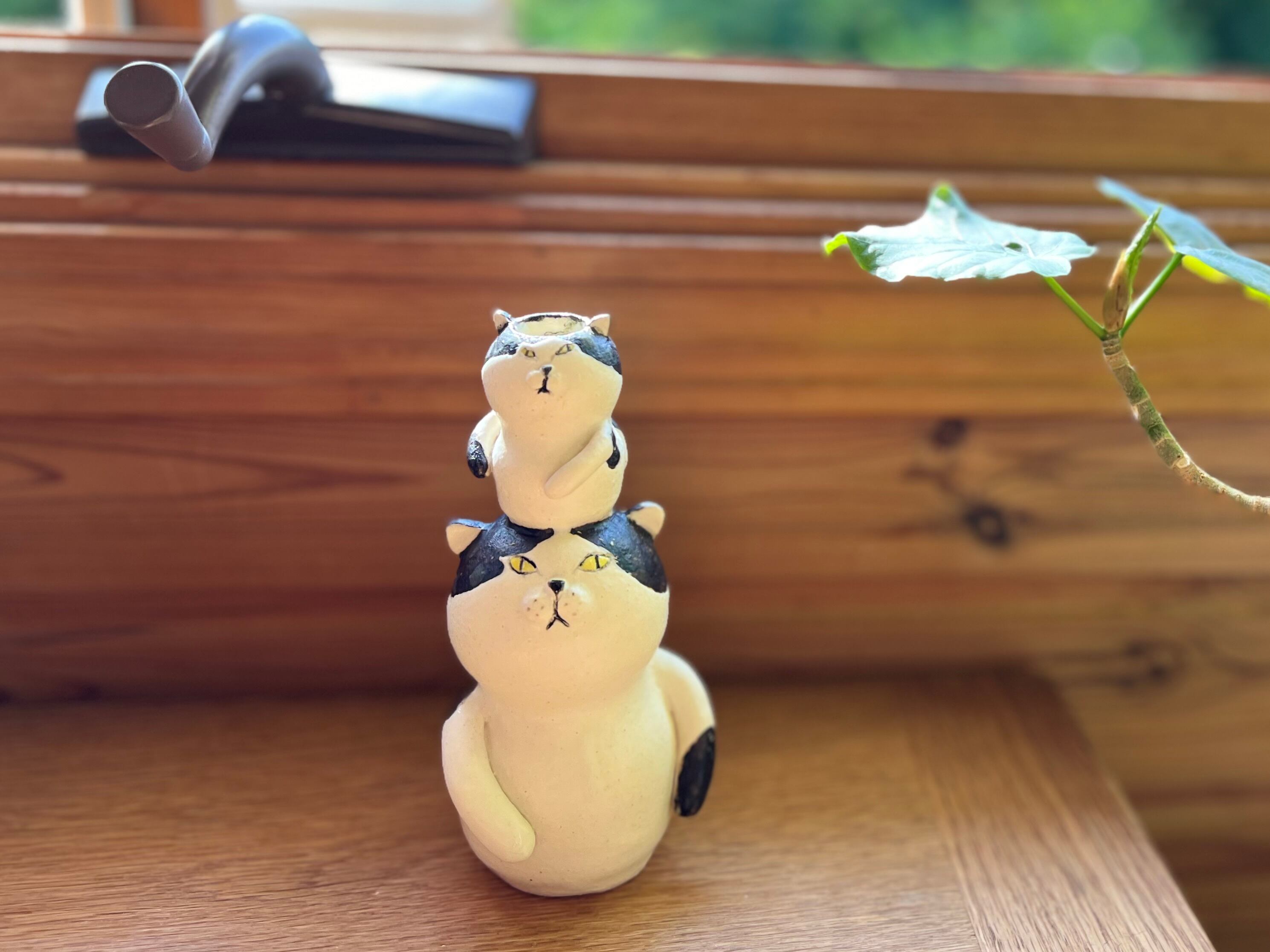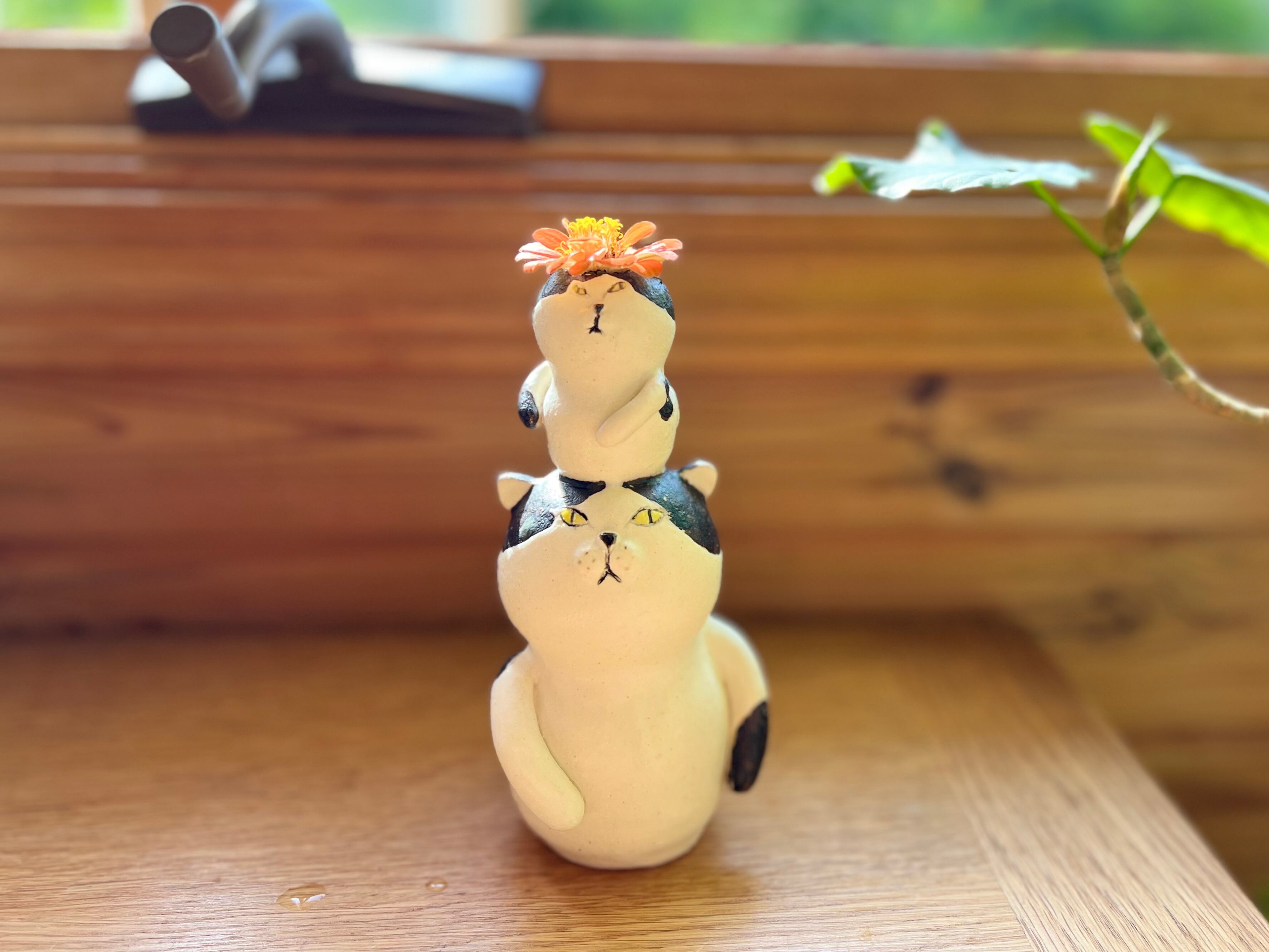 ハチワレ猫さんが小さい猫さんを頭に乗せた一輪挿しです。猫好きの方や花を飾るのが好きな方にぴったりのアイテムです。