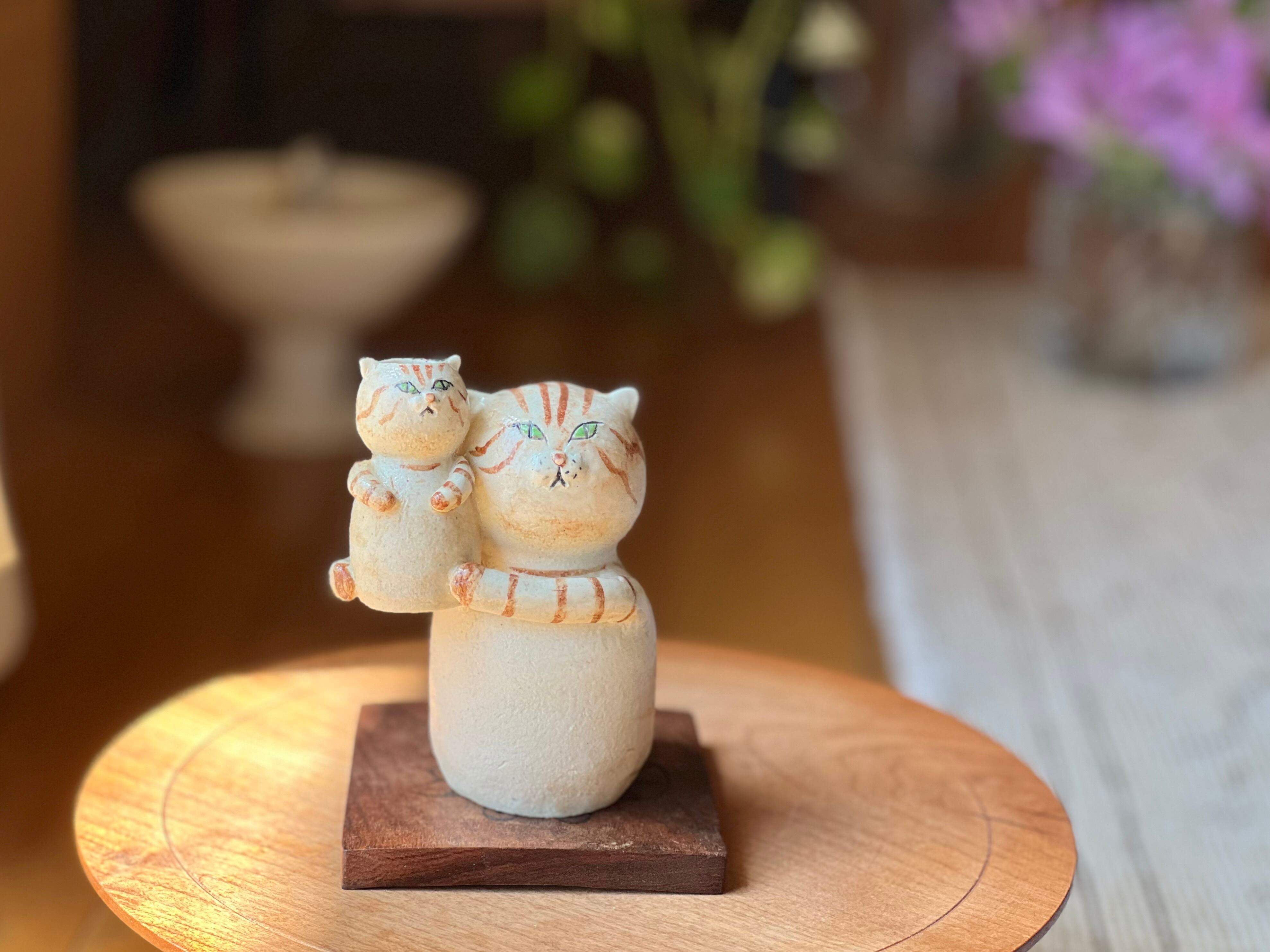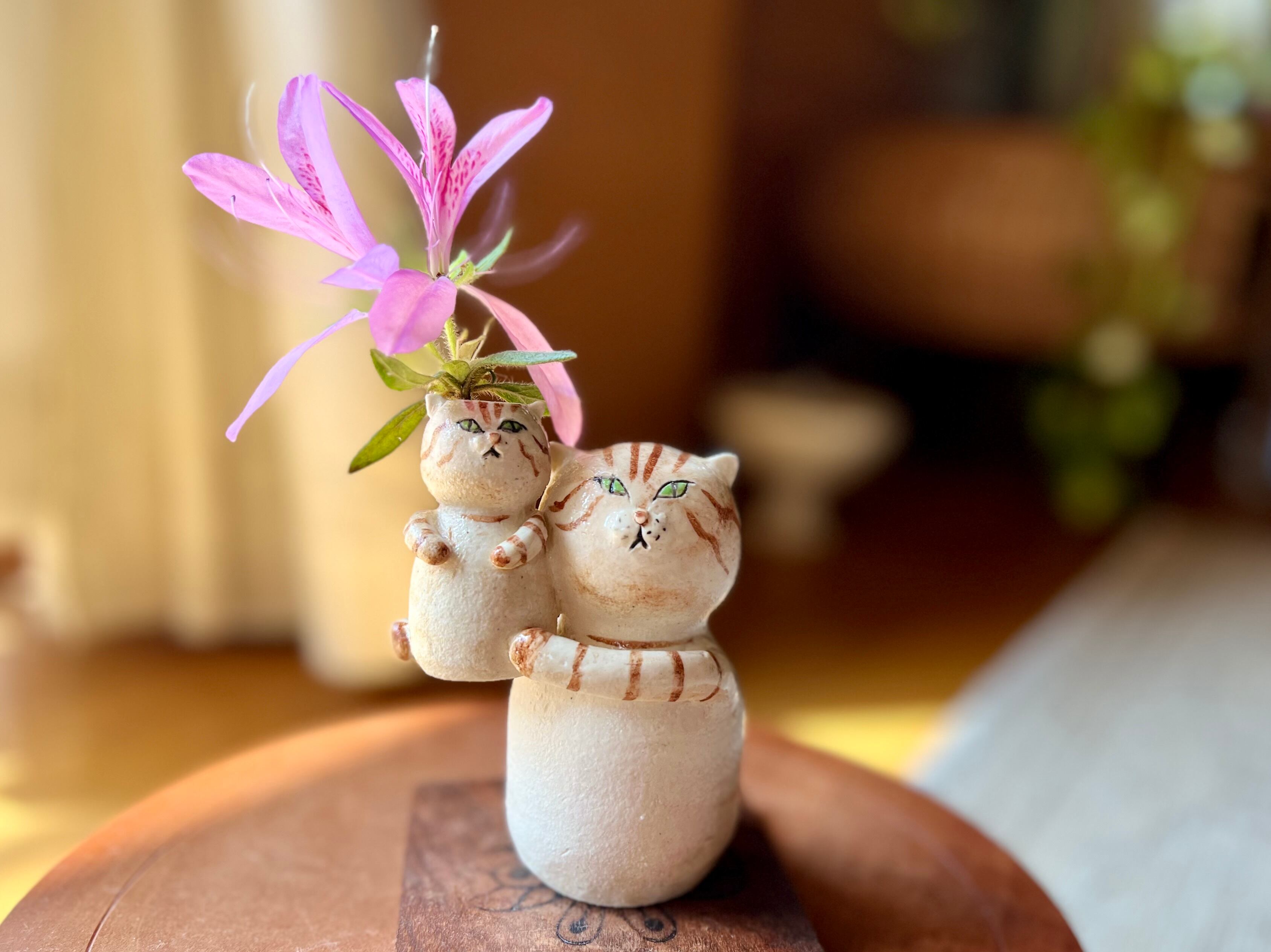 茶トラ猫さんが小さい猫さんを抱っこした一輪挿しです。猫好きの方や花を飾るのが好きな方にぴったりのアイテムです。