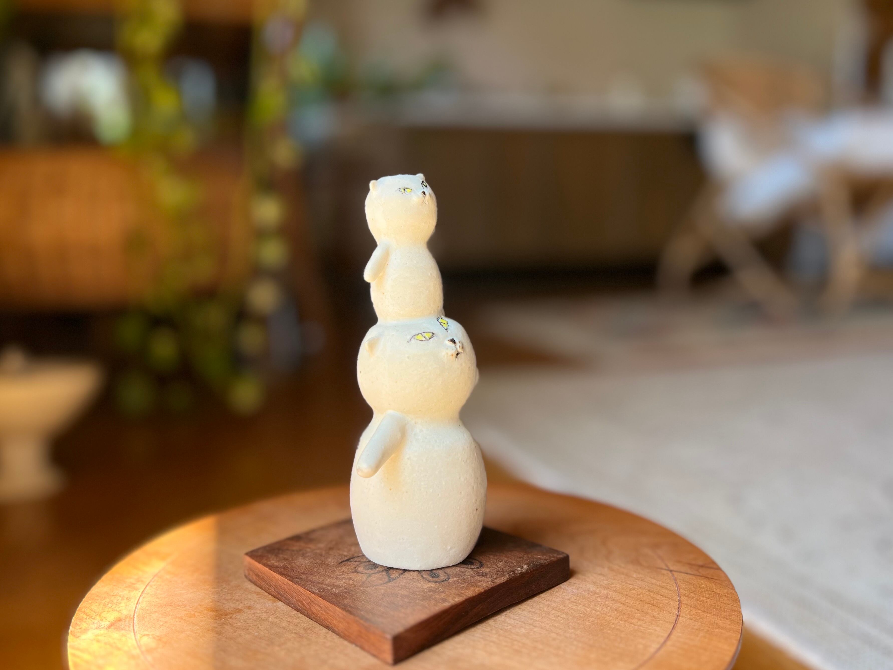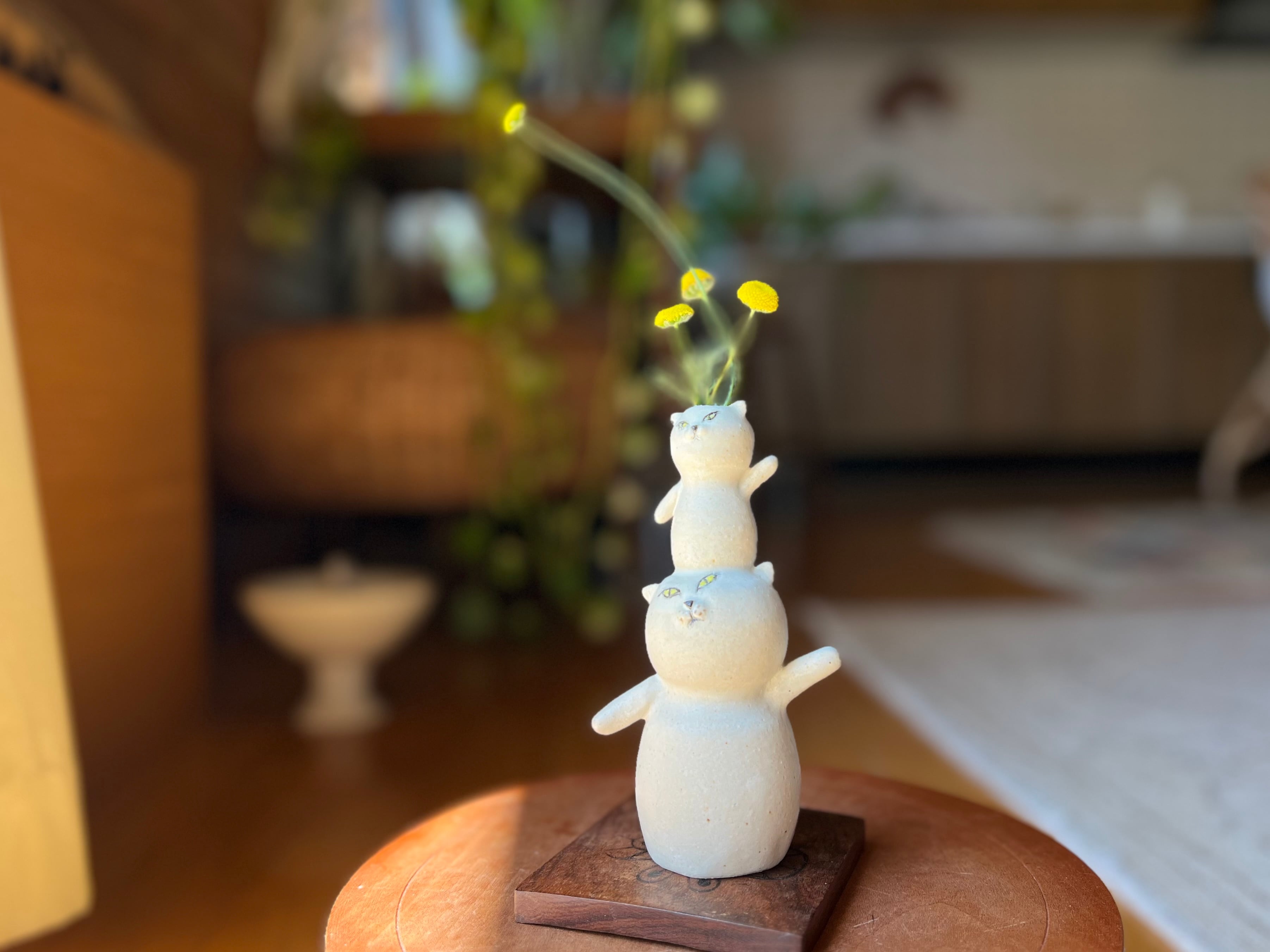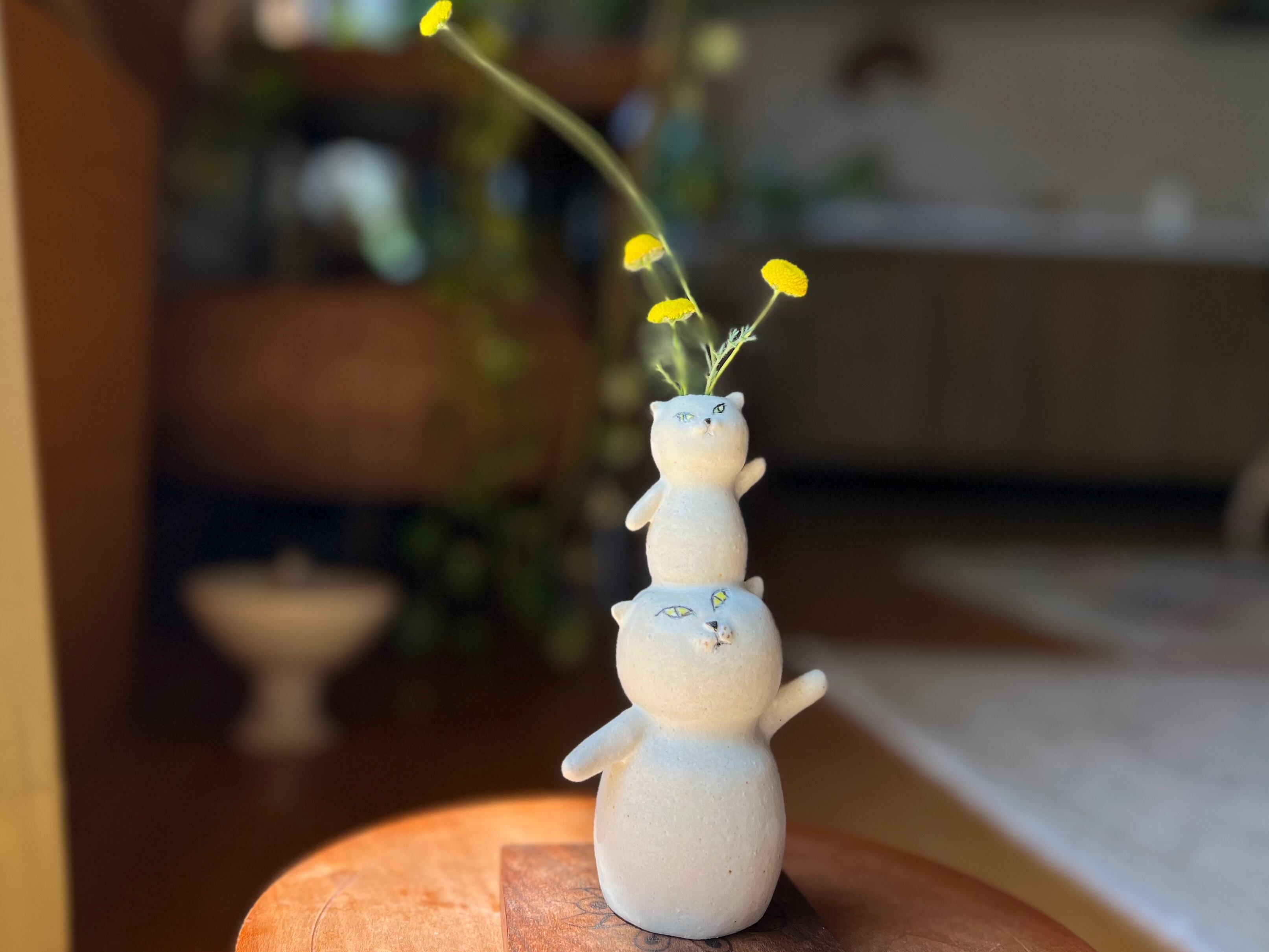 白猫さんが小さい猫さんを頭に乗せた一輪挿しです。猫好きの方や花を飾るのが好きな方にぴったりのアイテムです。