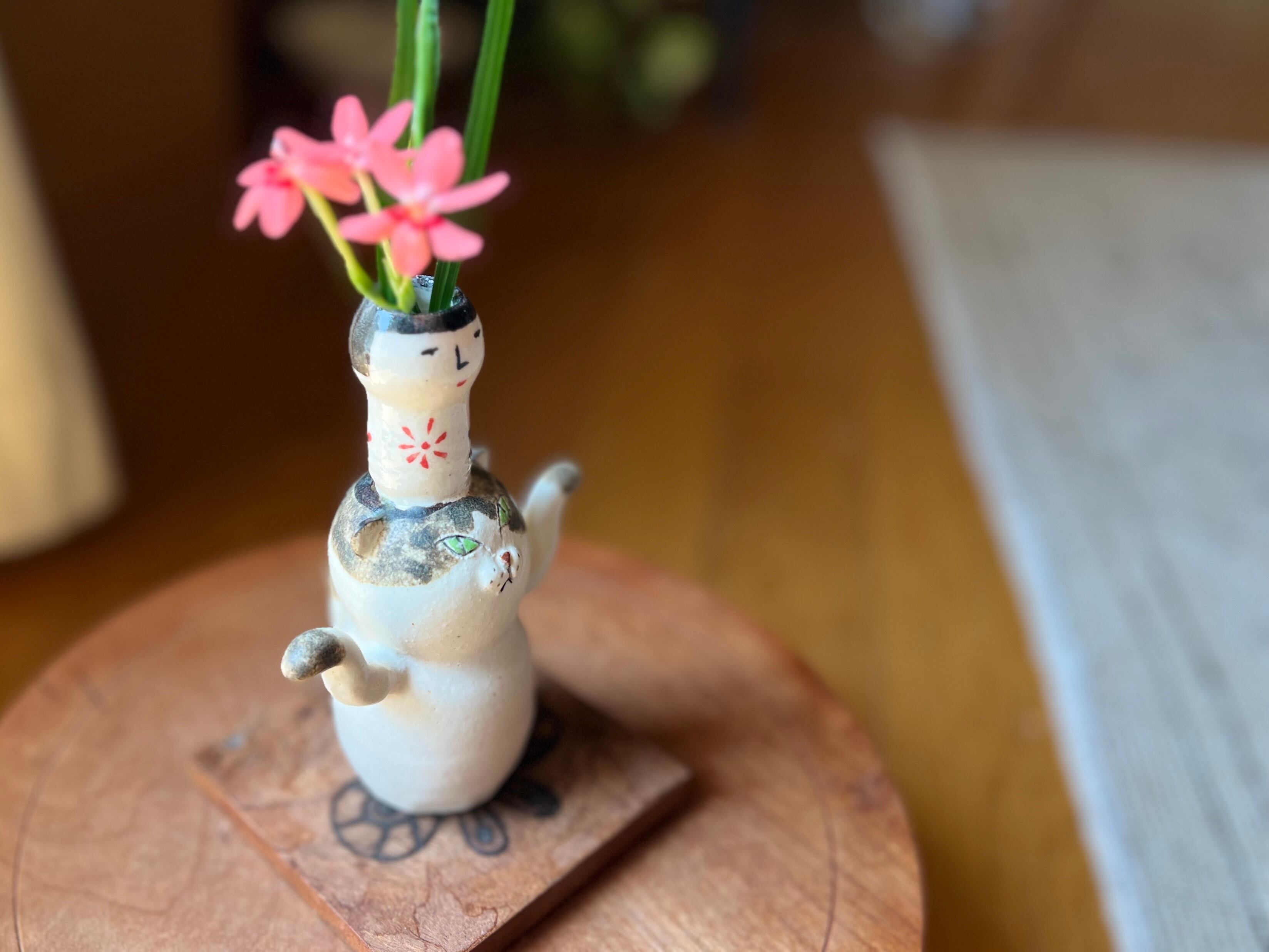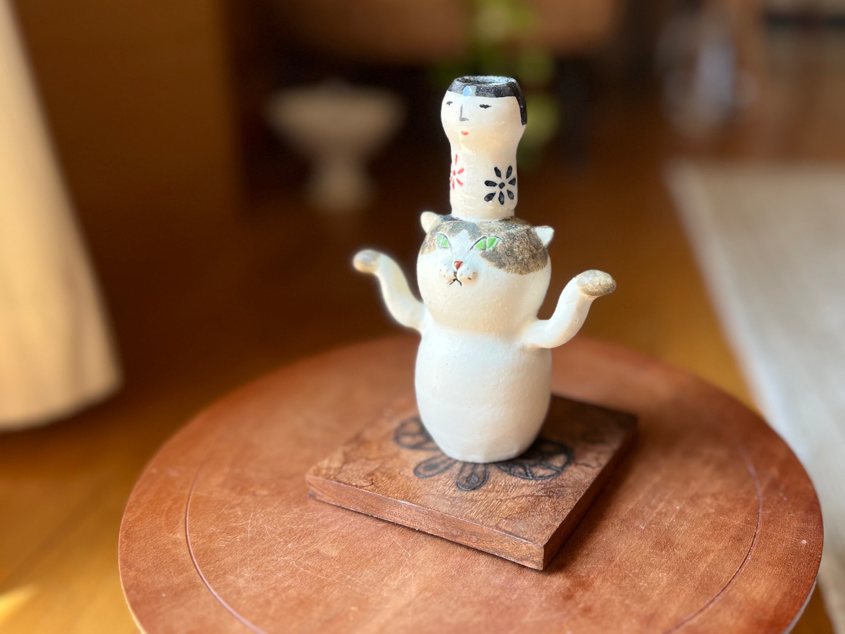 ぶち猫さんがこけしを頭に乗せた一輪挿しです。猫好きの方や花を飾るのが好きな方にぴったりのアイテムです。