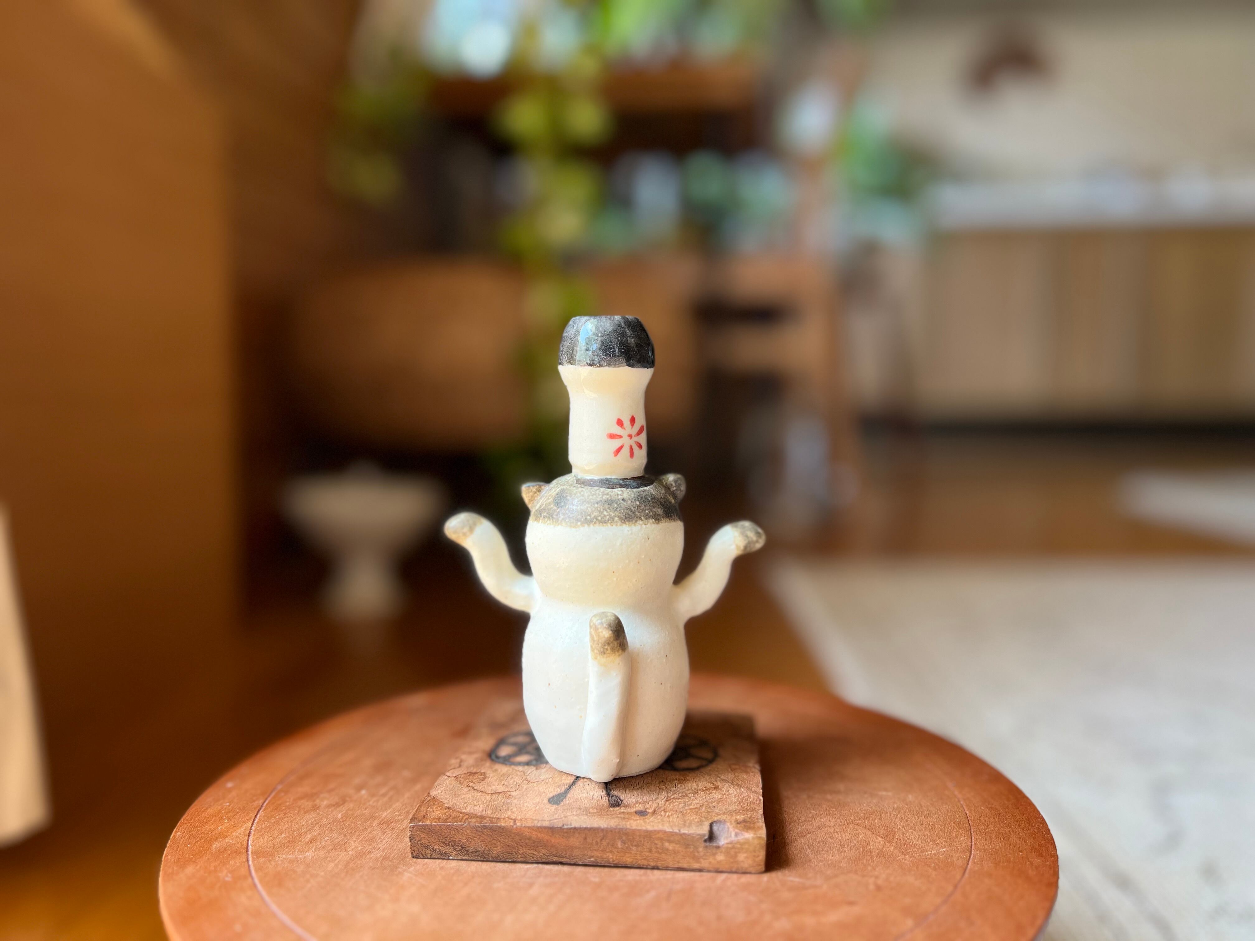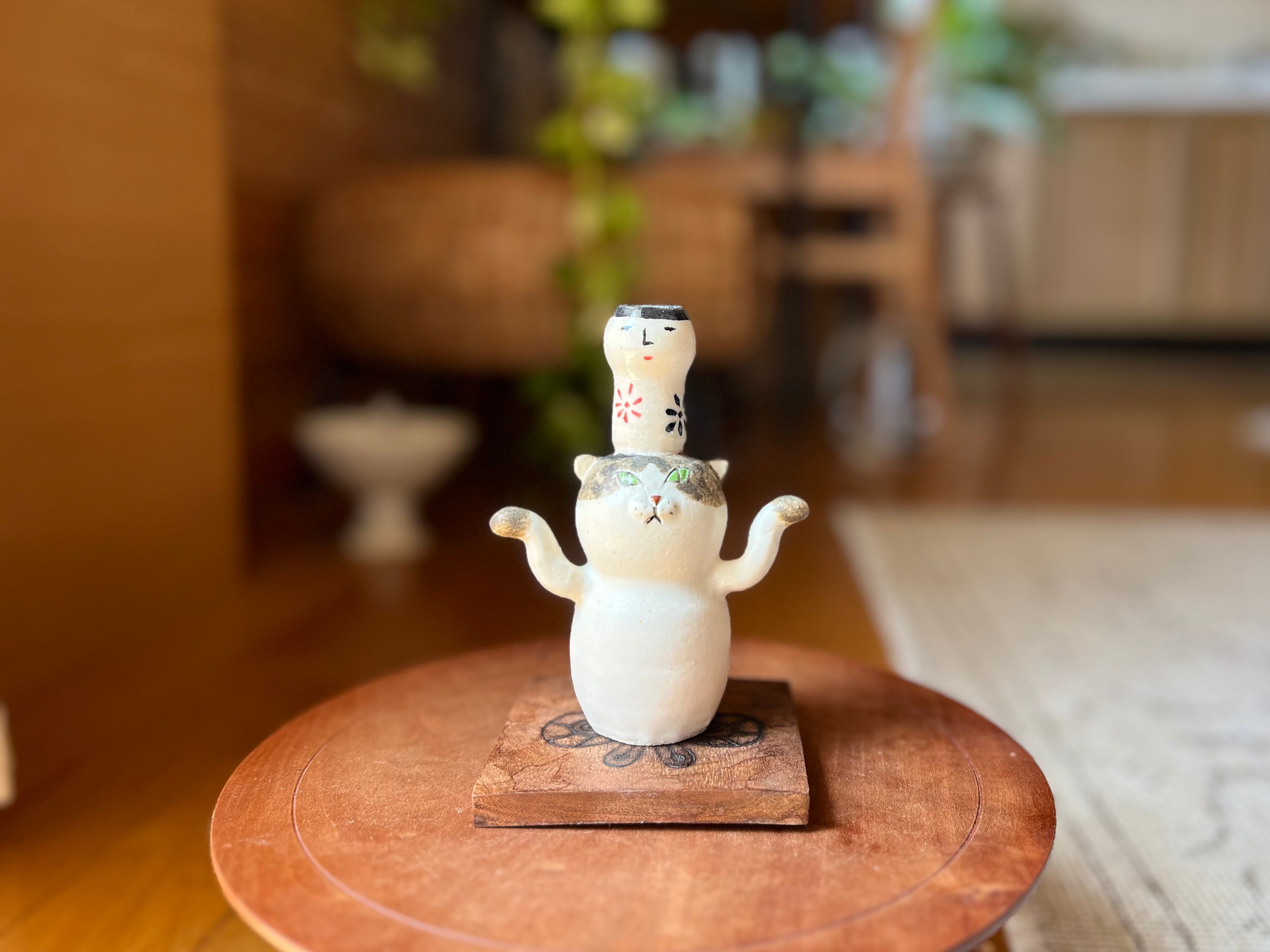 猫さん花瓶 頭の上にこけしを乗せたぶち猫さん