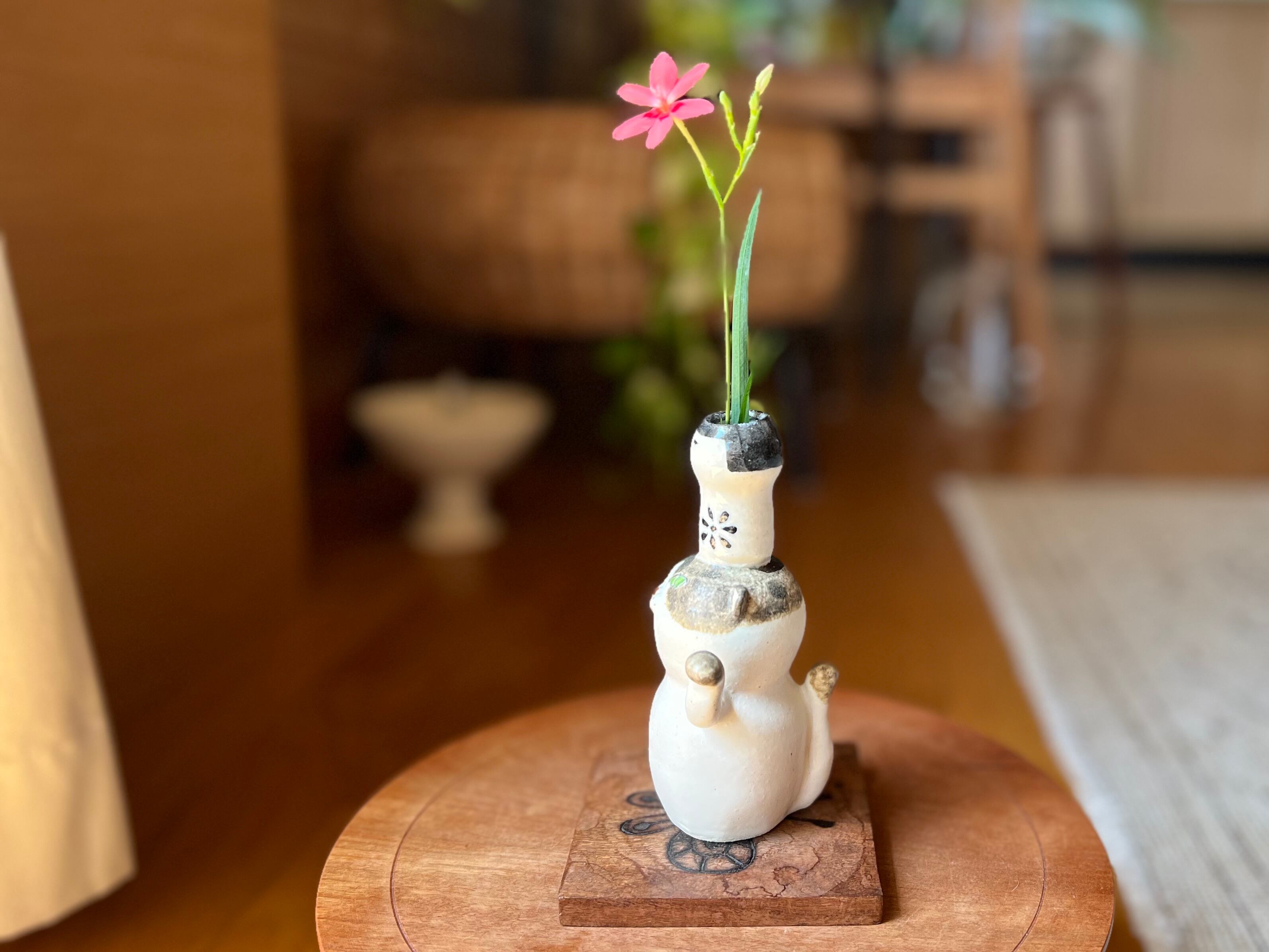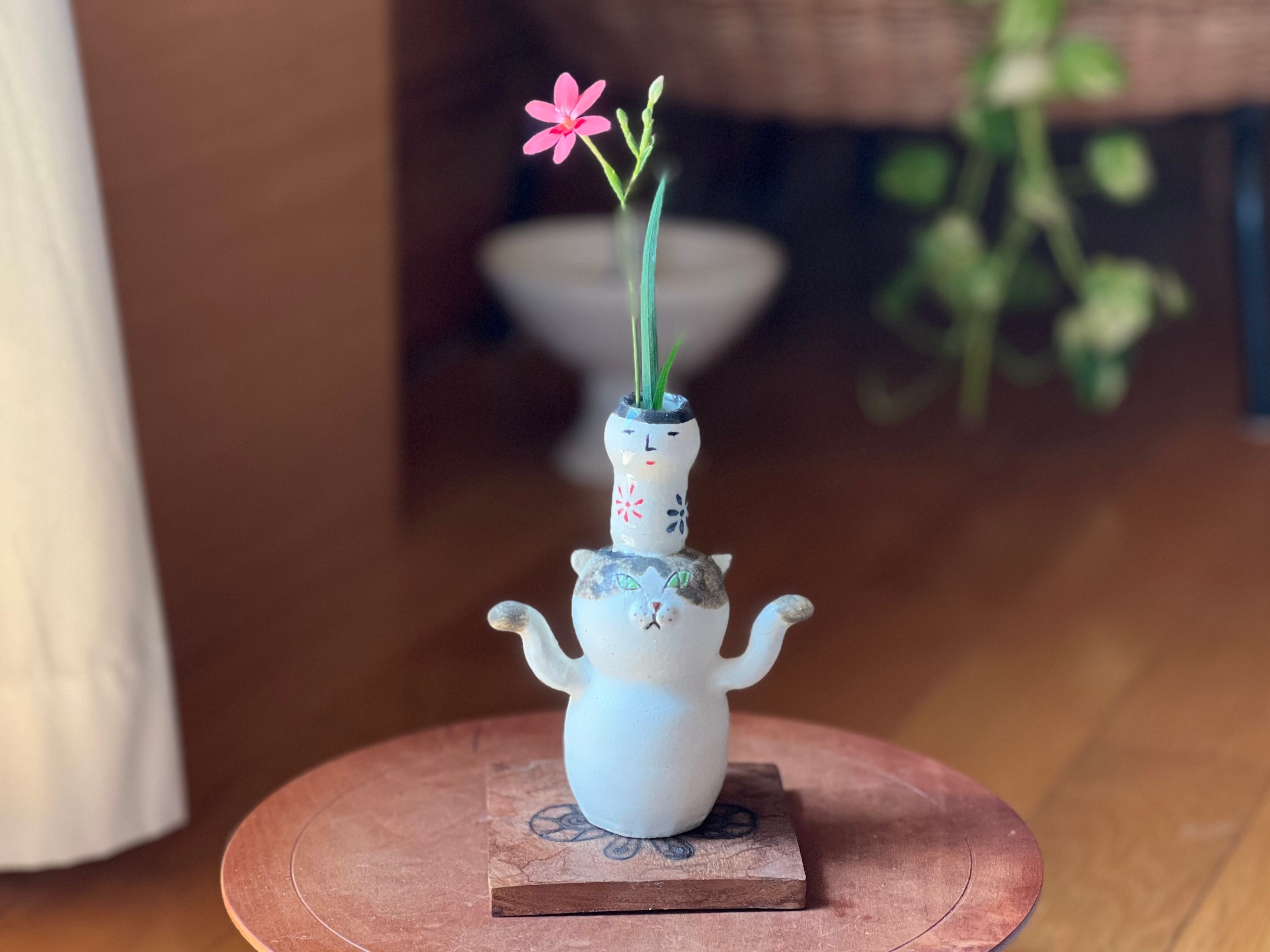 尚、この花瓶は猫本体と頭に乗せているこけしの部分が繋がっているので、水を入れる際は猫本体の方にも水を入れるようにして下さい。