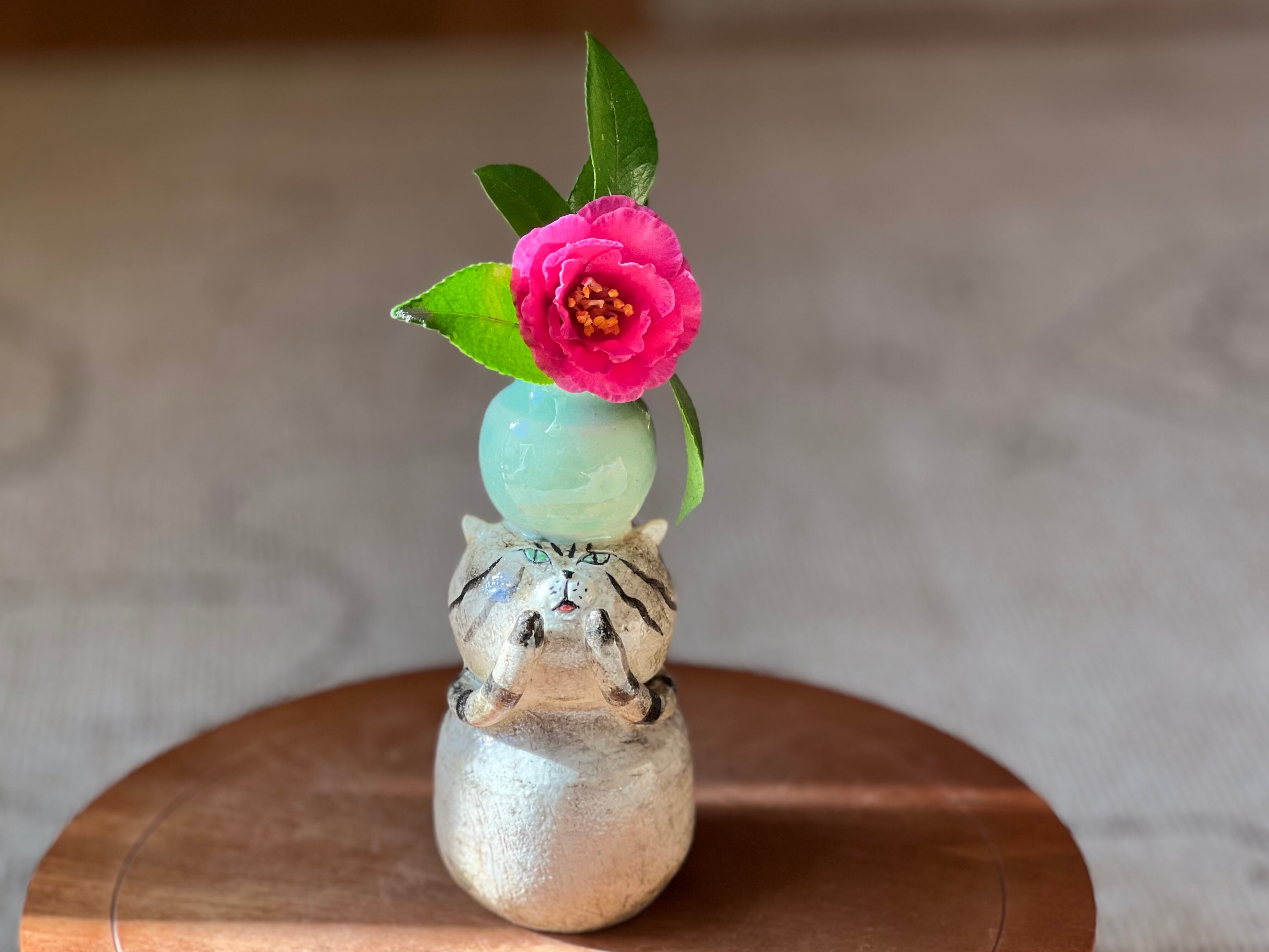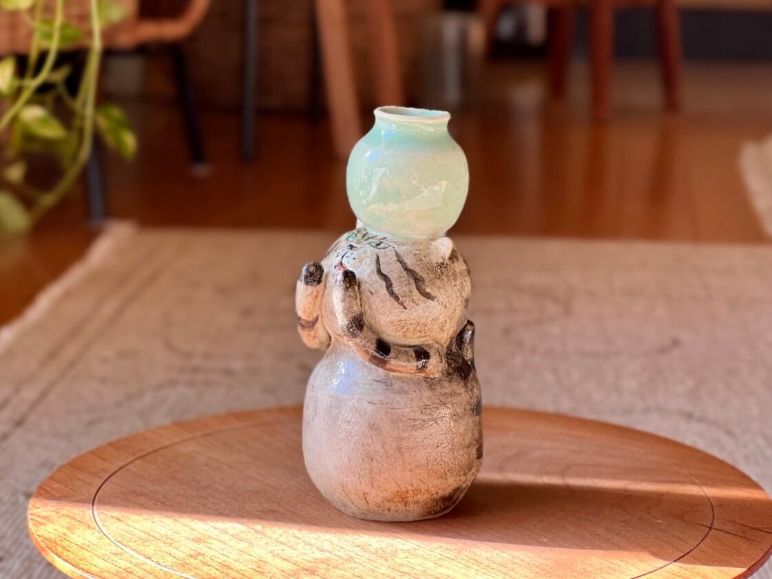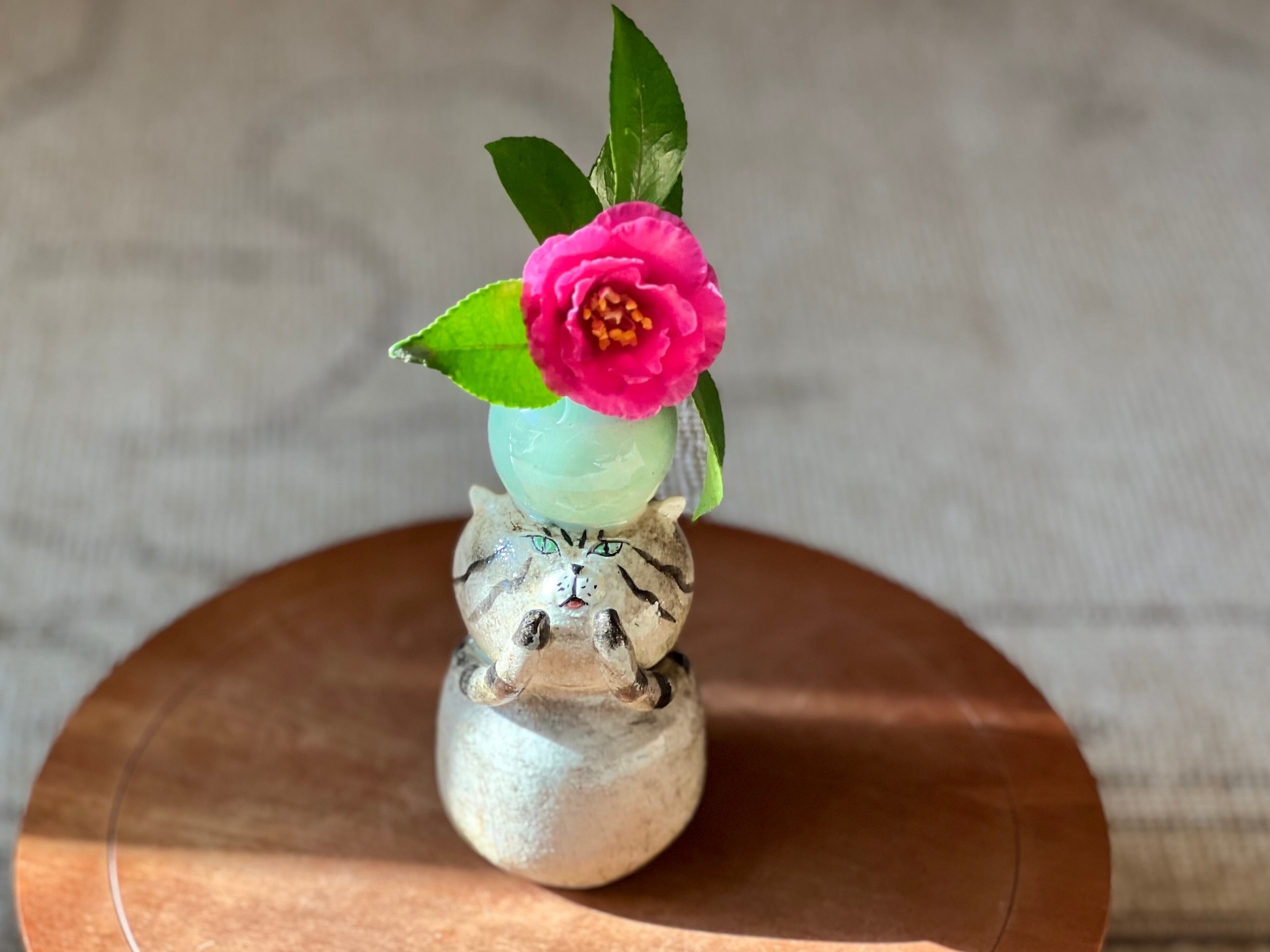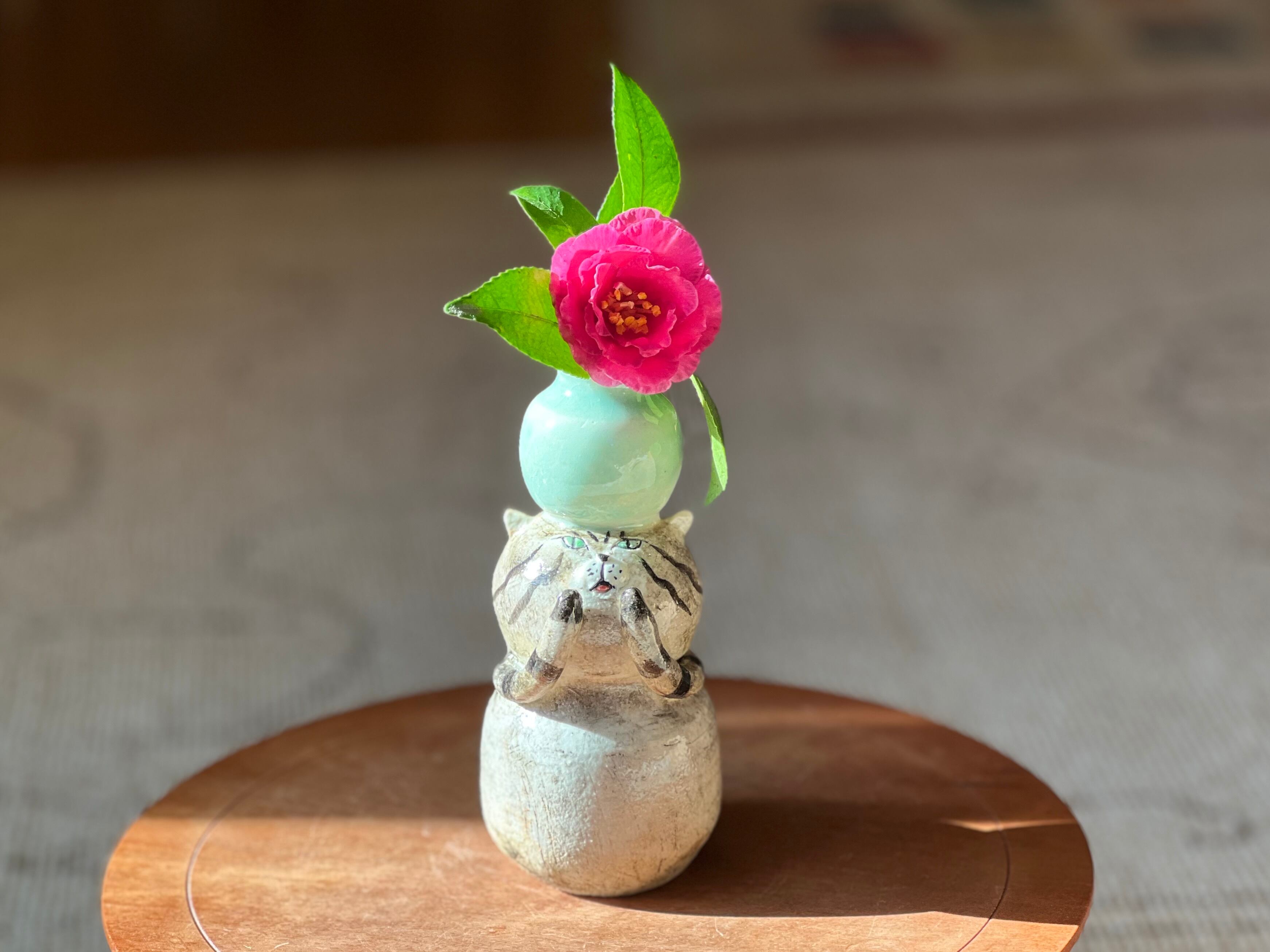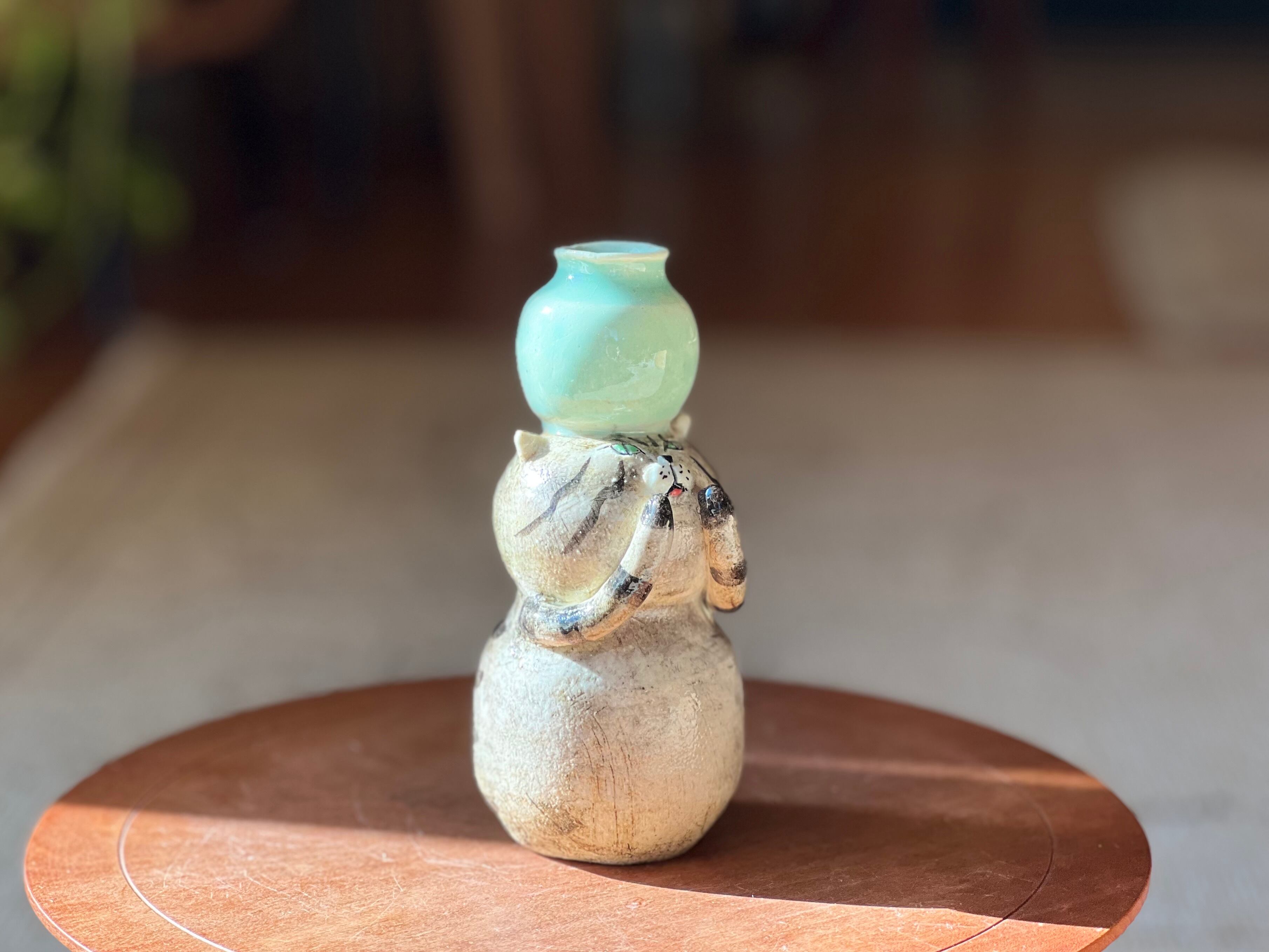 トラ猫さんが頭に花瓶を乗せた一輪挿しです。猫好きの方や花を飾るのが好きな方にぴったりのアイテムです。
