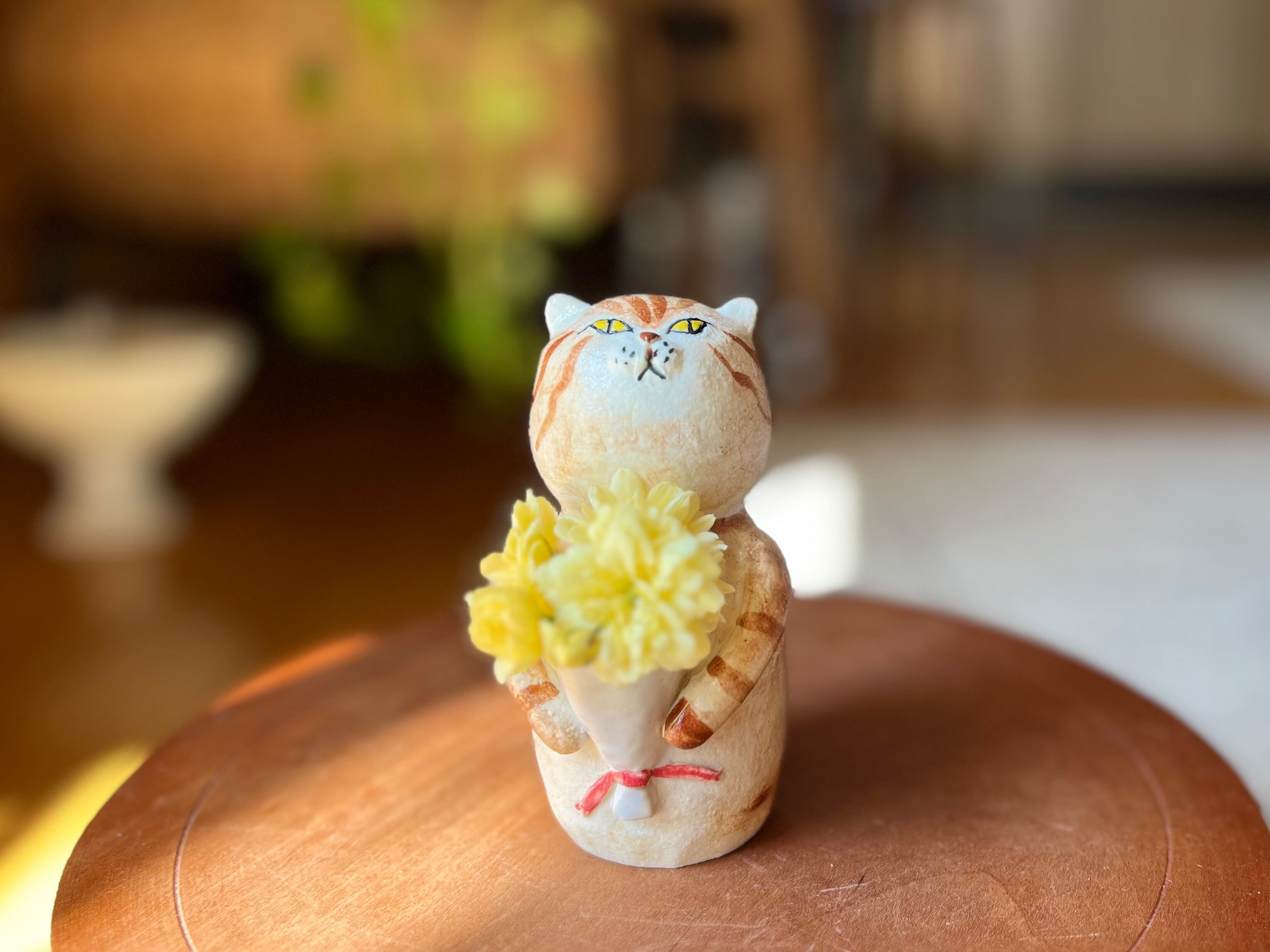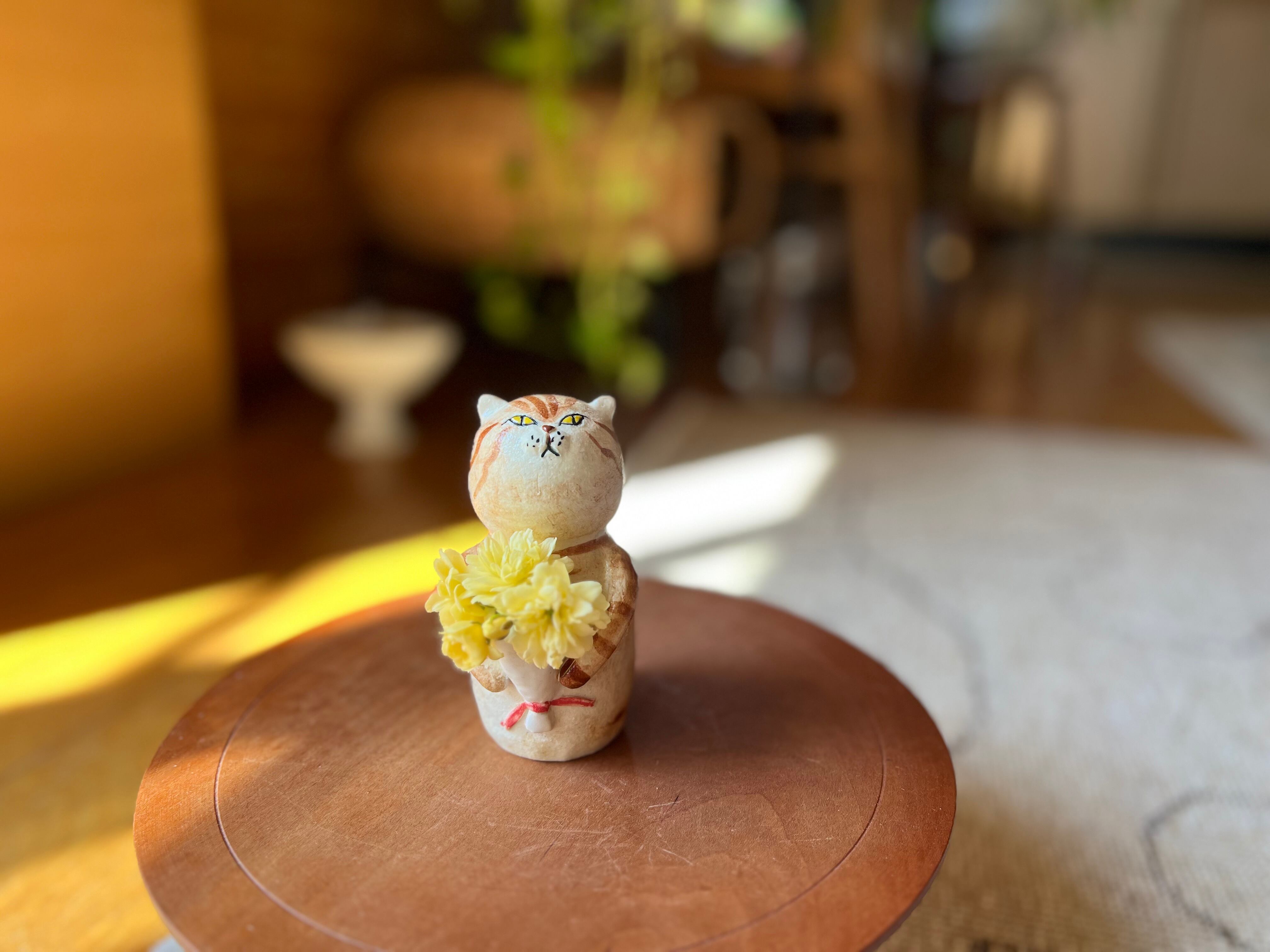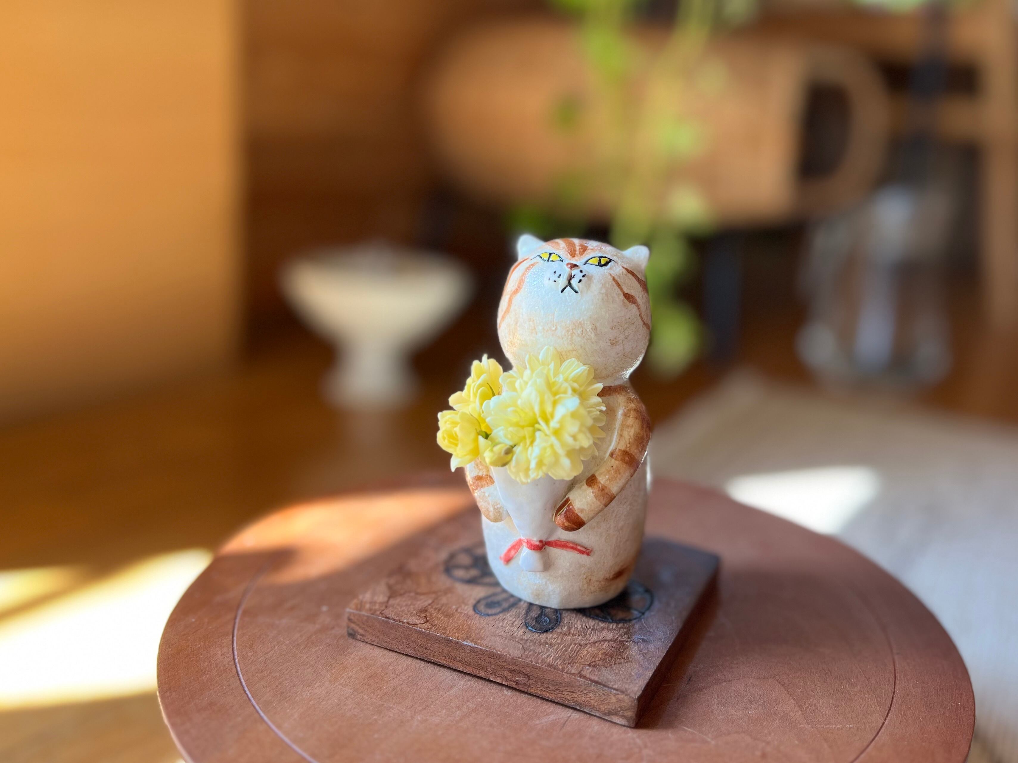 茶トラ猫さんが花瓶を持った一輪挿しです。猫好きの方や花を飾るのが好きな方にぴったりのアイテムです。