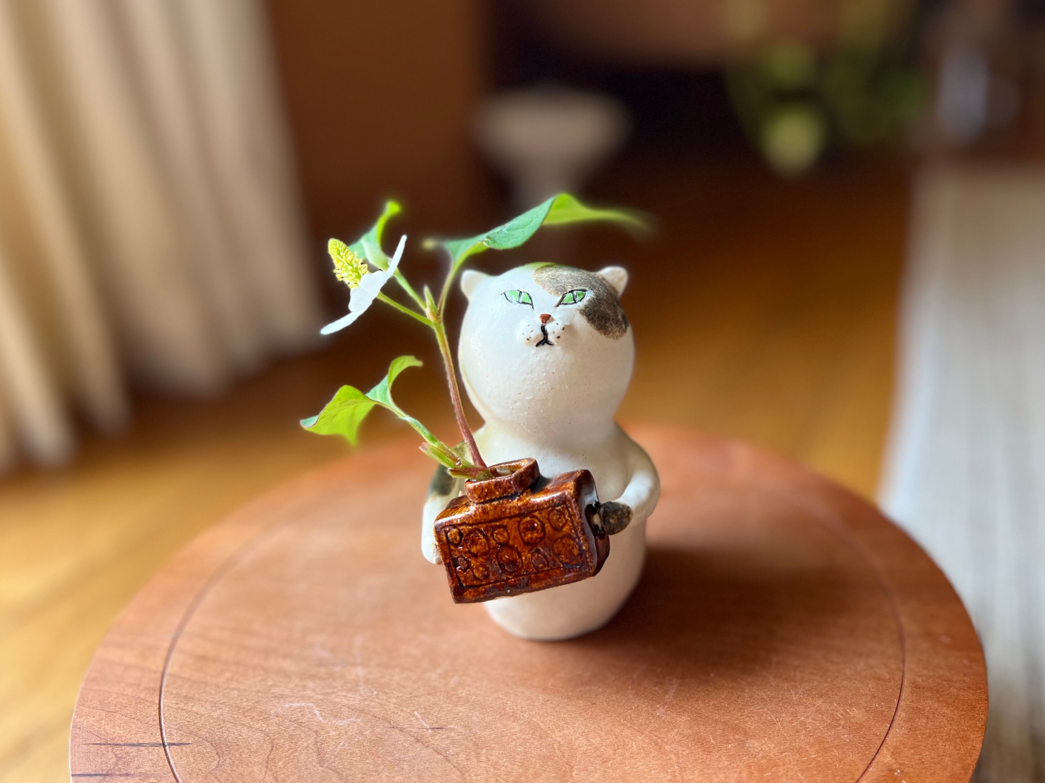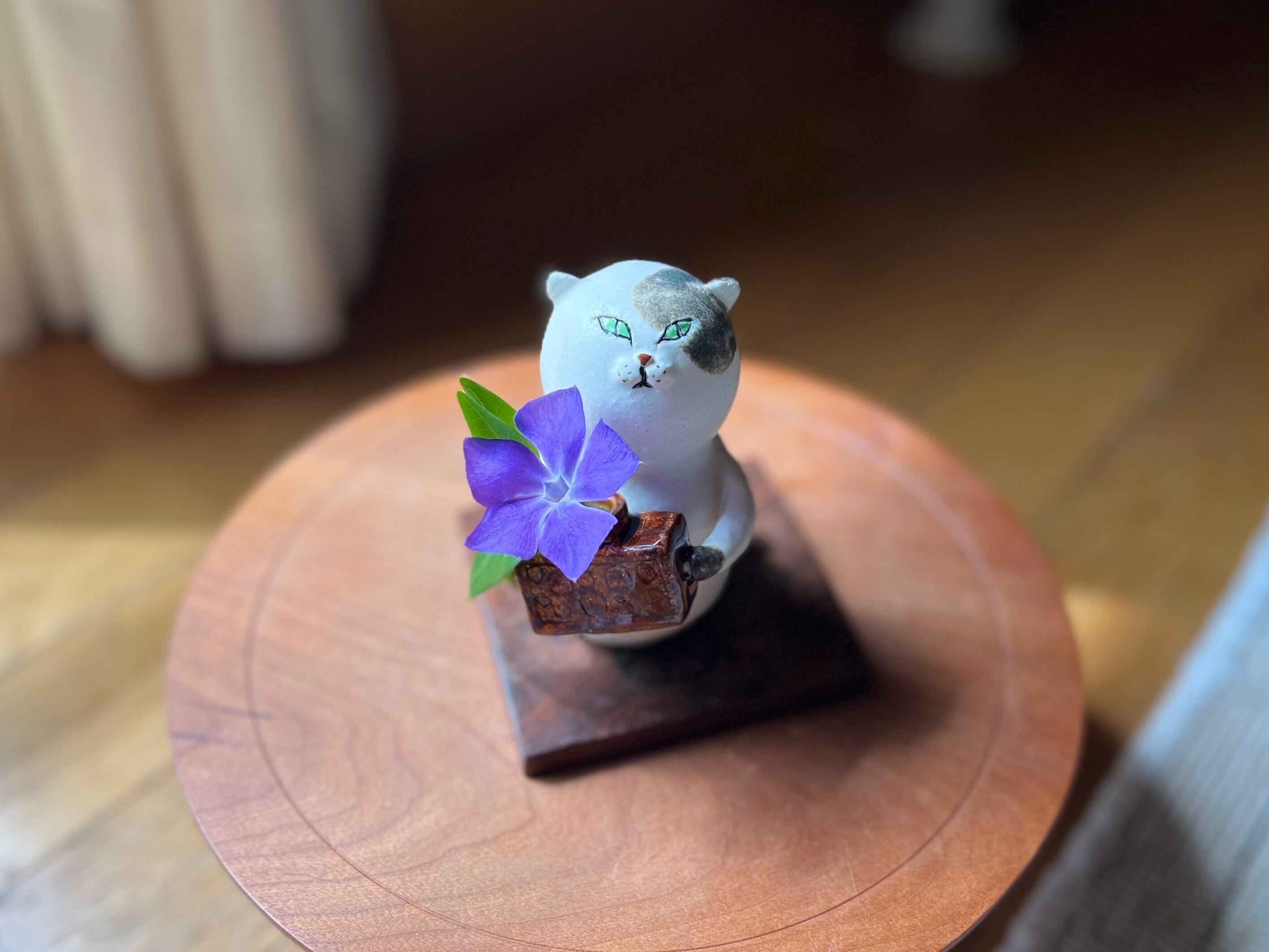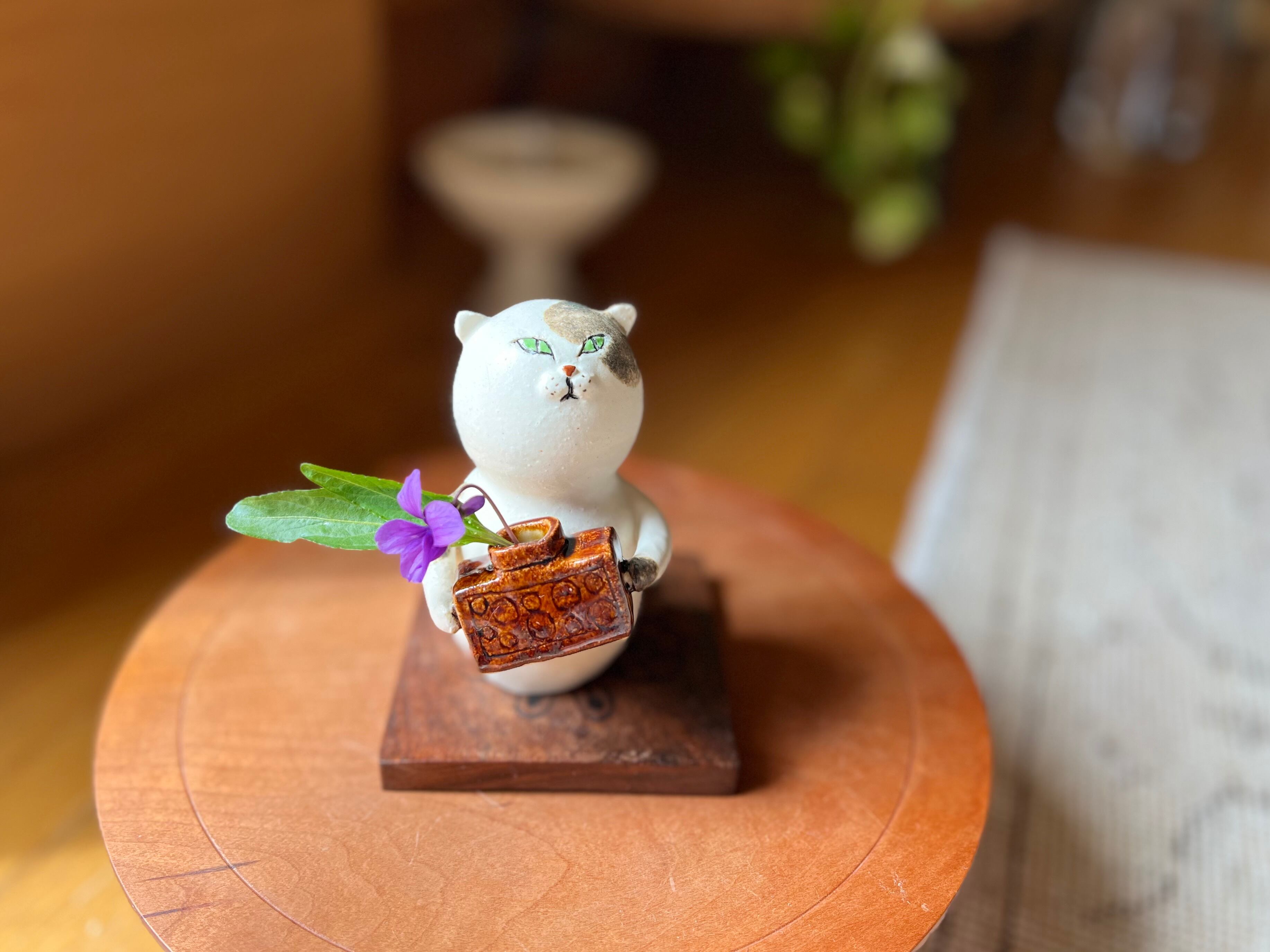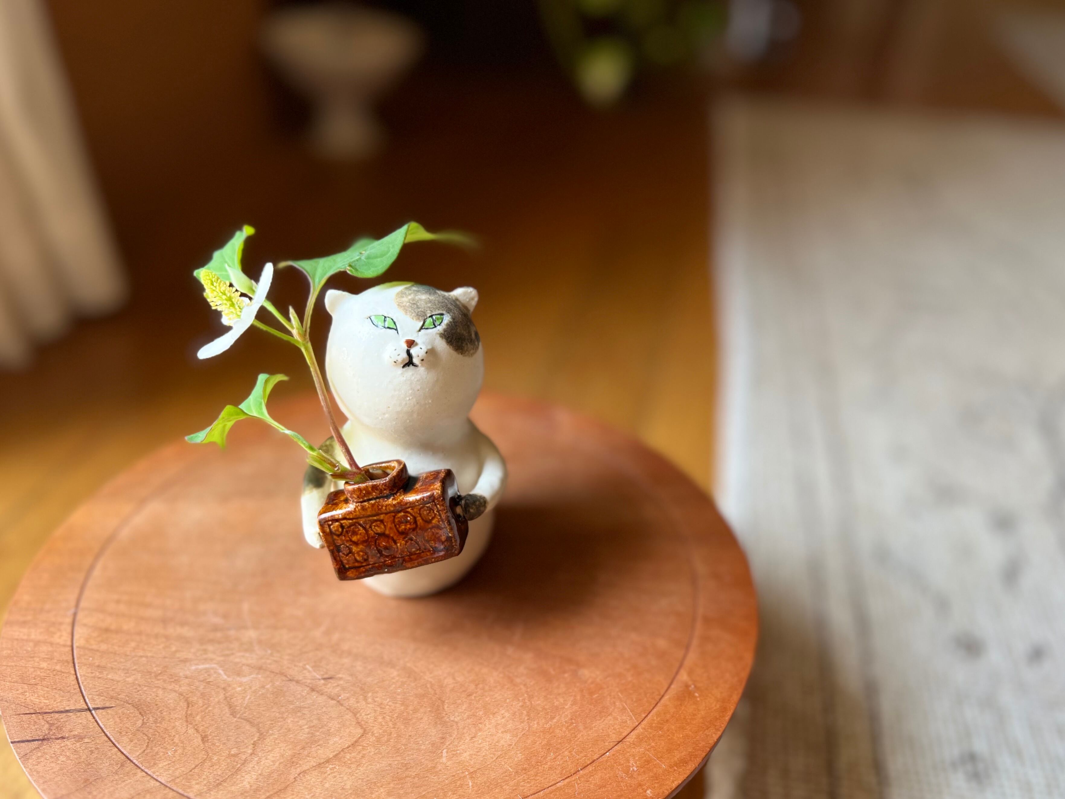 三毛猫さんが花瓶を持った一輪挿しです。猫好きの方や花を飾るのが好きな方にぴったりのアイテムです。