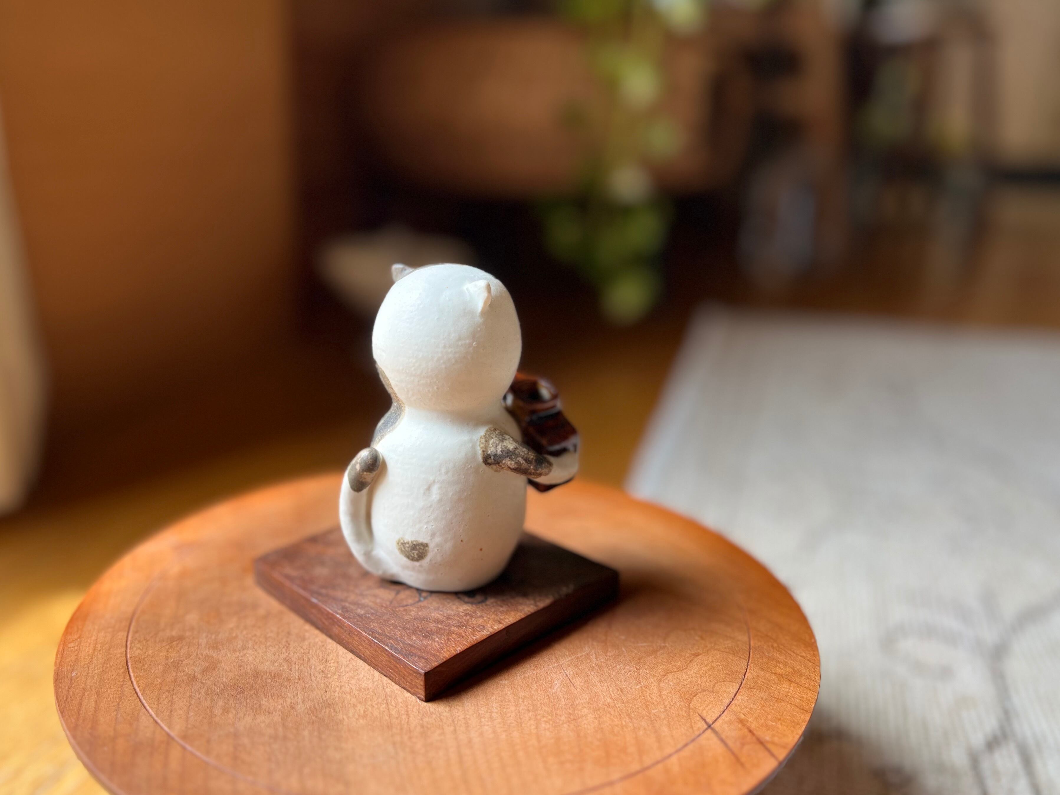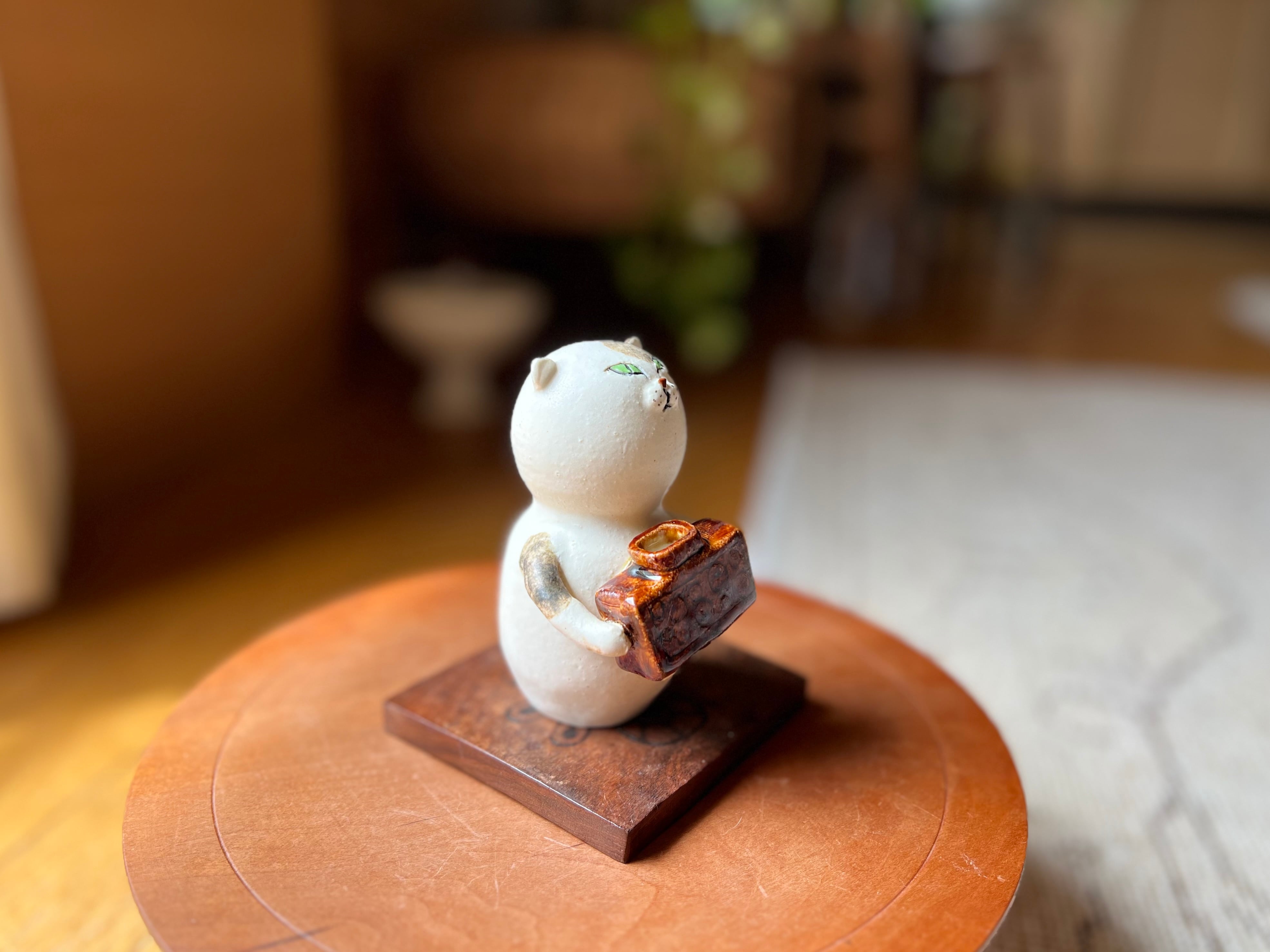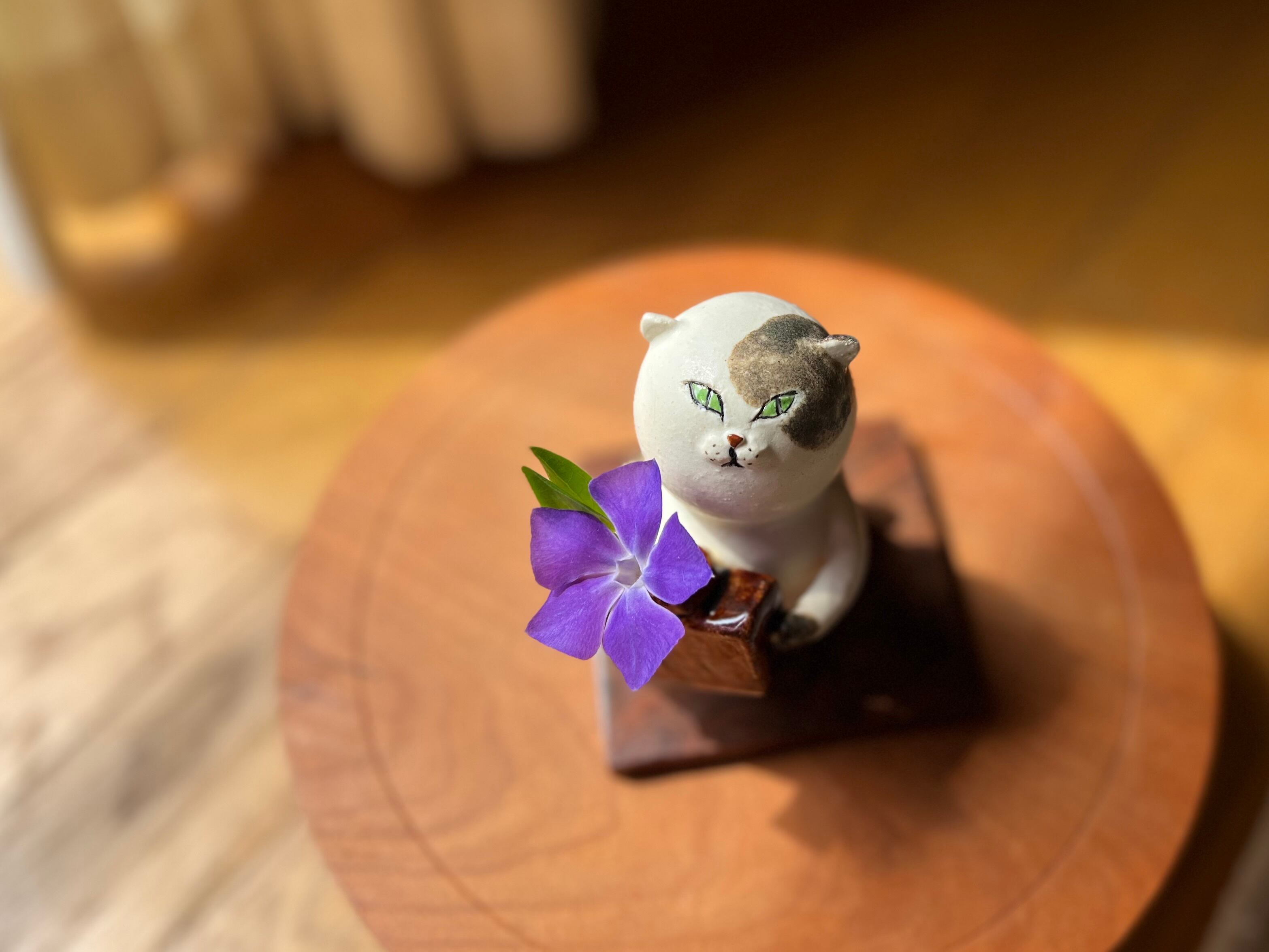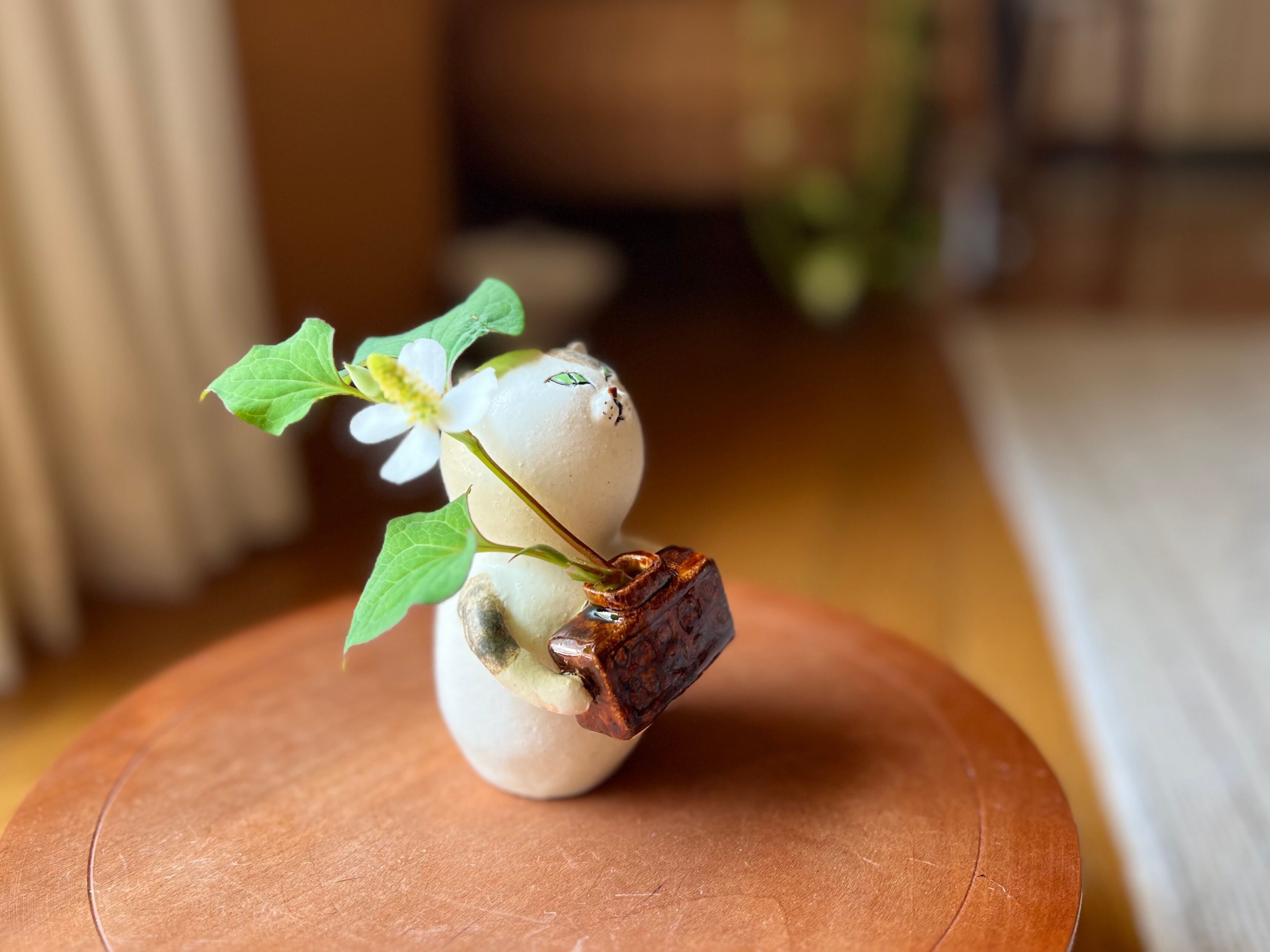 三毛猫さんが花瓶を持った一輪挿しです。猫好きの方や花を飾るのが好きな方にぴったりのアイテムです。