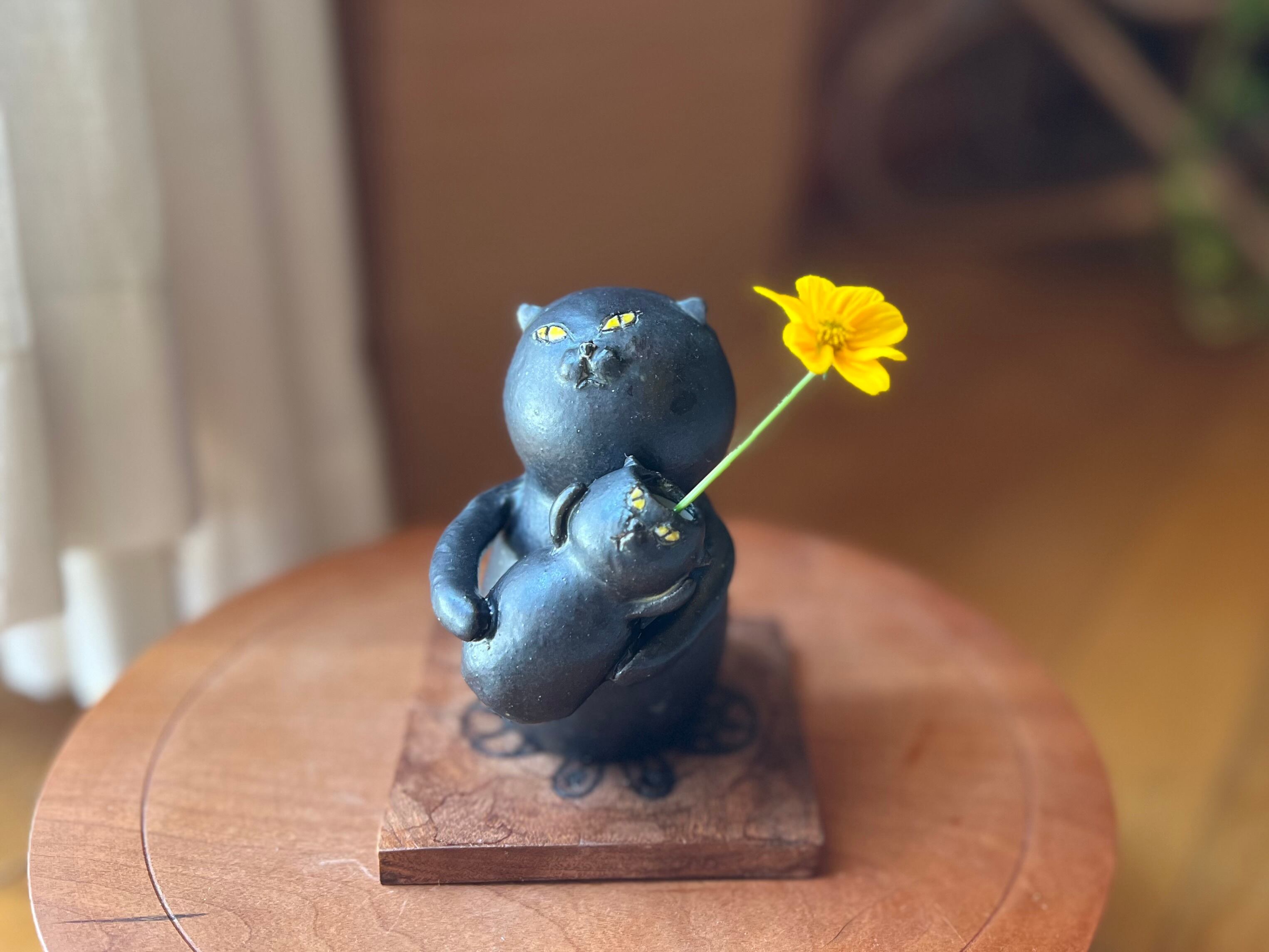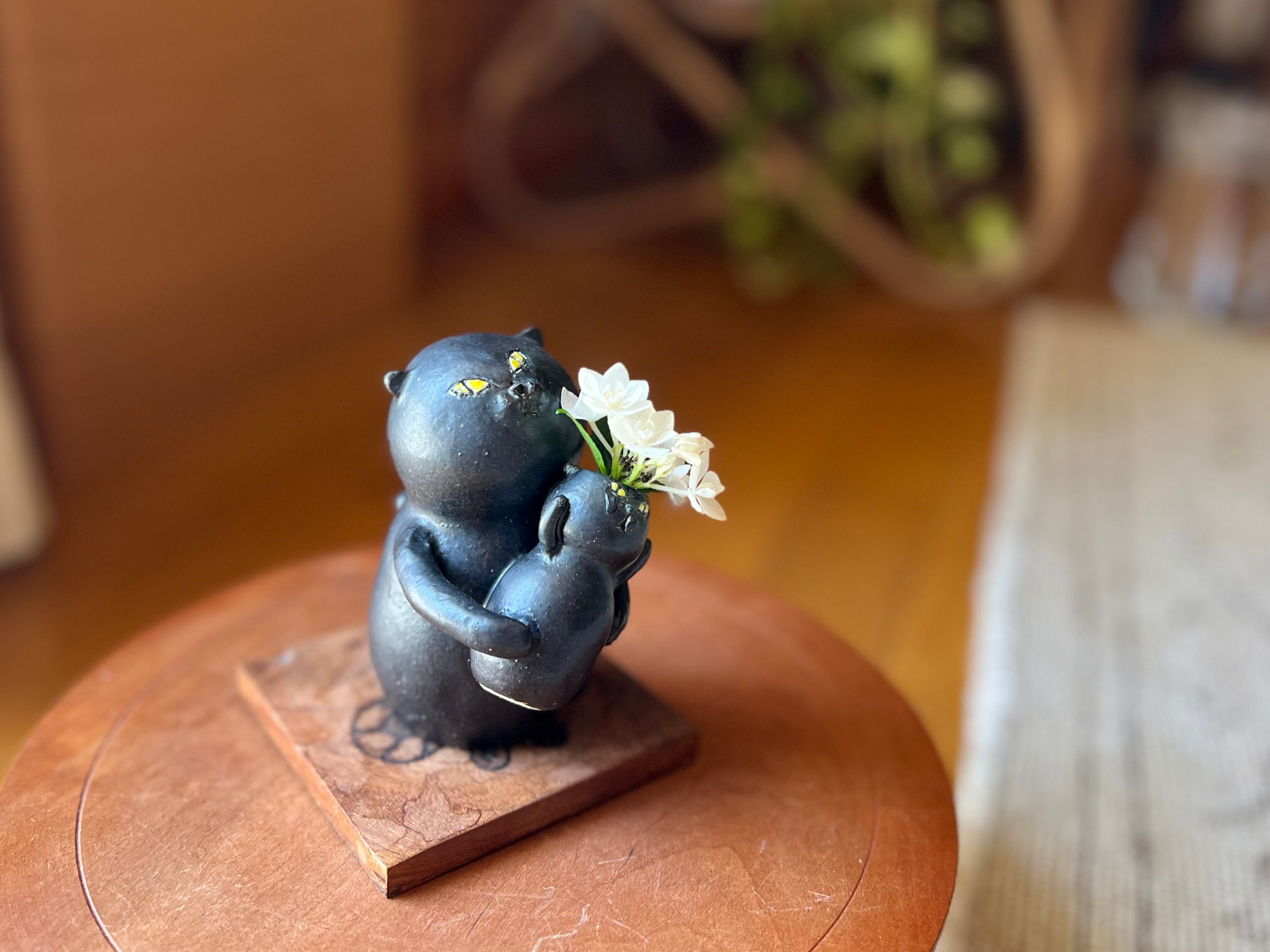 黒猫さんが小さい猫さんを抱っこした一輪挿しです。猫好きの方や花を飾るのが好きな方にぴったりのアイテムです。