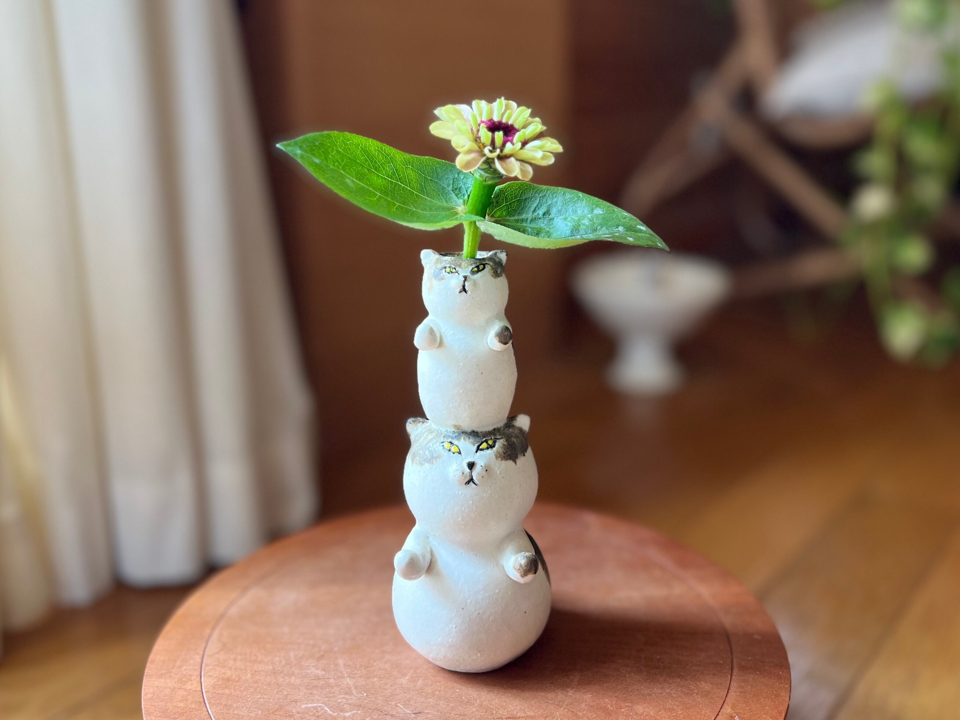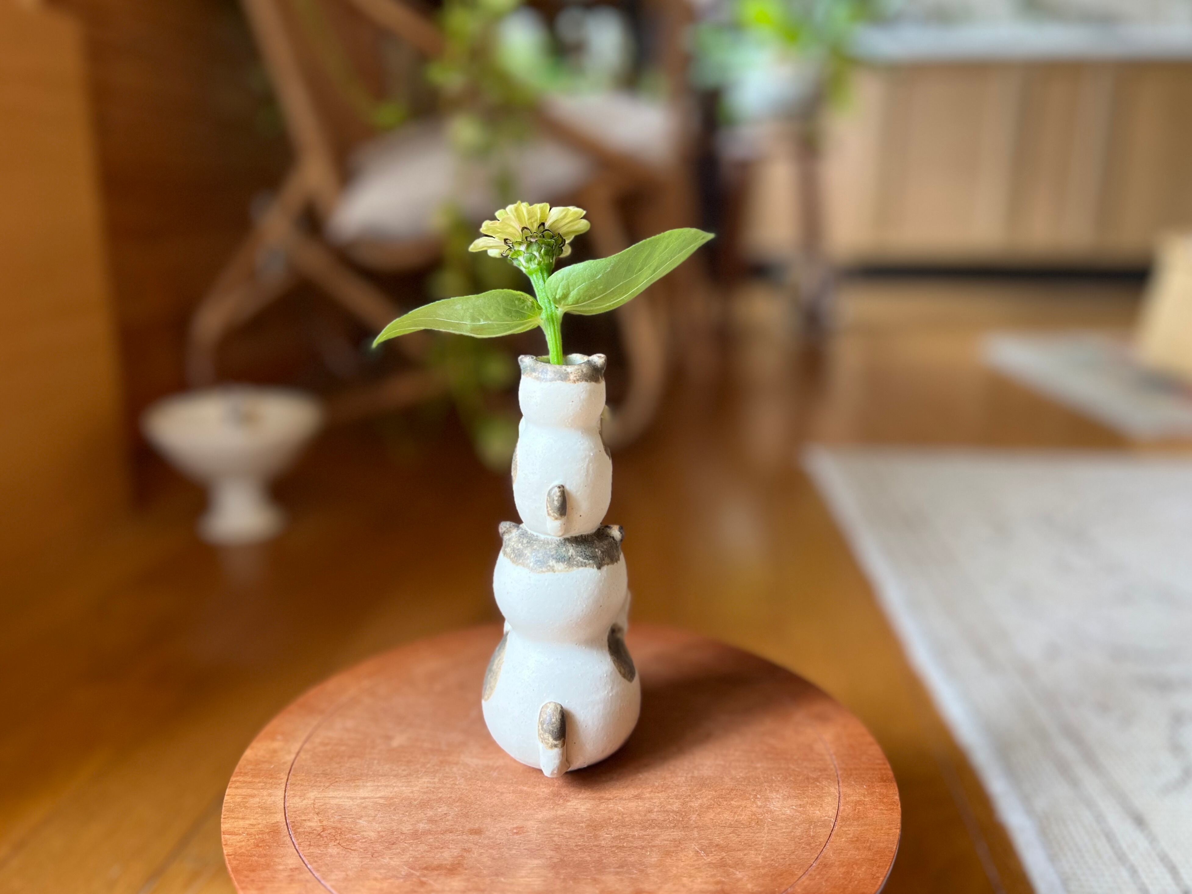 ぶち猫さんが小さい猫さんを頭に乗せた一輪挿しです。猫好きの方や花を飾るのが好きな方にぴったりのアイテムです。