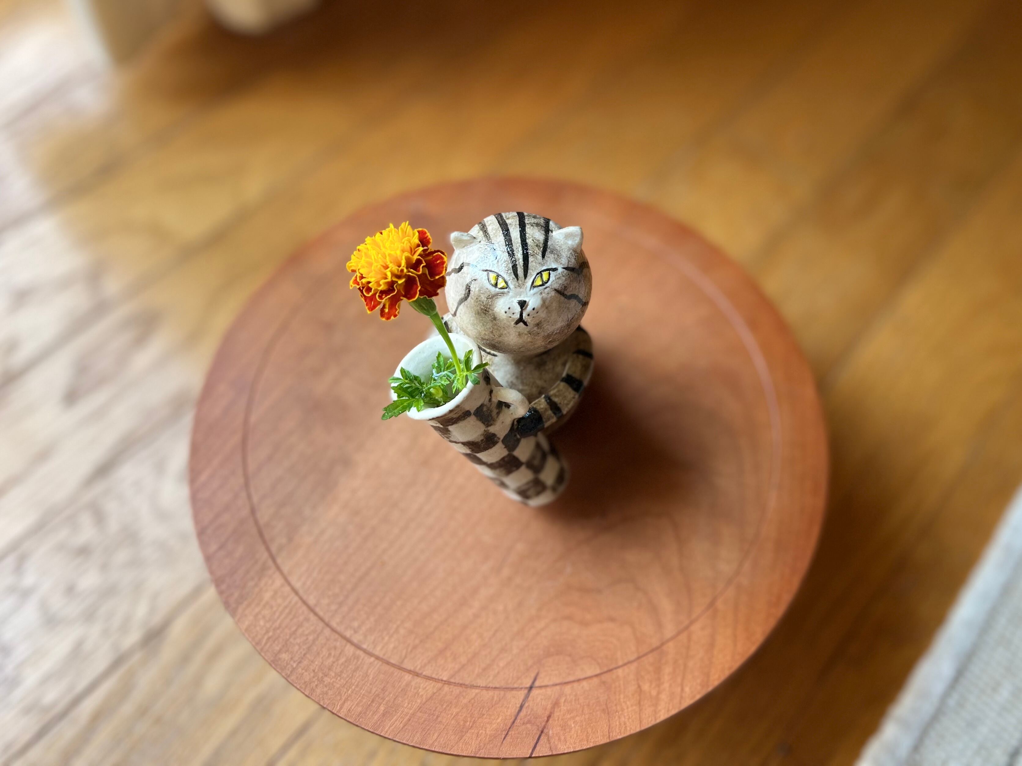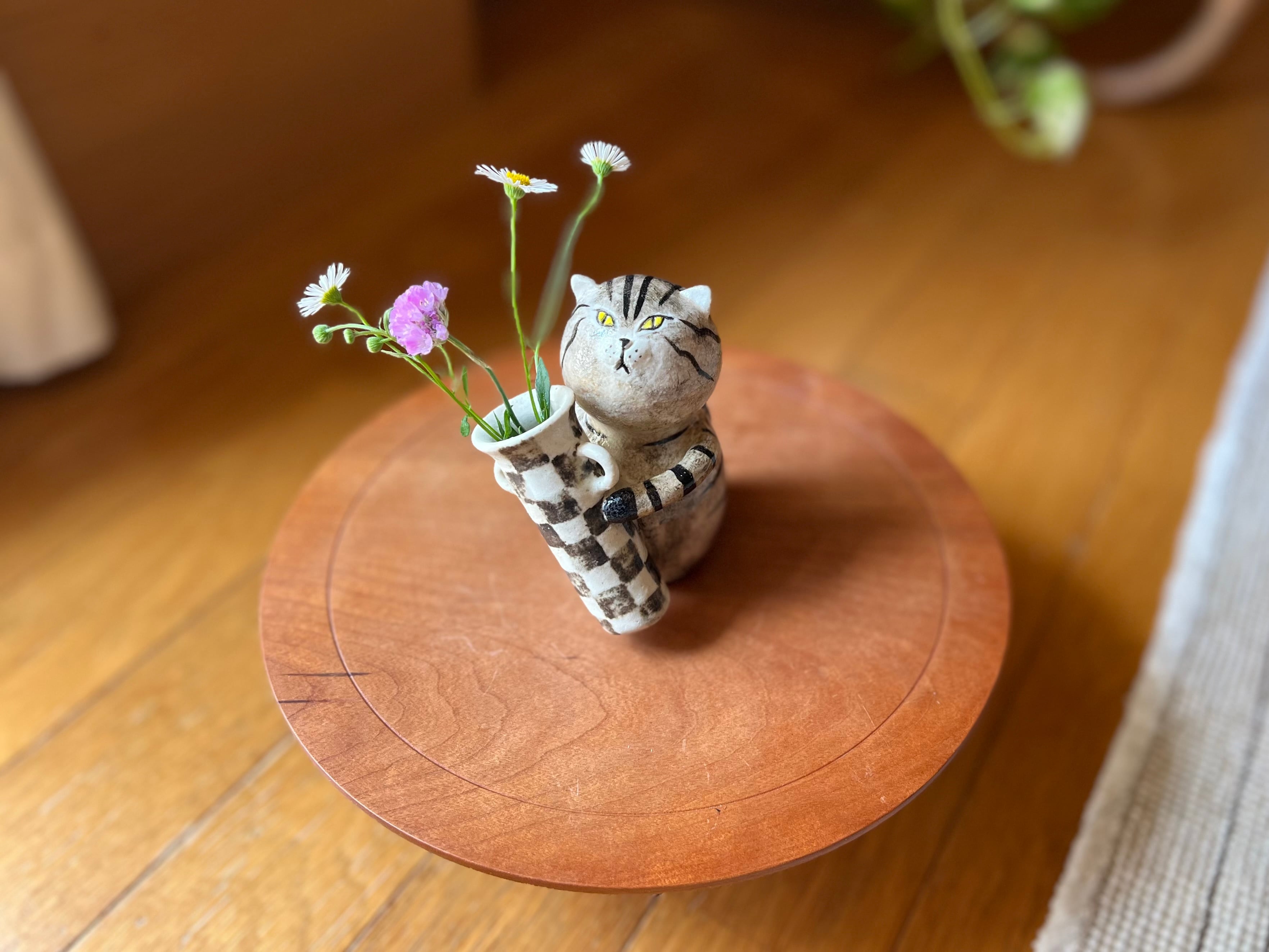 とら猫さんが花瓶を持った一輪挿しです。猫好きの方や花を飾るのが好きな方にぴったりのアイテムです。