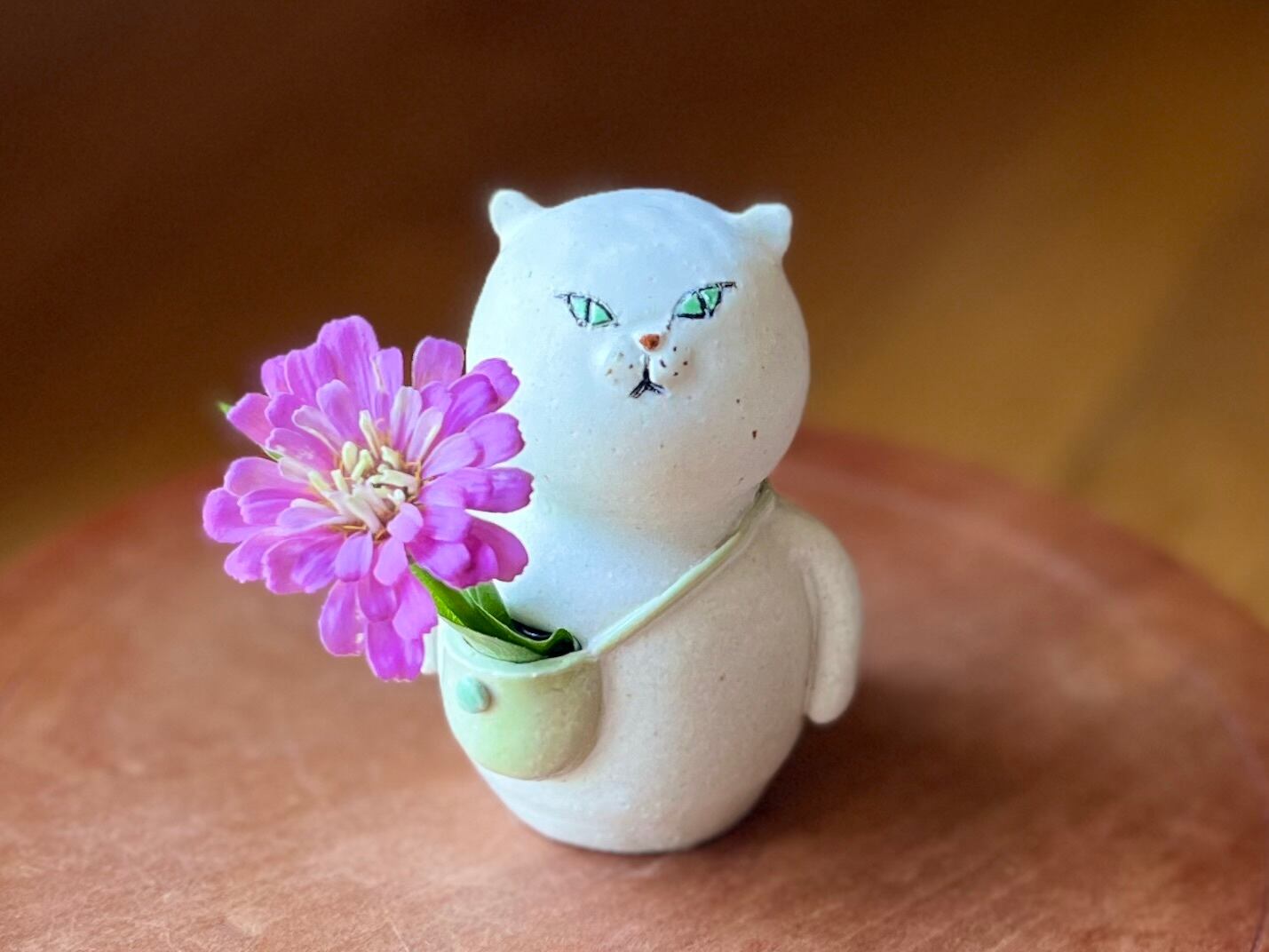 猫さん花瓶は、手作りの陶器製で、ひとつひとつ丁寧に作られています。そのため、それぞれの表情や模様が微妙に異なるのも魅力の一つです。