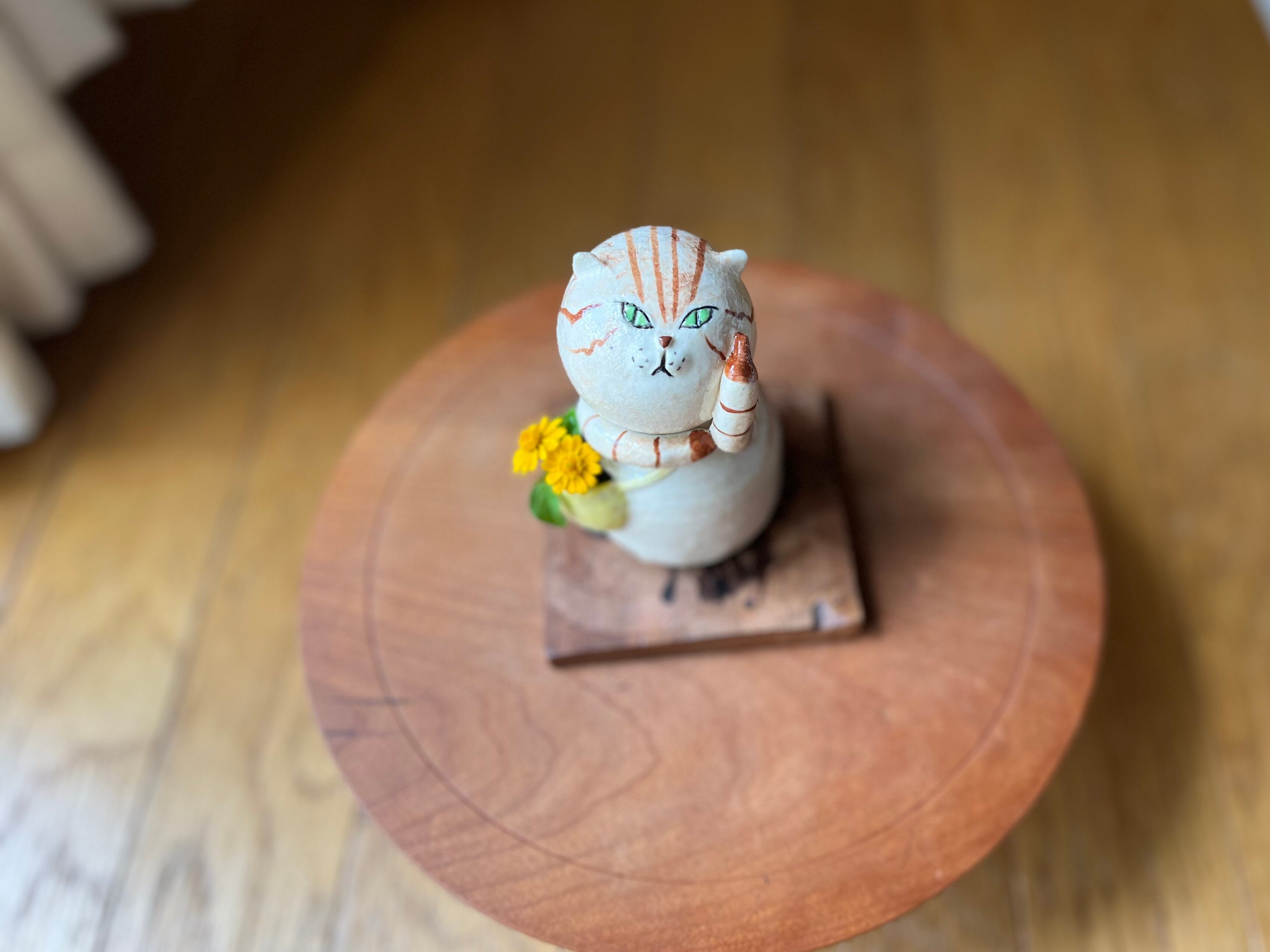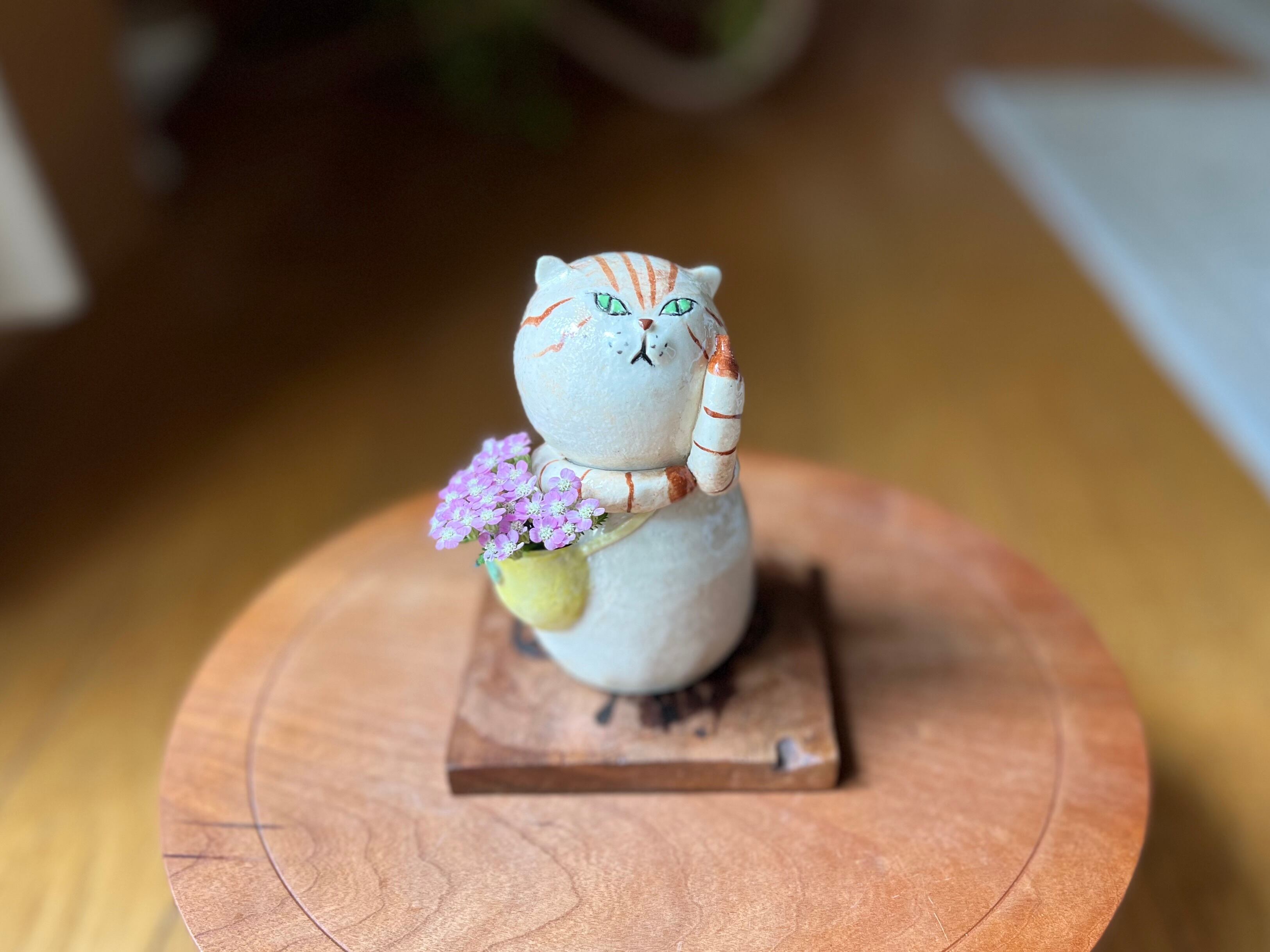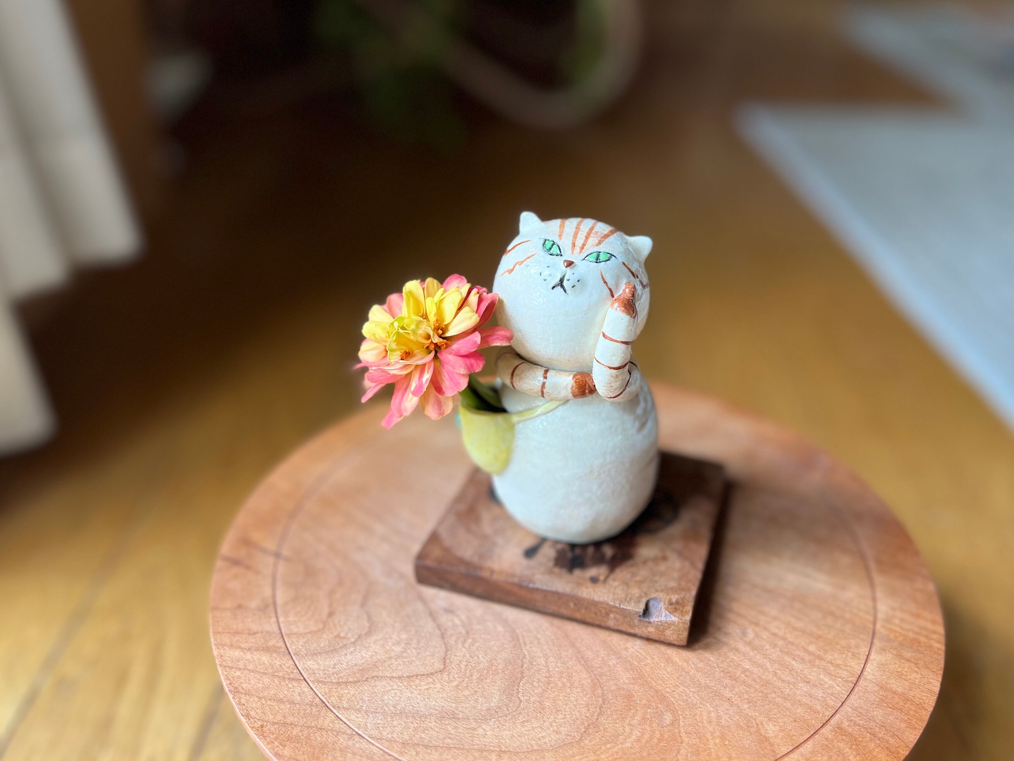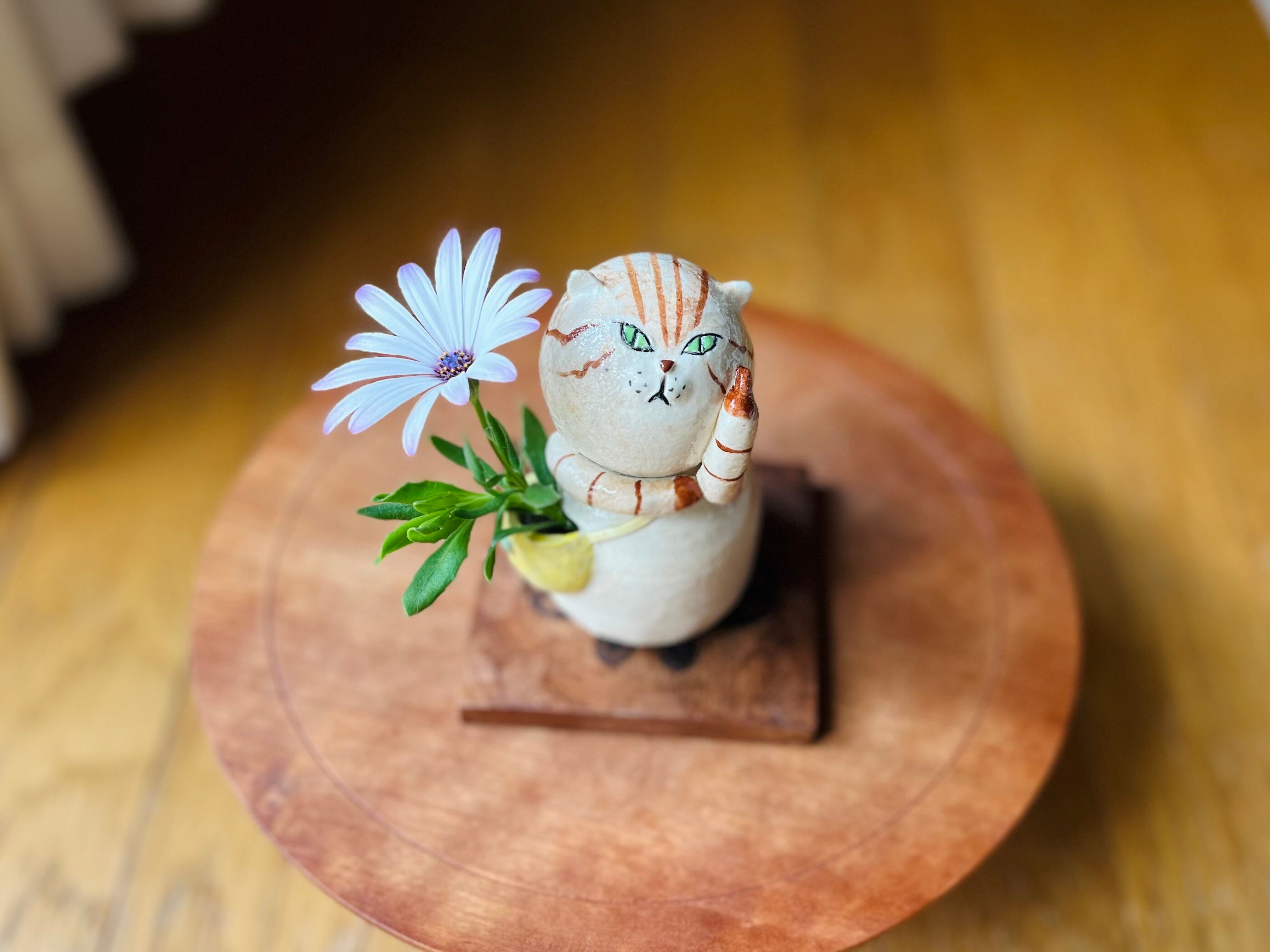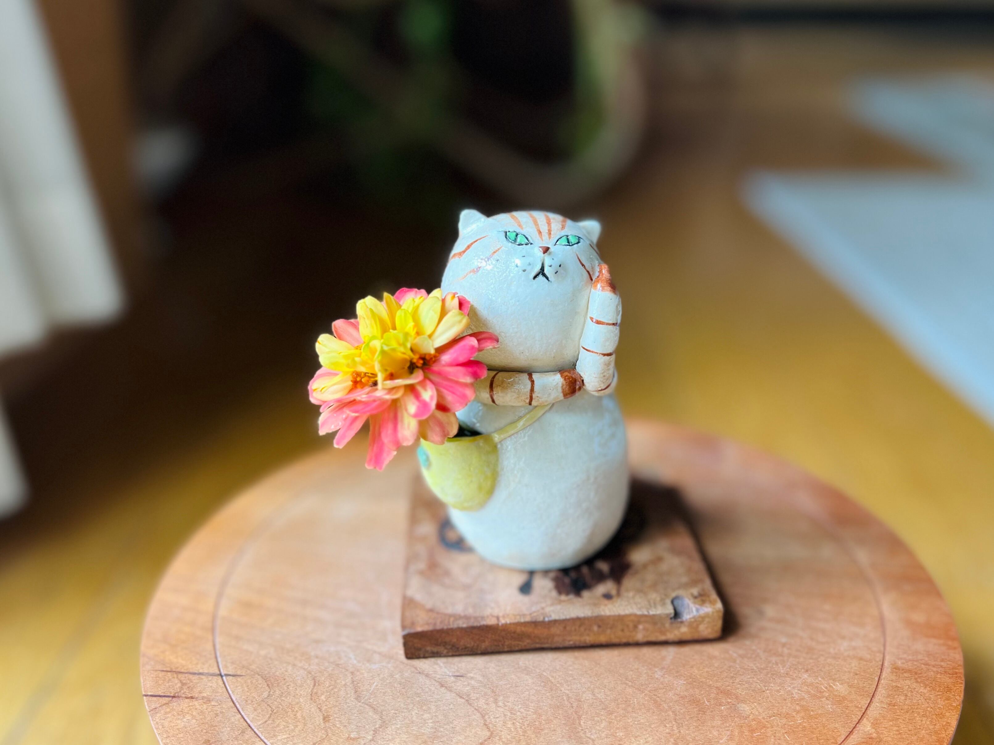 茶トラさんがポシェットをさげた一輪挿しです。猫好きの方や花を飾るのが好きな方にぴったりのアイテムです。