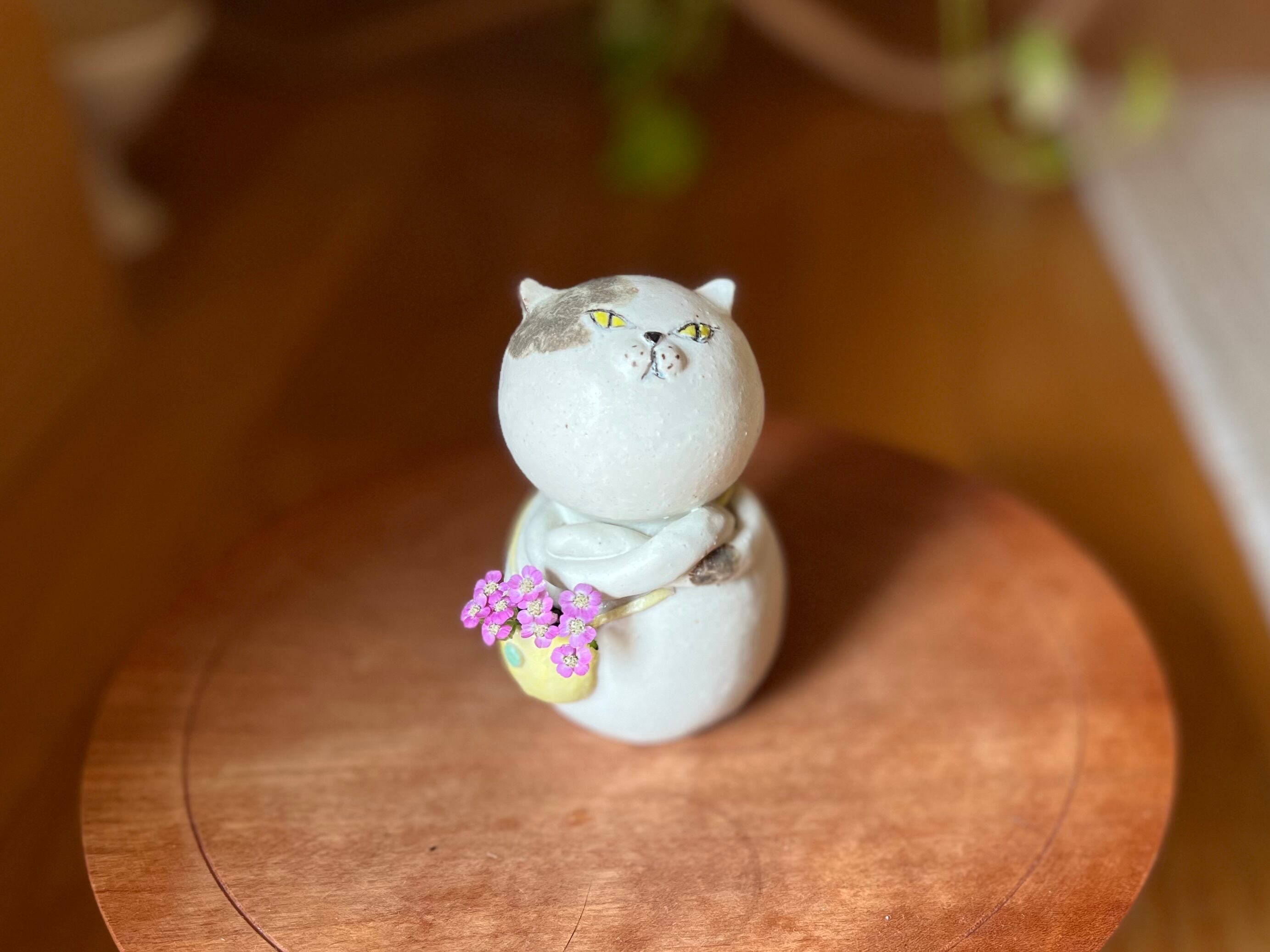 猫さん花瓶は、手作りの陶器製で、ひとつひとつ丁寧に作られています。そのため、それぞれの表情や模様が微妙に異なるのも魅力の一つです。