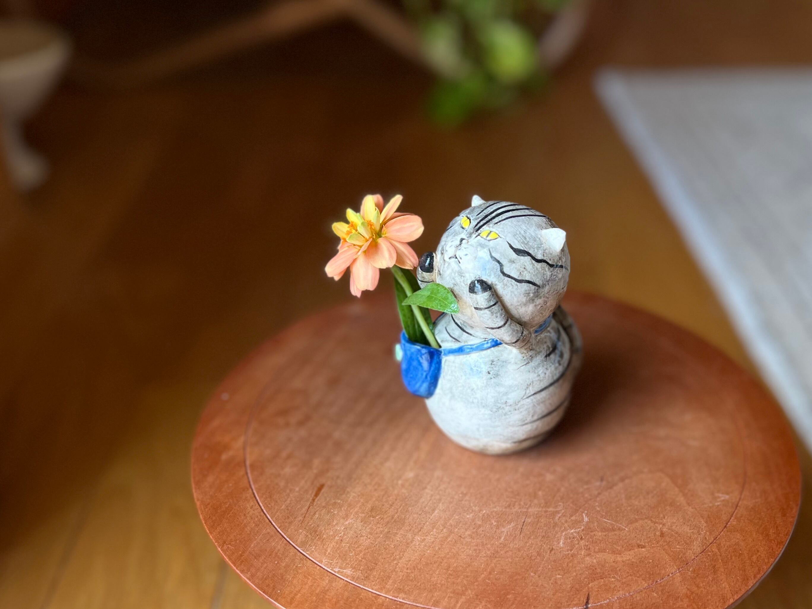 とら猫さんがポシェットをさげた一輪挿しです。猫好きの方や花を飾るのが好きな方にぴったりのアイテムです。