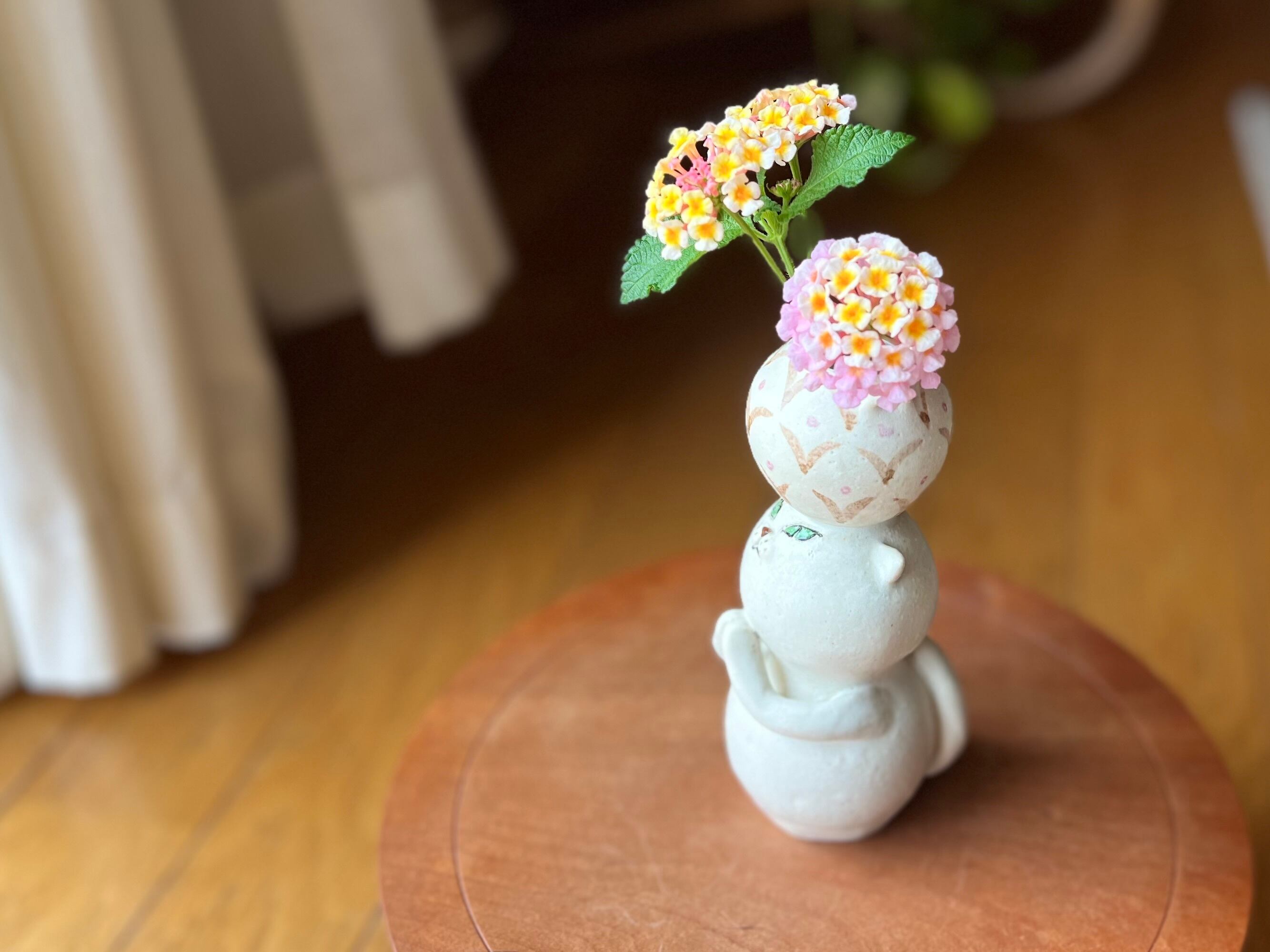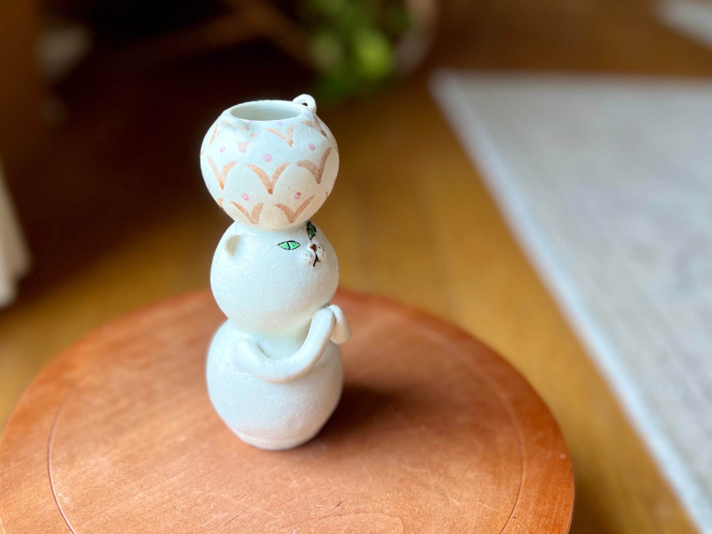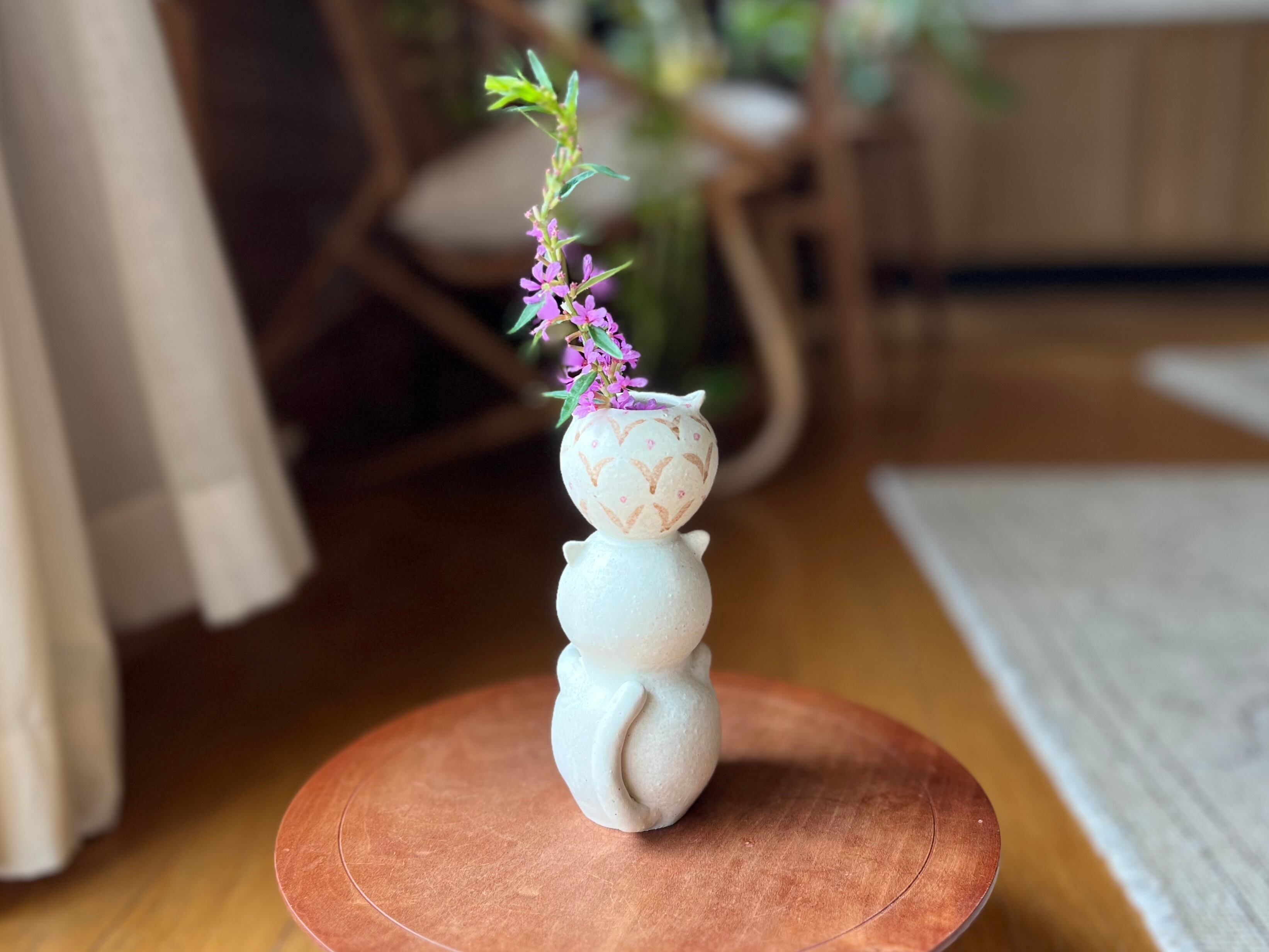 白猫さんが頭に壺を乗せた一輪挿しです。猫好きの方や花を飾るのが好きな方にぴったりのアイテムです。
