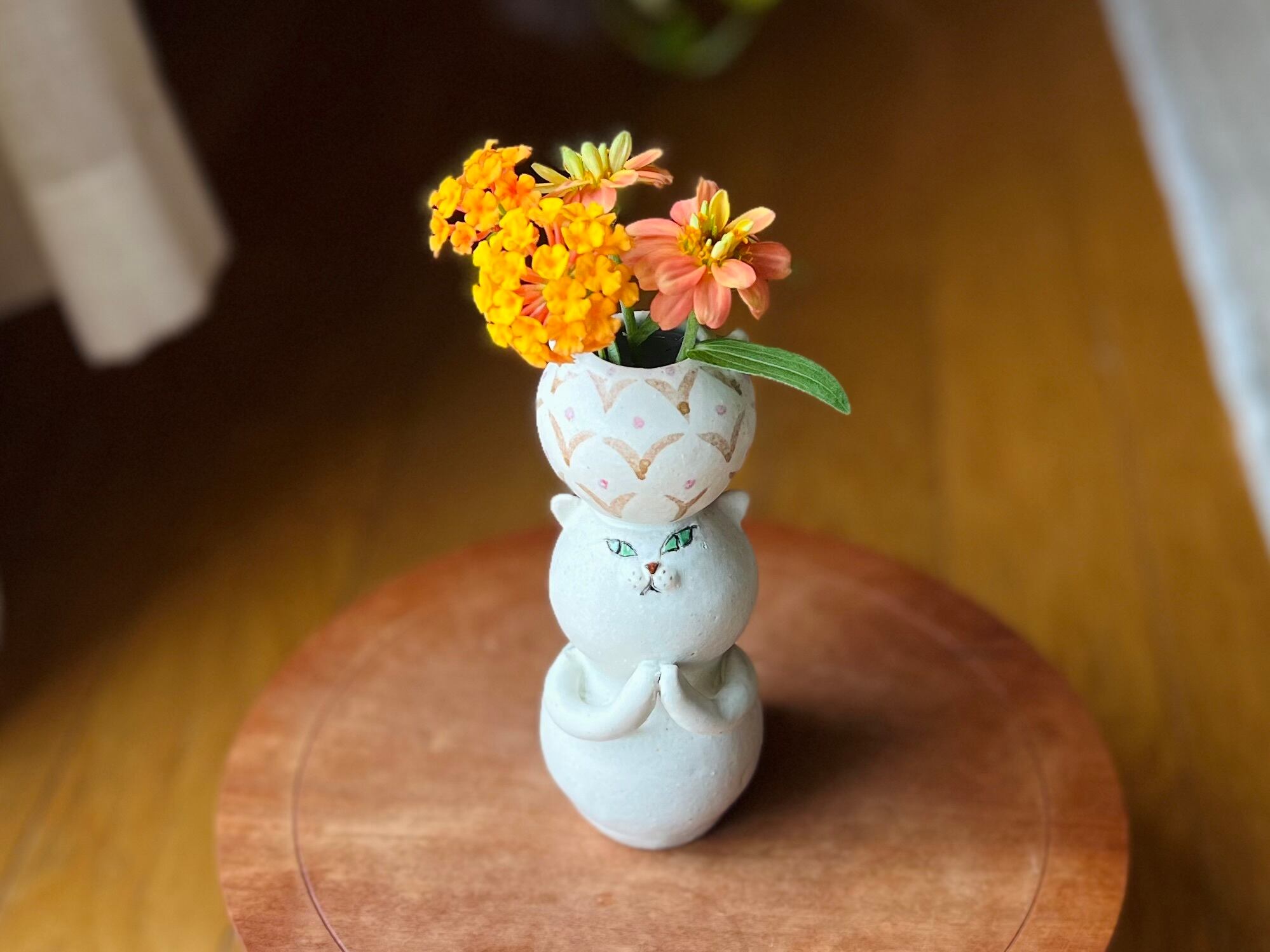 猫さん花瓶は、手作りの陶器製で、ひとつひとつ丁寧に作られています。そのため、それぞれの表情や模様が微妙に異なるのも魅力の一つです。