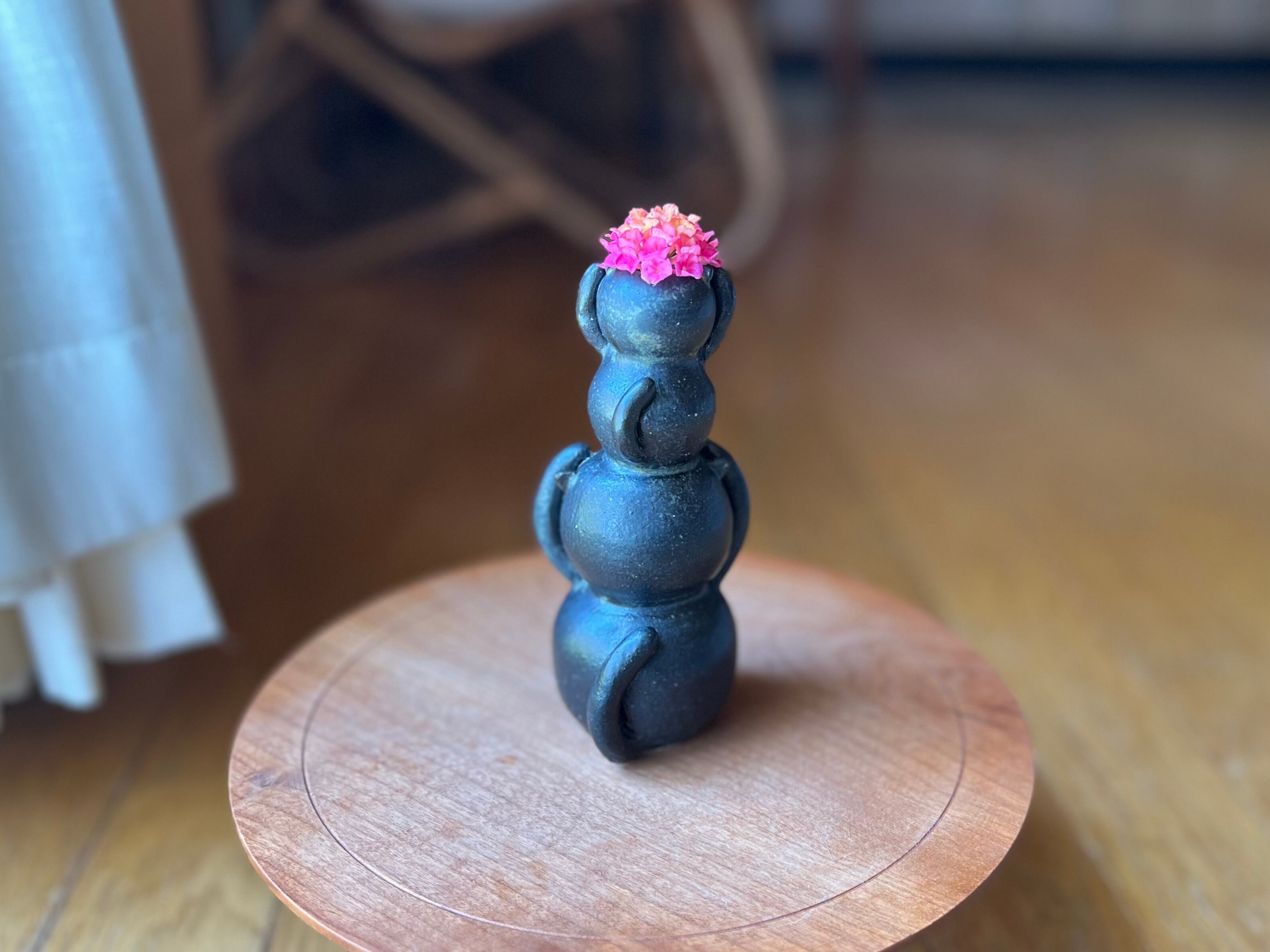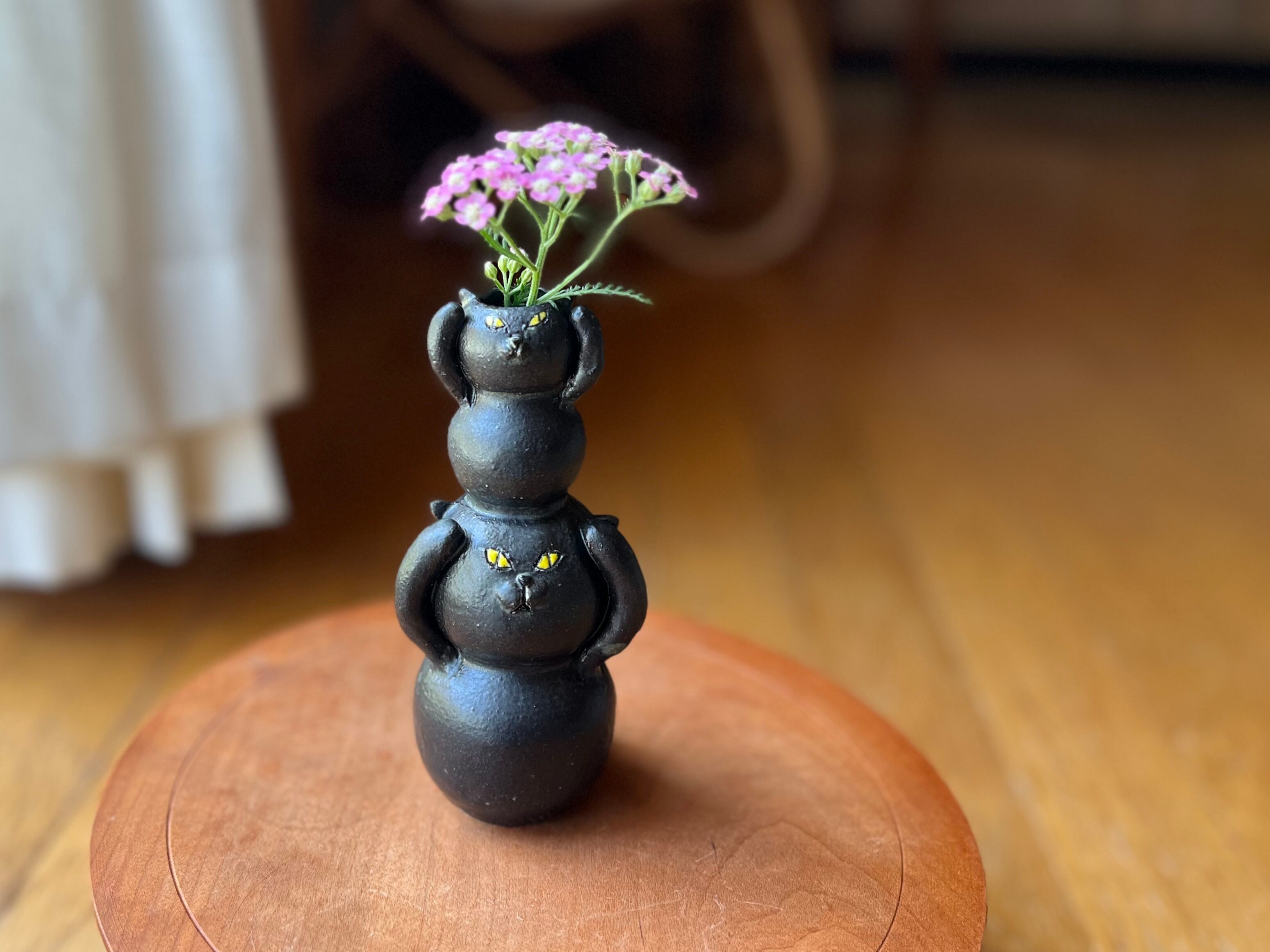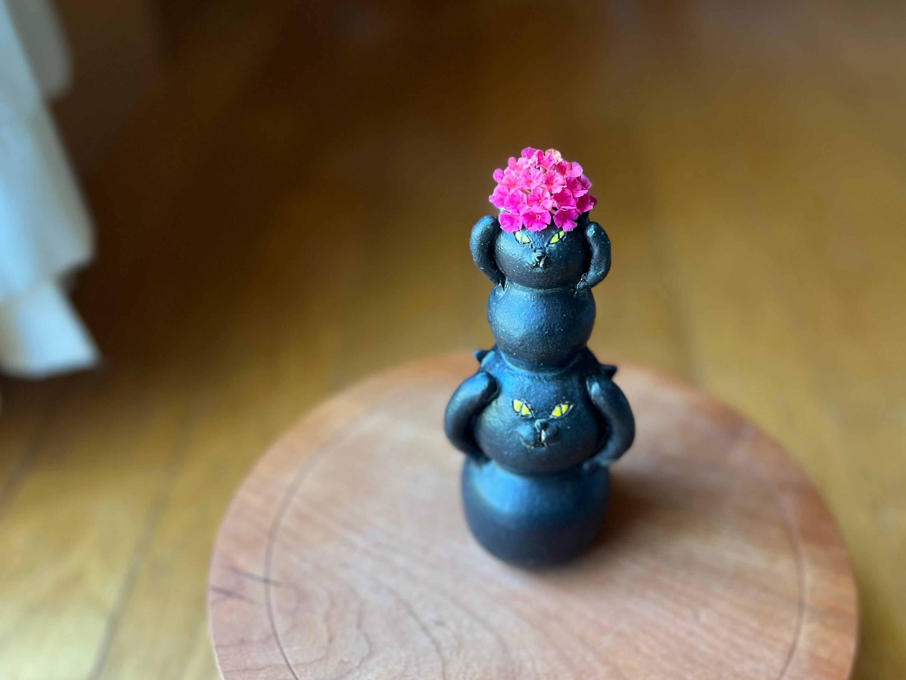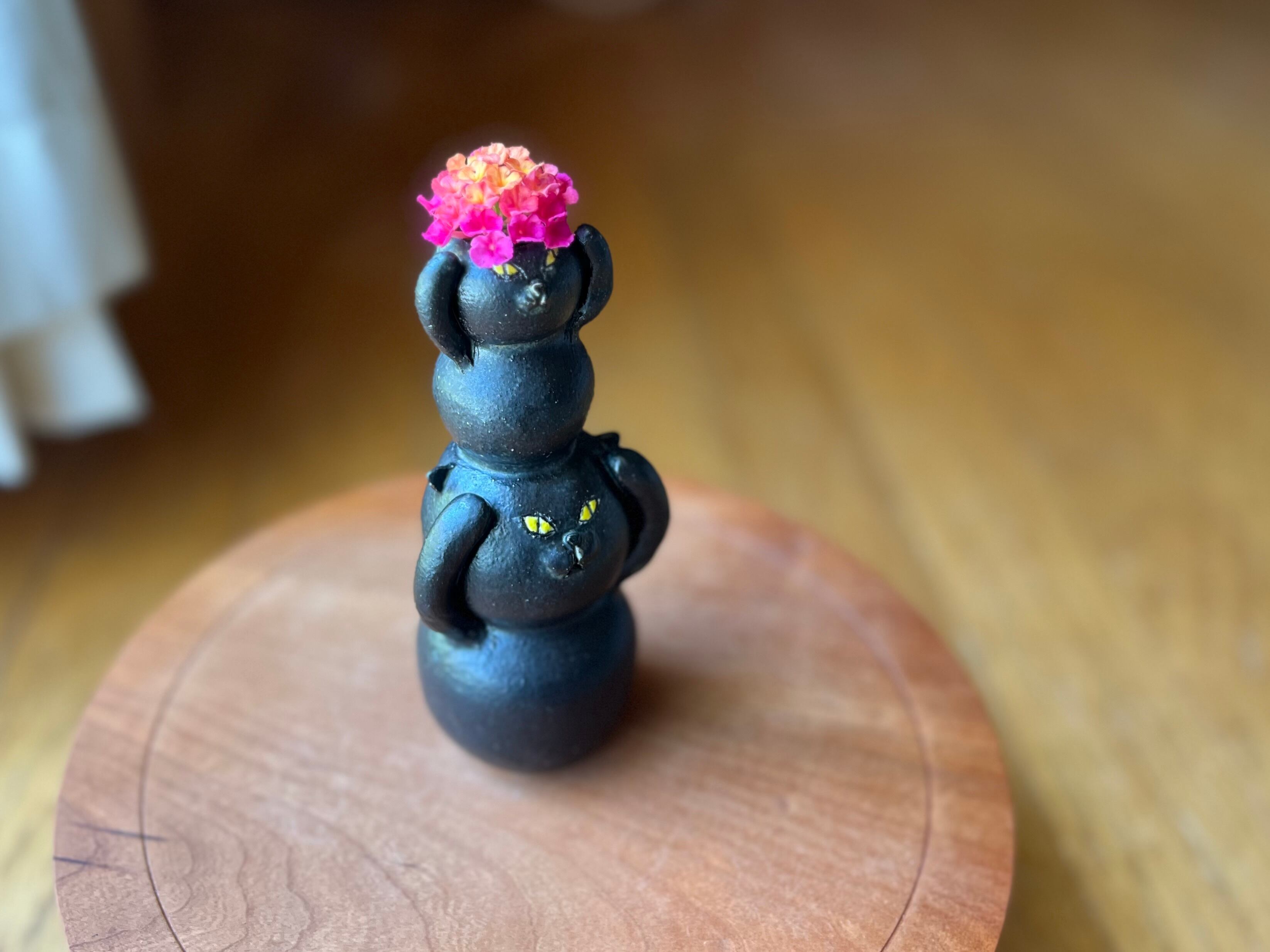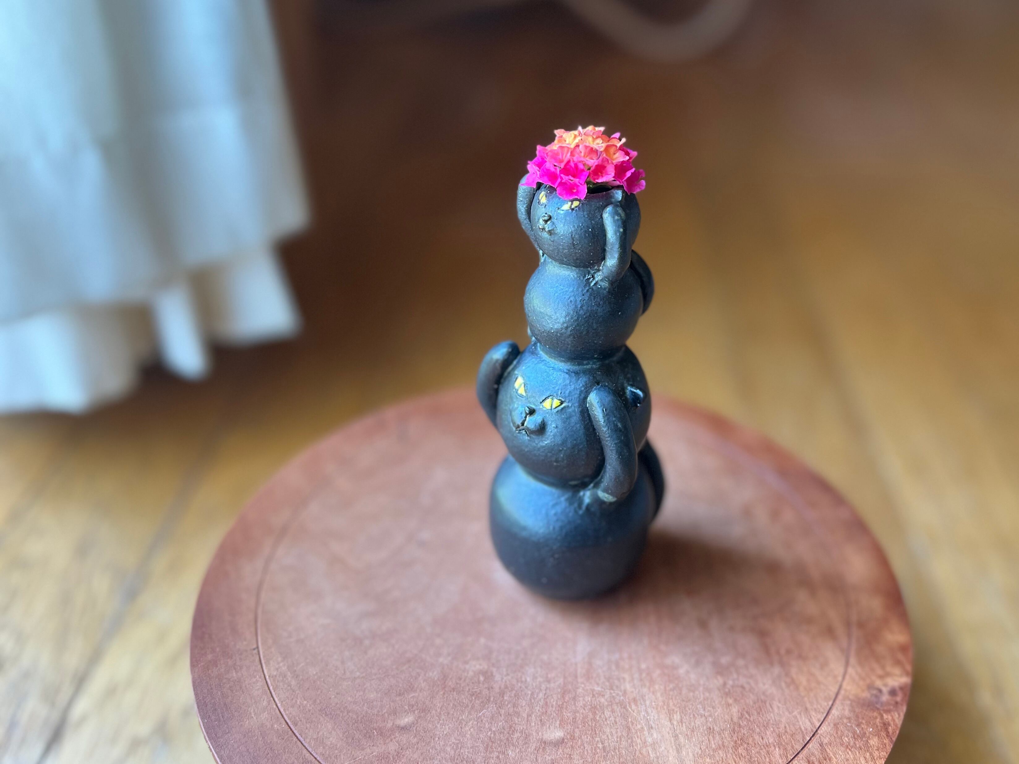 黒猫さんが小さい猫さんを頭に乗せた一輪挿しです。猫好きの方や花を飾るのが好きな方にぴったりのアイテムです。