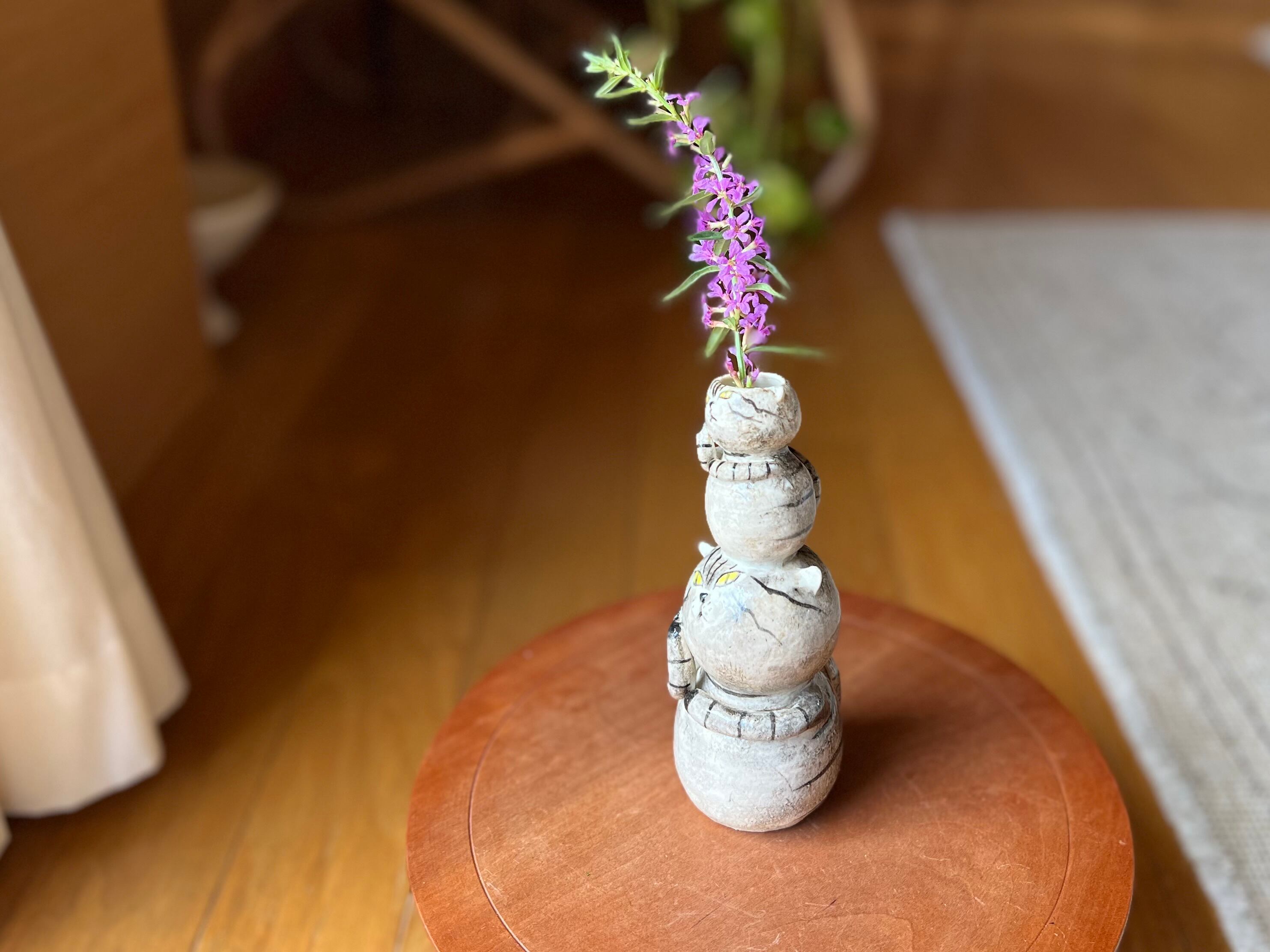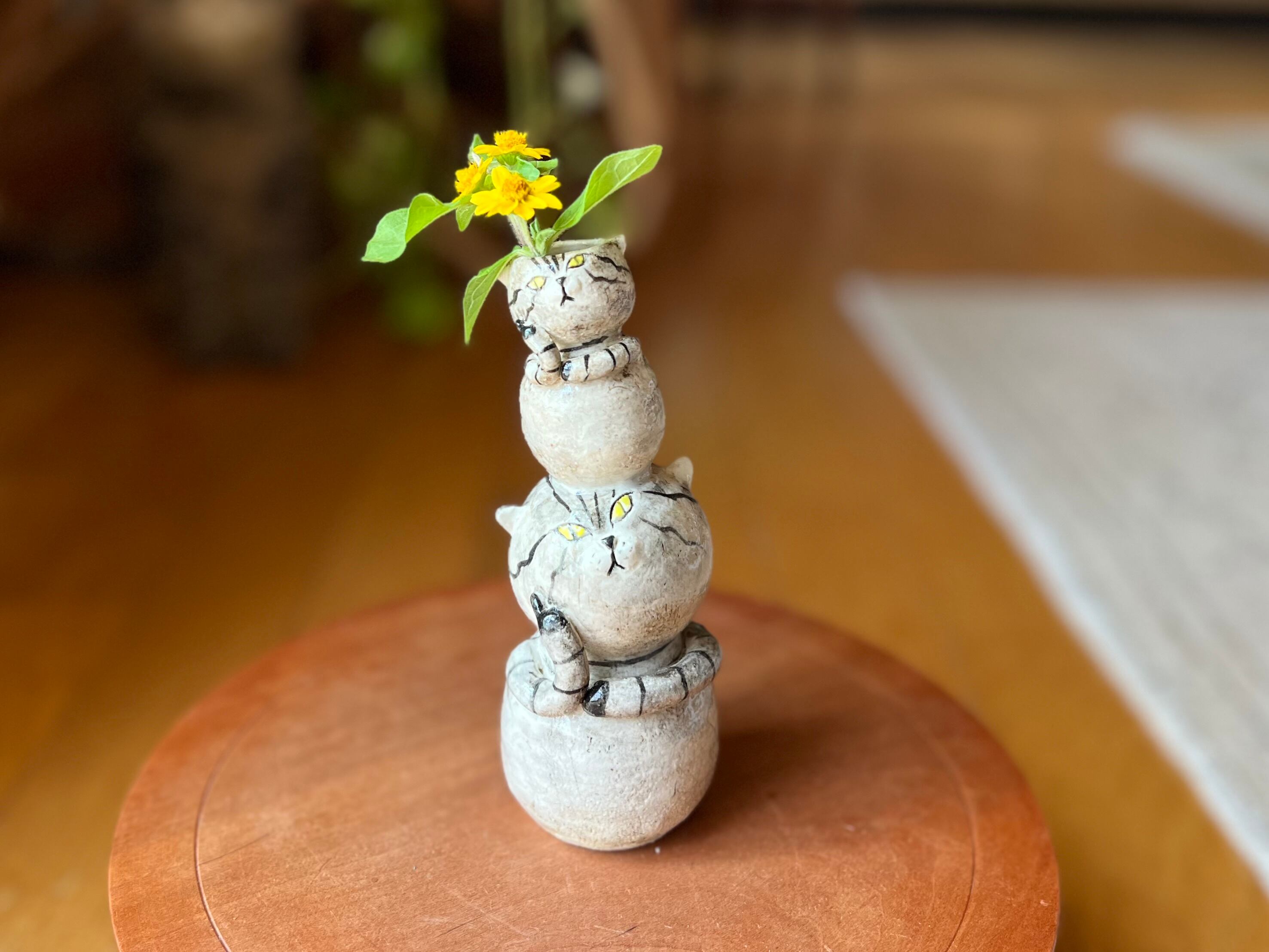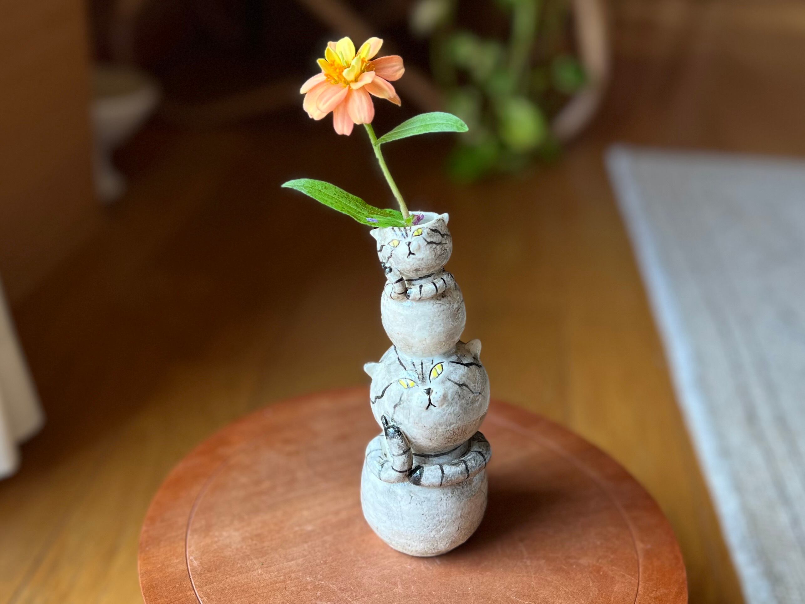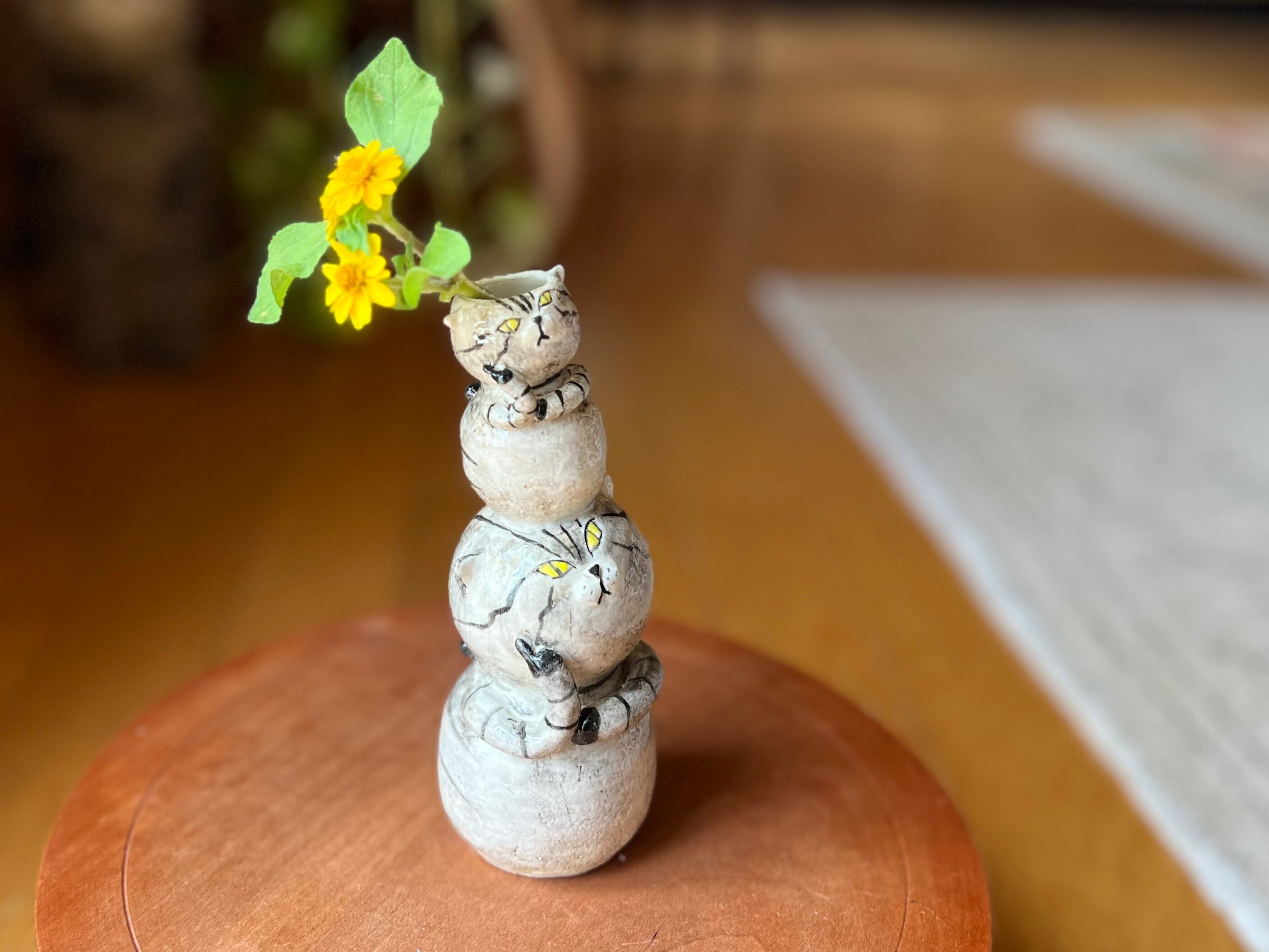 とら猫さんが小さい猫さんを頭に乗せた一輪挿しです。猫好きの方や花を飾るのが好きな方にぴったりのアイテムです。