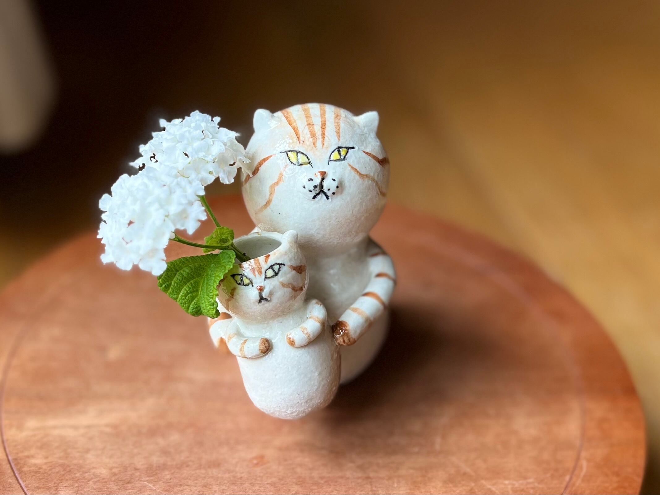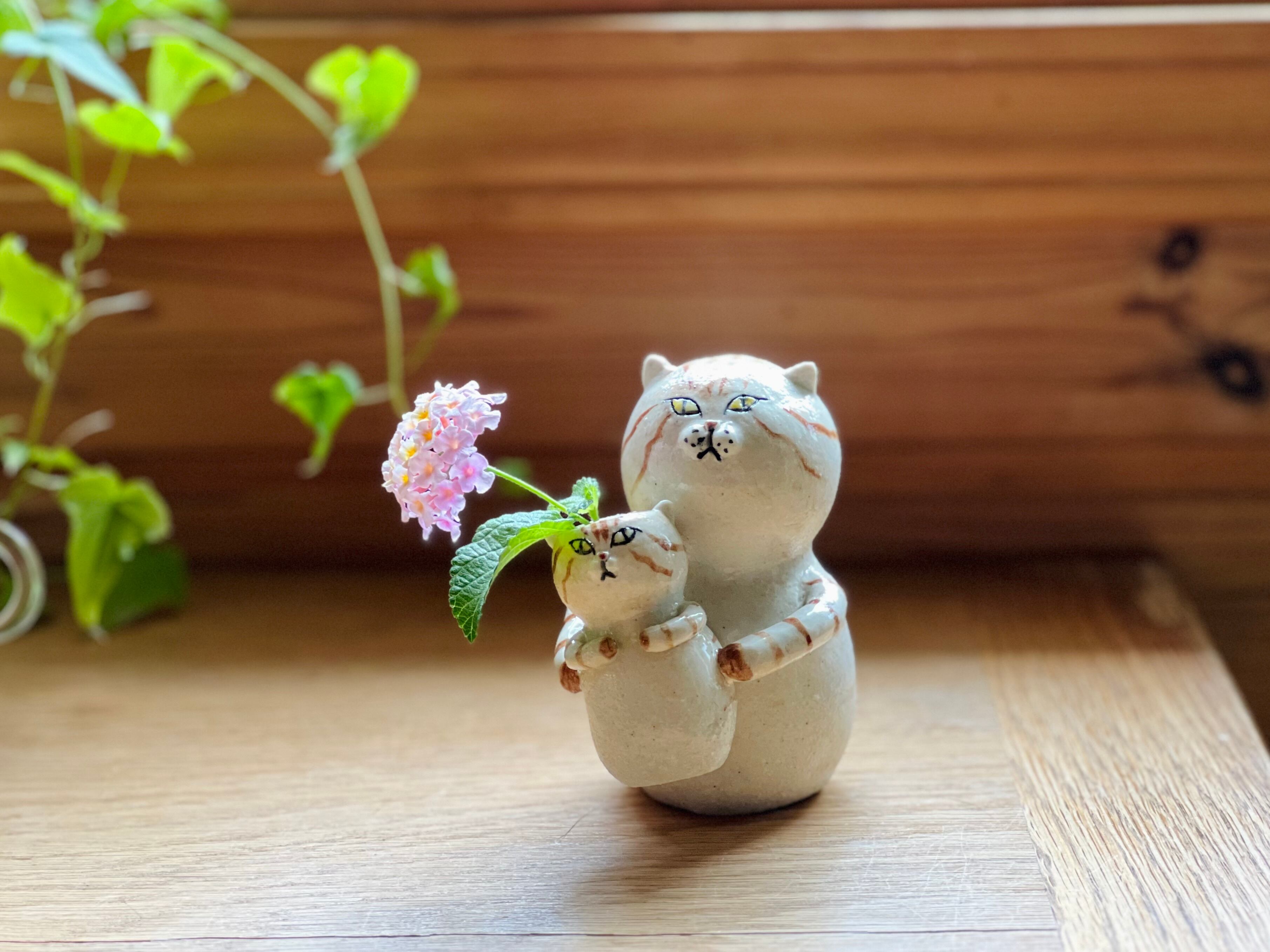 茶トラさんが小さい猫さんを抱っこした一輪挿しです。猫好きの方や花を飾るのが好きな方にぴったりのアイテムです。