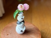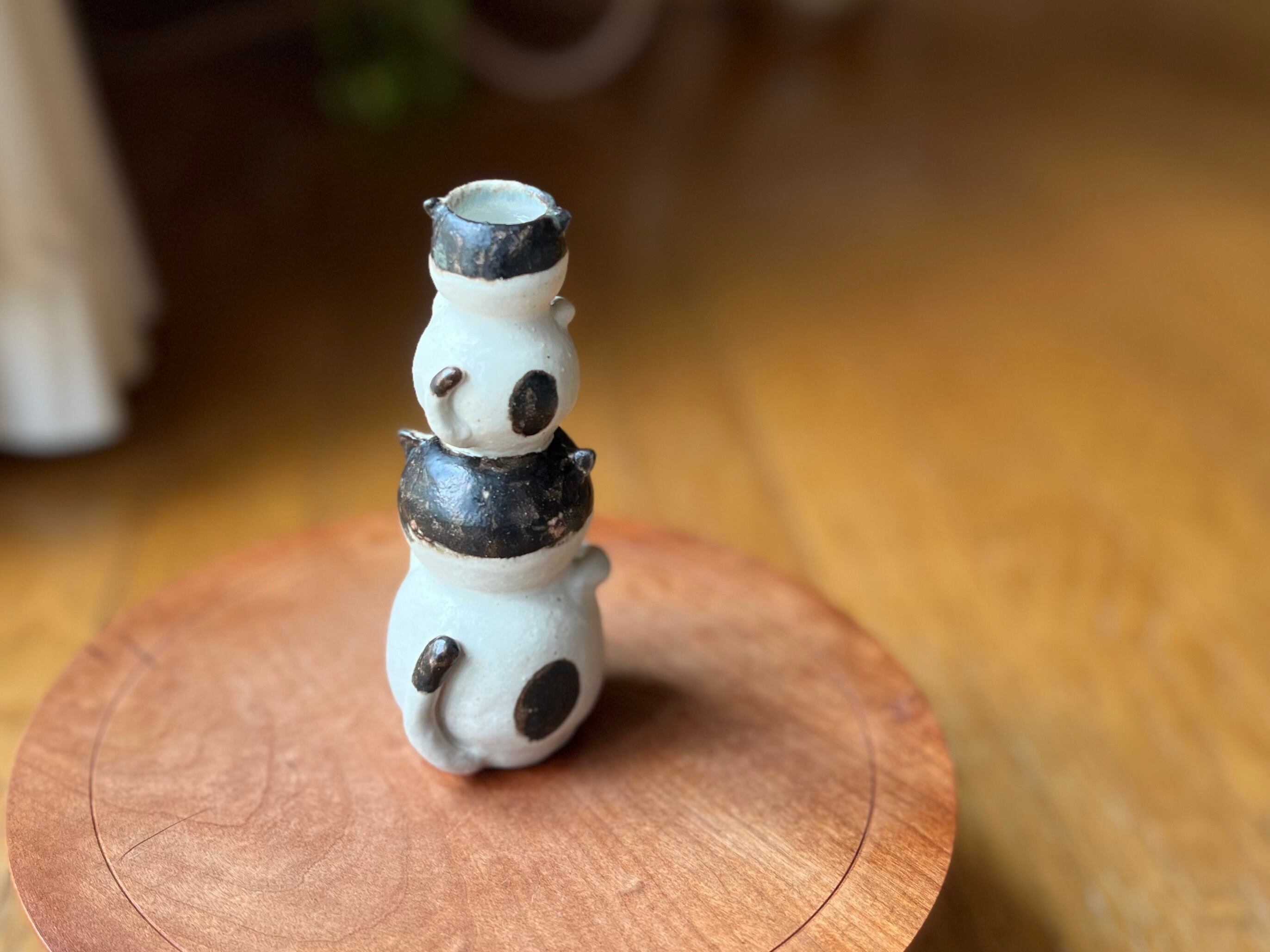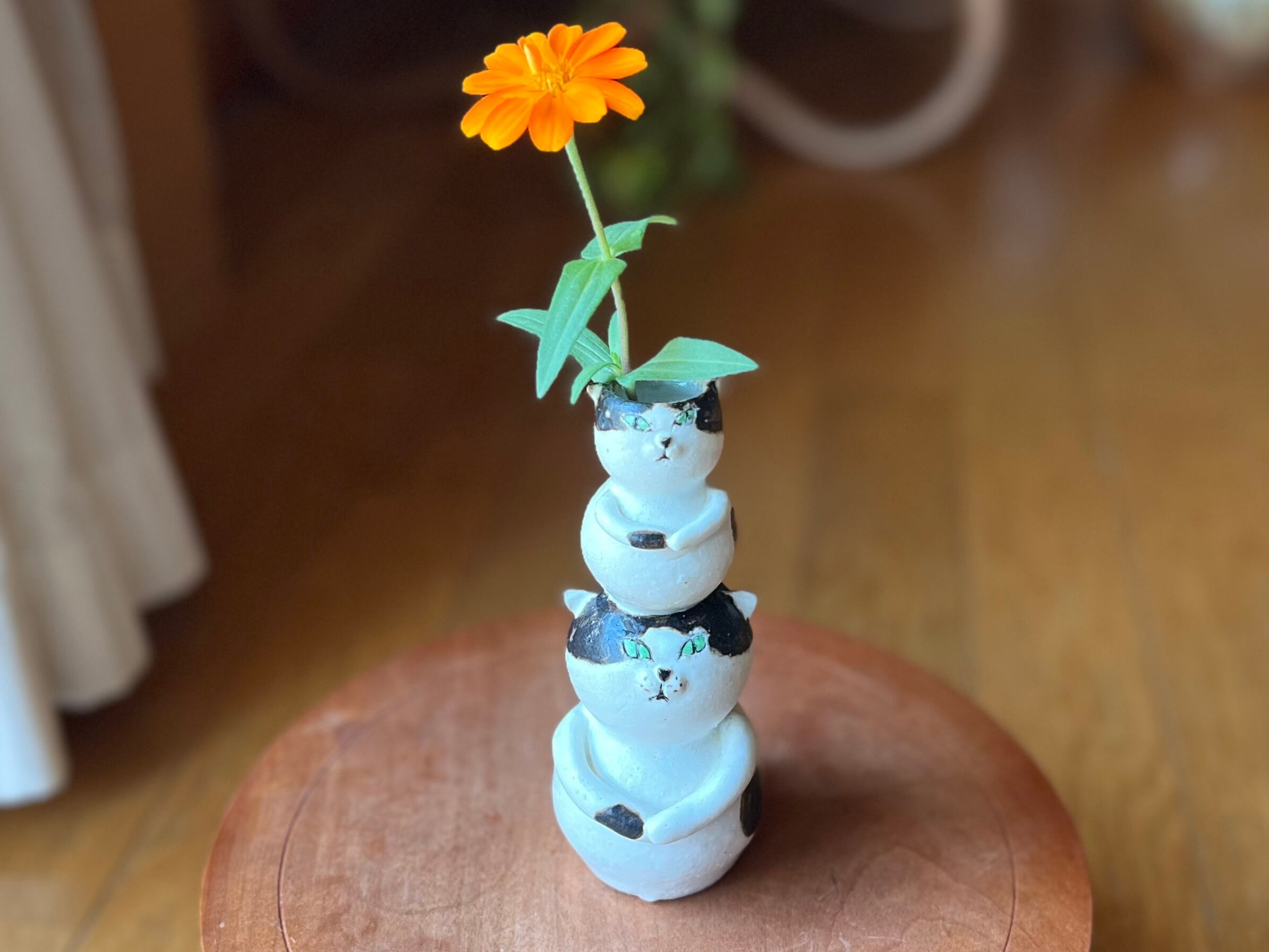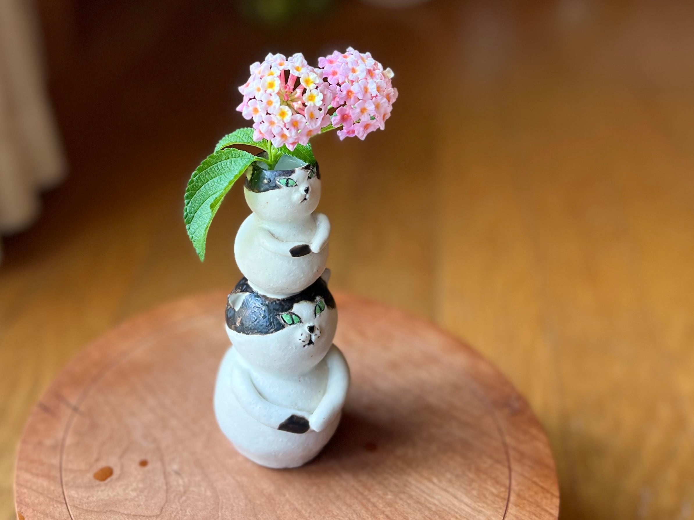 ハチワレさんが小さい猫さんを頭に乗せた一輪挿しです。猫好きの方や花を飾るのが好きな方にぴったりのアイテムです。