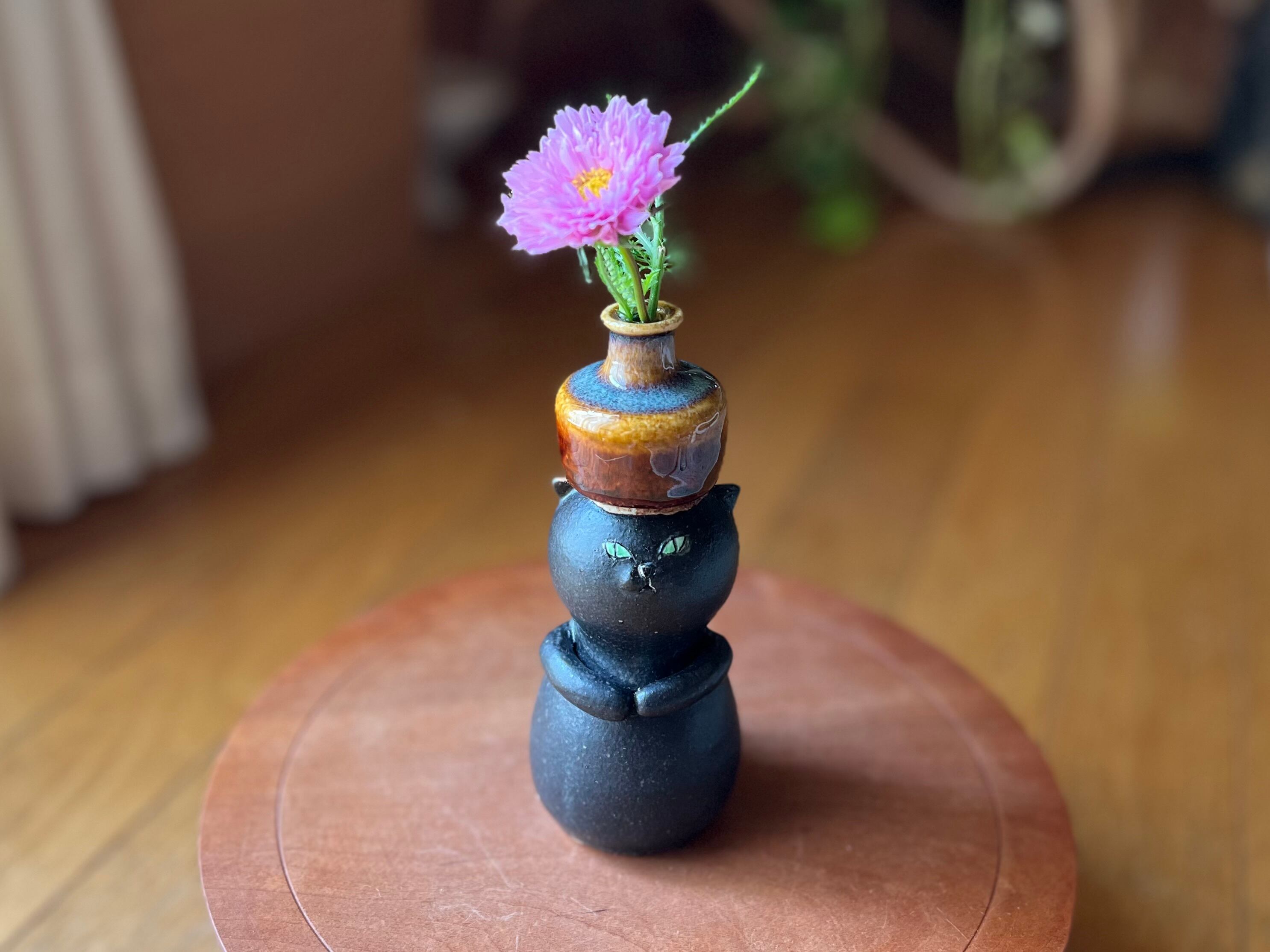 猫さん花瓶 頭の上に飴釉の花瓶を乗せた黒猫さん