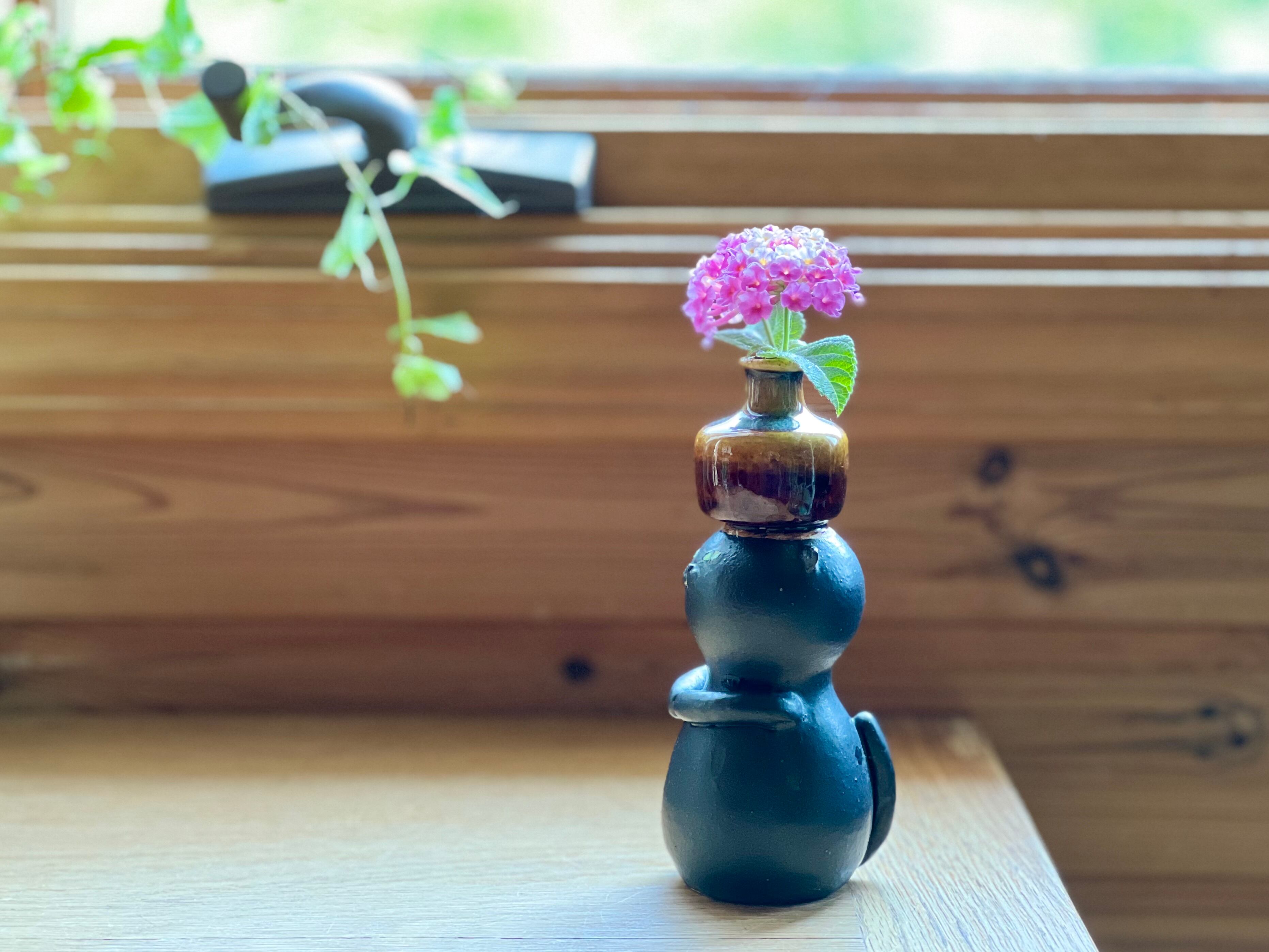 黒猫さんが頭に花瓶を乗せた一輪挿しです。猫好きの方や花を飾るのが好きな方にぴったりのアイテムです。