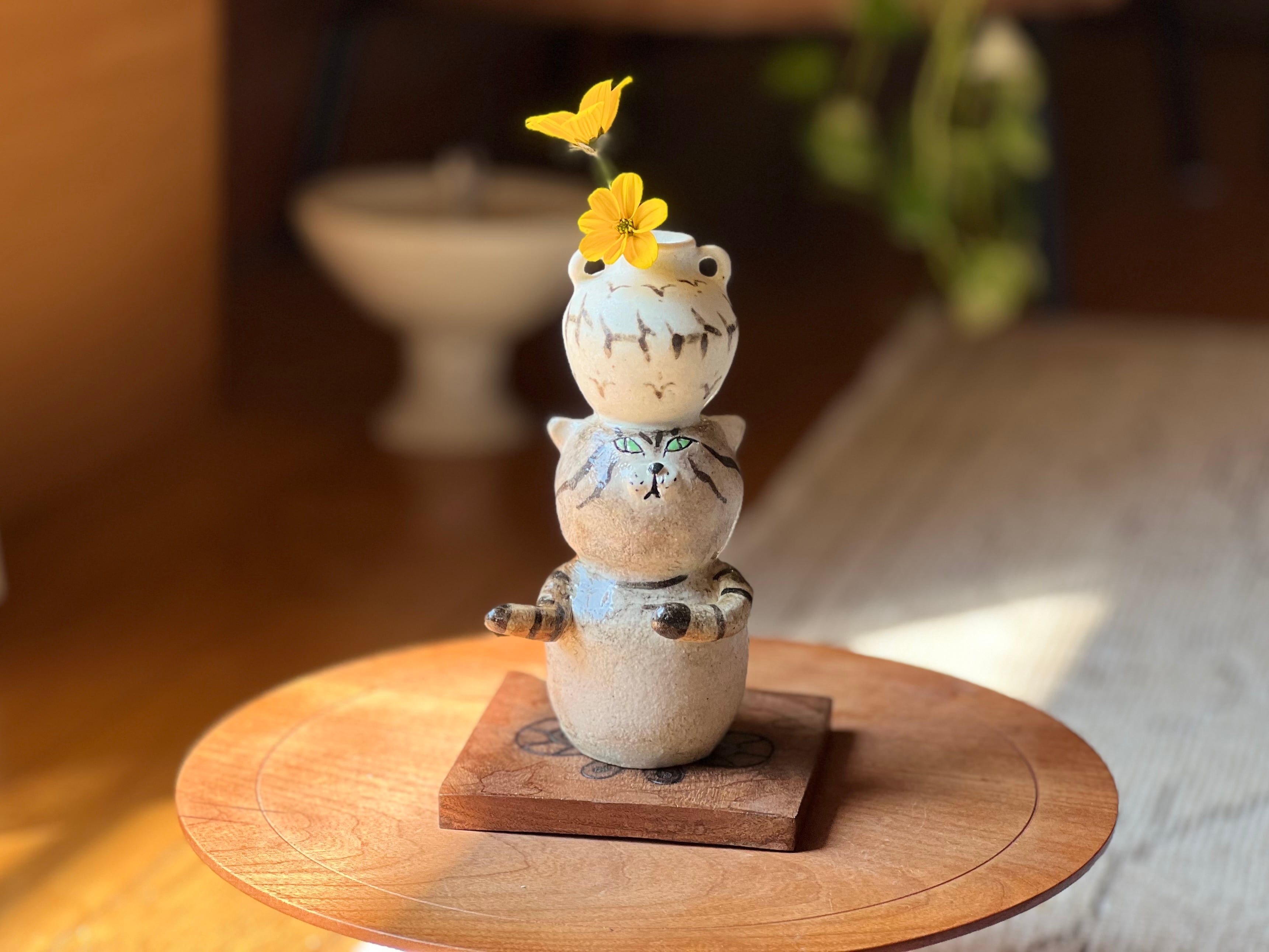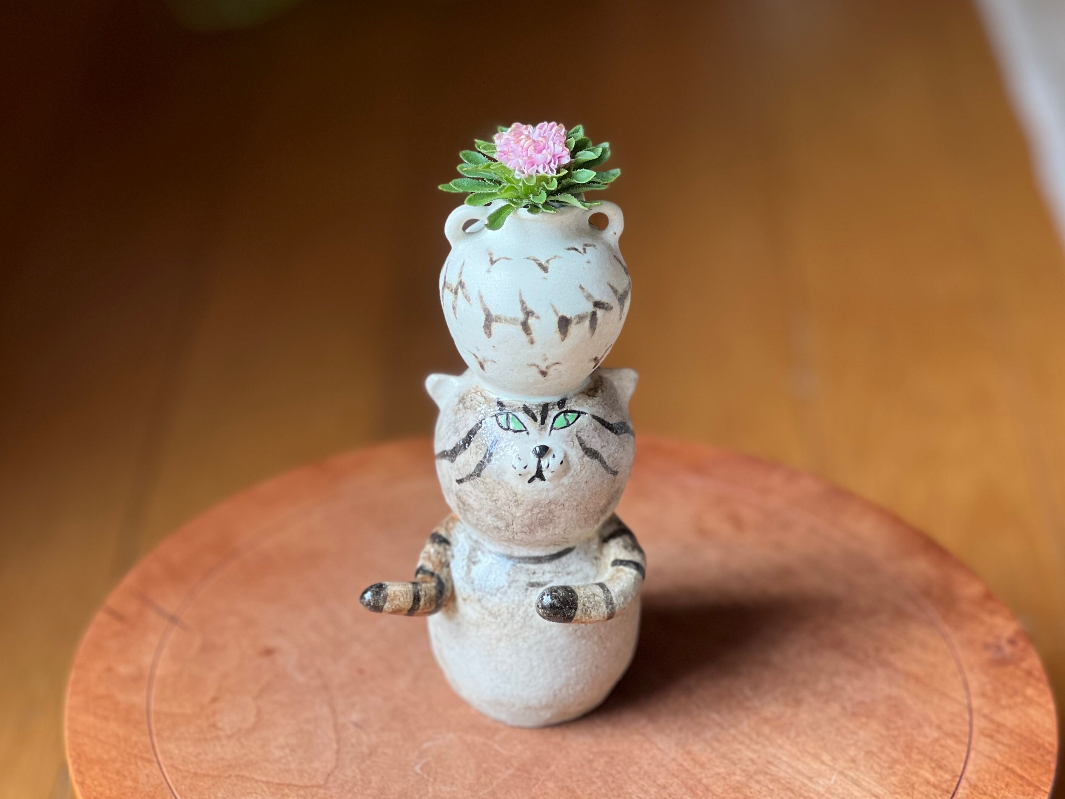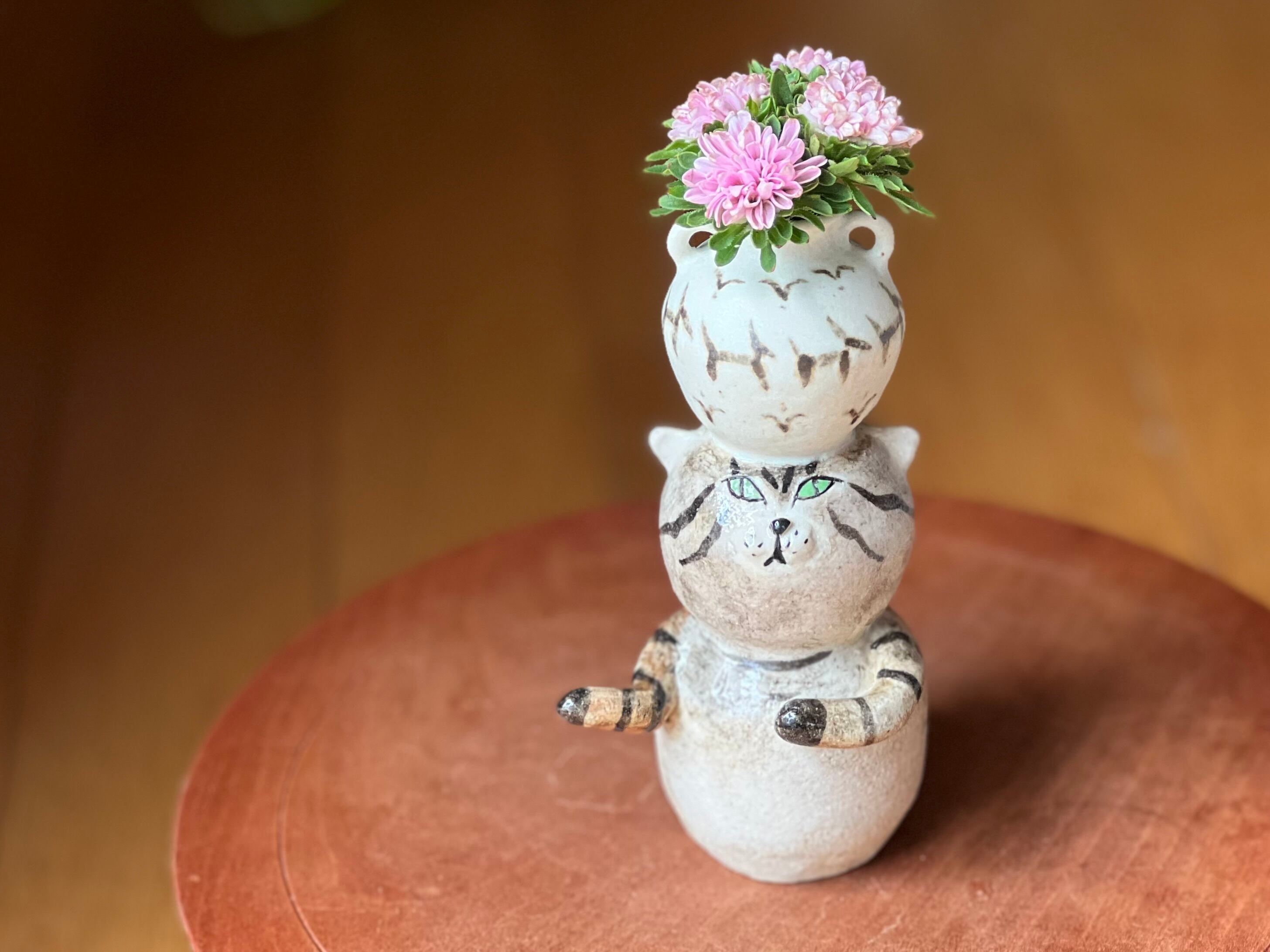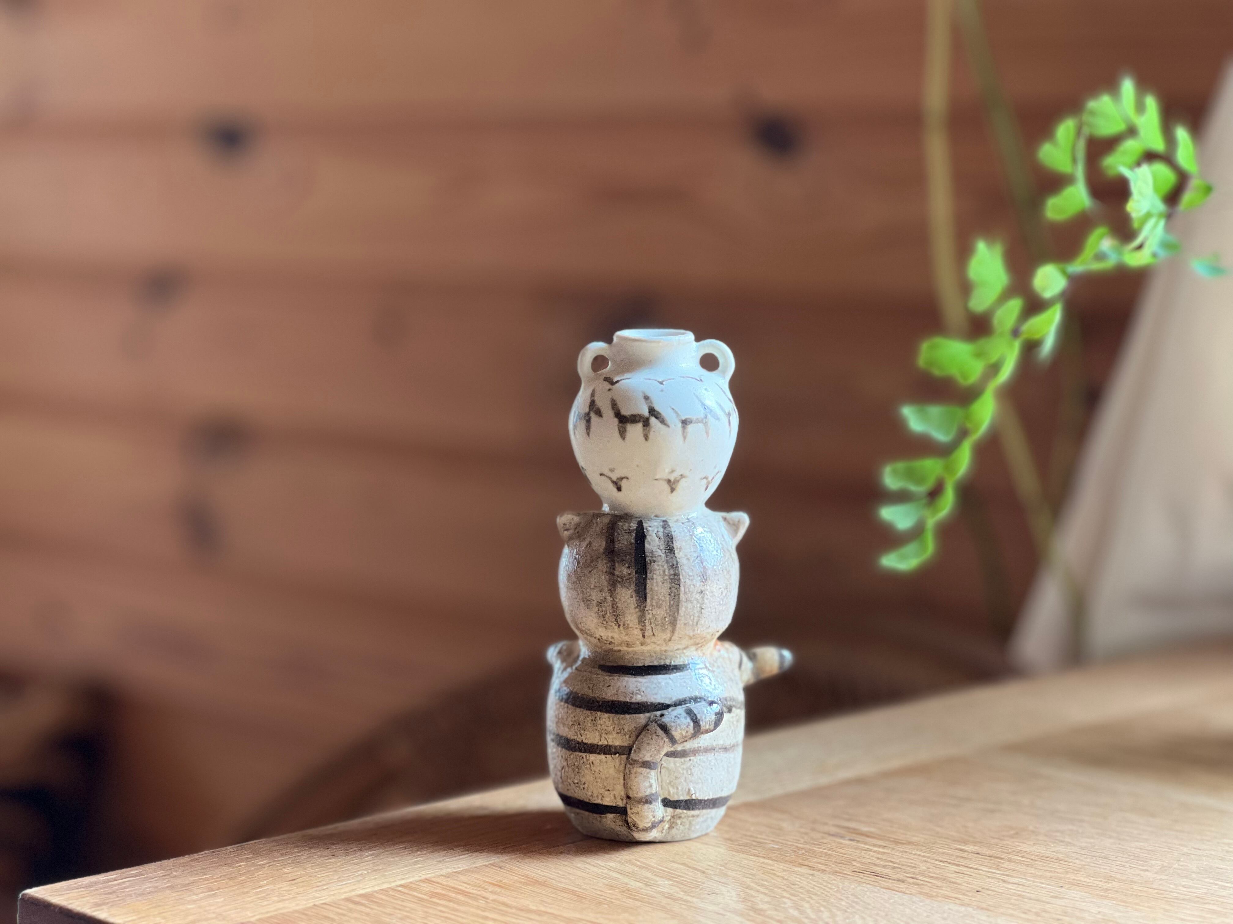 とら猫さんが壺を頭に乗せた一輪挿しです。猫好きの方や花を飾るのが好きな方にぴったりのアイテムです。