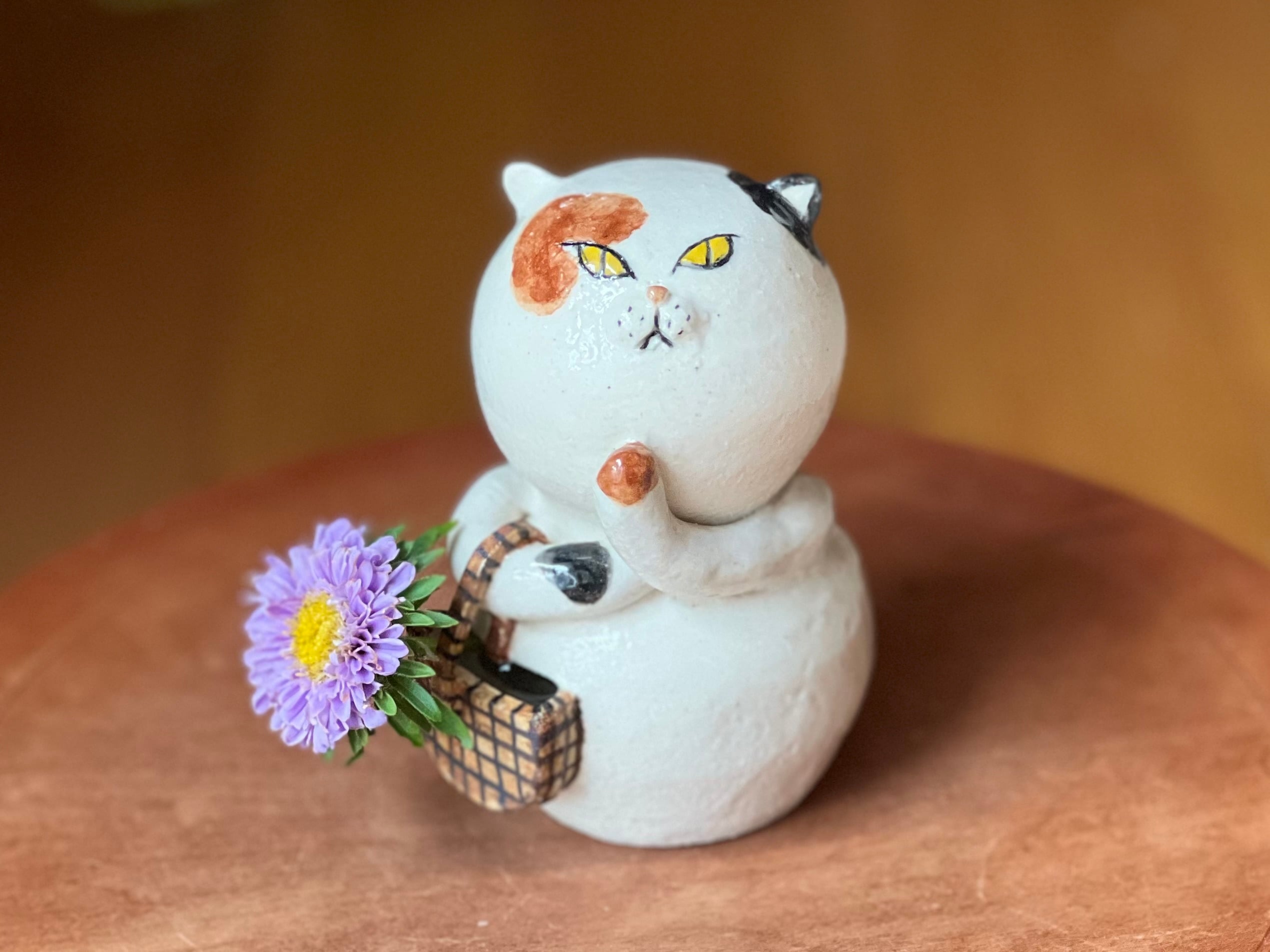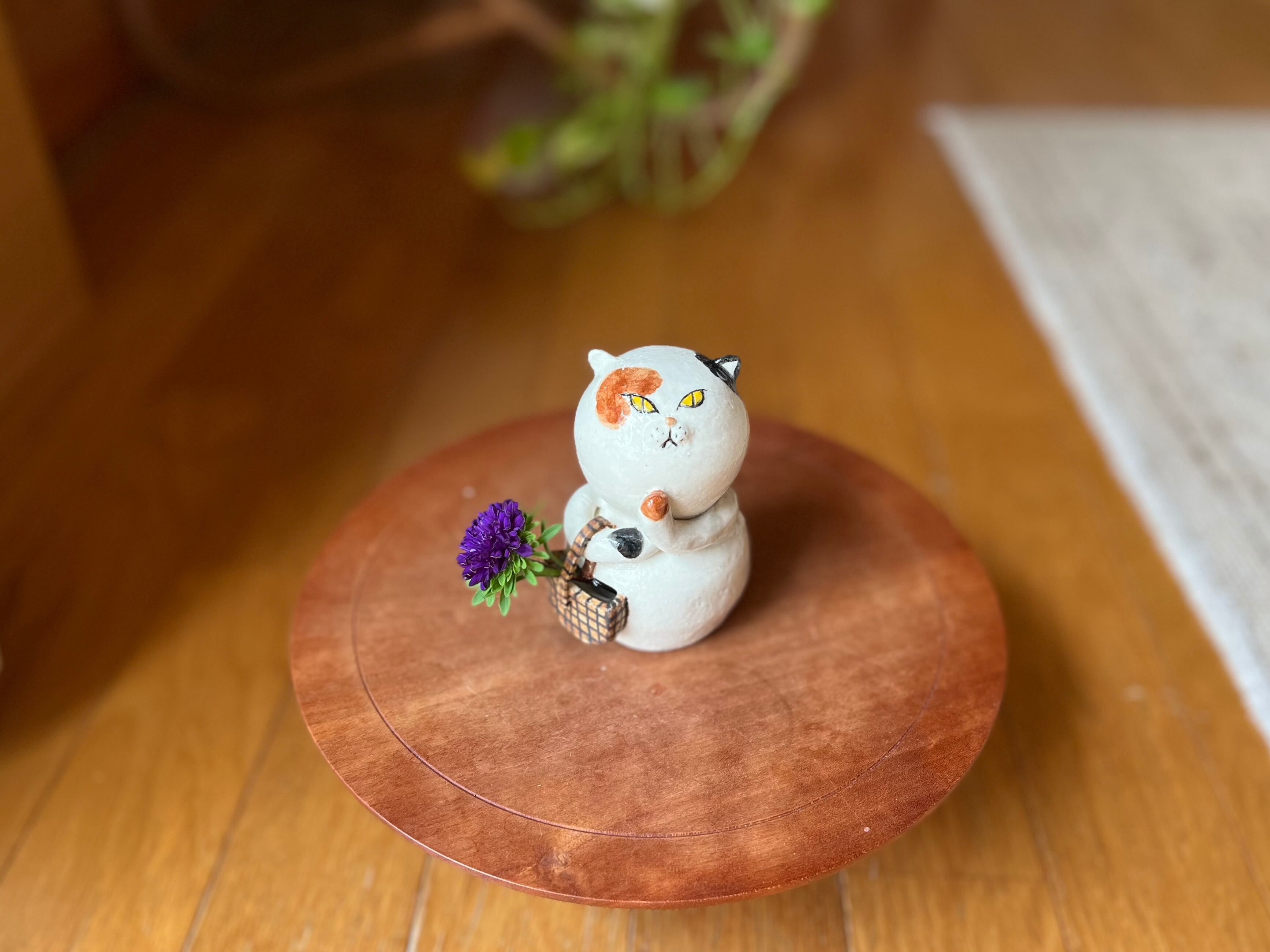 三毛猫さんが買い物かごを持った一輪挿しです。猫好きの方や花を飾るのが好きな方にぴったりのアイテムです。