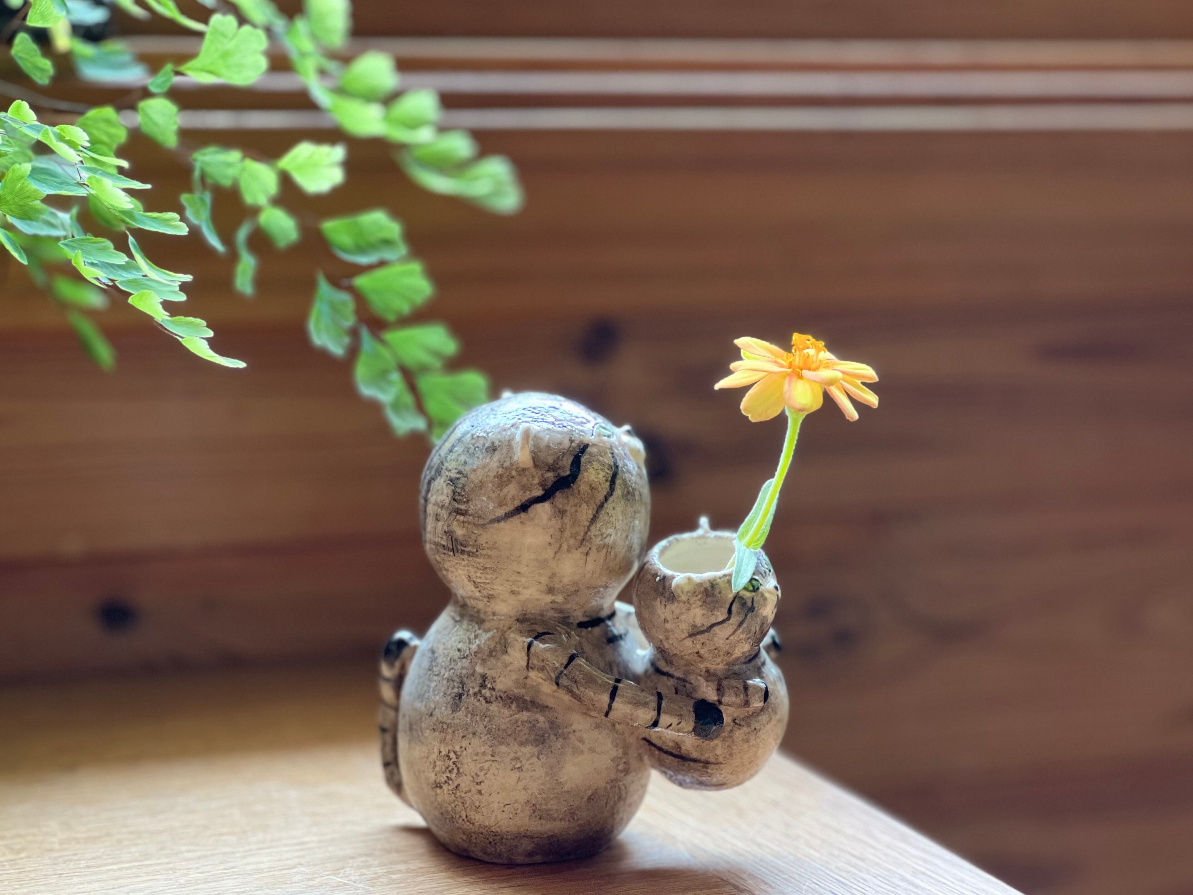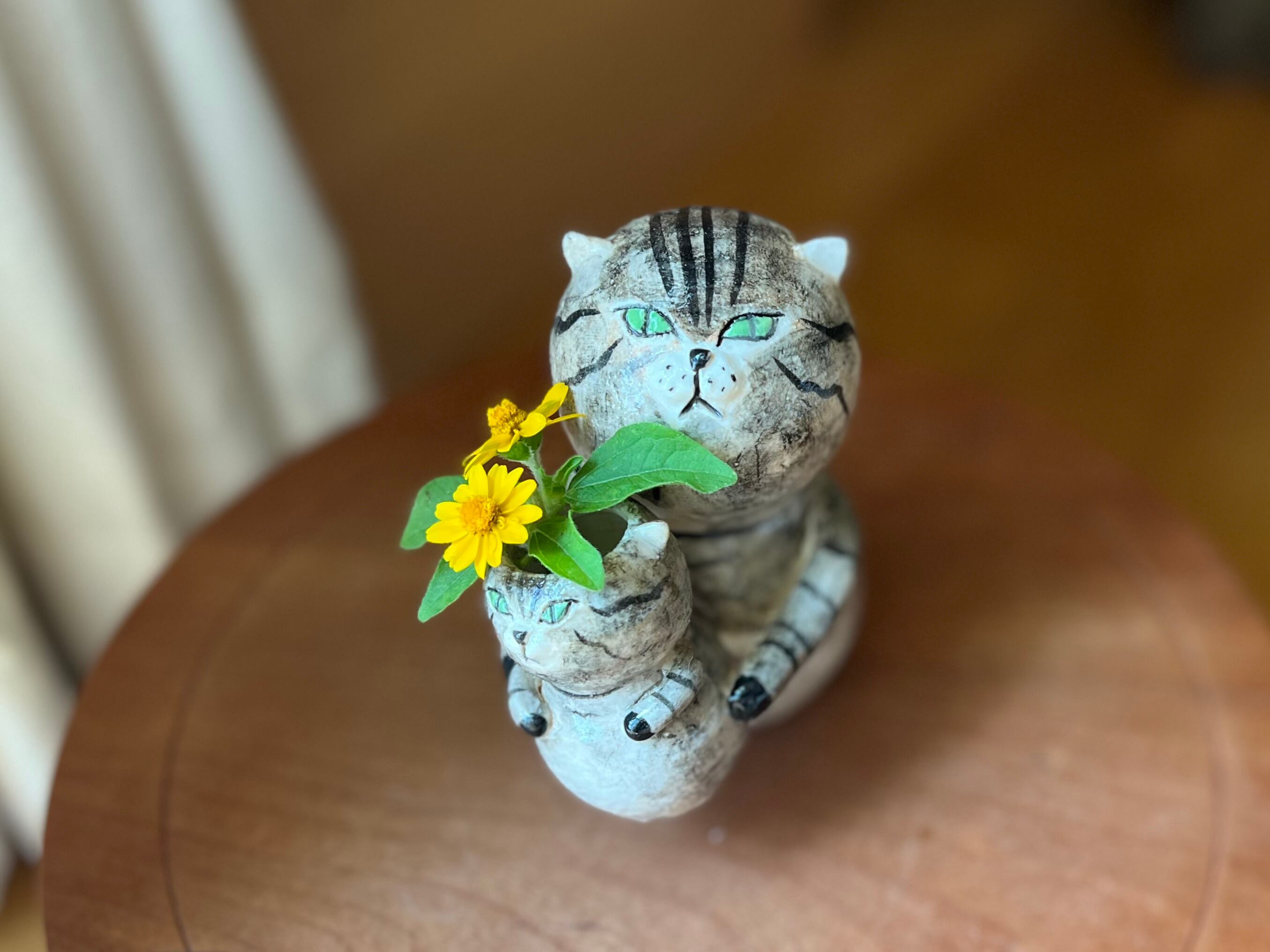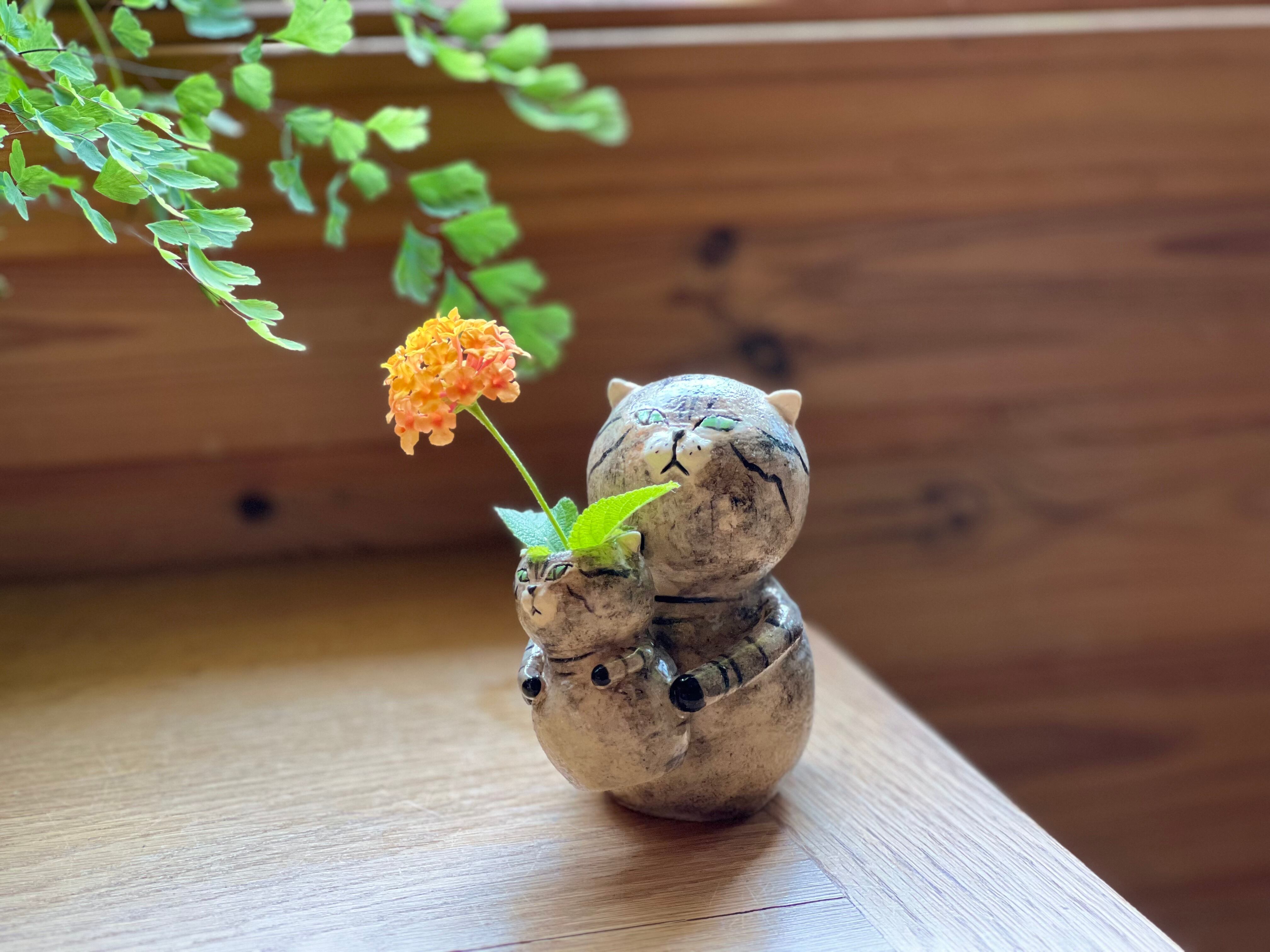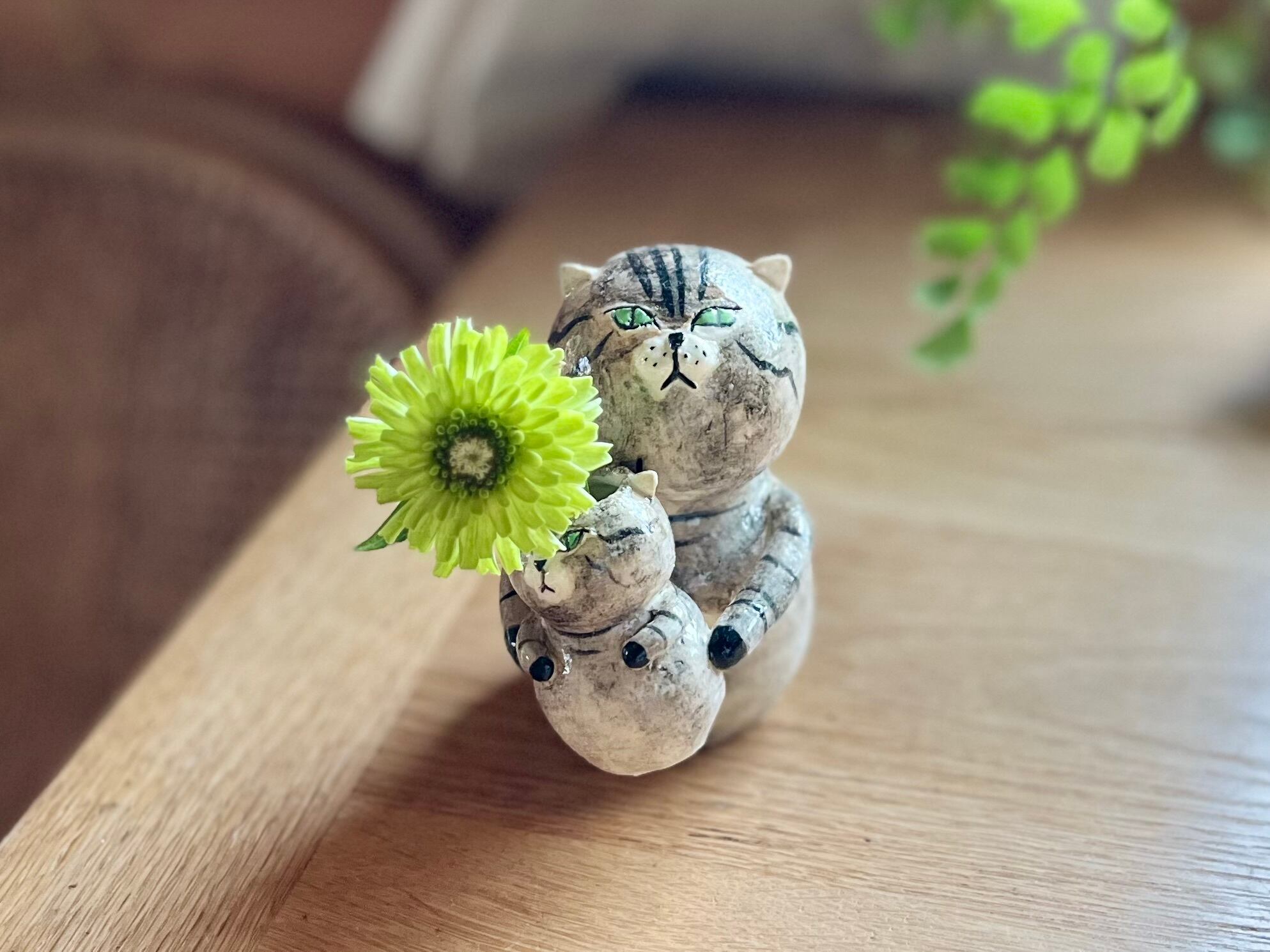 とら猫さんが小さい猫さんを抱っこした一輪挿しです。猫好きの方や花を飾るのが好きな方にぴったりのアイテムです。