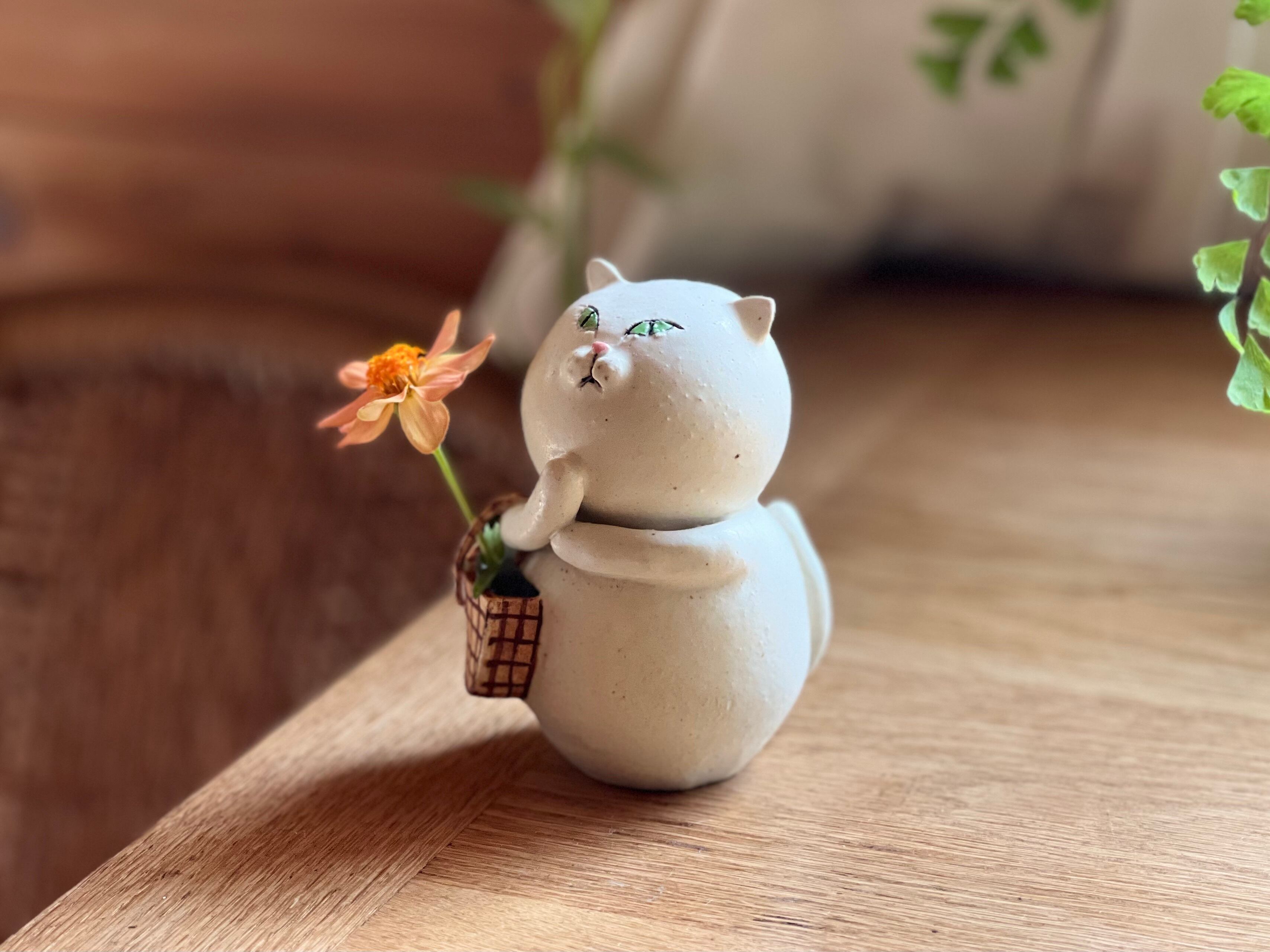 白猫さんが買い物かごを持った一輪挿しです。猫好きの方や花を飾るのが好きな方にぴったりのアイテムです。