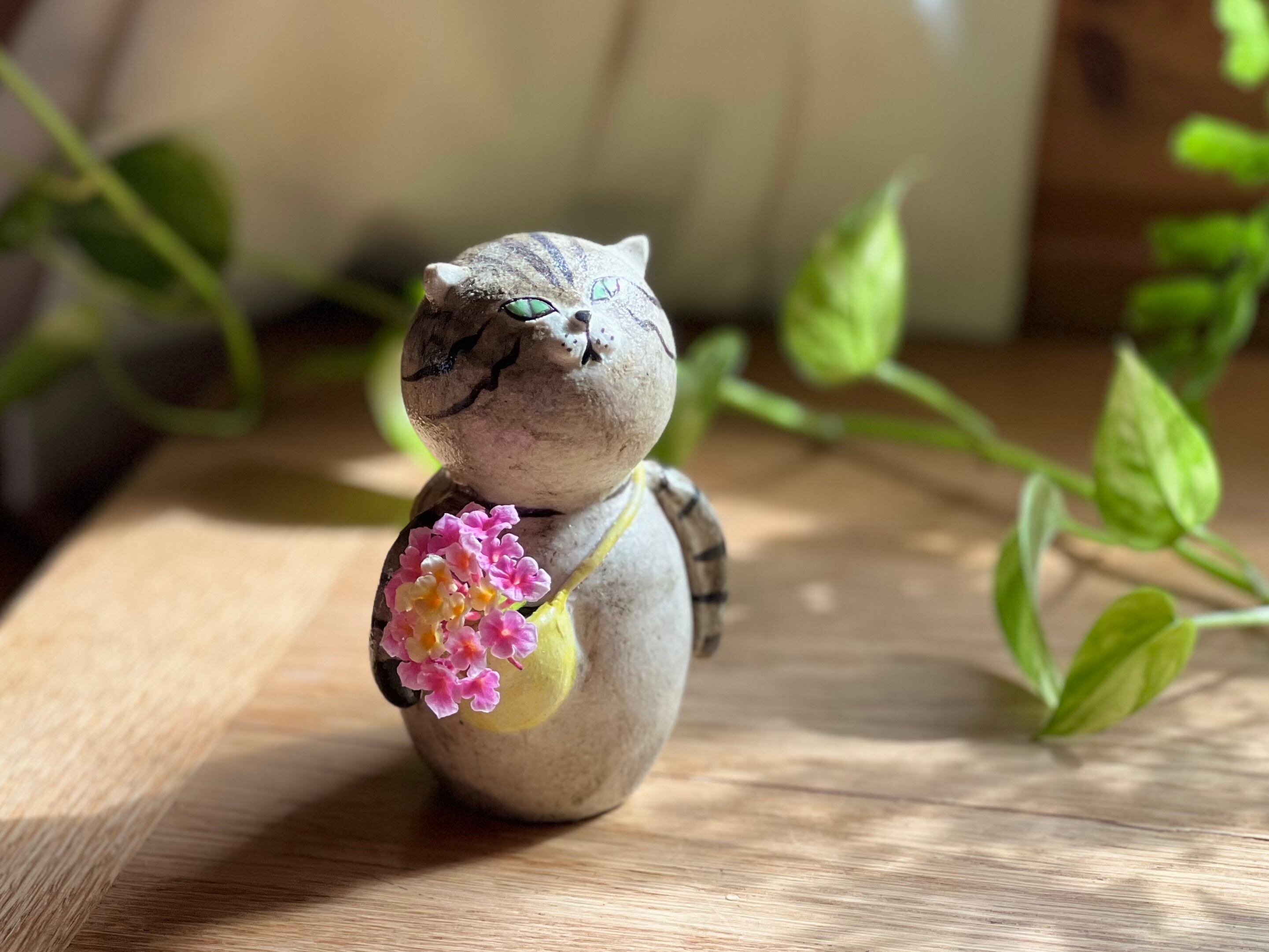 猫さん花瓶は、手作りの陶器製で、ひとつひとつ丁寧に作られています。そのため、それぞれの表情や模様が微妙に異なるのも魅力の一つです。