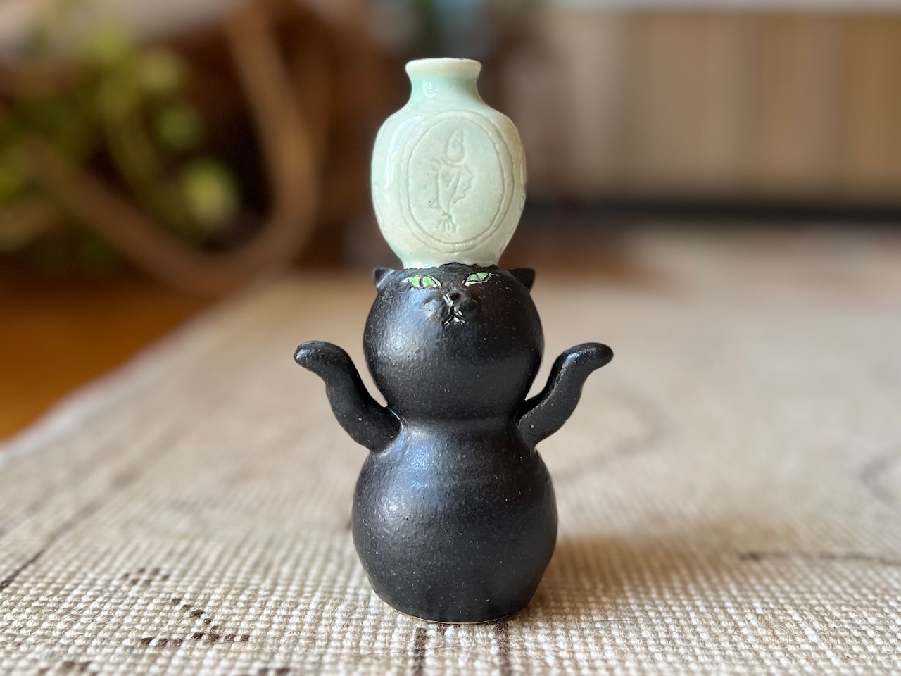 黒猫さんが花瓶を頭に乗せた一輪挿しです。猫好きの方や花を飾るのが好きな方にぴったりのアイテムです。