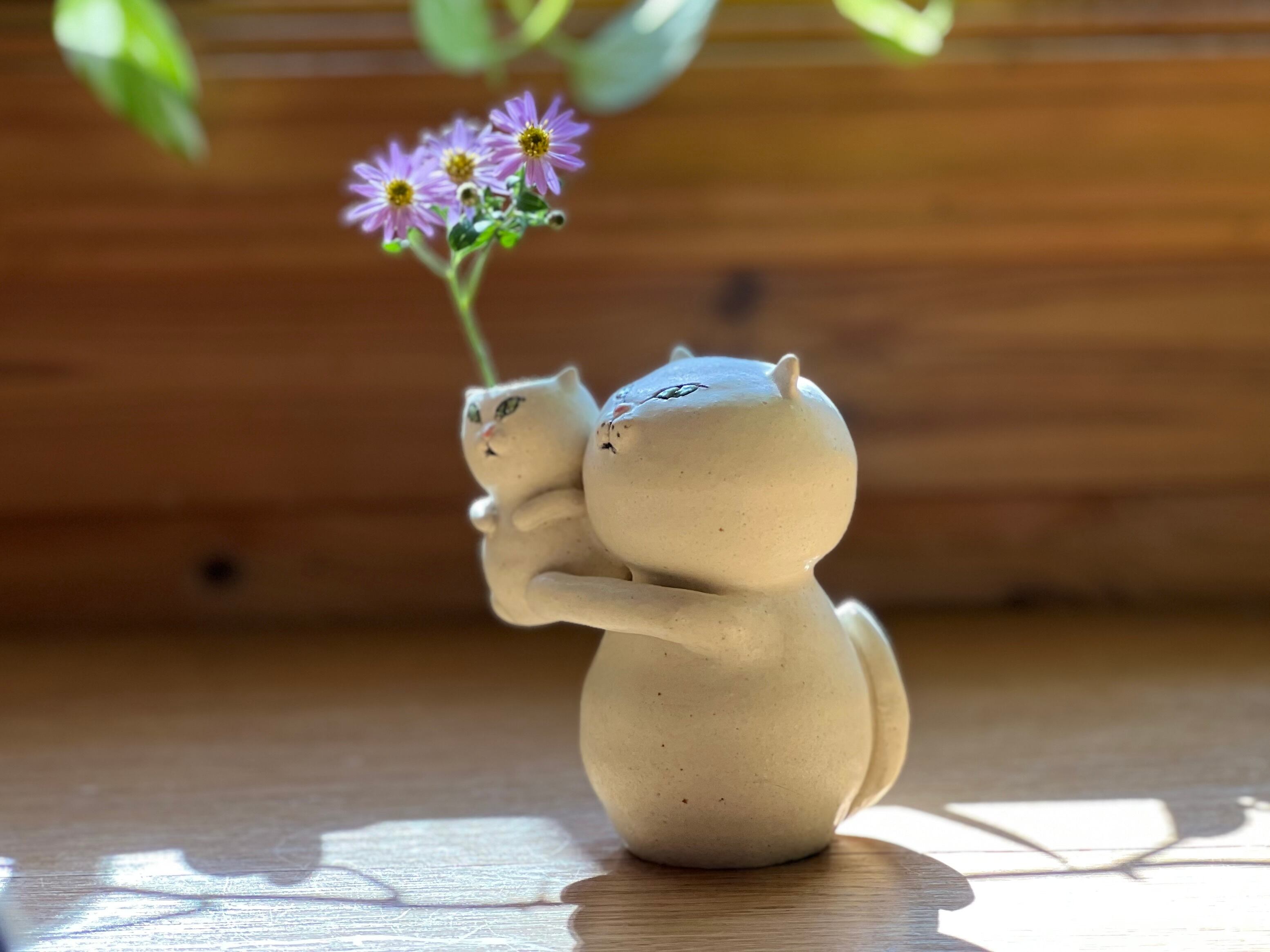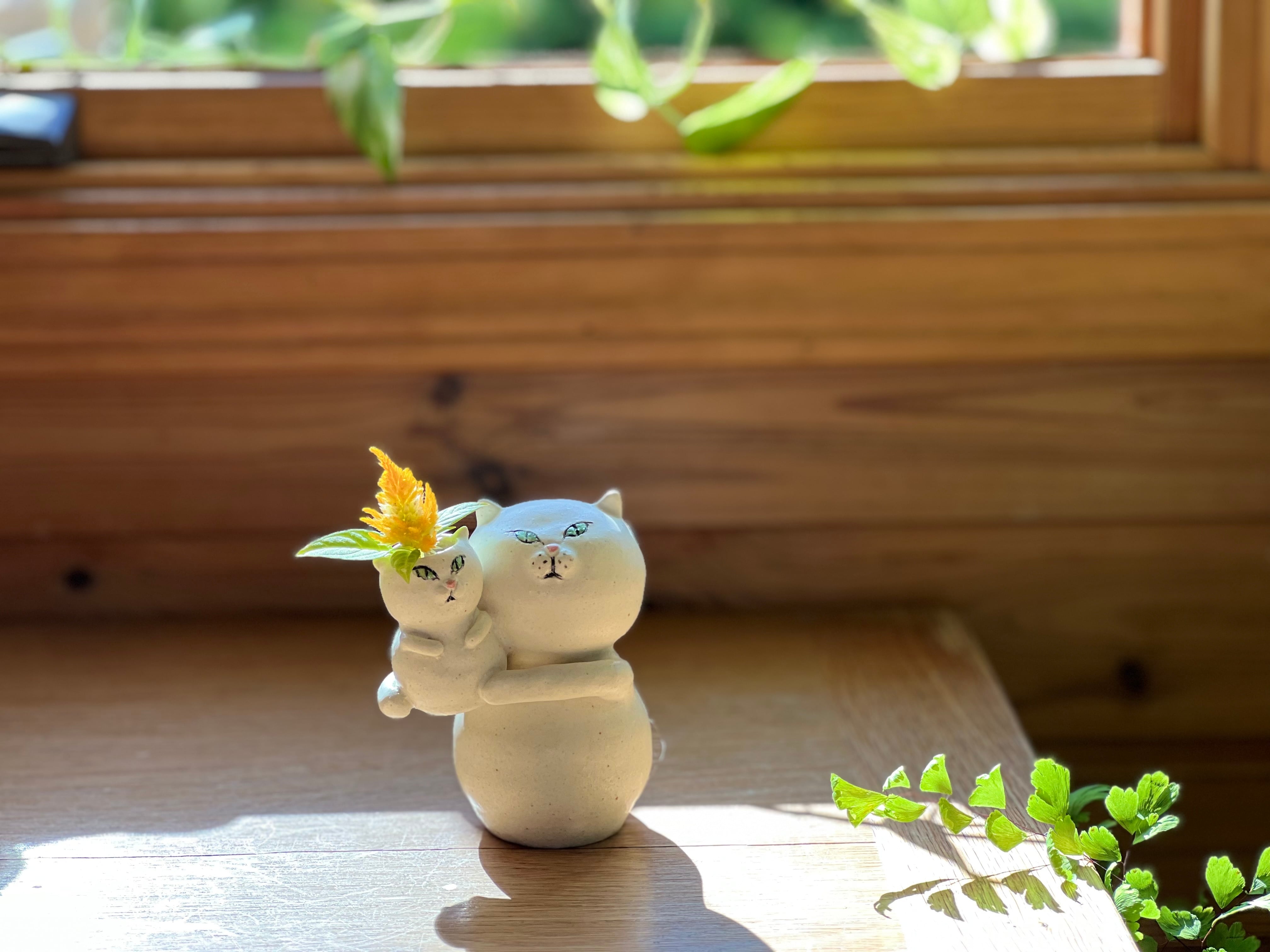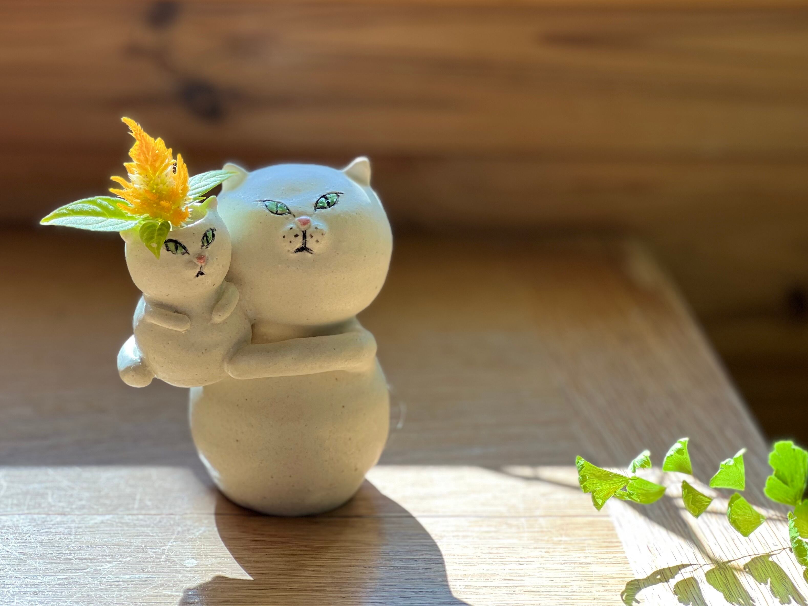白猫さんが小さい猫さんを抱っこした一輪挿しです。猫好きの方や花を飾るのが好きな方にぴったりのアイテムです。