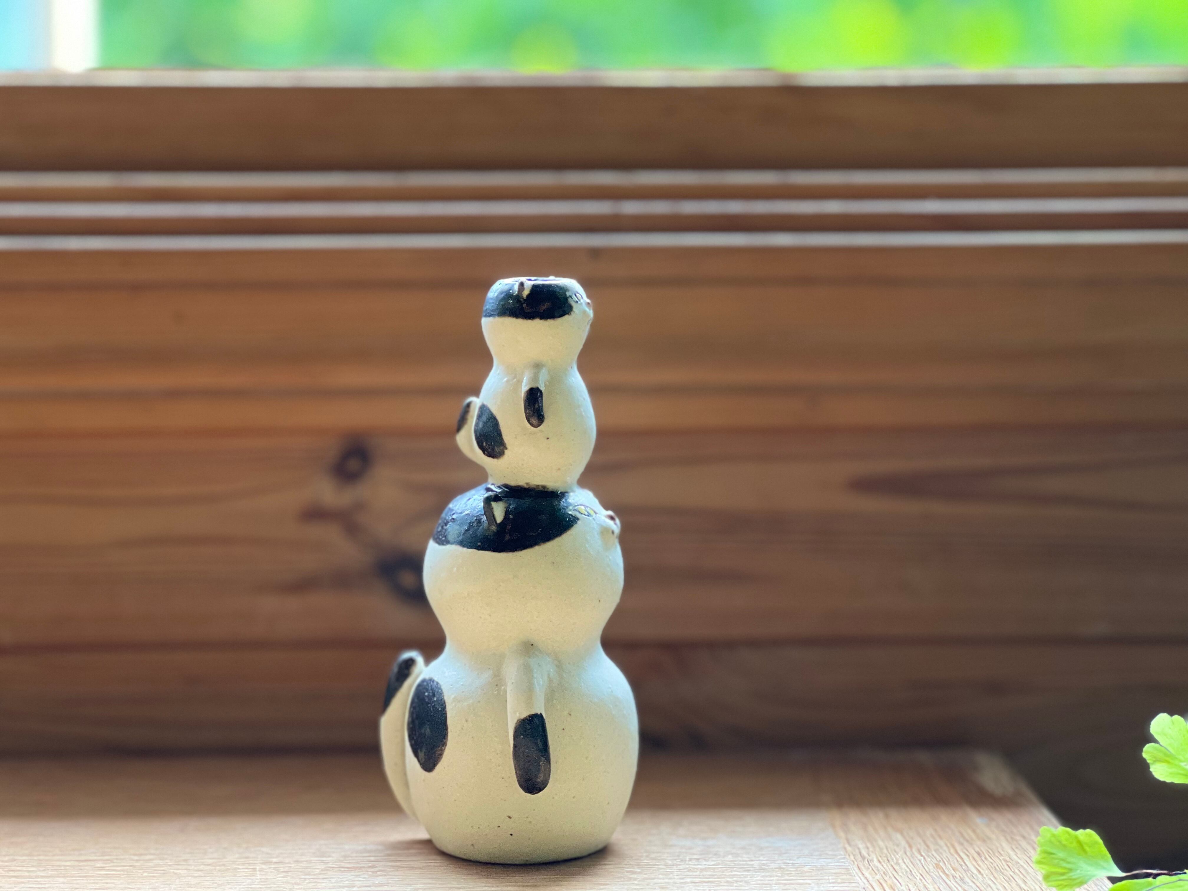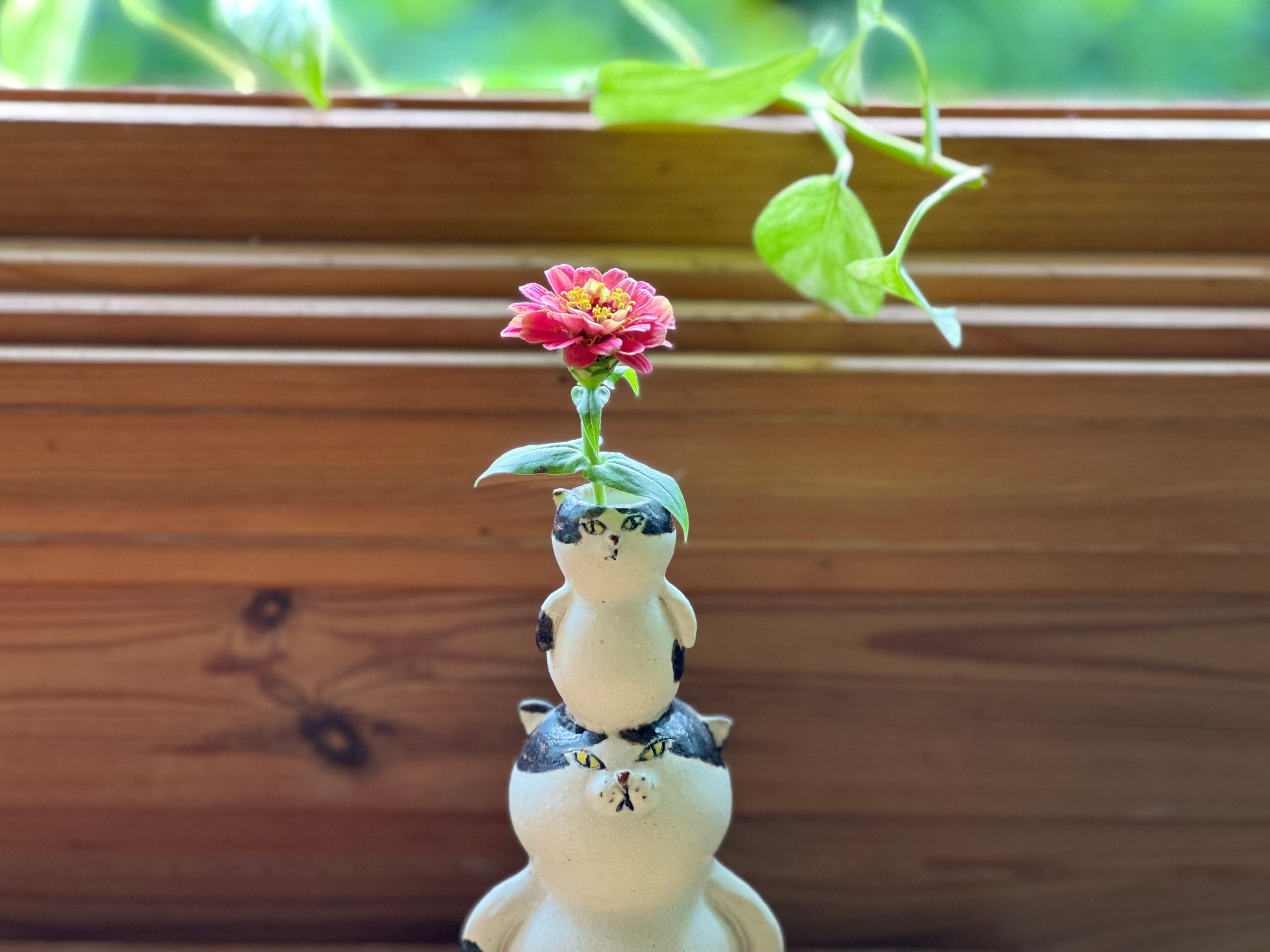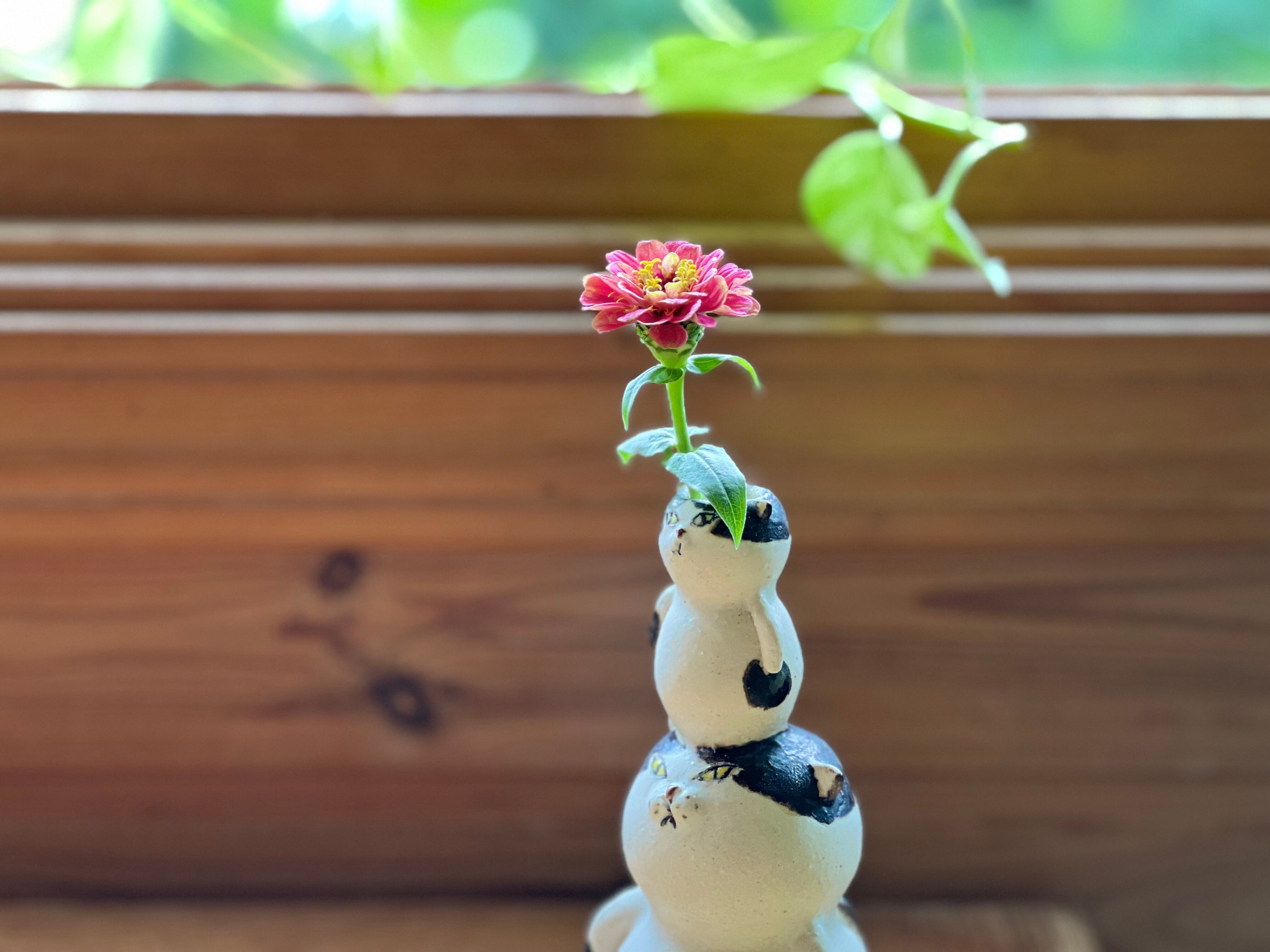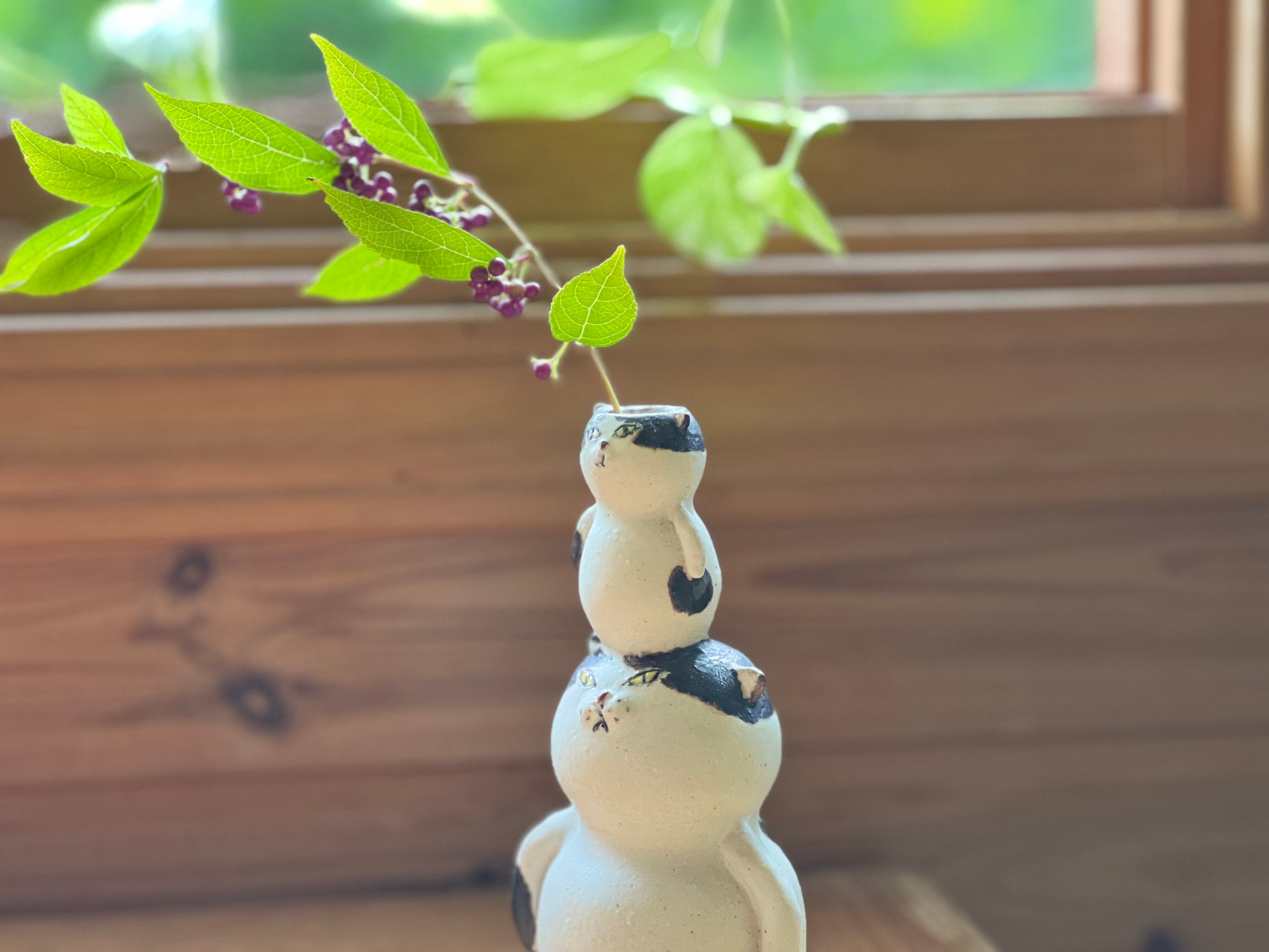 ハチワレ猫さんが小さい猫さんを頭に乗せた一輪挿しです。猫好きの方や花を飾るのが好きな方にぴったりのアイテムです。