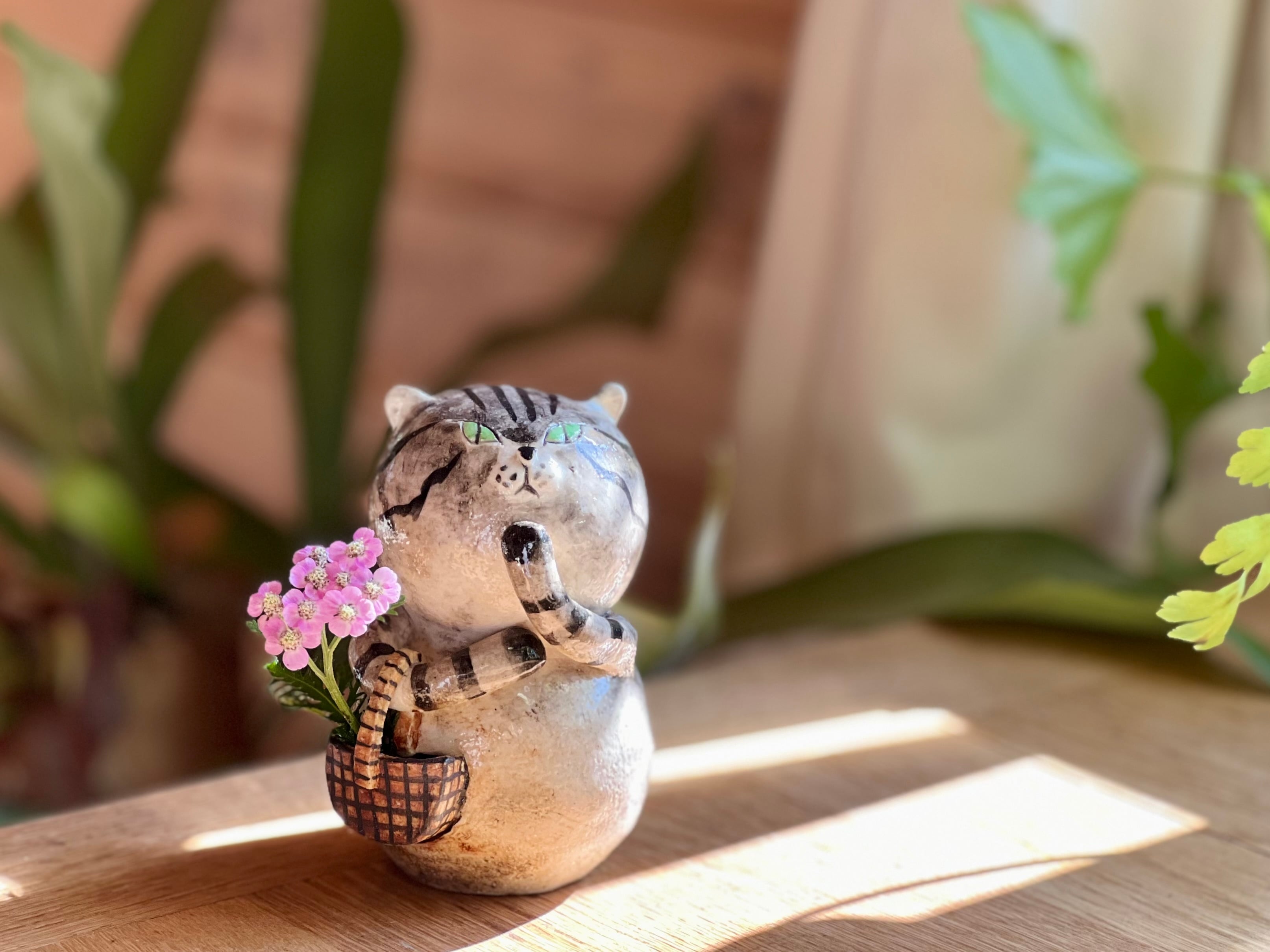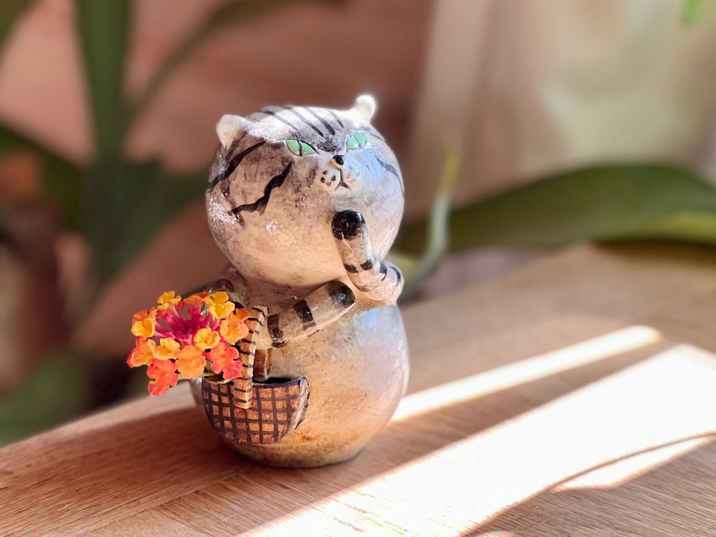 猫さん花瓶 買い物かごを持ったとら猫さん