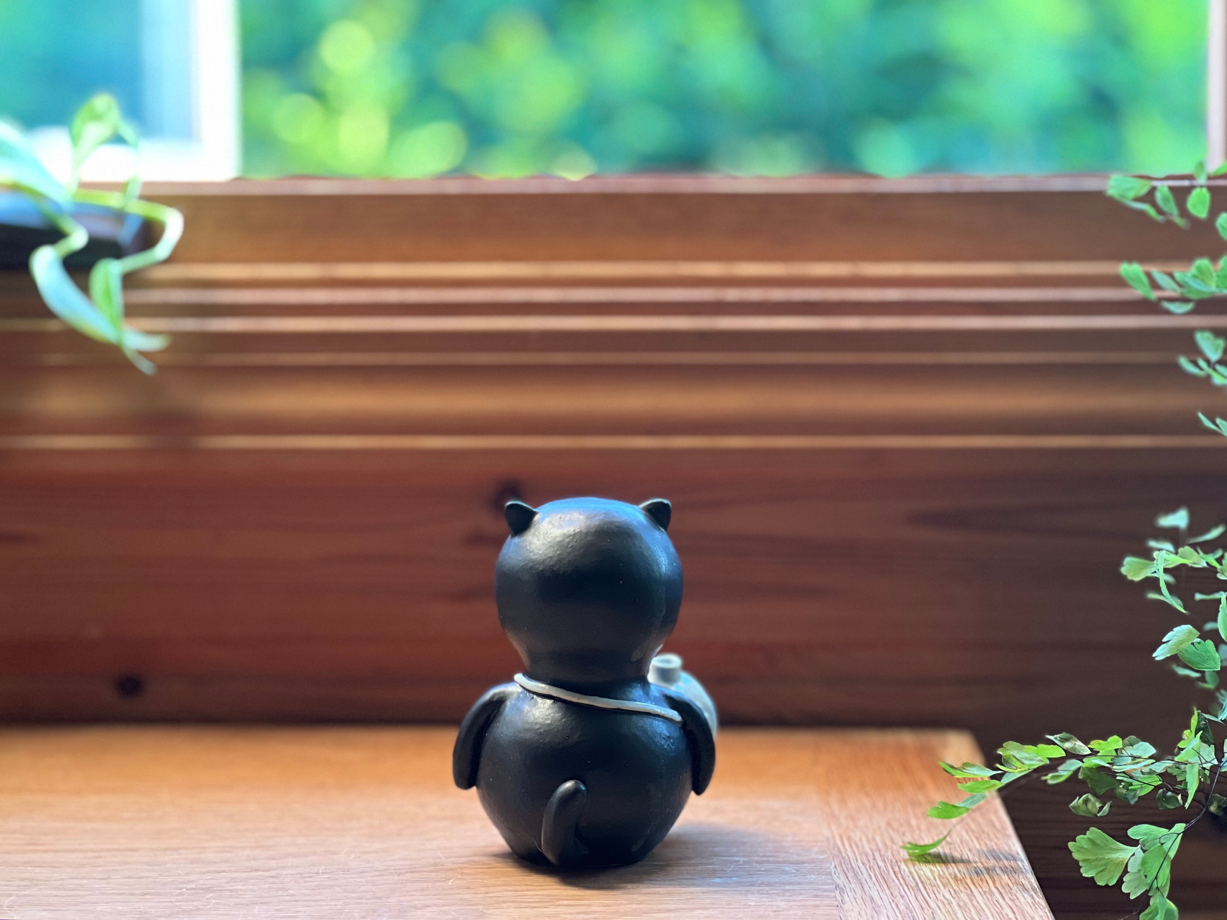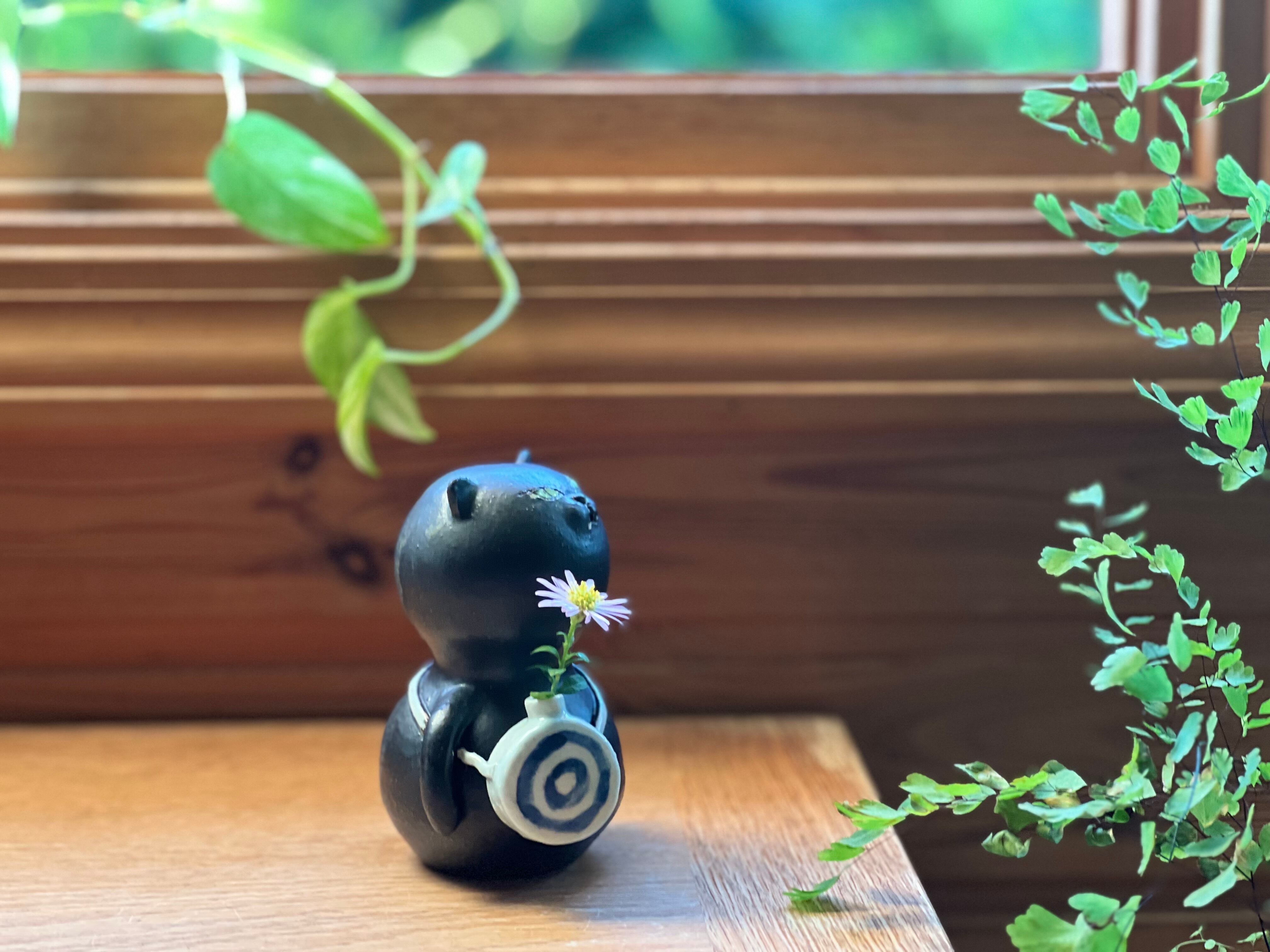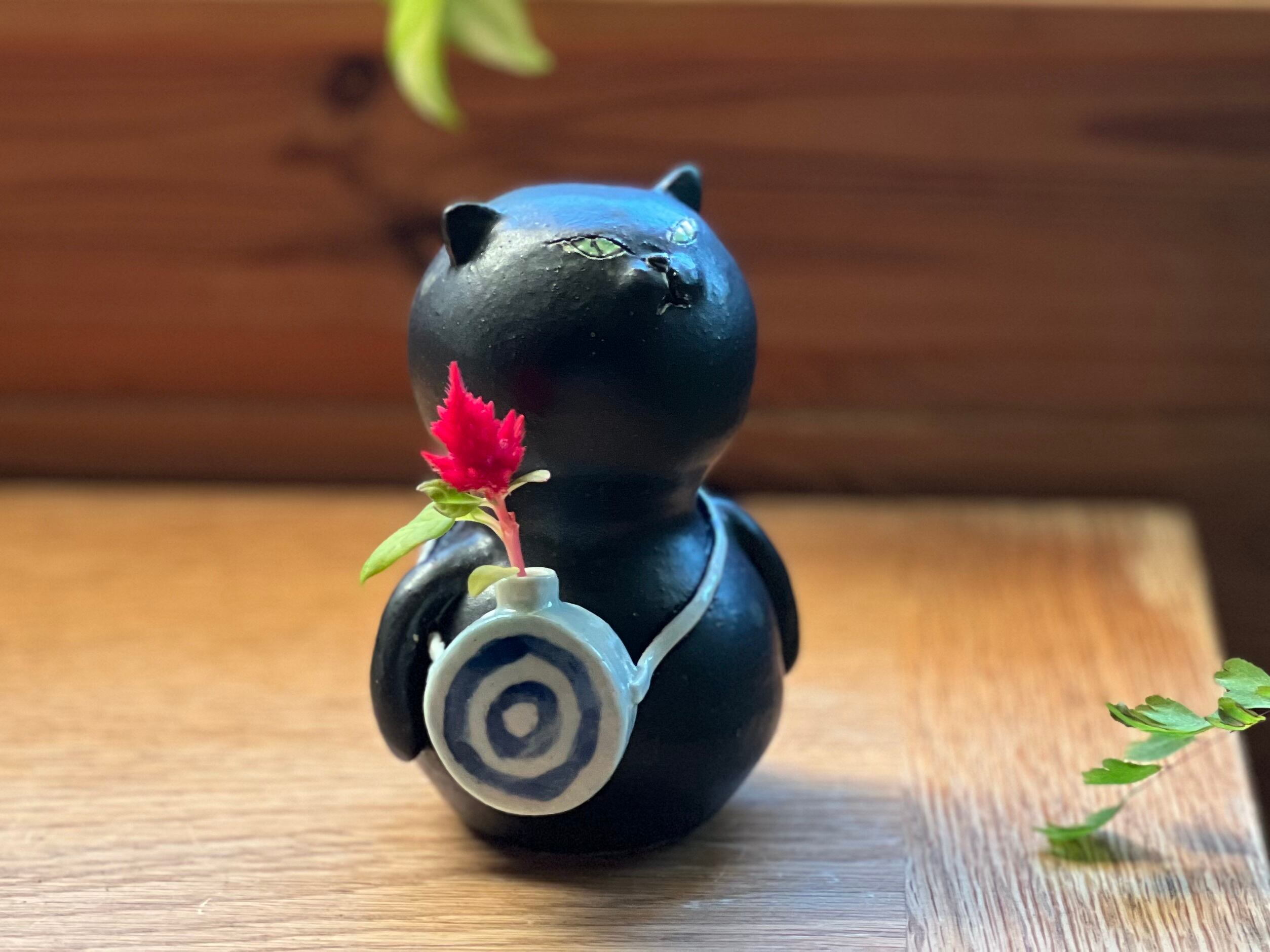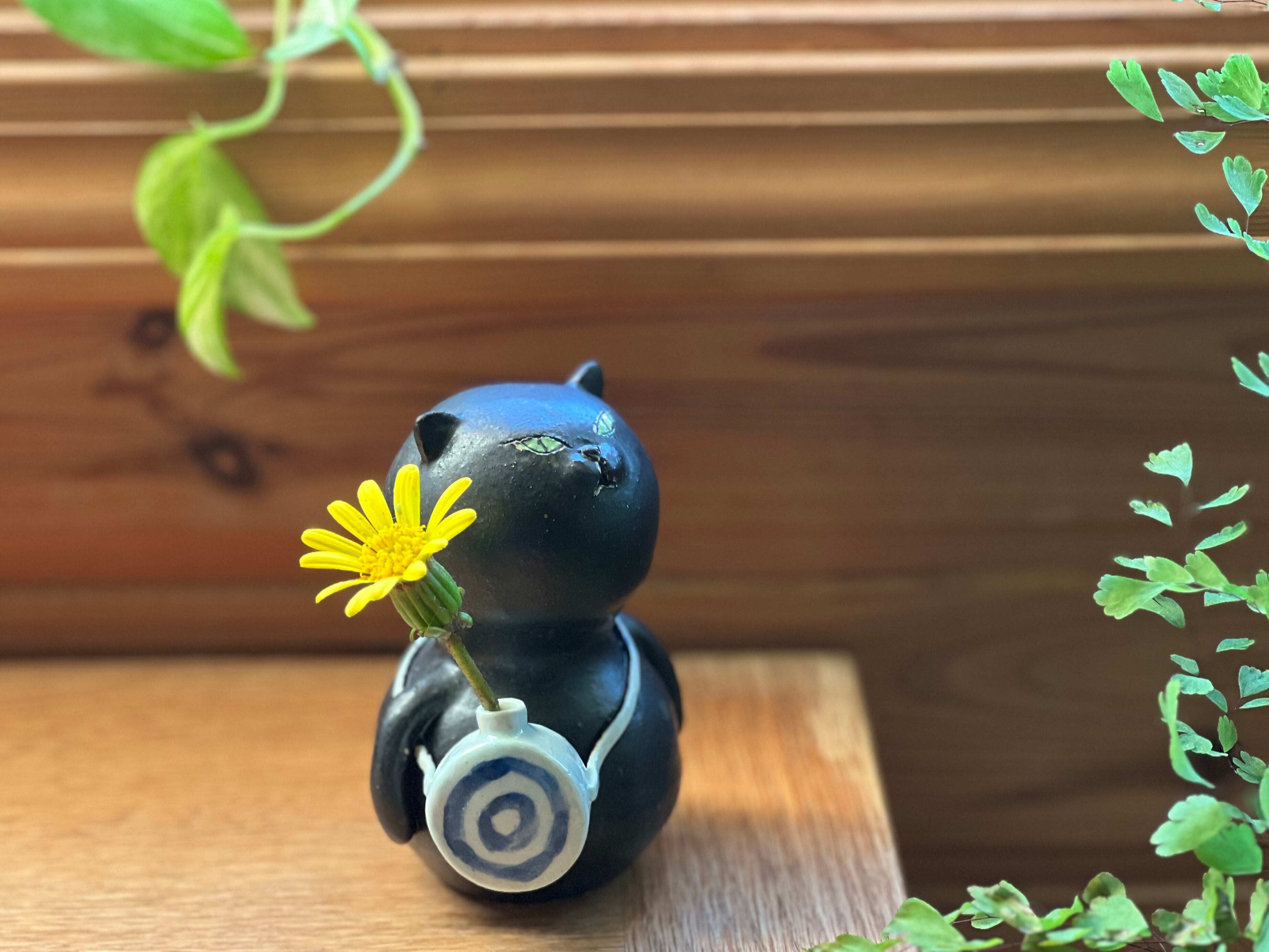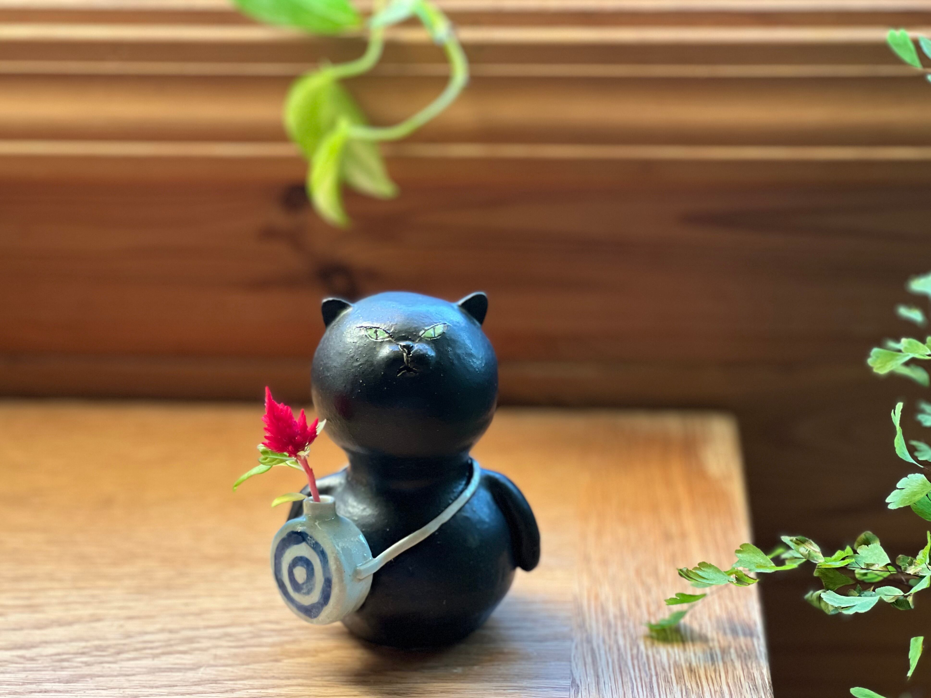 黒猫さんが水筒をさげた一輪挿しです。猫好きの方や花を飾るのが好きな方にぴったりのアイテムです。