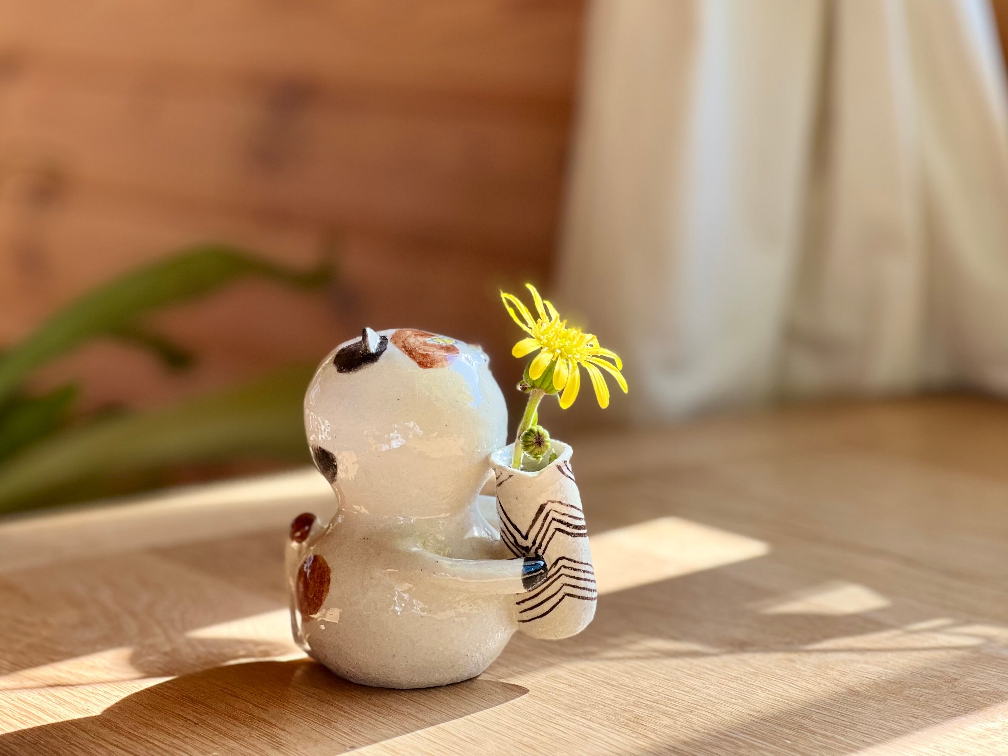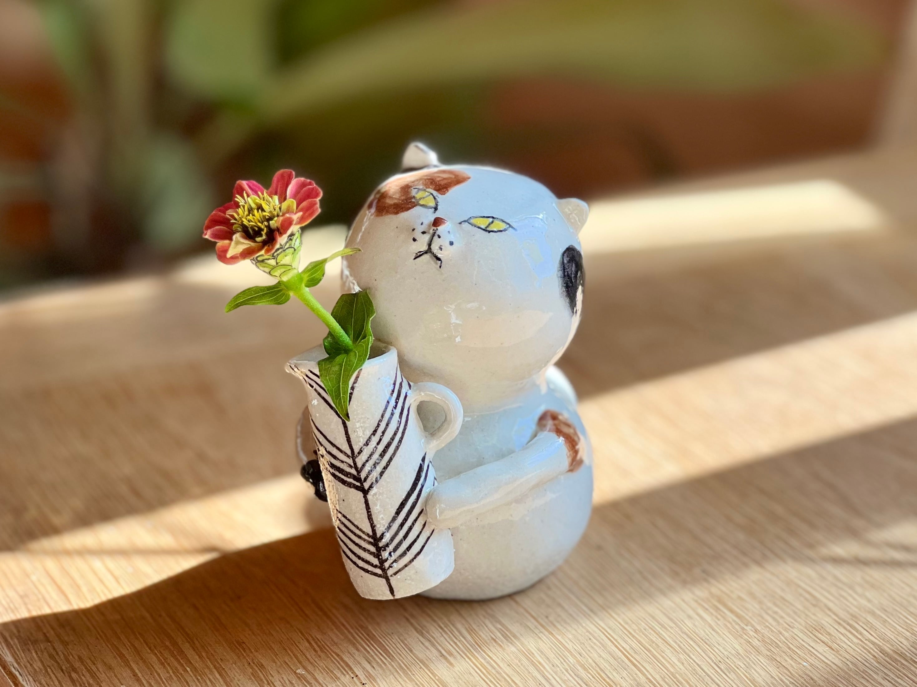 三毛猫さんが花瓶を持った一輪挿しです。猫好きの方や花を飾るのが好きな方にぴったりのアイテムです。
