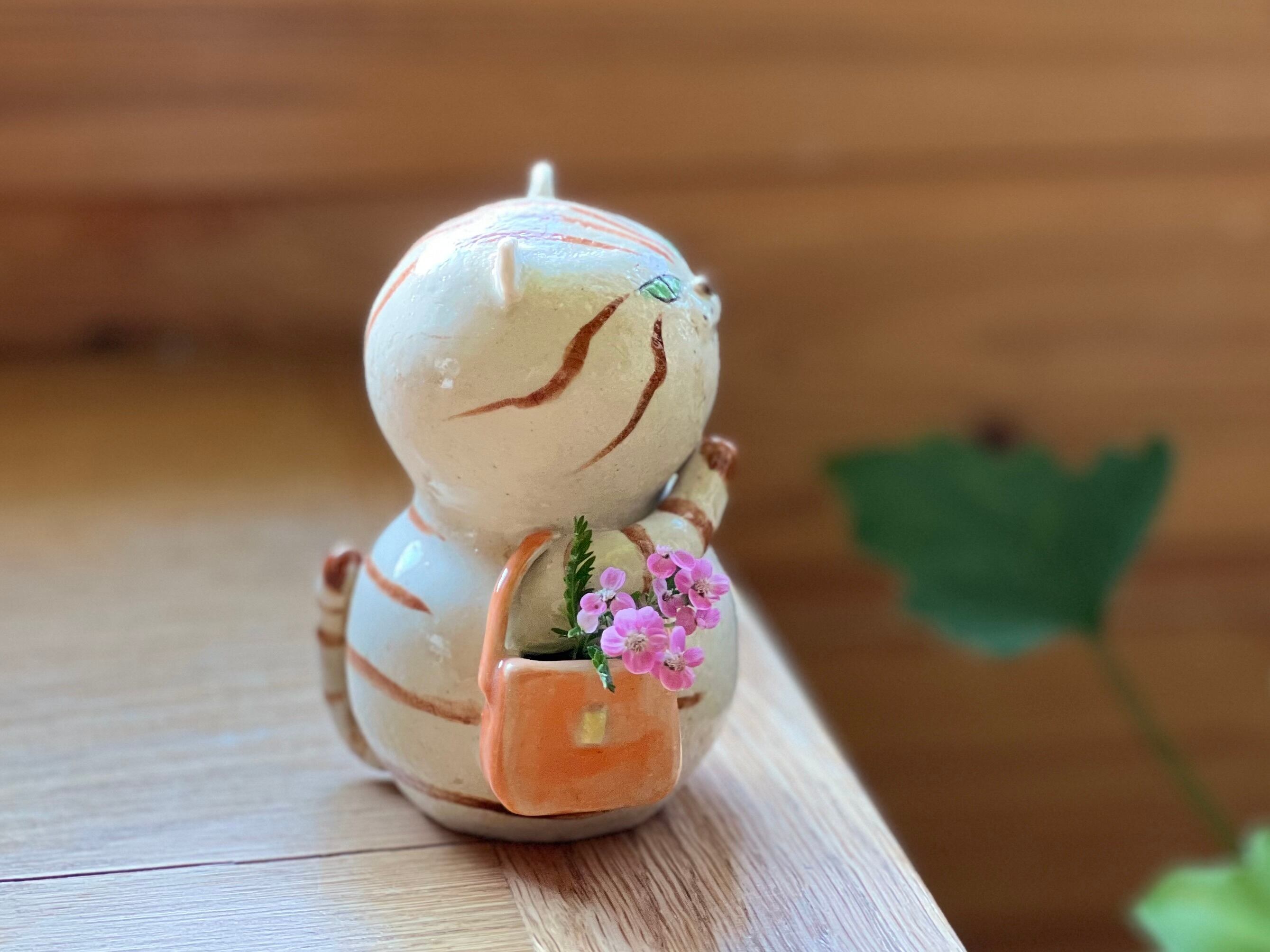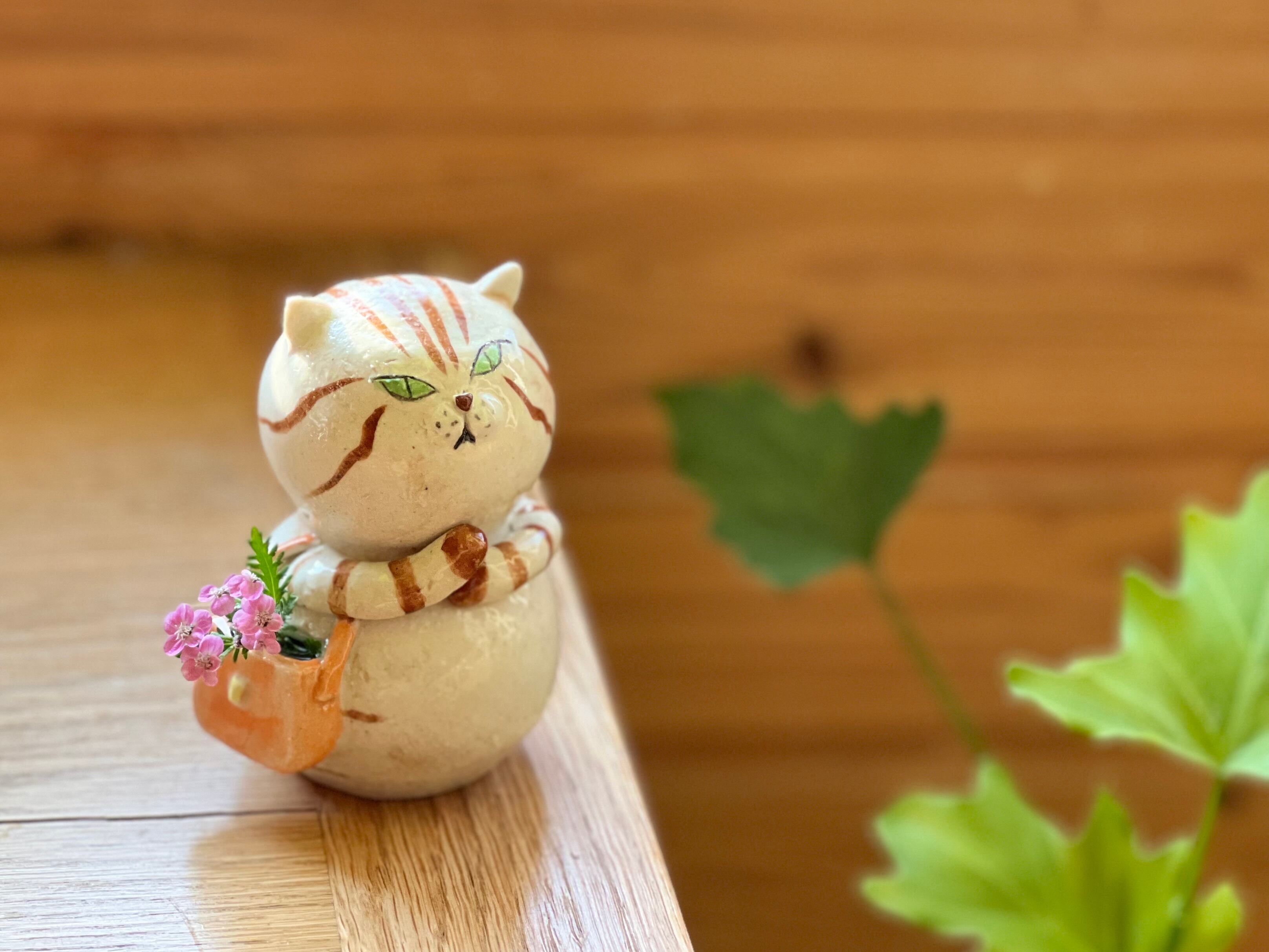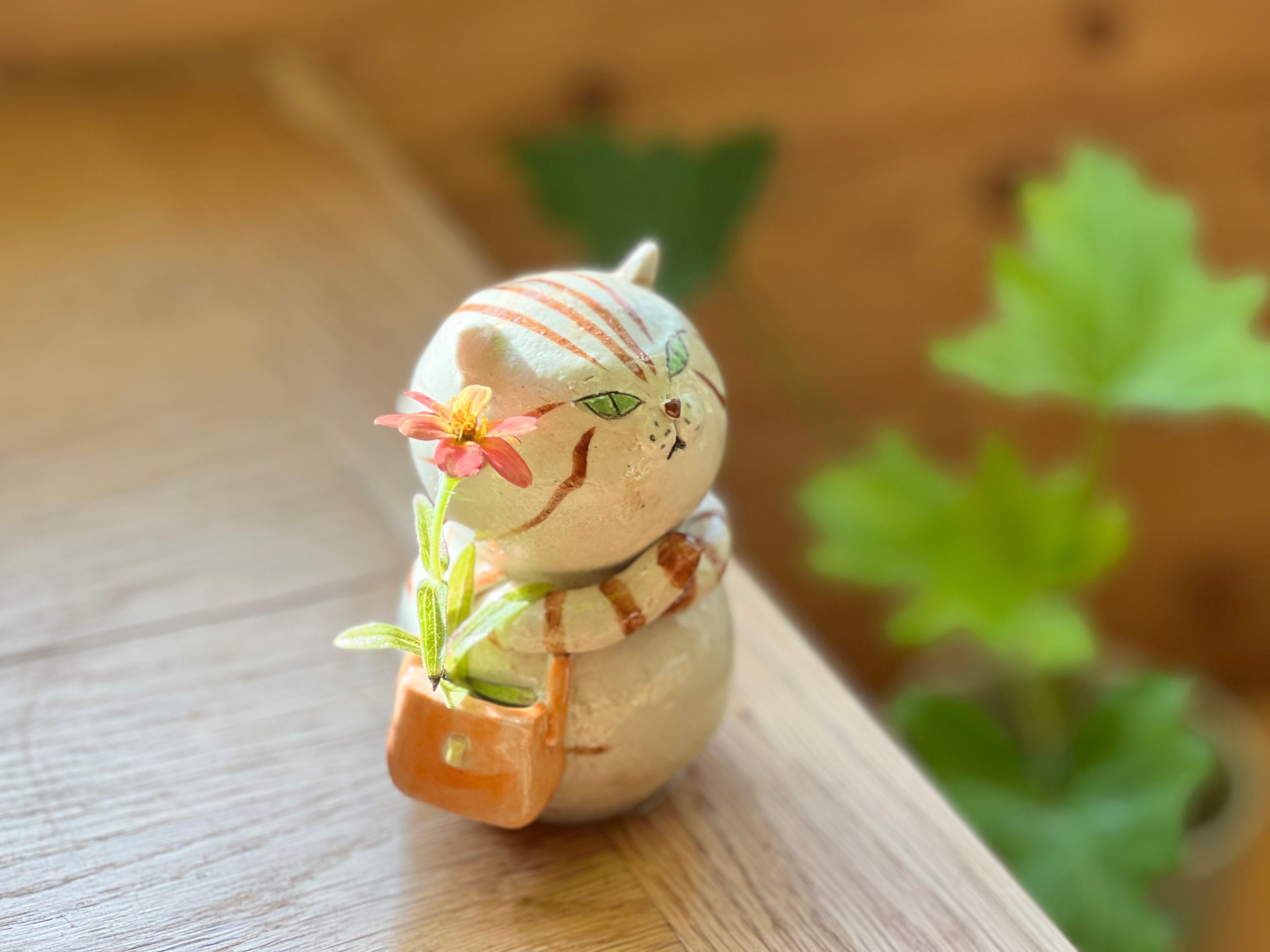 茶トラさんがショルダーバッグを肩にかけた一輪挿しです。猫好きの方や花を飾るのが好きな方にぴったりのアイテムです。