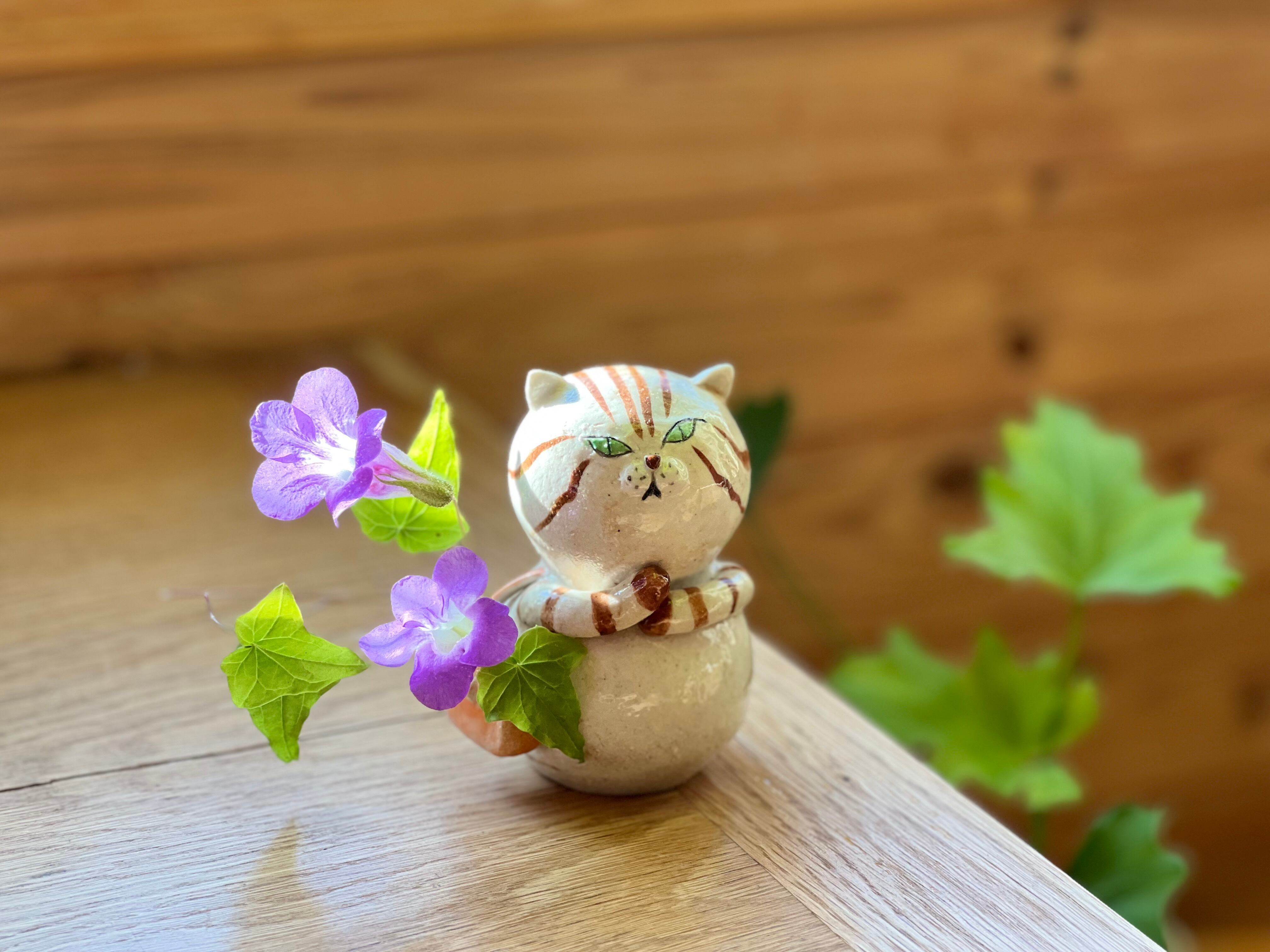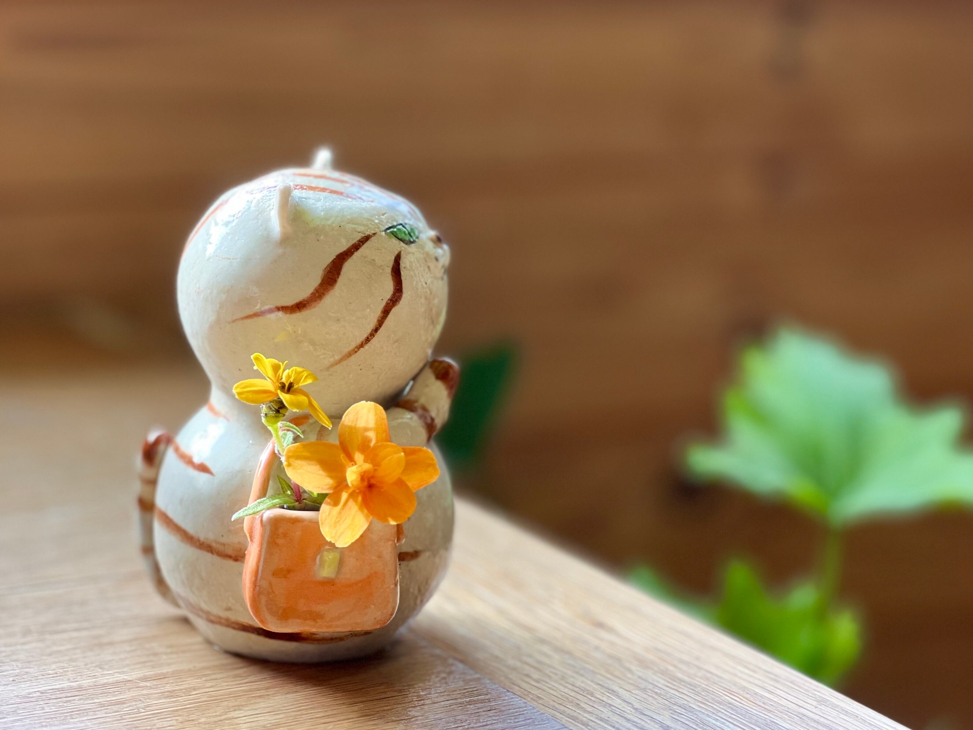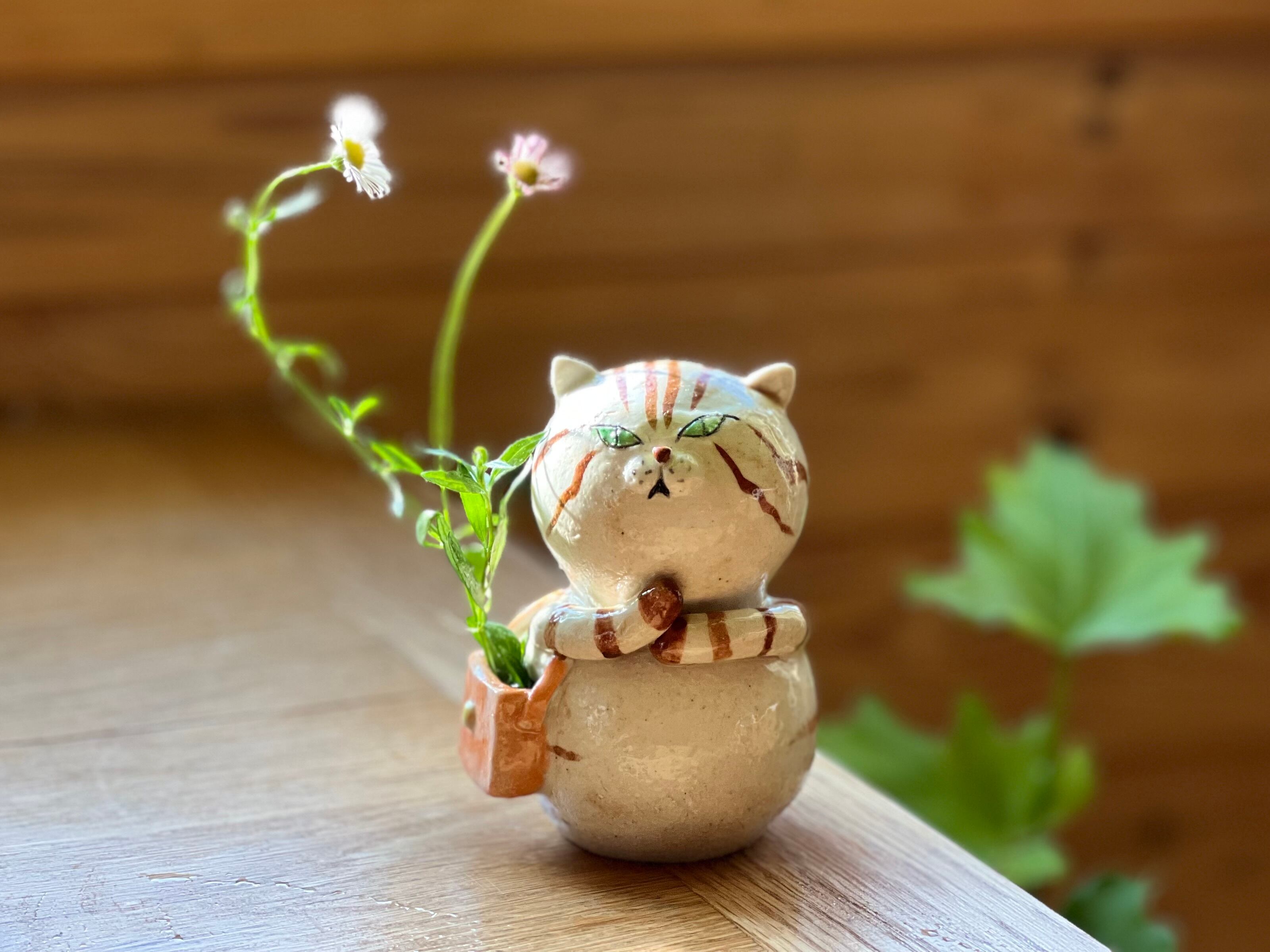 茶トラさんがショルダーバッグを肩にかけた一輪挿しです。猫好きの方や花を飾るのが好きな方にぴったりのアイテムです。