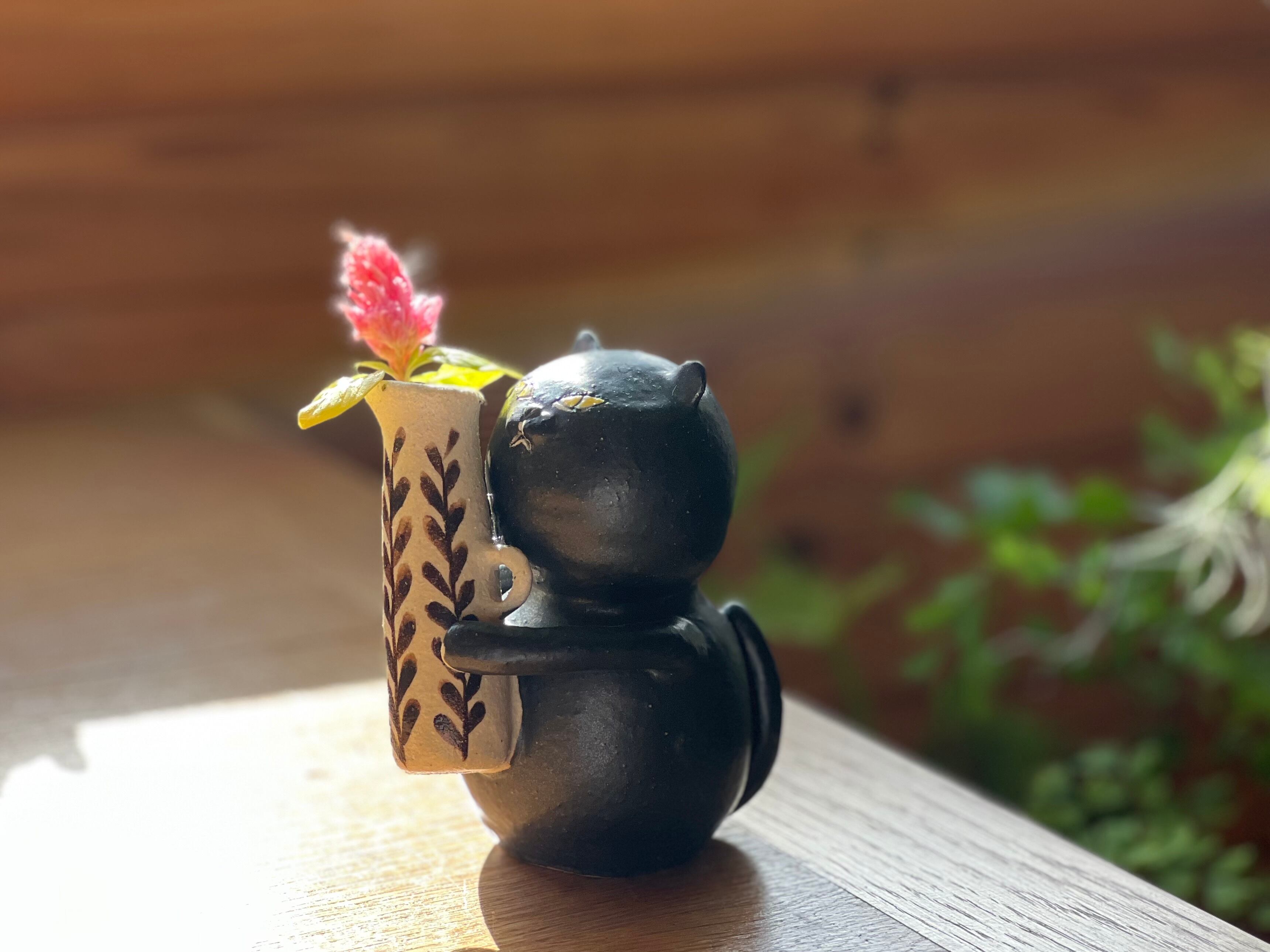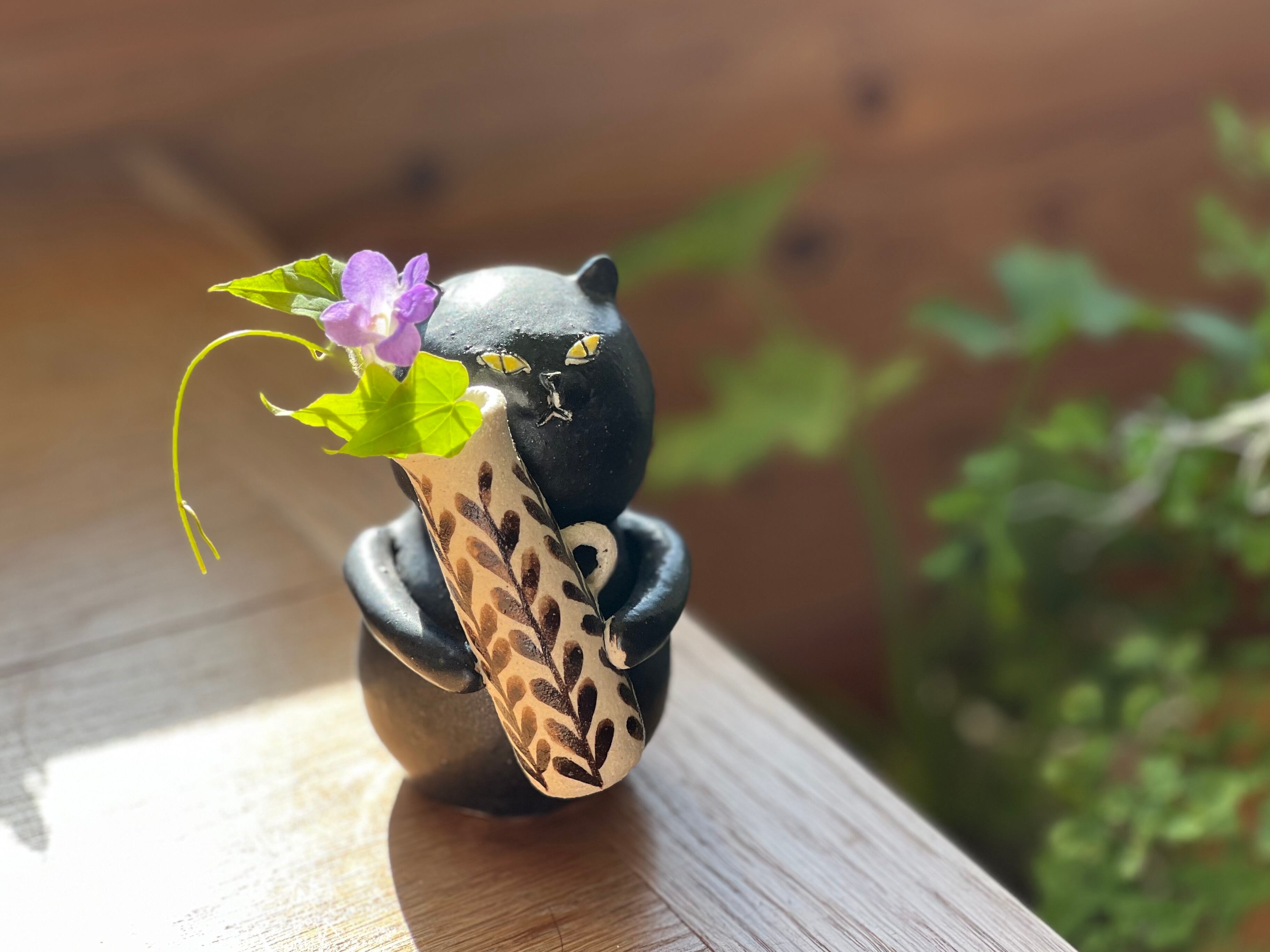黒猫さんが花瓶を持った一輪挿しです。猫好きの方や花を飾るのが好きな方にぴったりのアイテムです。