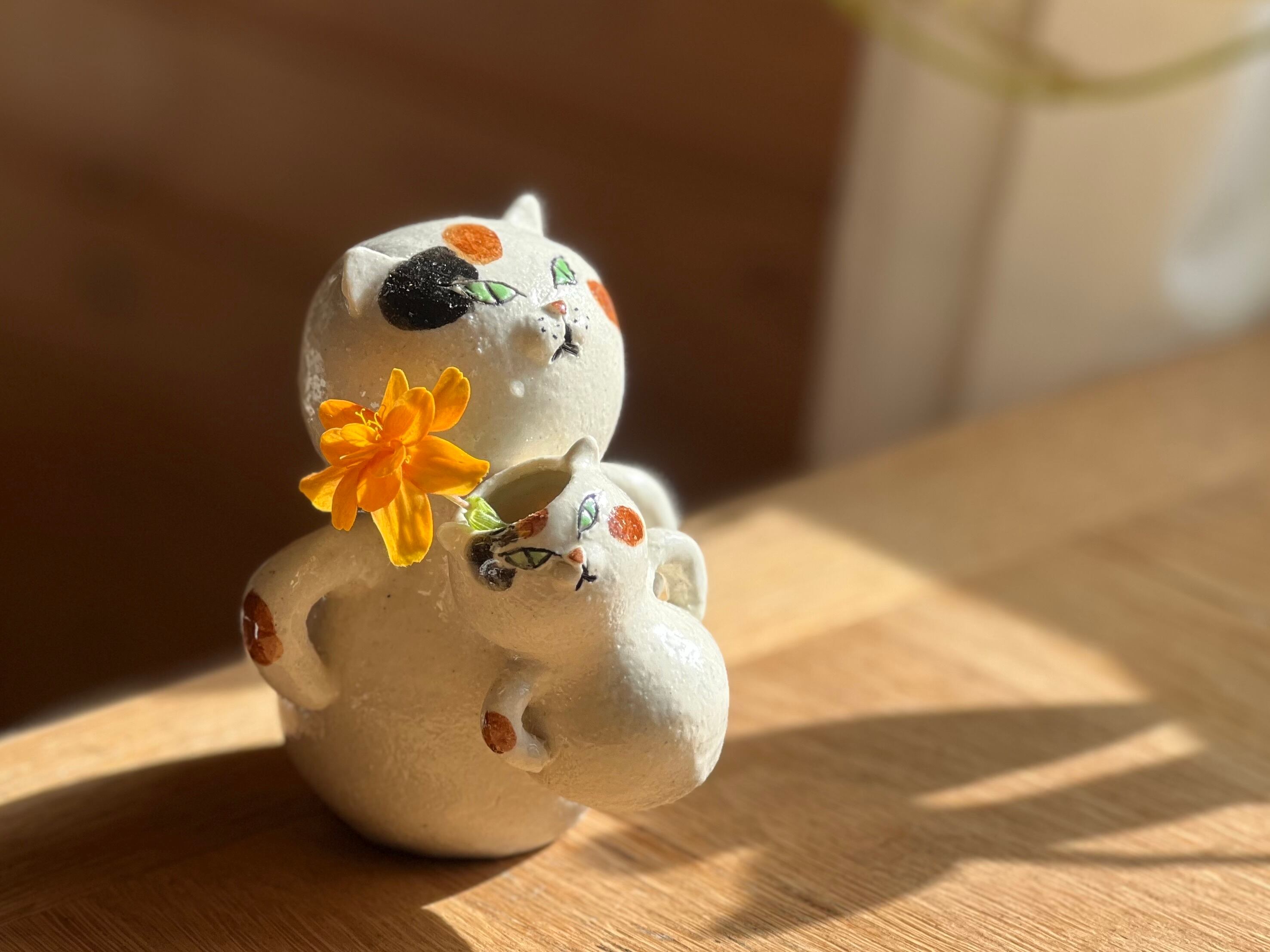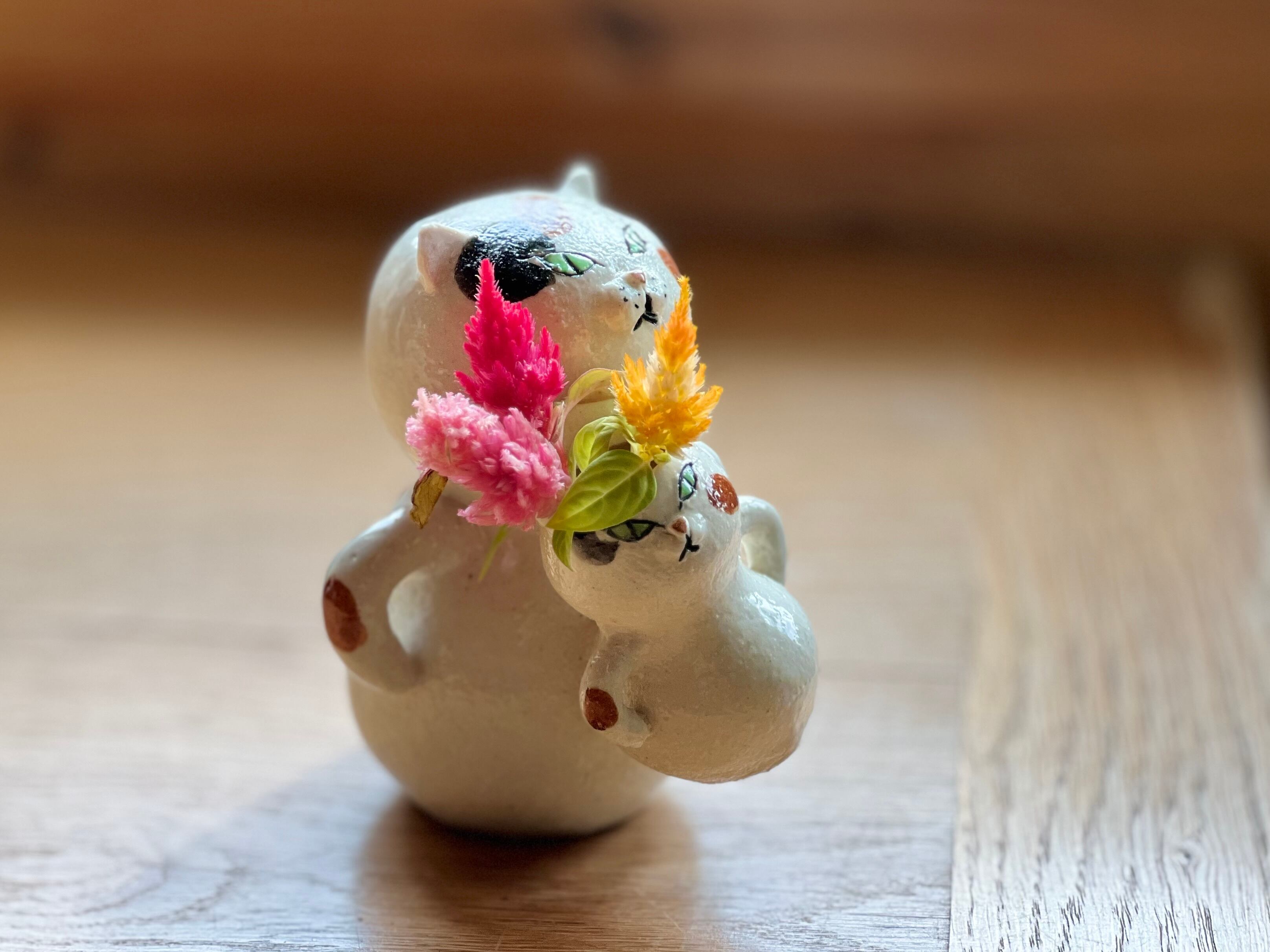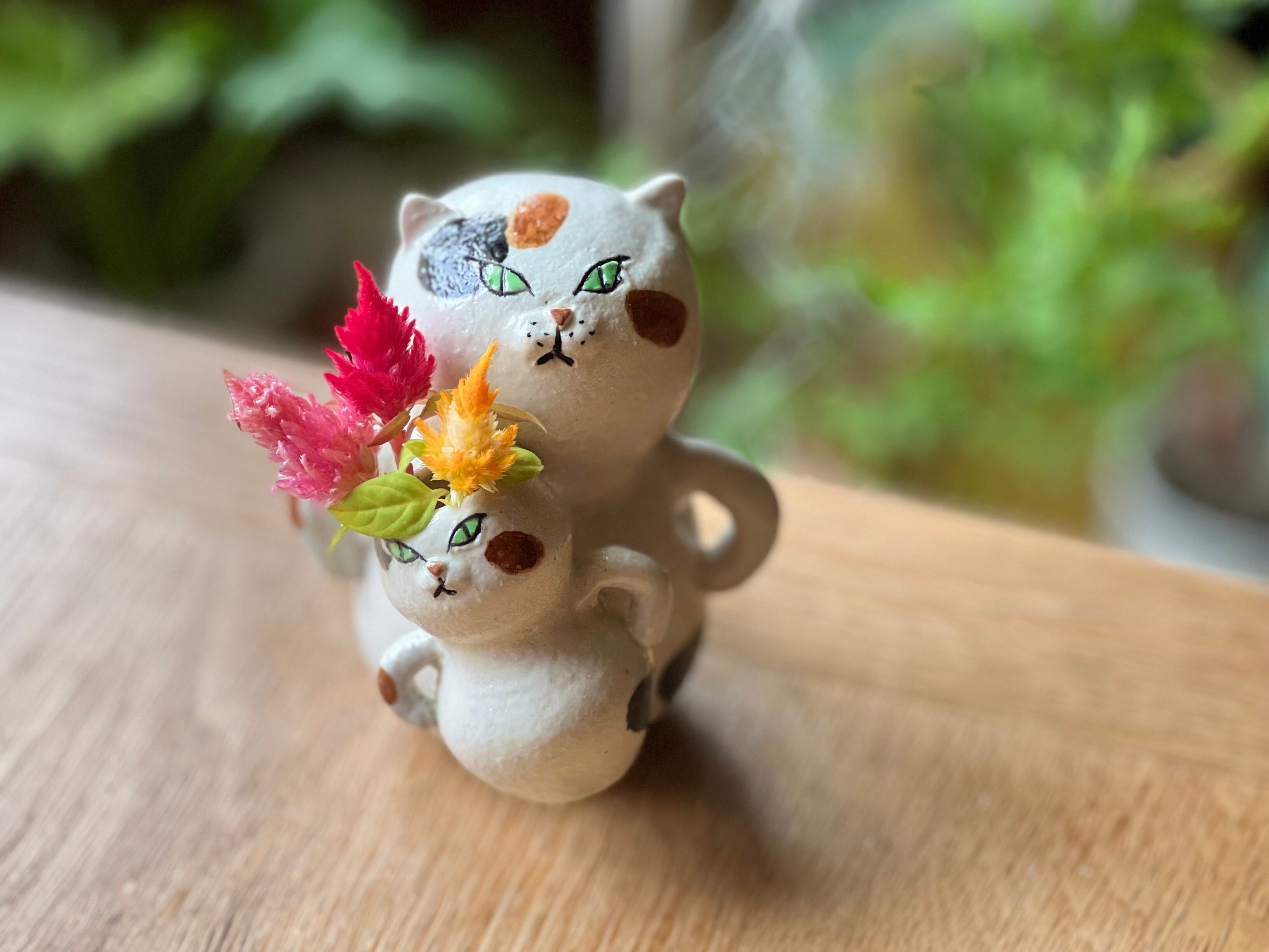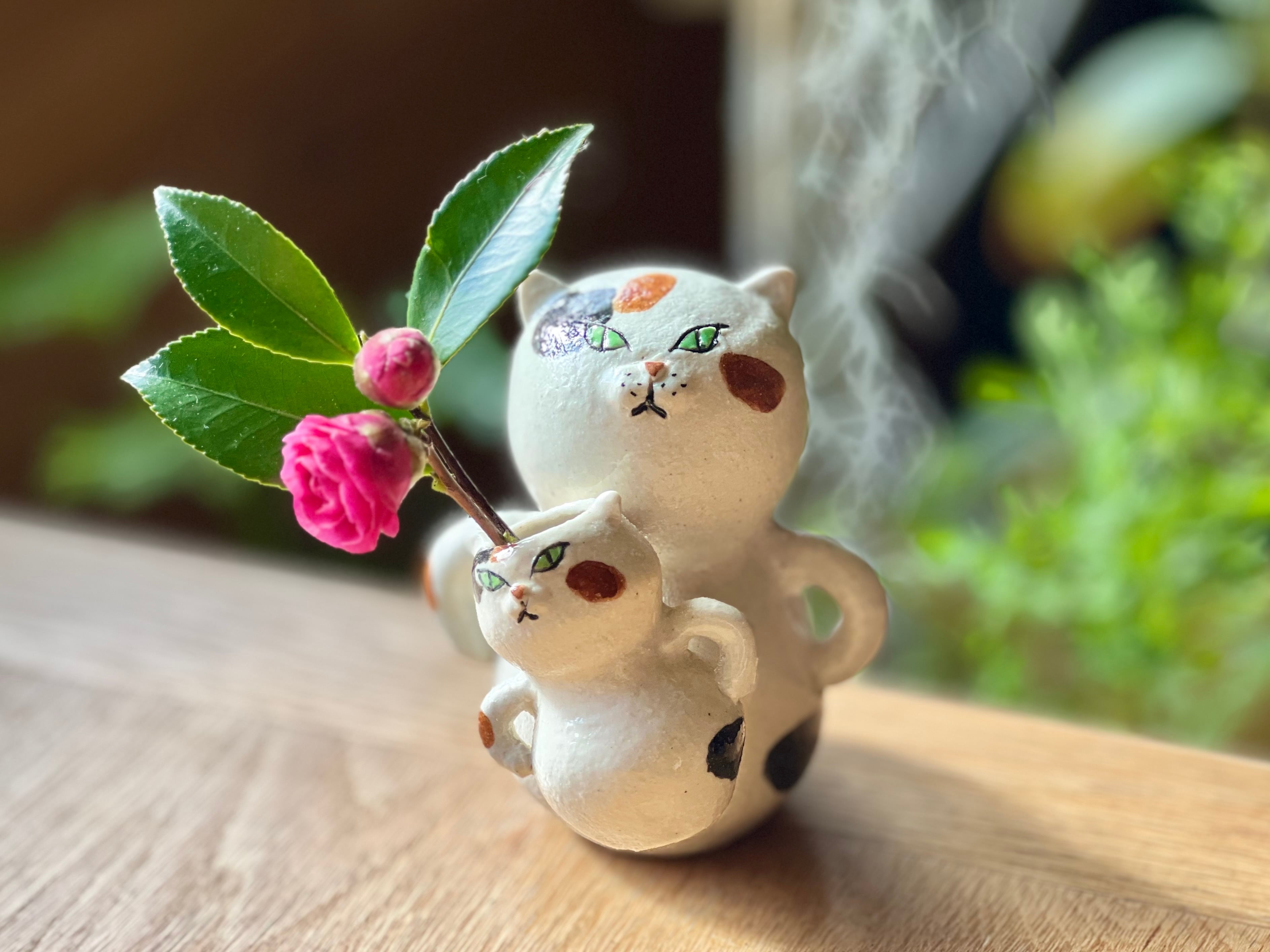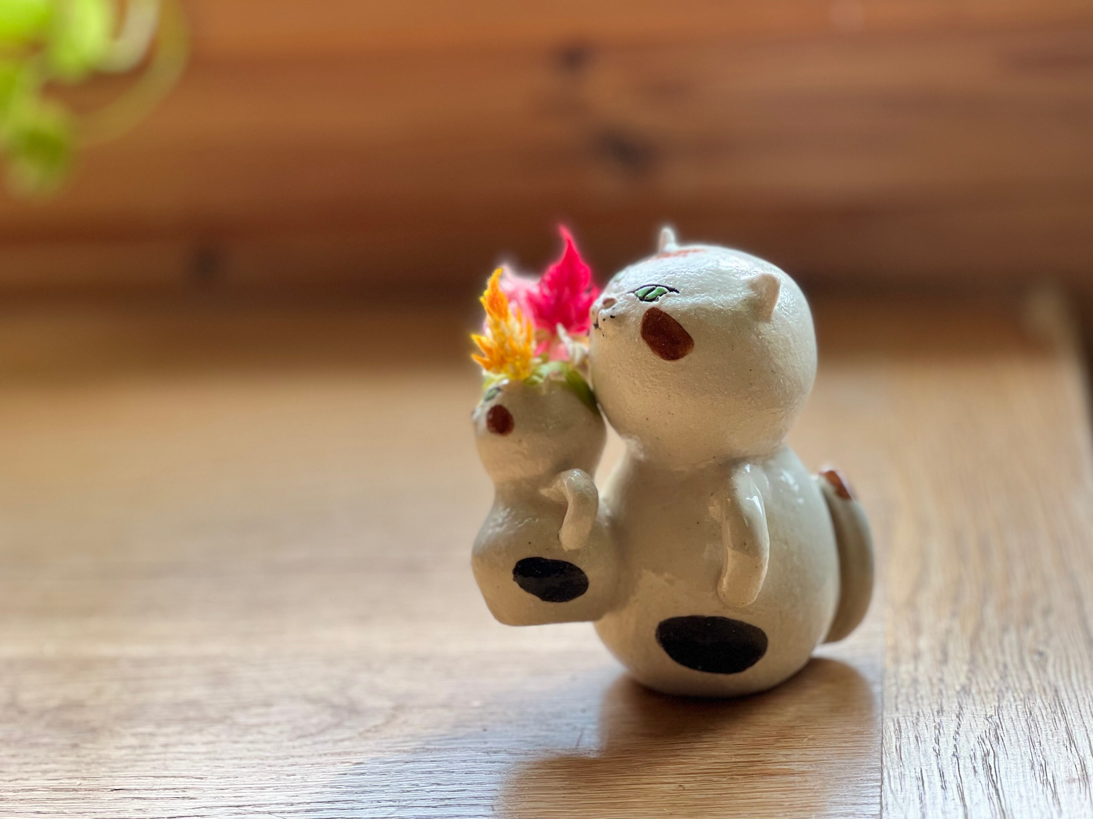 三毛猫さんに小さい猫さんがくっついた一輪挿しです。猫好きの方や花を飾るのが好きな方にぴったりのアイテムです。