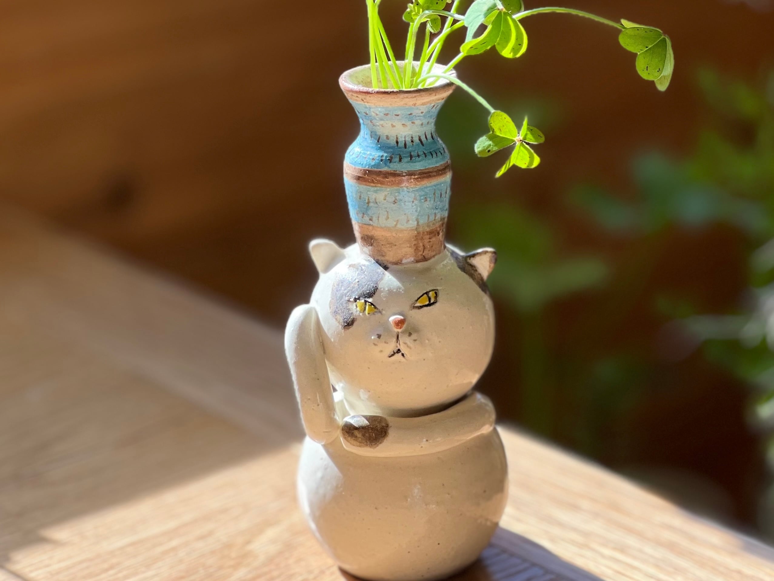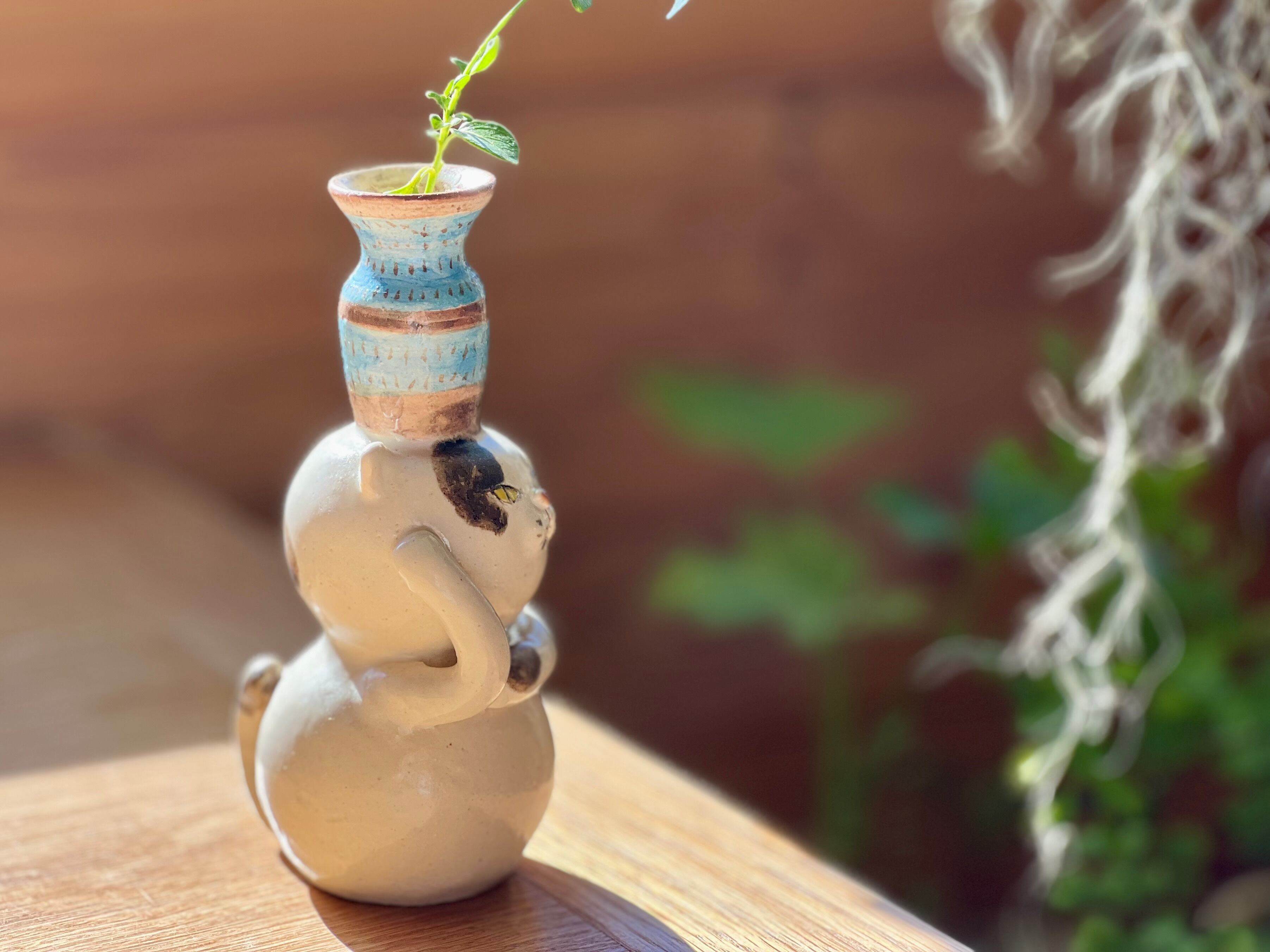 猫さん花瓶は、手作りの陶器製で、ひとつひとつ丁寧に作られています。そのため、それぞれの表情や模様が微妙に異なるのも魅力の一つです。