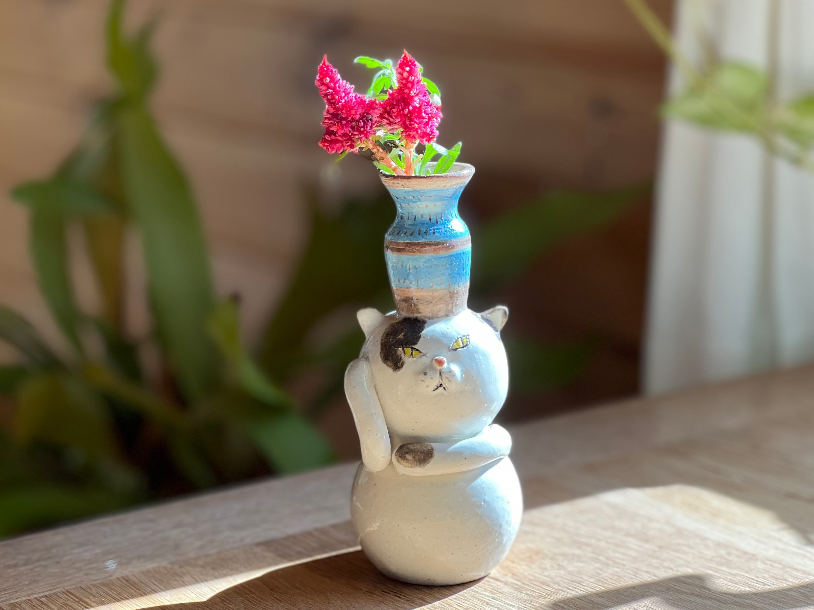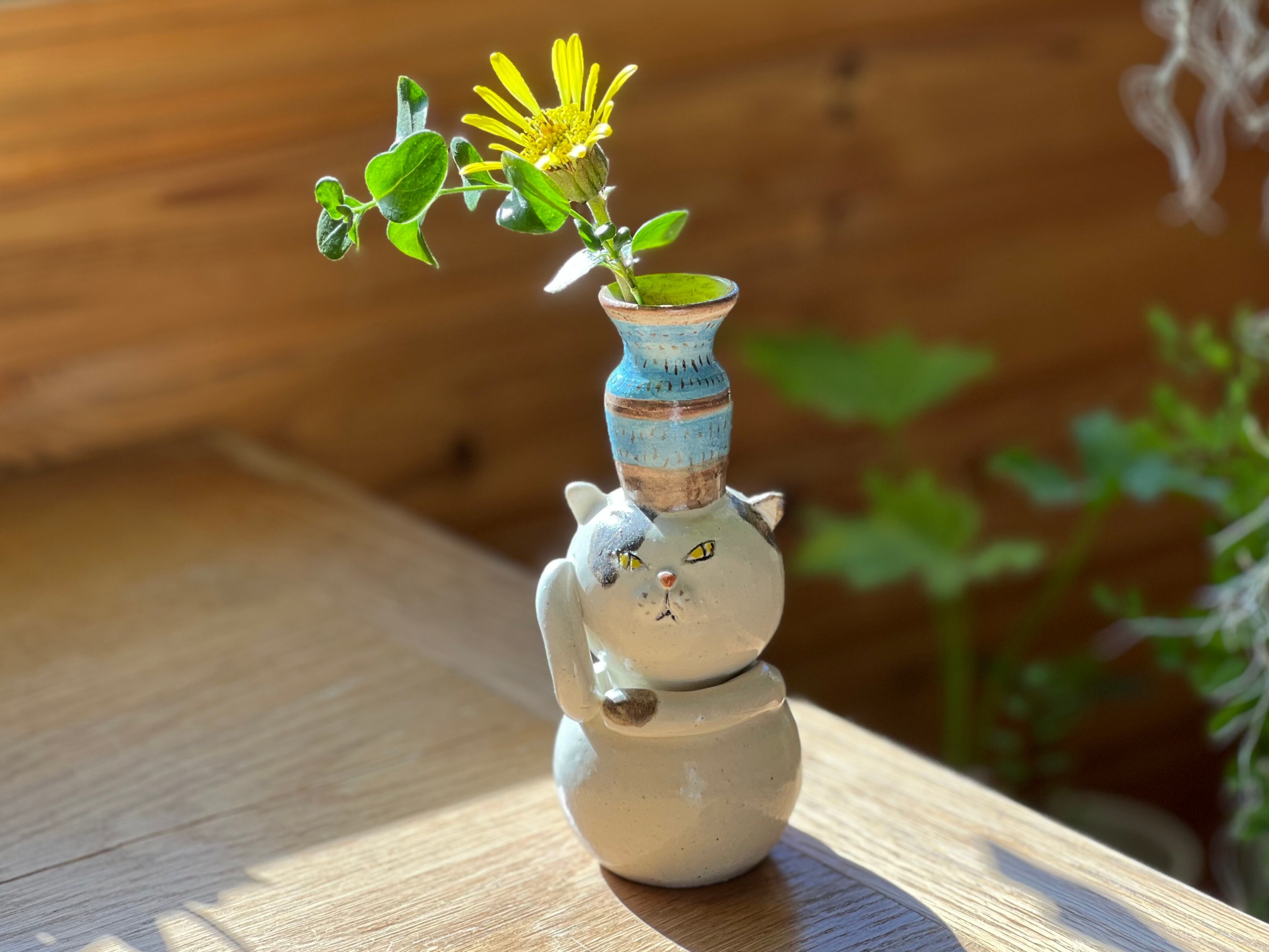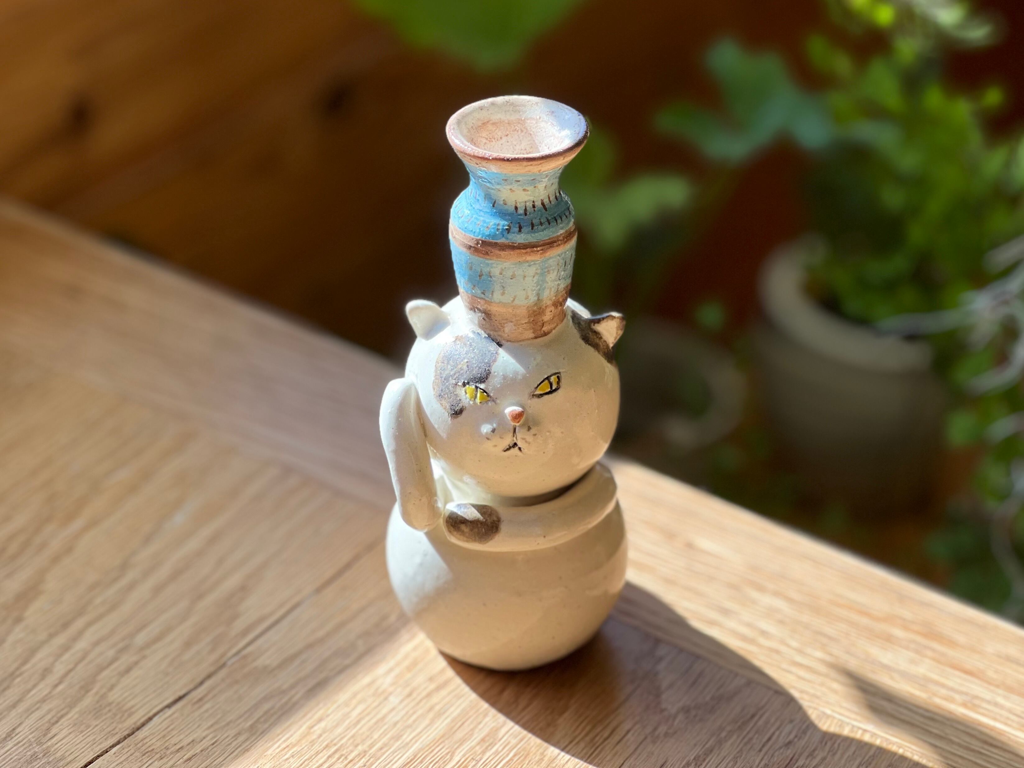 ぶち猫さんが花瓶を頭に乗せた一輪挿しです。猫好きの方や花を飾るのが好きな方にぴったりのアイテムです。