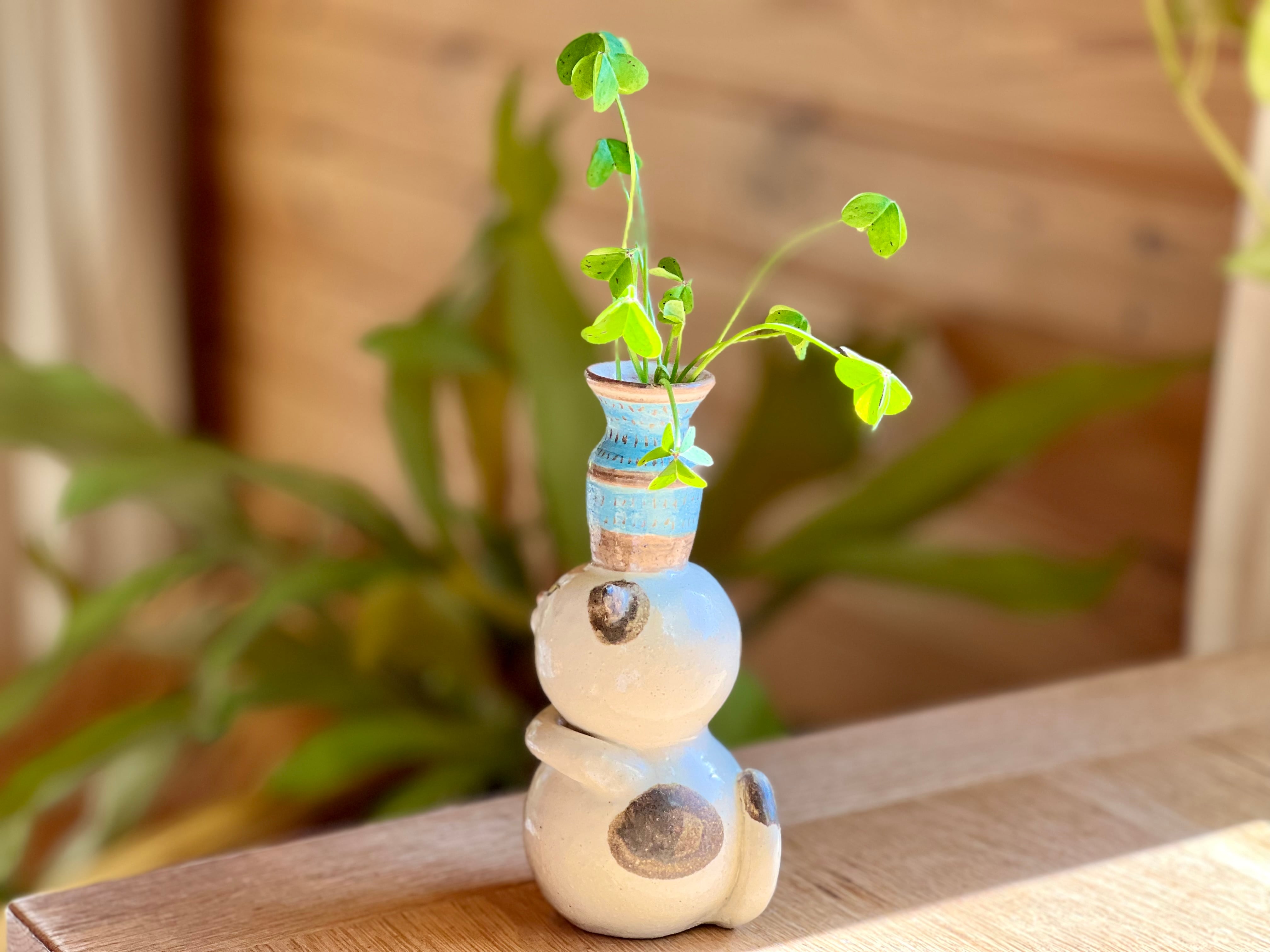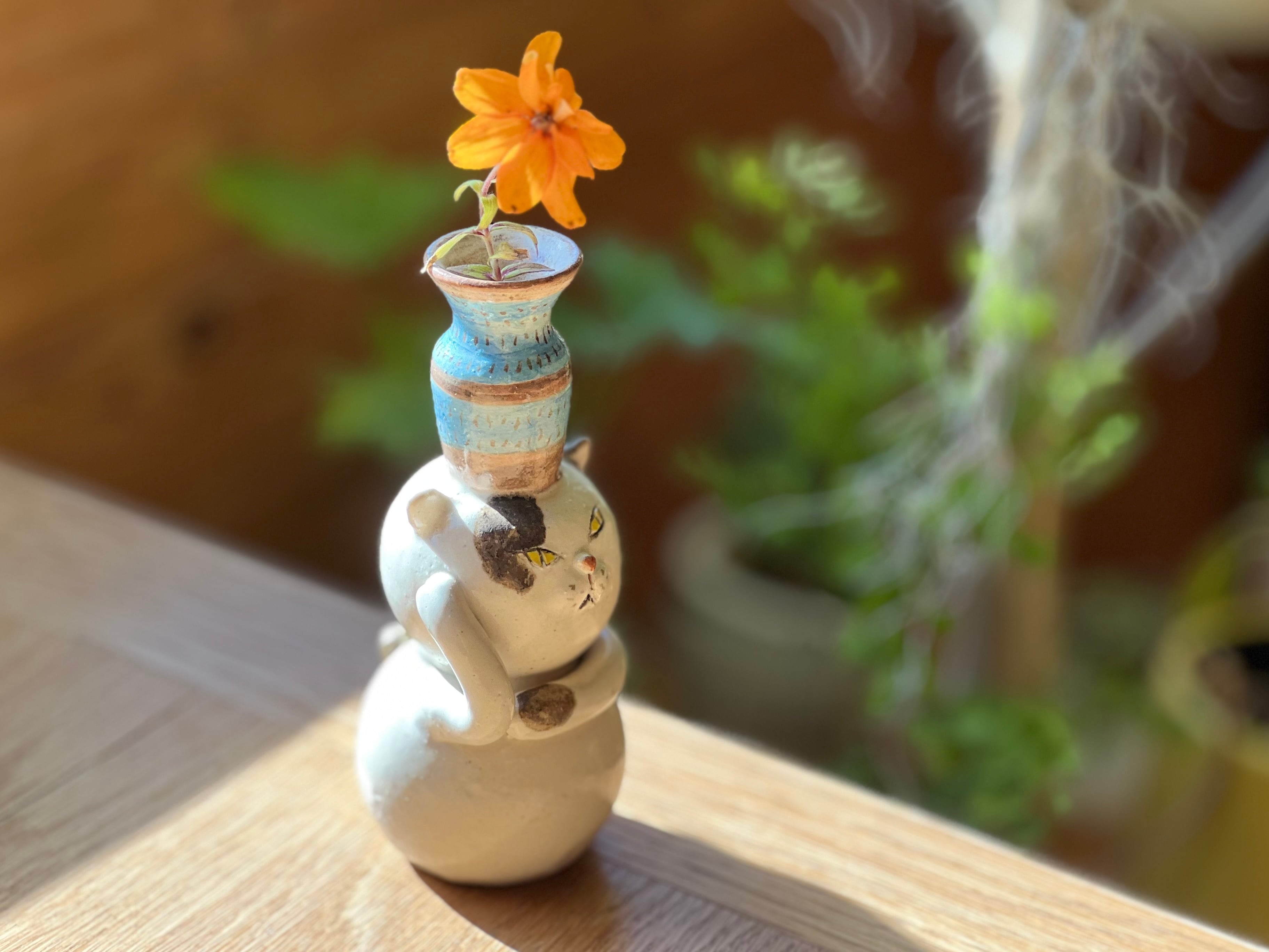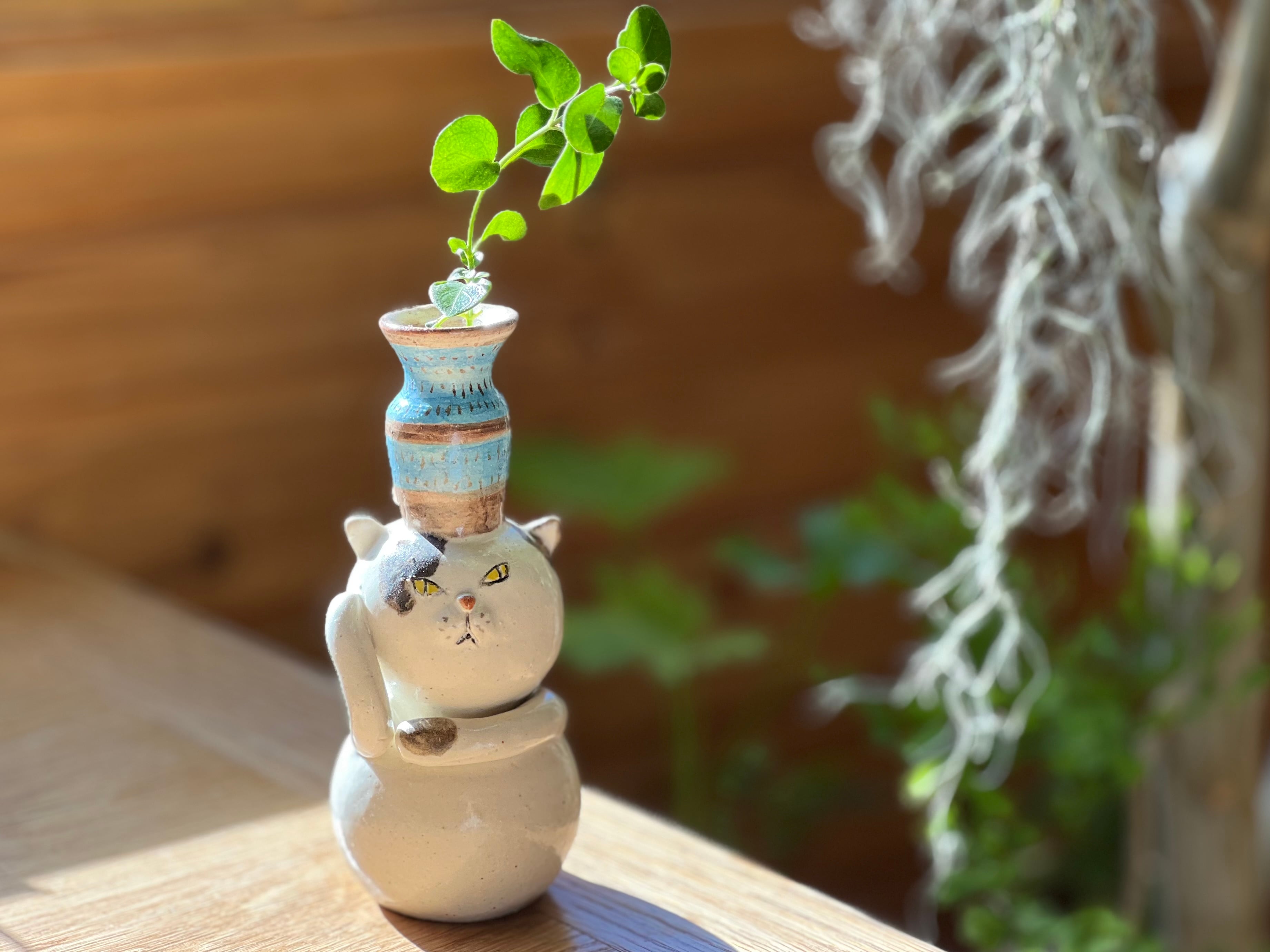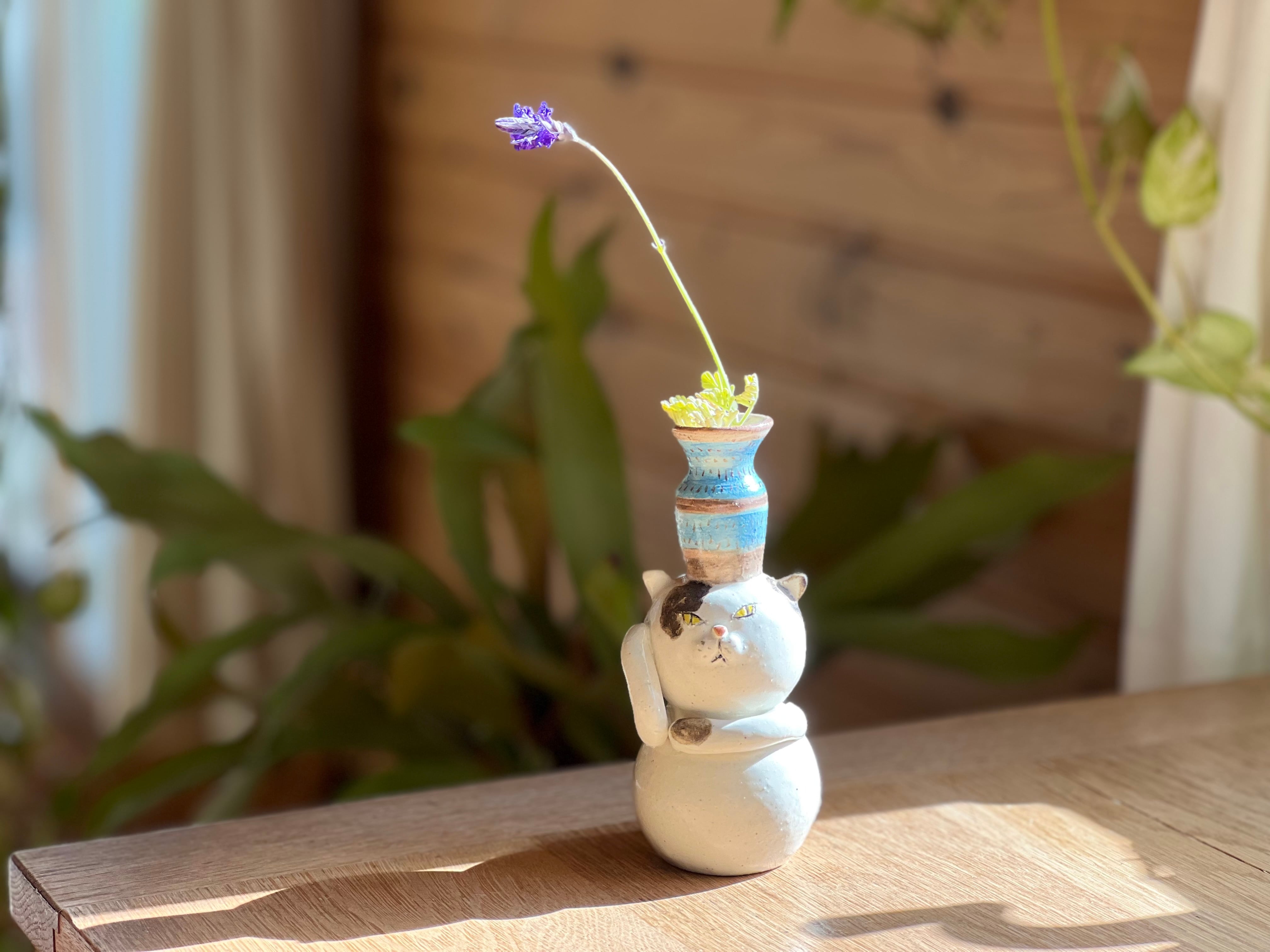ぶち猫さんが花瓶を頭に乗せた一輪挿しです。猫好きの方や花を飾るのが好きな方にぴったりのアイテムです。